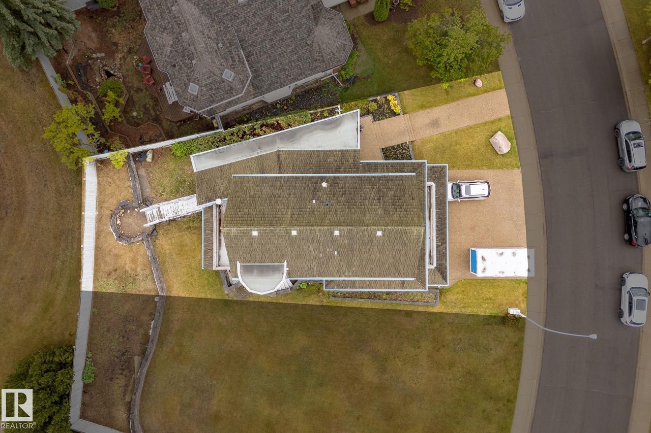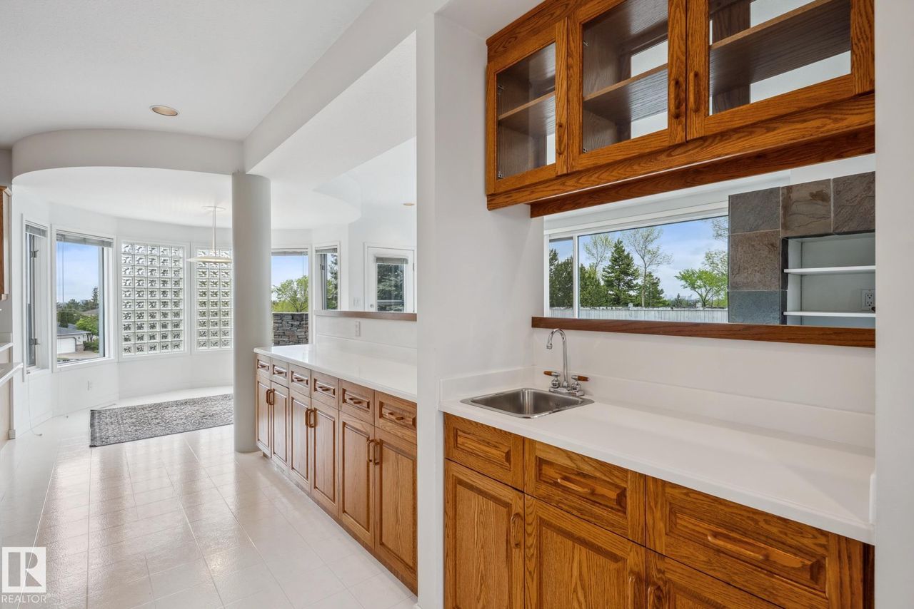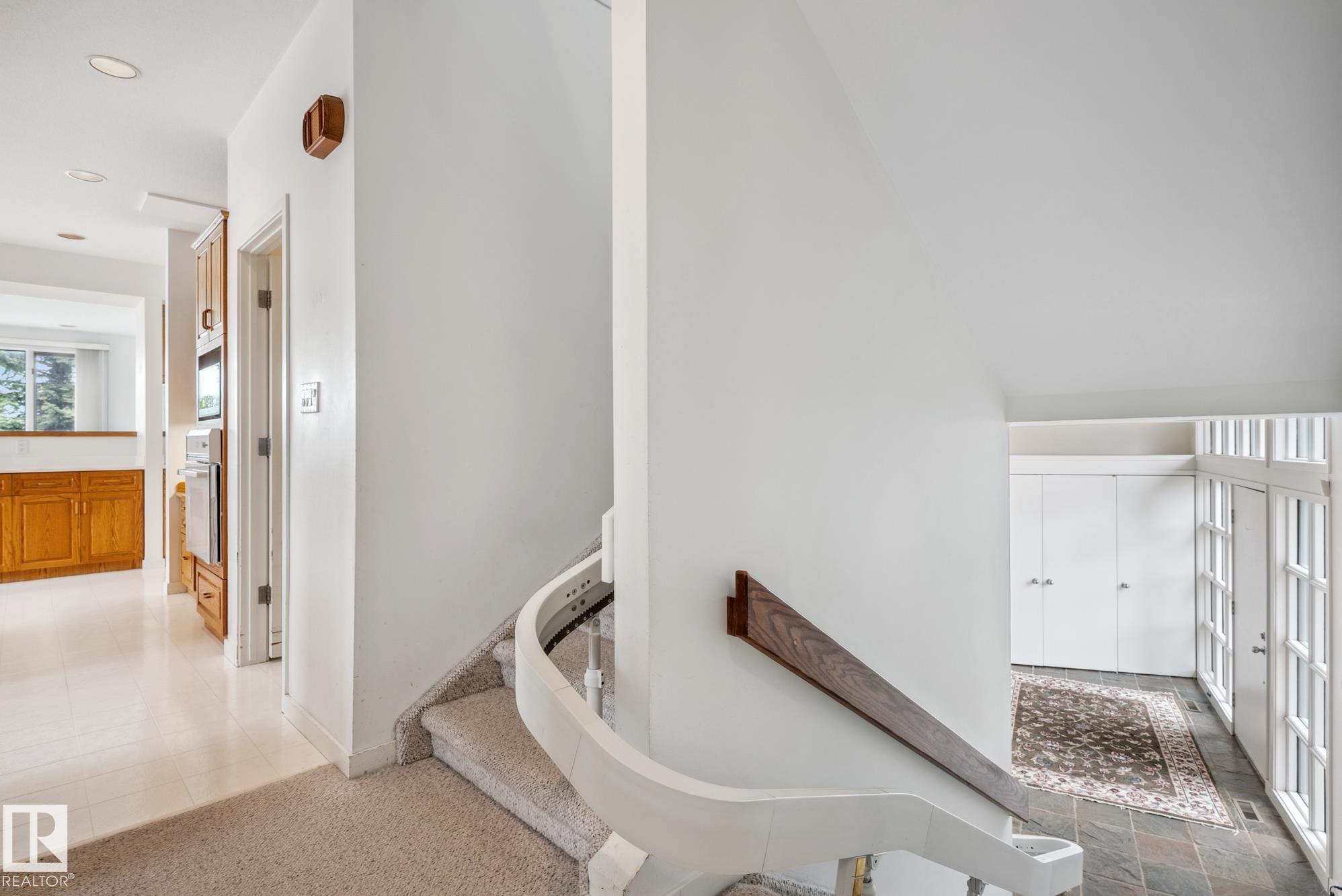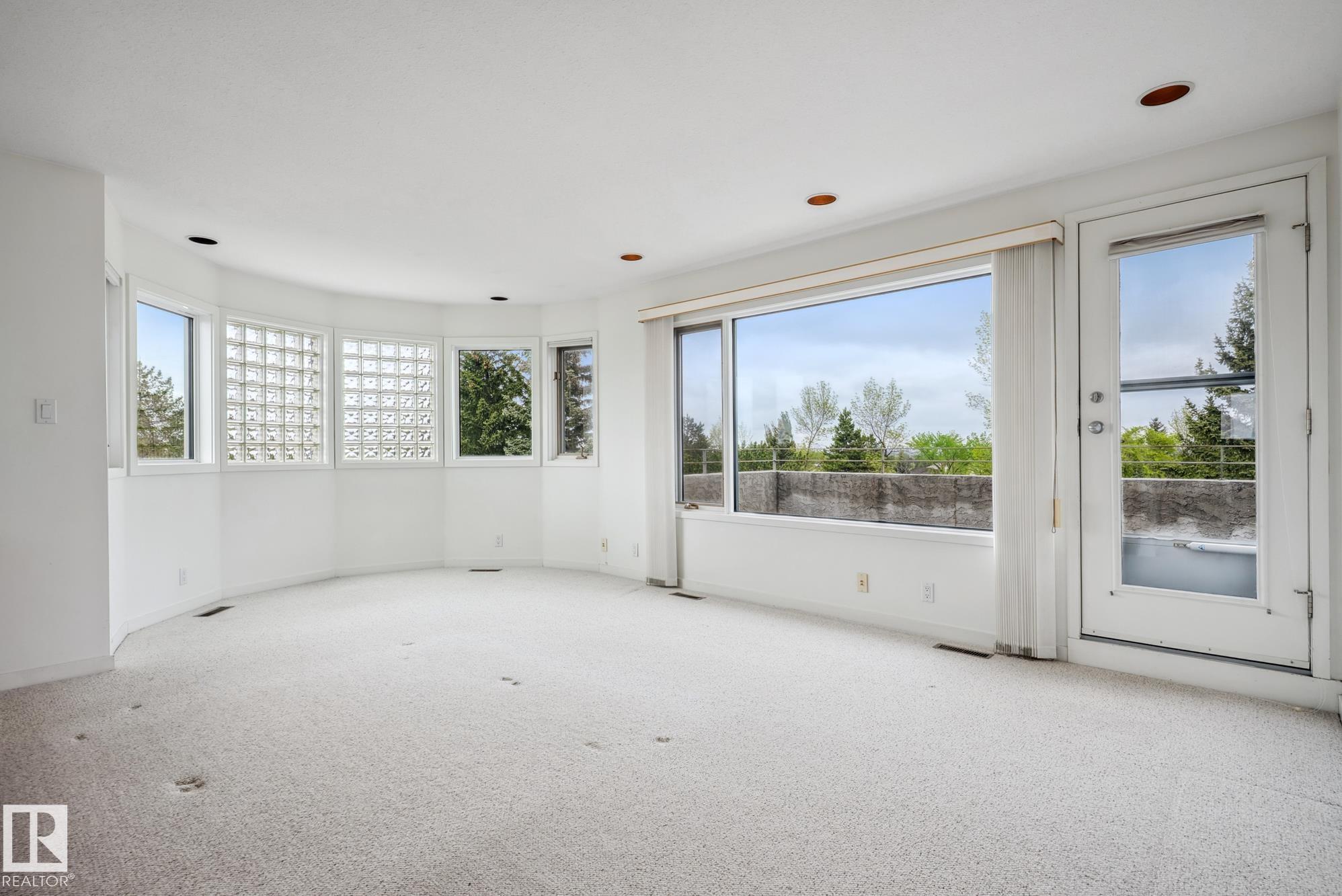 Welcome to this one of a kind, truly remarkable home in Rhatigan Ridge, designed by architect Terry Frost. This spacious 4 bed, 4 bath residence features striking exposed beams and a well thought out layout. The expansive kitchen boasts a two-tiered island, walk-in pantry, and seamless flow to the living/dining room areas, centred around a gas fireplace. Main floor bedrooms offer built-in closet shelving and private patio access, while the main 5 piece bath opens to the patio as well. The primary includes a walk-in closet, 5 piece ensuite with jacuzzi, steam shower and a private deck with downtown views. Additional highlights include a sunroom with new windows, spacious laundry, and triple garage. The basement is ready for development with large windows. Backing onto a green space, this home is full of character and ready for your personal touch.