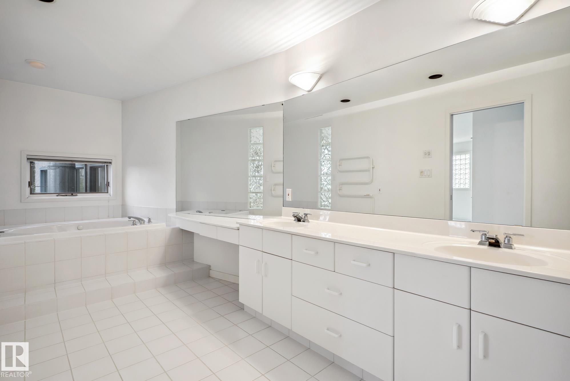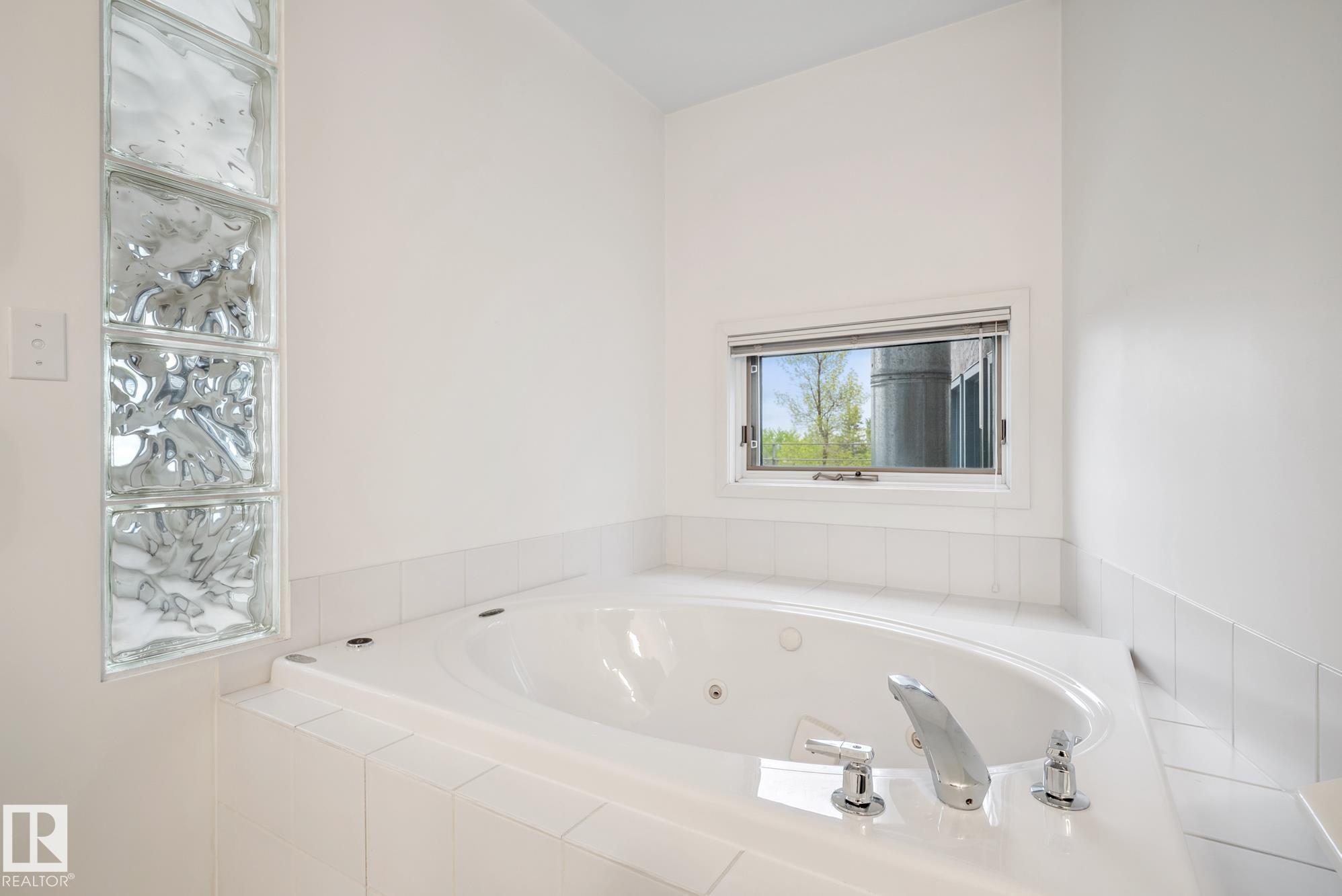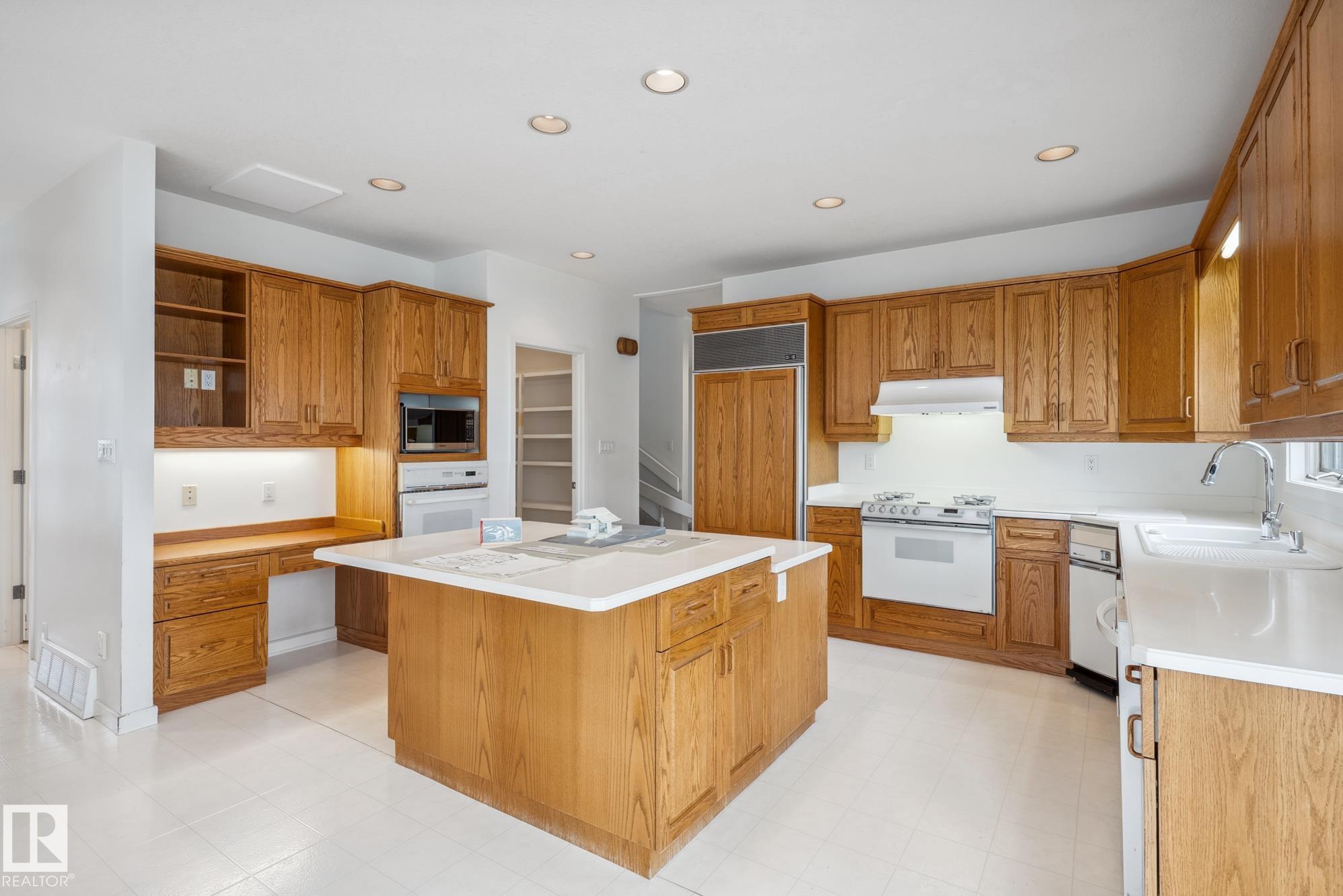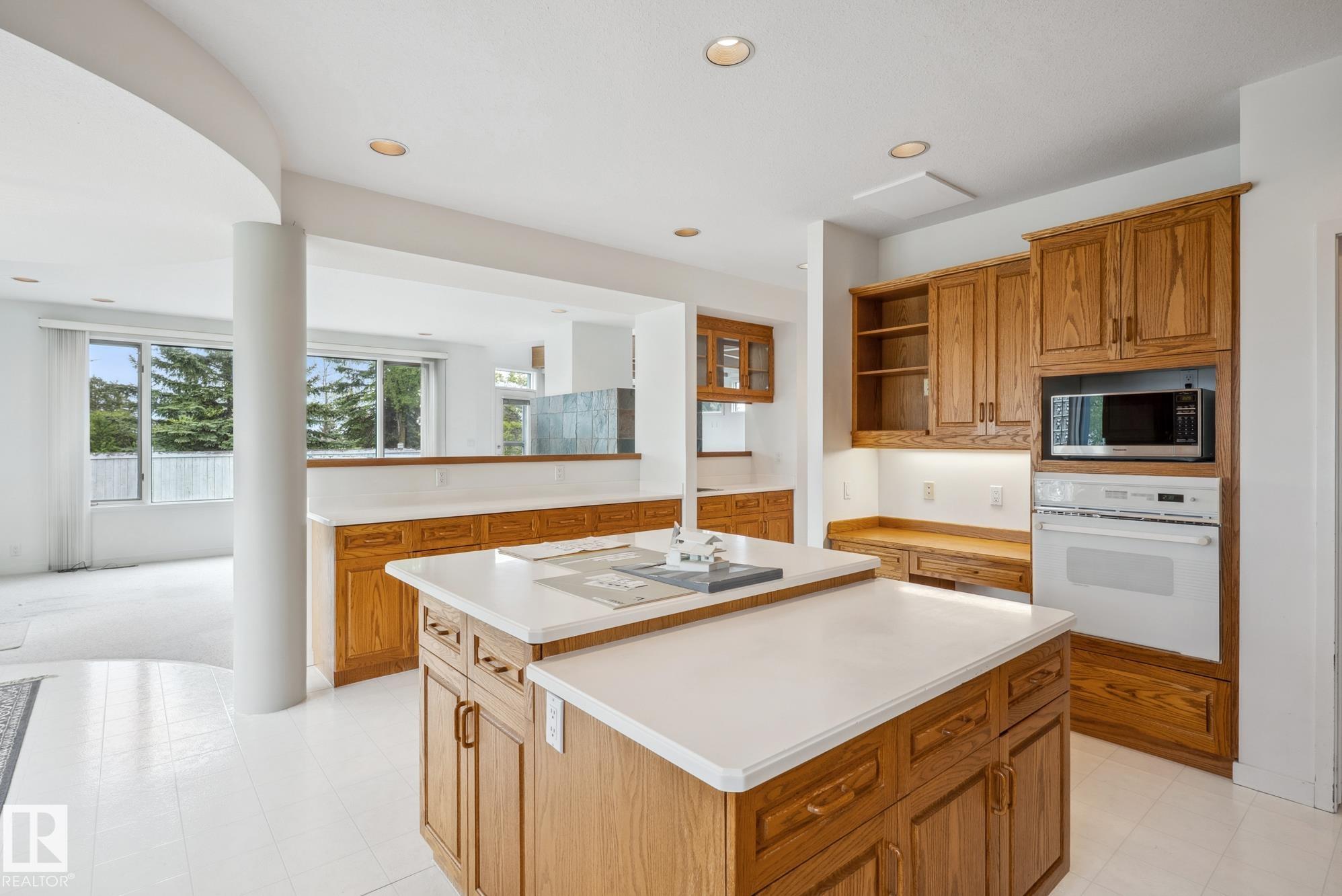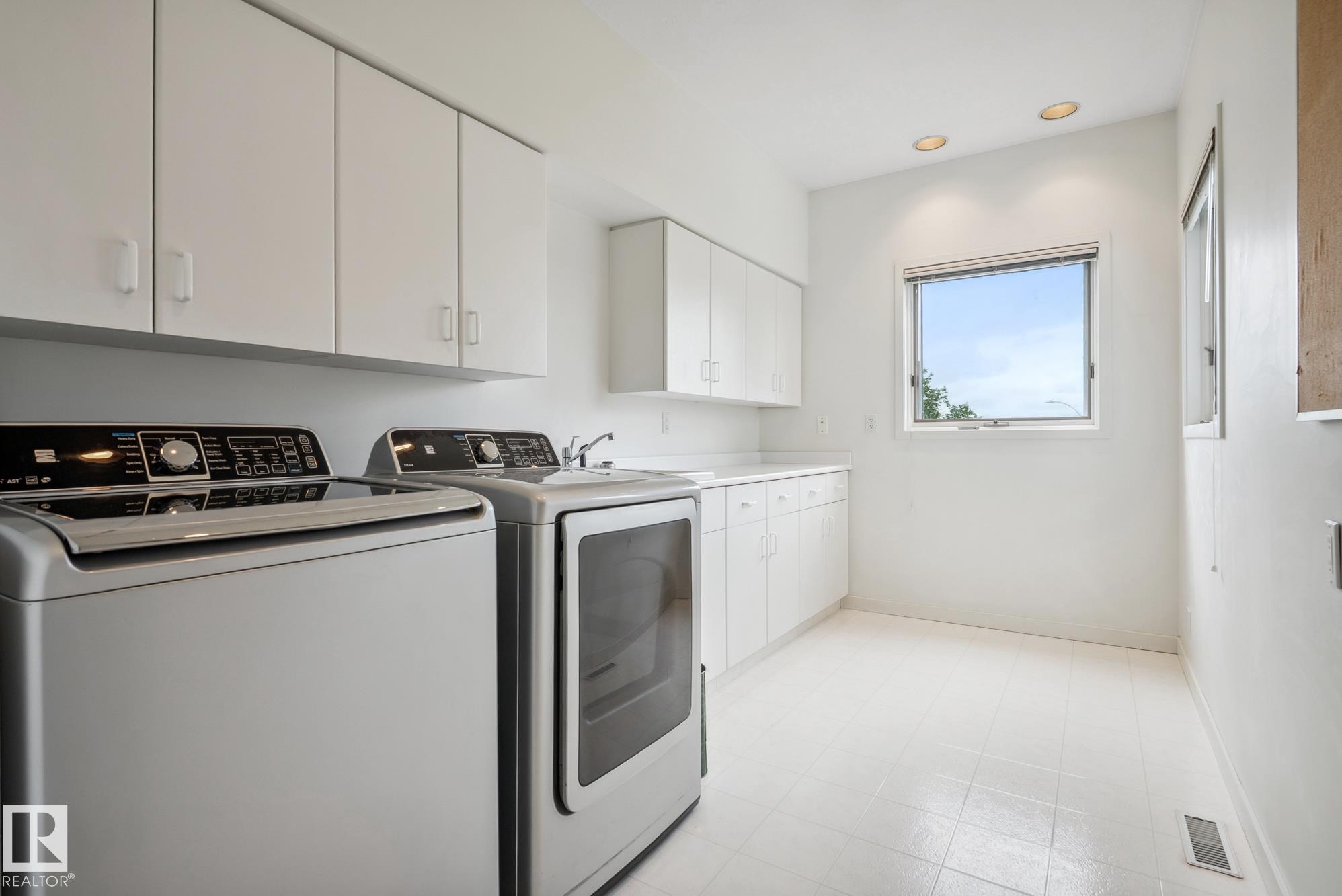 Welcome to this one of a kind, truly remarkable home in Rhatigan Ridge, designed by architect Terry Frost. This spacious 4 bed, 4 bath residence features striking exposed beams and a well thought out layout. The expansive kitchen boasts a two-tiered island, walk-in pantry, and seamless flow to the living/dining room areas, centred around a gas fireplace. Main floor bedrooms offer built-in closet shelving and private patio access, while the main 5 piece bath opens to the patio as well. The primary includes a walk-in closet, 5 piece ensuite with jacuzzi, steam shower and a private deck with downtown views. Additional highlights include a sunroom with new windows, spacious laundry, and triple garage. The basement is ready for development with large windows. Backing onto a green space, this home is full of character and ready for your personal touch.