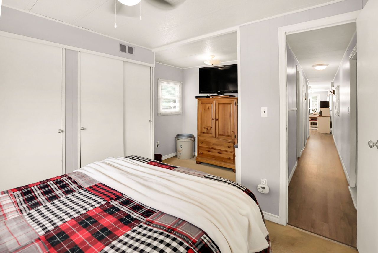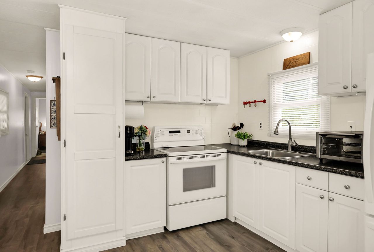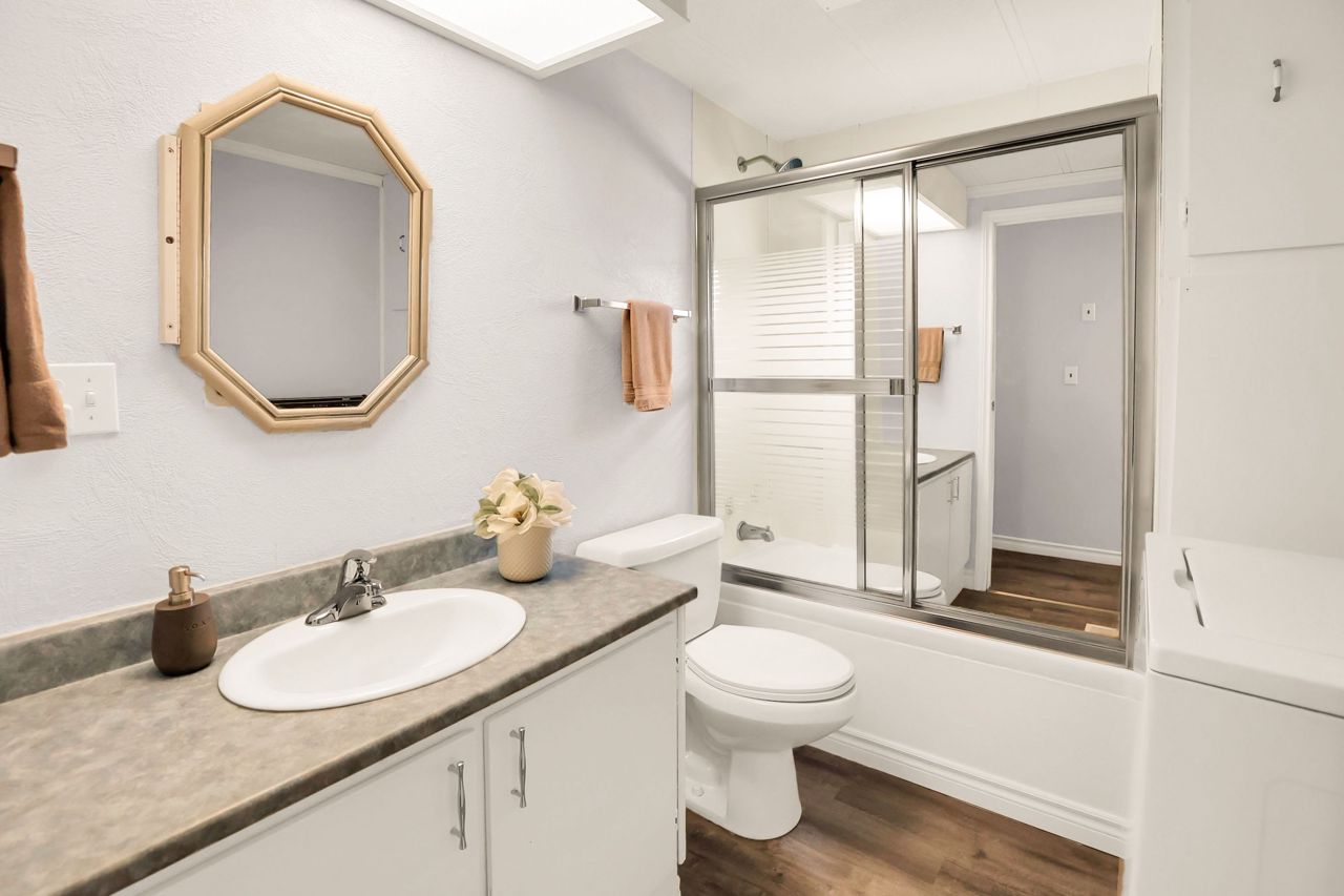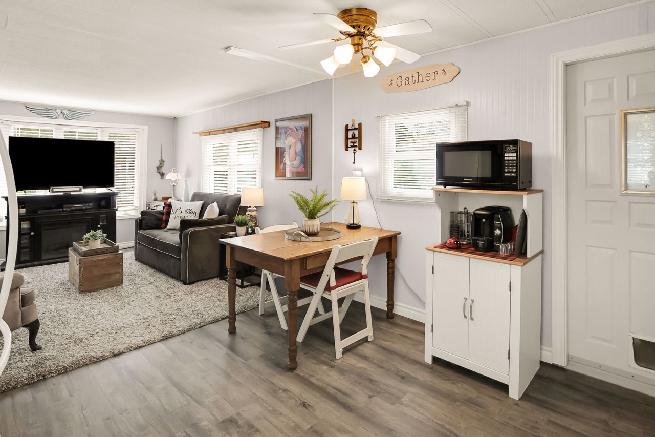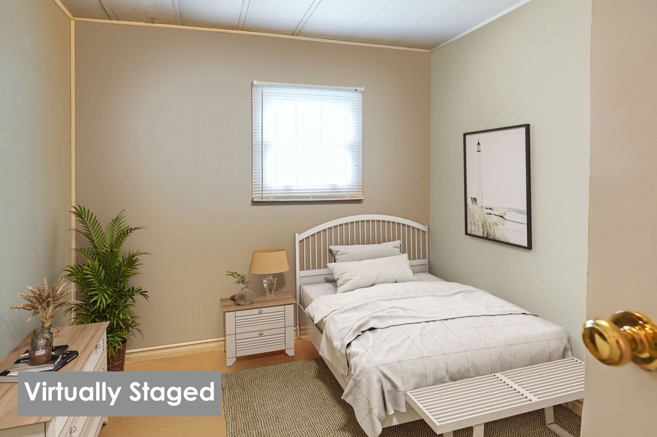 BRIGHT & COZY BUNGALOW … 2 bedroom, 1 bathroom UPDATED bungalow ON a prime corner lot at 4589 Abigail Lane in The Golden Horseshoe Estates in Beamsville. COVERED PORCH & mudroom entry leads to the bright, open concept living area with neutral paint throughout and eat-in kitchen with updated cabinetry. XL primary bedroom with dressing area & DOUBLE CLOSETS, 2nd bedroom, 4-pc bathroom, and laundry room with WALK OUT to porch complete the home. Concrete double drive plus shed. NEW: skirting 2020, vinyl flooring in living room/kitchen/hallway/bathroom 2023. NEW FEE $460.67/month pad fee includes Water and Taxes. The Golden Horseshoe Estates is in a great central location- along the Niagara Fruit & Wine Route, just minutes to the QEW, great shopping, parks, and restaurants plus only 10 minutes to the Grimsby GO Station, 30 minutes from Niagara Falls & US border, and 1 hour from Toronto! CLICK ON MULTIMEDIA FOR virtual tour, photos & more.