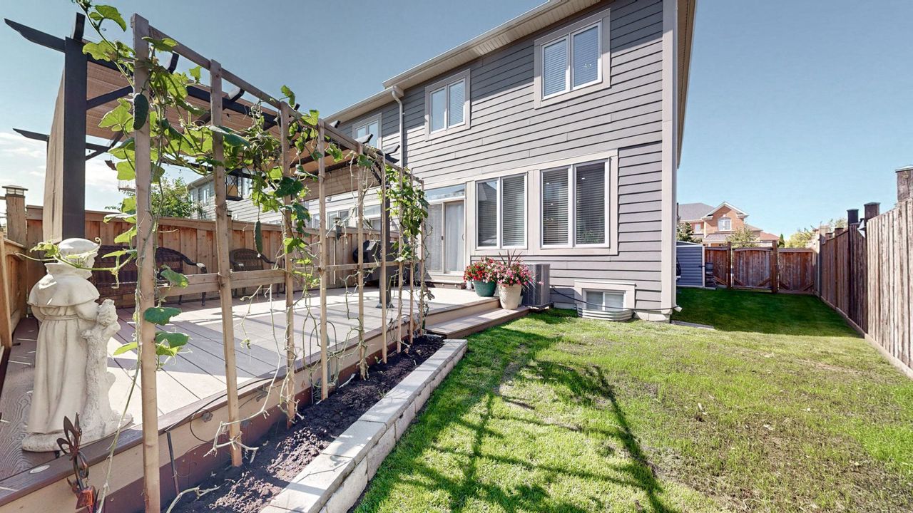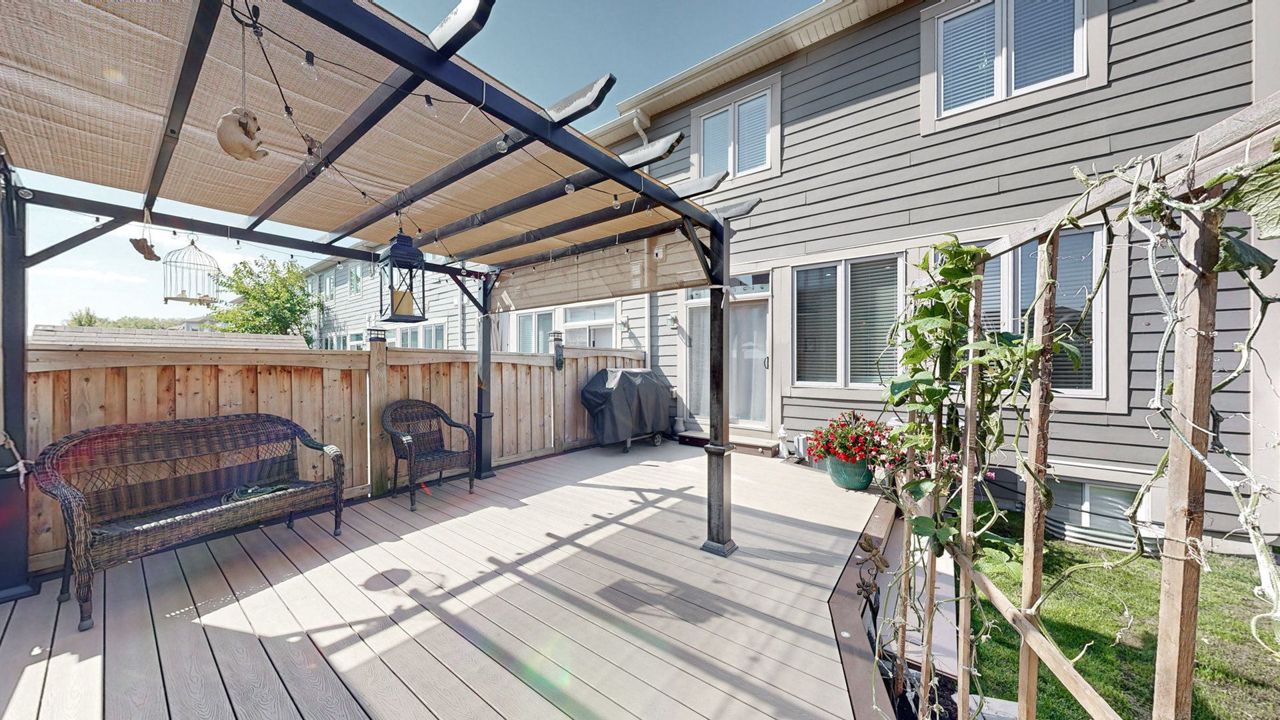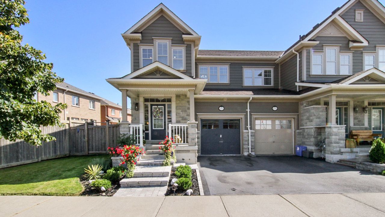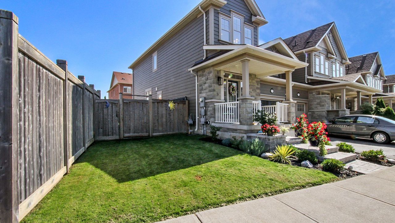 End Unit shows like a Semi! 3-bdrm, 2.5 bath home is nestled in Milton's coveted Scott neighbourhood. On arrival, meticulously landscaped gardens and a charming tumble stone porch greet you. Inside, discover dark wood and porcelain floors, a recently revamped kitchen with custom white cabinetry, quartz counters a gas stove, and a centre island with seating two. The dining area accommodates six, and the great room showcases an eye-catching feature wall with deck access. 20 pot lights have been added to the great room and kitchen. Upstairs, the master boasts a walk-in closet and a luxurious 5-piece ensuite, a laundry closet has been conveniently plumbed in. The property offers an oversized, fenced lot with a play area, shed and inside access to the single garage. It's possible to add a 2nd entry at the side to the basement. Excellent schools are nearby and Scott Neighbourhood Park is at the end of the court. All essential amenities, including Milton Hospital, are minutes away.Many extras have been added to this home.