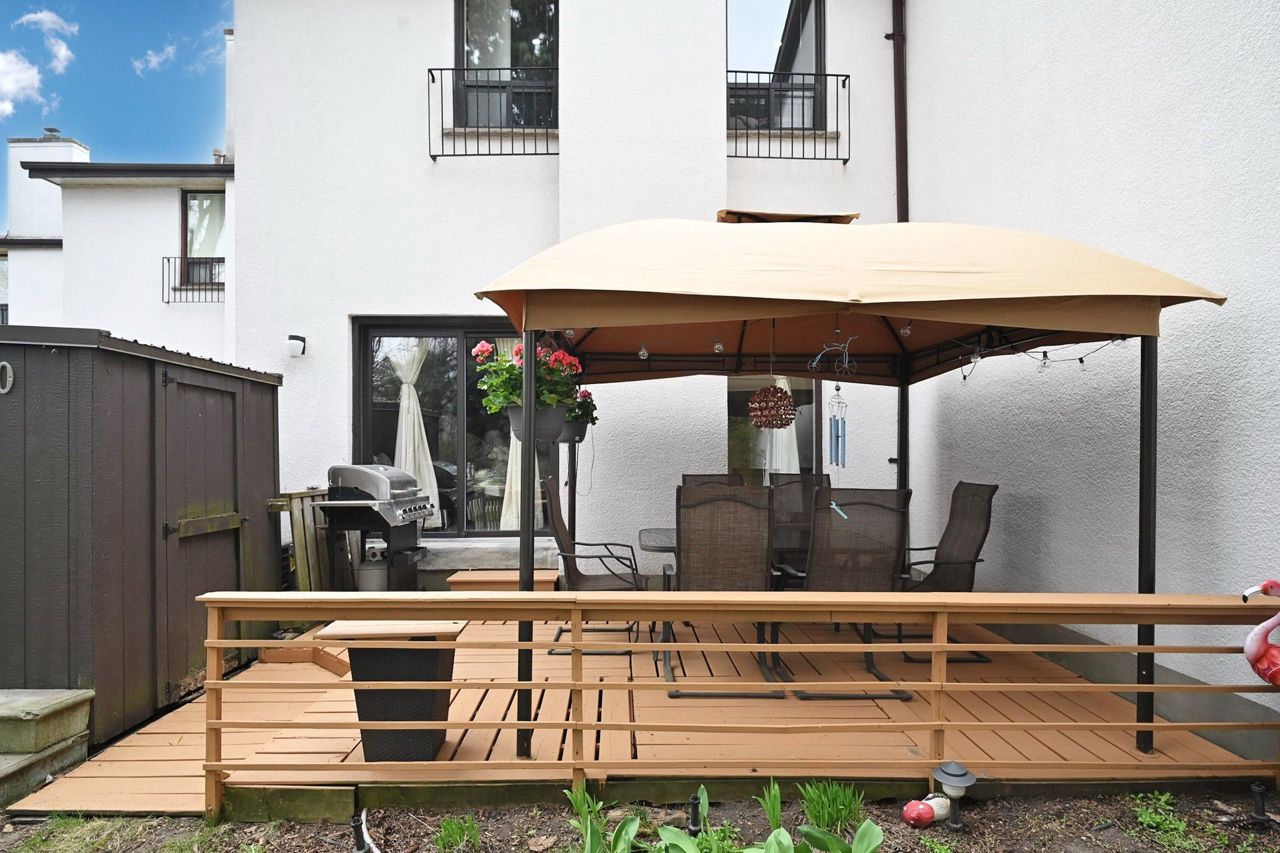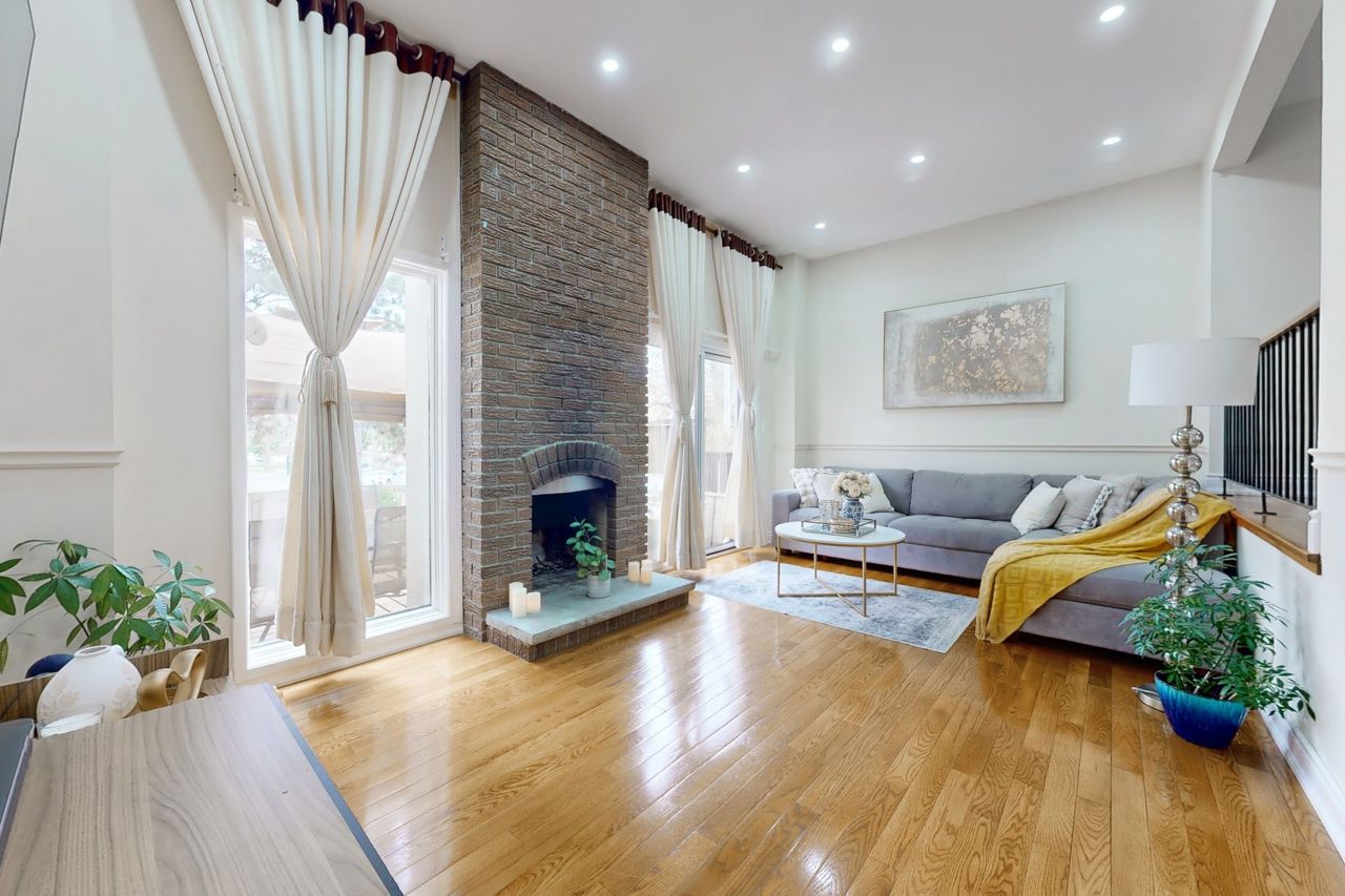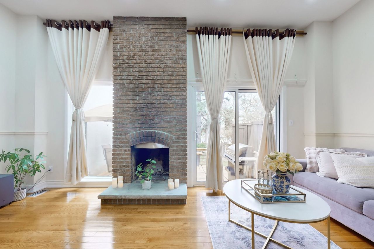Beautiful Luxury Townhouse located in a Mediterranean Style Complex. Features a bright, open concept layout with hardwood and laminate flooring. An abundance of natural light throughout the house. High ceiling in living room, features wood burning fireplace and an elevated dining area. Upgraded eat-in kitchen with quartz counters, movable island and cabinets. King size Main bedroom with washroom and walk-in closet. Pot lights, tiled entry, upgraded appliances, newer windows, patio door, newer furnace (2022). Overlooking Spacious backyard with an amazing deck with canopy and mature trees. Outdoor swimming pool and playground in complex. Walking distance to Meadowvale GO, Steps to Maple Wood Public School (with a 7.8 rating) and Parks and 5 min Drive to Highway 401. A perfect blend of modern upgrades and ideal location This one checks all the boxes!