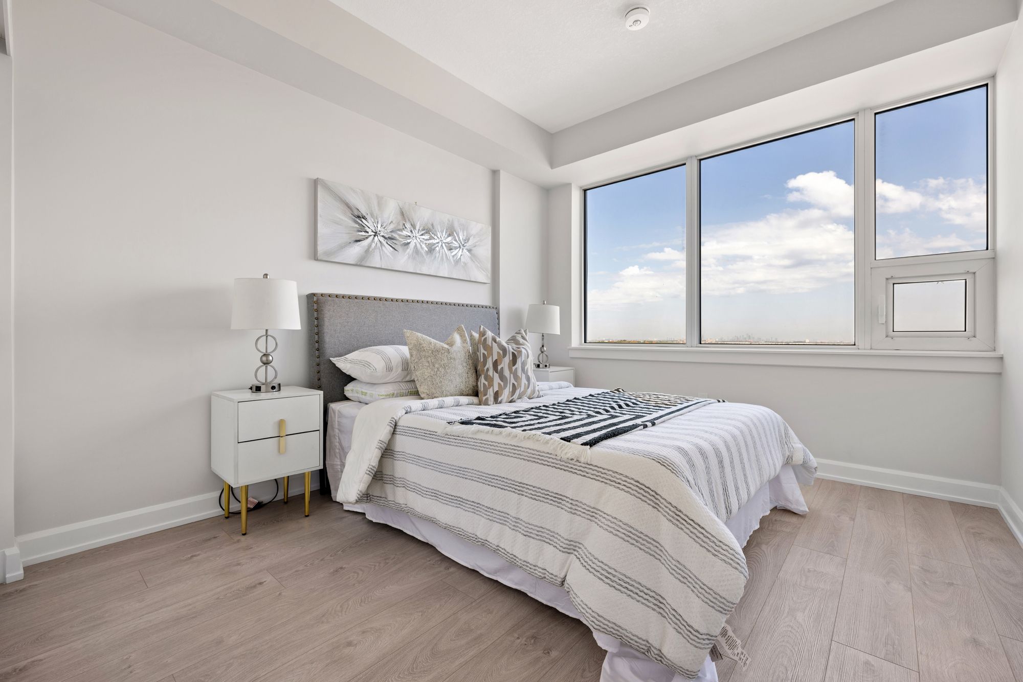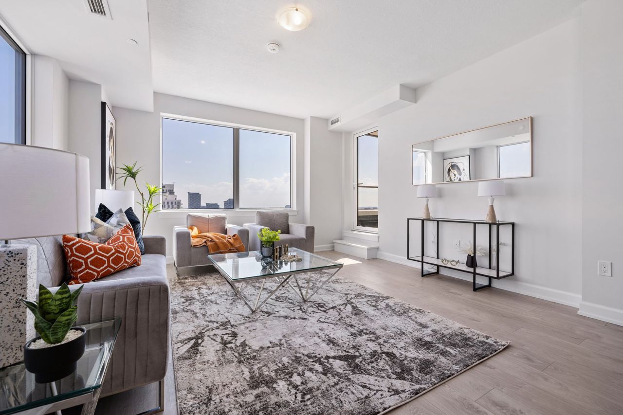 Discover this exceptional 2-bedroom, 2-bathroom + den condo unit of open living space just minutes from Toronto's downtown, Pearson Airport, Oakville Hospital, Oakville GO, Highway 403,and Sheridan College. The modern kitchen boasts sleek quartz countertops, an under-mount sink, and stylish chrome faucets. Forget traditional keys – enjoy the convenience of a code lock and fob. The ensuite is equally impressive with its elevated vanity cabinets, marble countertops, and chrome fixtures. Experience the perfect blend of convenience and style in this stunning condo unit with an ideal view of the Mississauga skyline.All Brand New S/S Appliances: Fridge, Stove, Microwave, Dishwasher. Brand New Washer & Dryer. All Light Fixtures. Upgraded Island. One Locker, OneParking Spot.