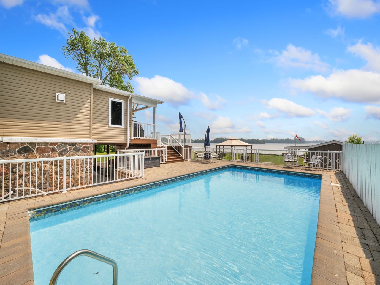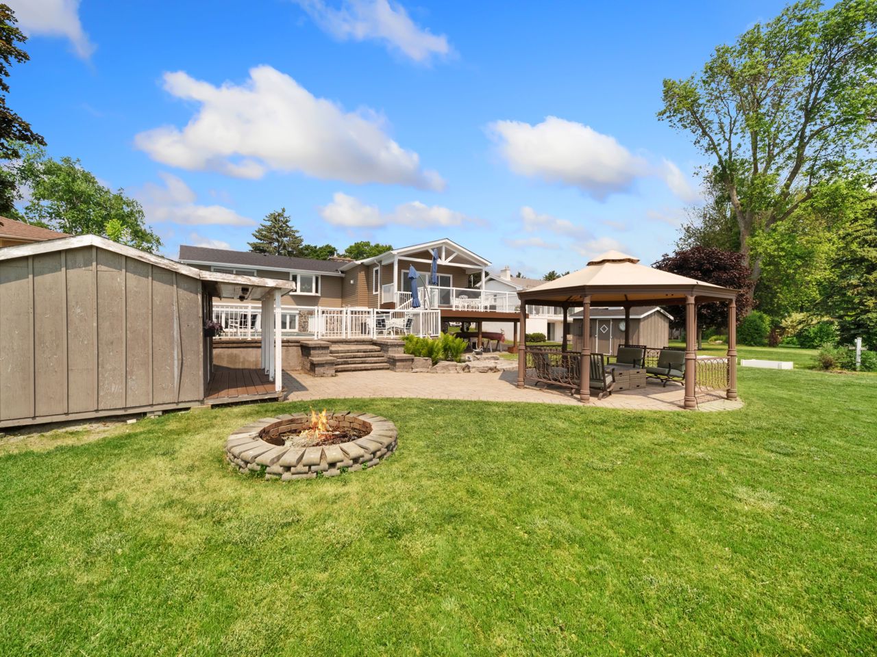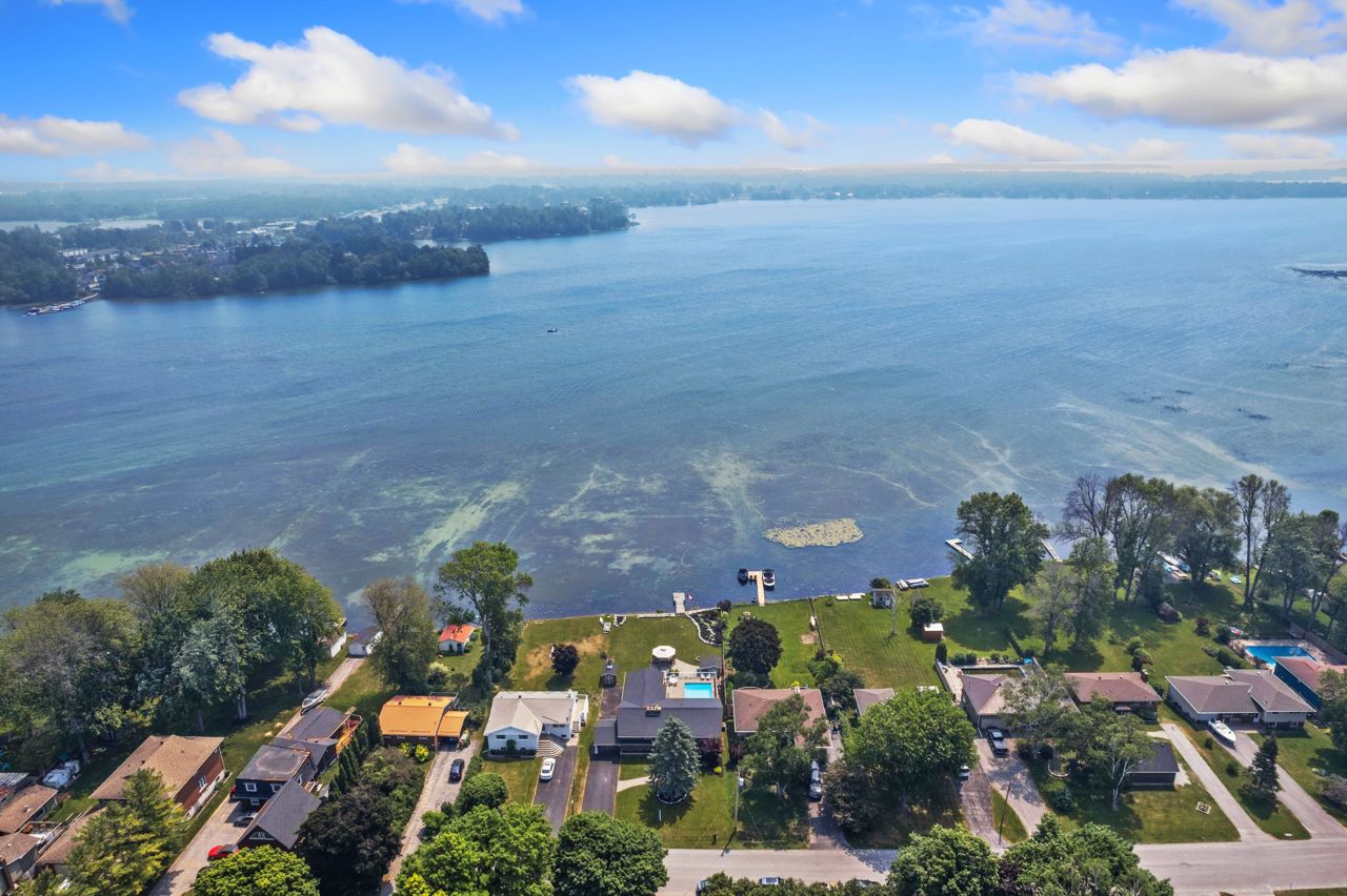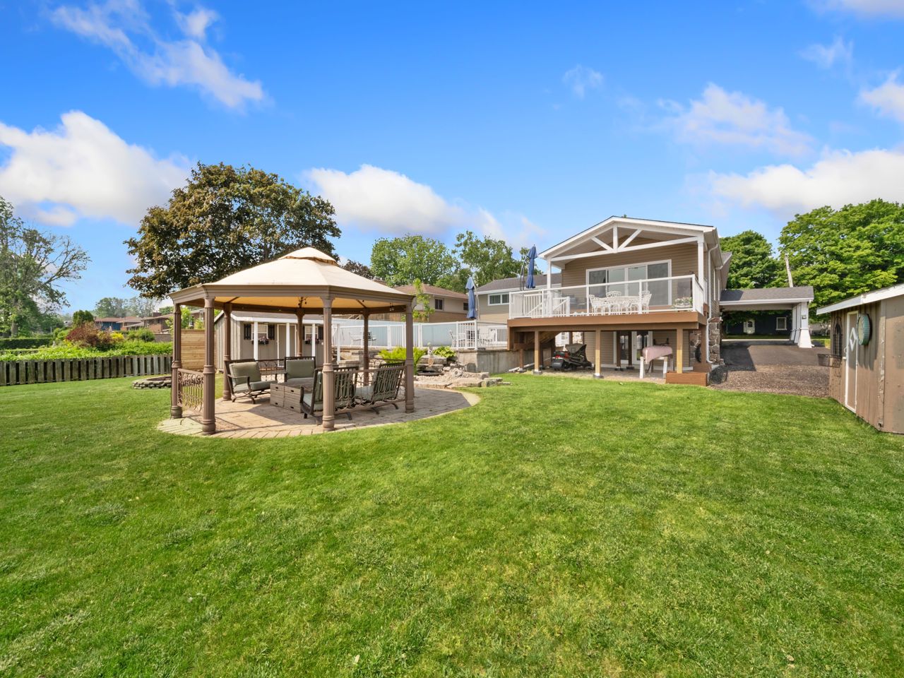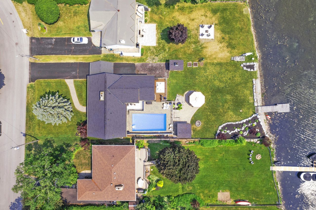 This stunning property boasts 76 feet of prime water frontage, offering breathtaking views and a serene retreat for those seeking the perfect balance of luxury and tranquility. Inside you'll find hardwood floors a bright and spacious living/dining room and a spectacular kitchen. The master suite features windows that frame the sparkling lake vistas while the great room features a wall of windows a gas fireplace and more picturesque views of the water. The lower level has large rec room bathroom and walkout to a pool. The composite decking off the great room provides an additional low-maintenance space to relax and soak up the sun while a gazebo adds an extra touch of elegance to the outdoor space. The 25+ feet of docking provide easy access to boating and water sports and the 16x32 pool adds even more entertaining and outdoor activities to this already impressive property. The in-ground sprinkler system ensures that the lush landscaping remains vibrant year-round with minimal effort.
