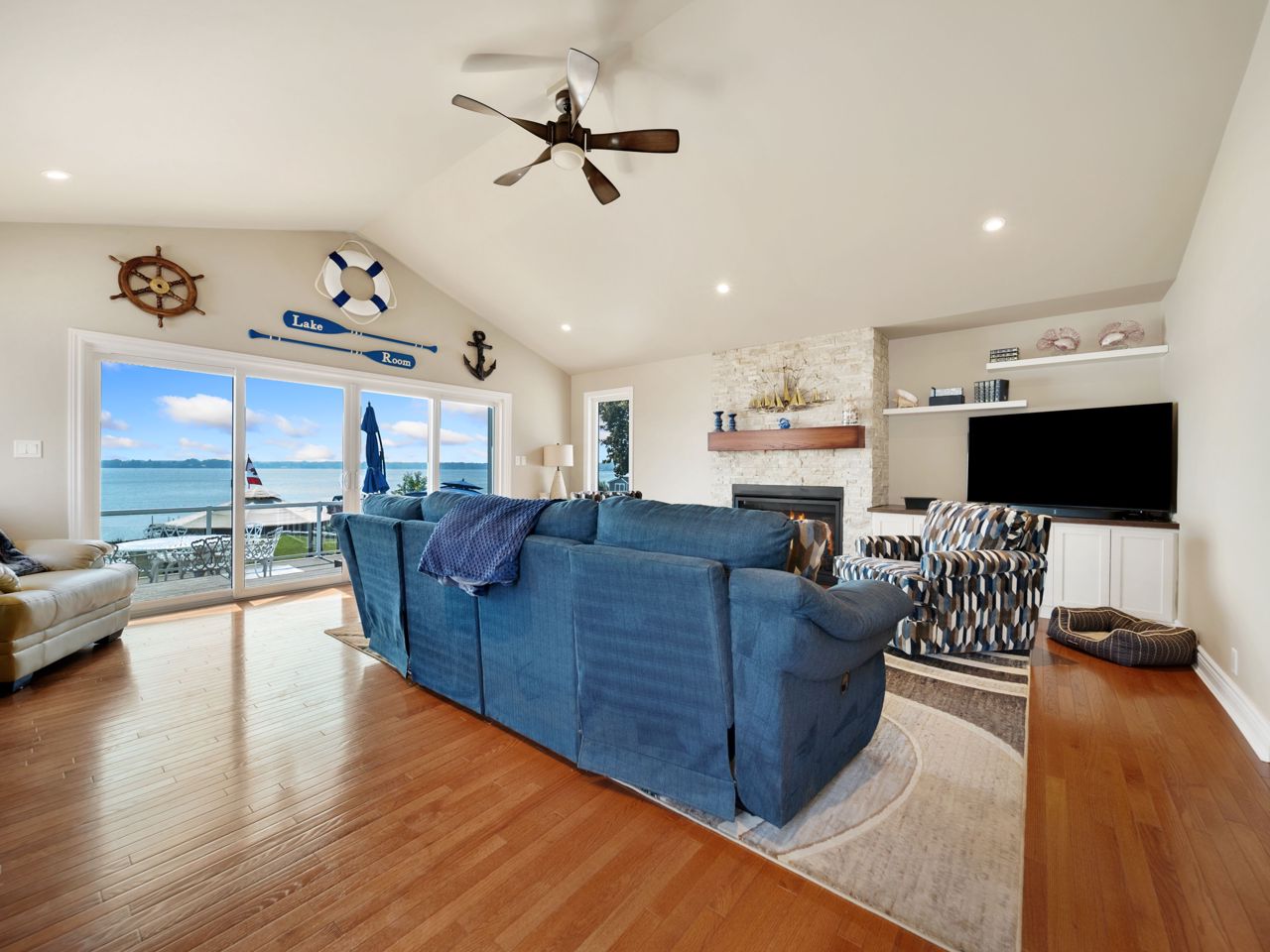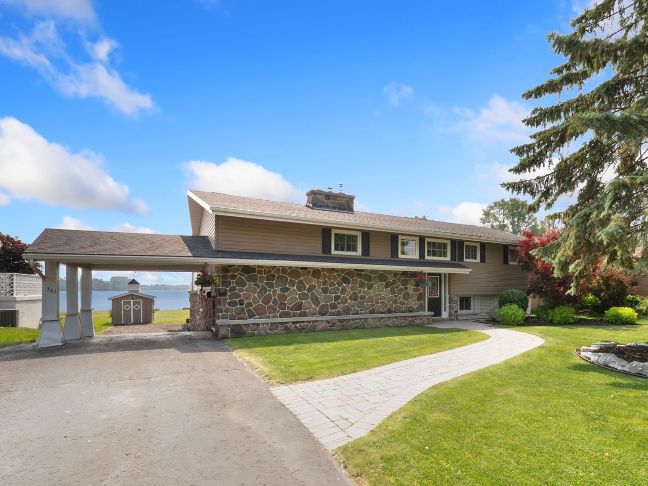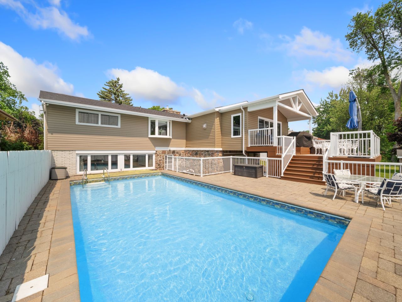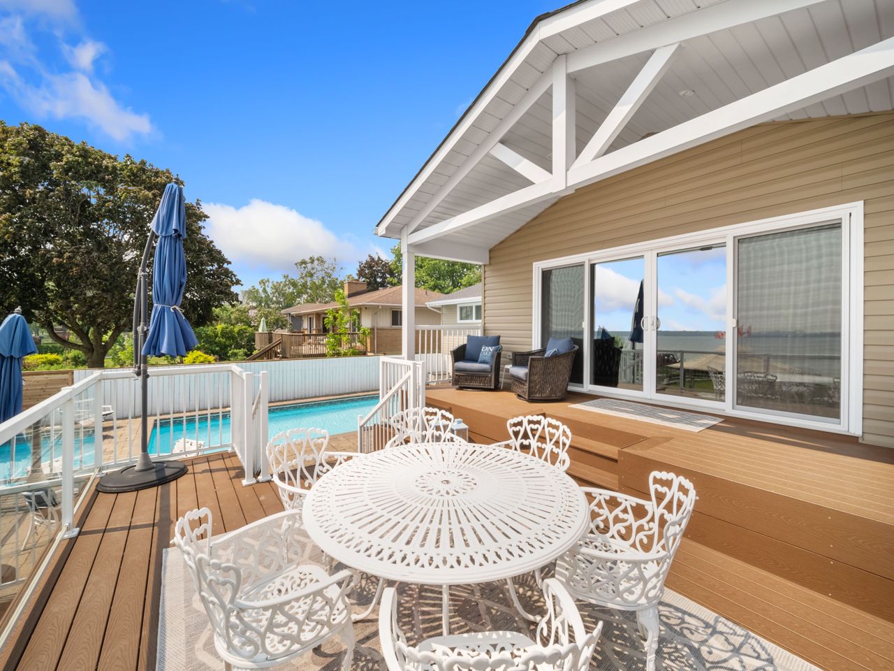 This stunning property boasts 76 feet of prime water frontage, offering breathtaking views and a serene retreat for those seeking the perfect balance of luxury and tranquility. Inside you'll find hardwood floors a bright and spacious living/dining room and a spectacular kitchen. The master suite features windows that frame the sparkling lake vistas while the great room features a wall of windows a gas fireplace and more picturesque views of the water. The lower level has large rec room bathroom and walkout to a pool. The composite decking off the great room provides an additional low-maintenance space to relax and soak up the sun while a gazebo adds an extra touch of elegance to the outdoor space. The 25+ feet of docking provide easy access to boating and water sports and the 16x32 pool adds even more entertaining and outdoor activities to this already impressive property. The in-ground sprinkler system ensures that the lush landscaping remains vibrant year-round with minimal effort.