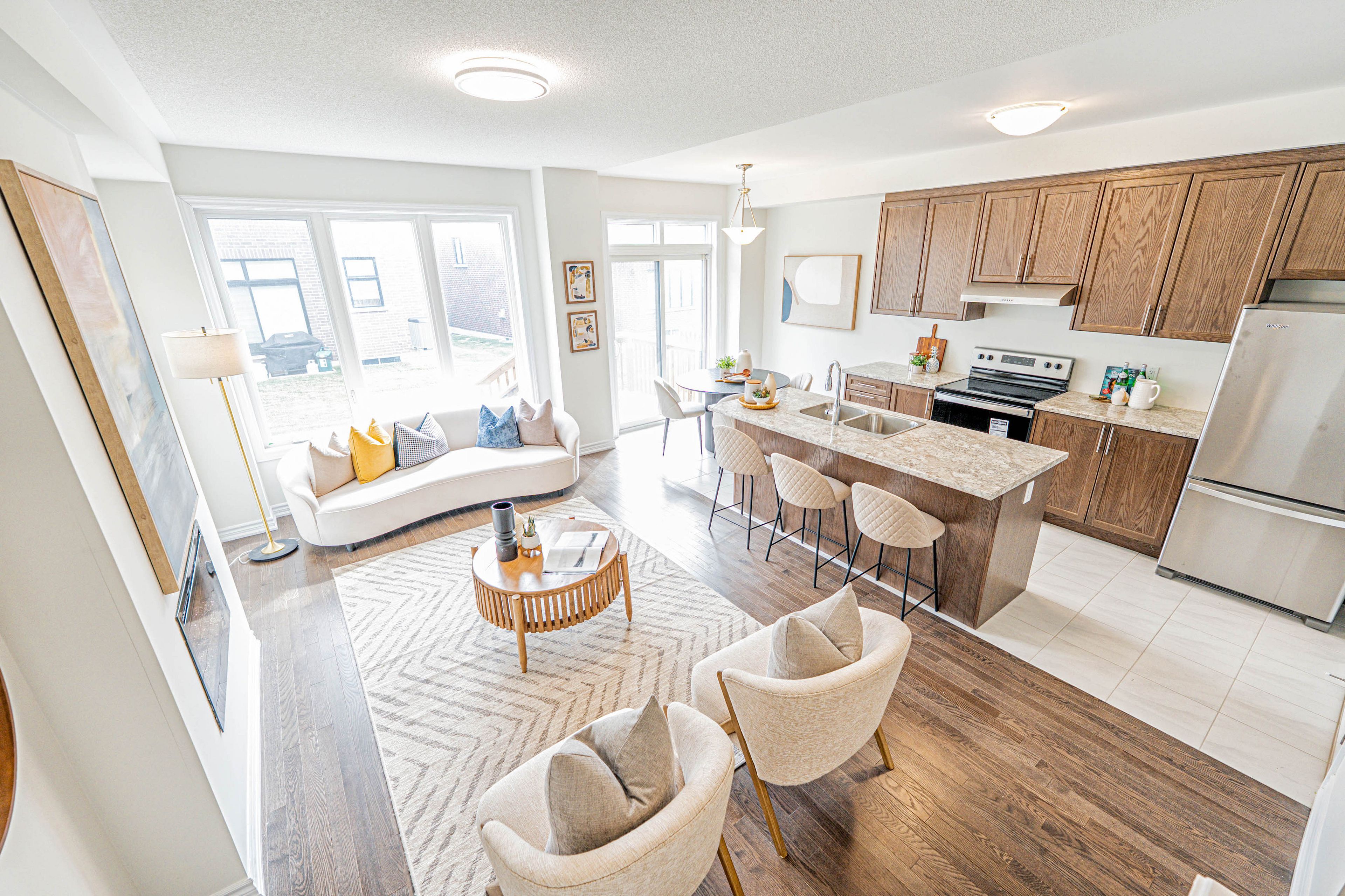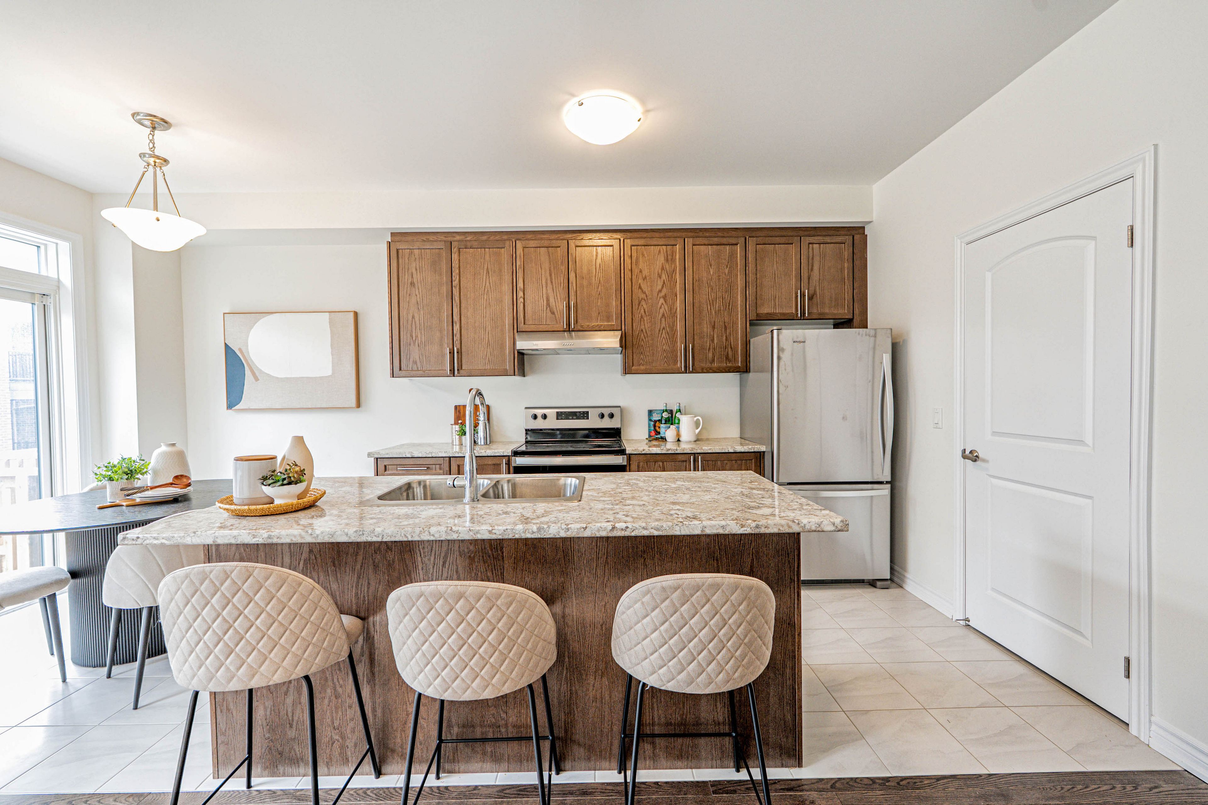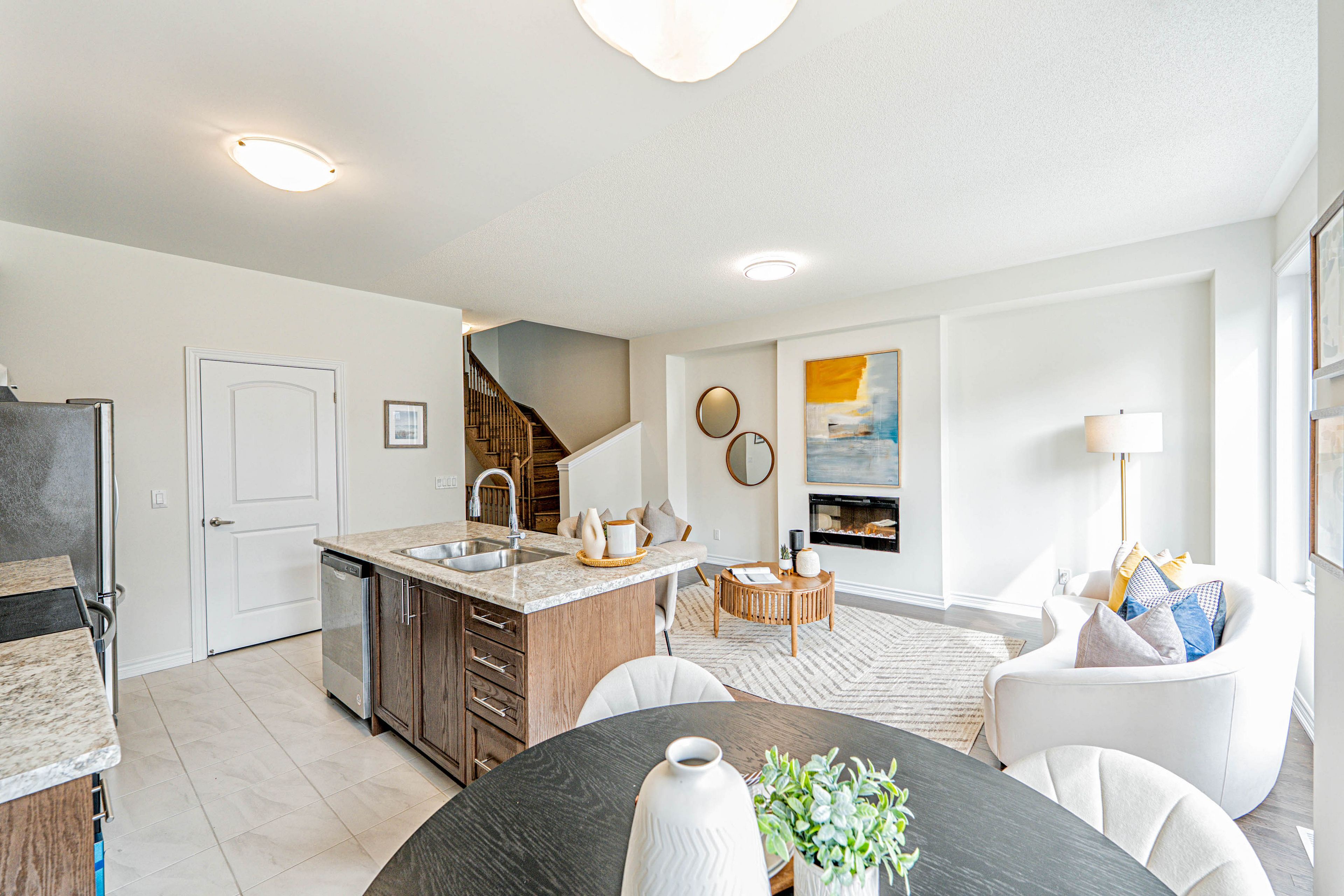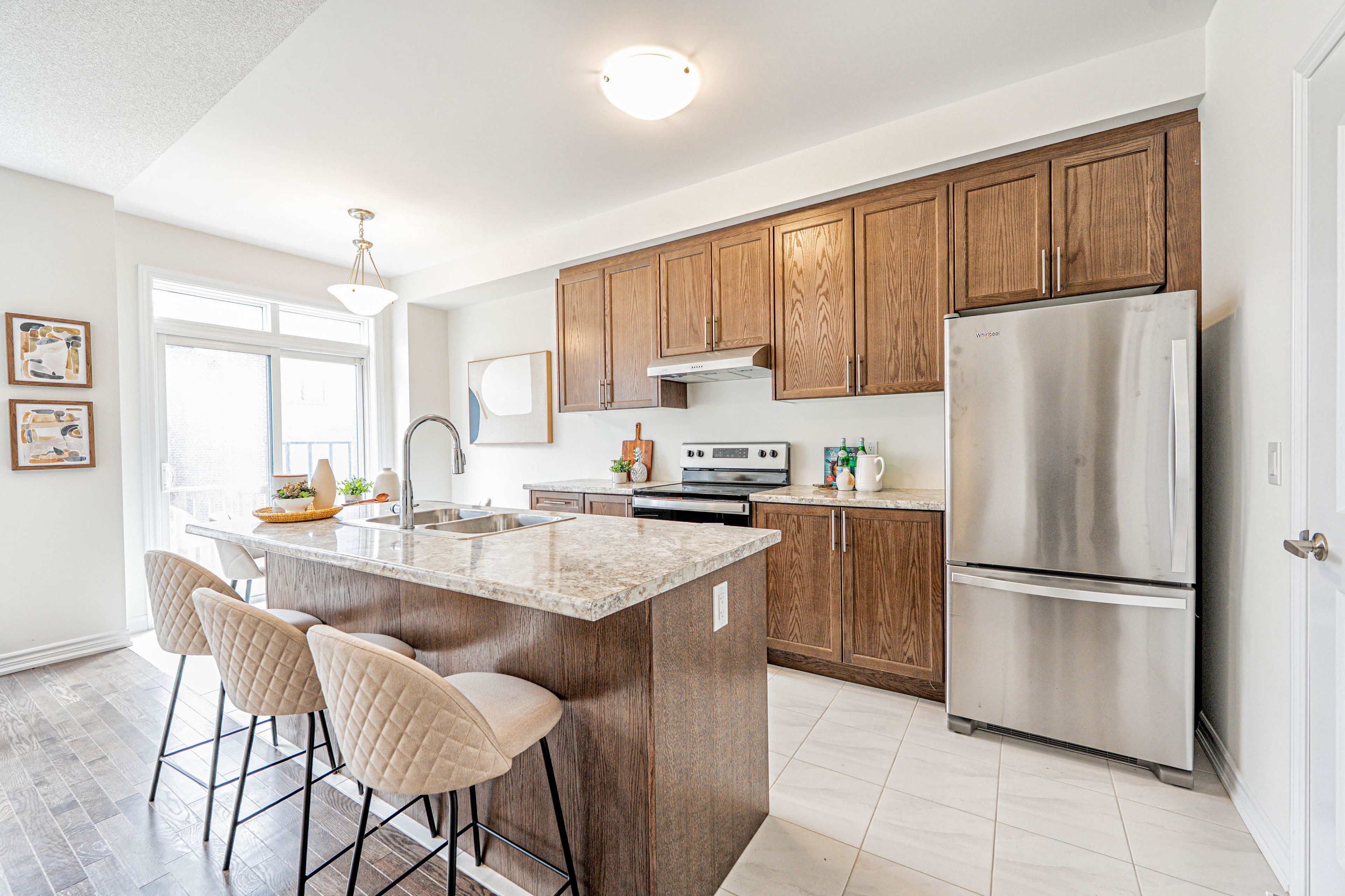 您的梦想家园静候您的到来!这栋精美升级的1992平方英尺永久产权联排别墅,将格调、舒适与便利完美融合,更无需担忧铲雪之扰!从踏入前厅的那一刻起,升级瓷砖地面、醒目的橡木楼梯以及主层典雅的实木地板便奠定了优雅基调。开放式厨房配备实用早餐吧台、不锈钢电器,早餐区直通宽敞露台,晨间咖啡或户外烧烤皆宜。温馨的客厅/餐厅区域配有嵌入式壁炉,为您提供放松与娱乐的惬意空间。