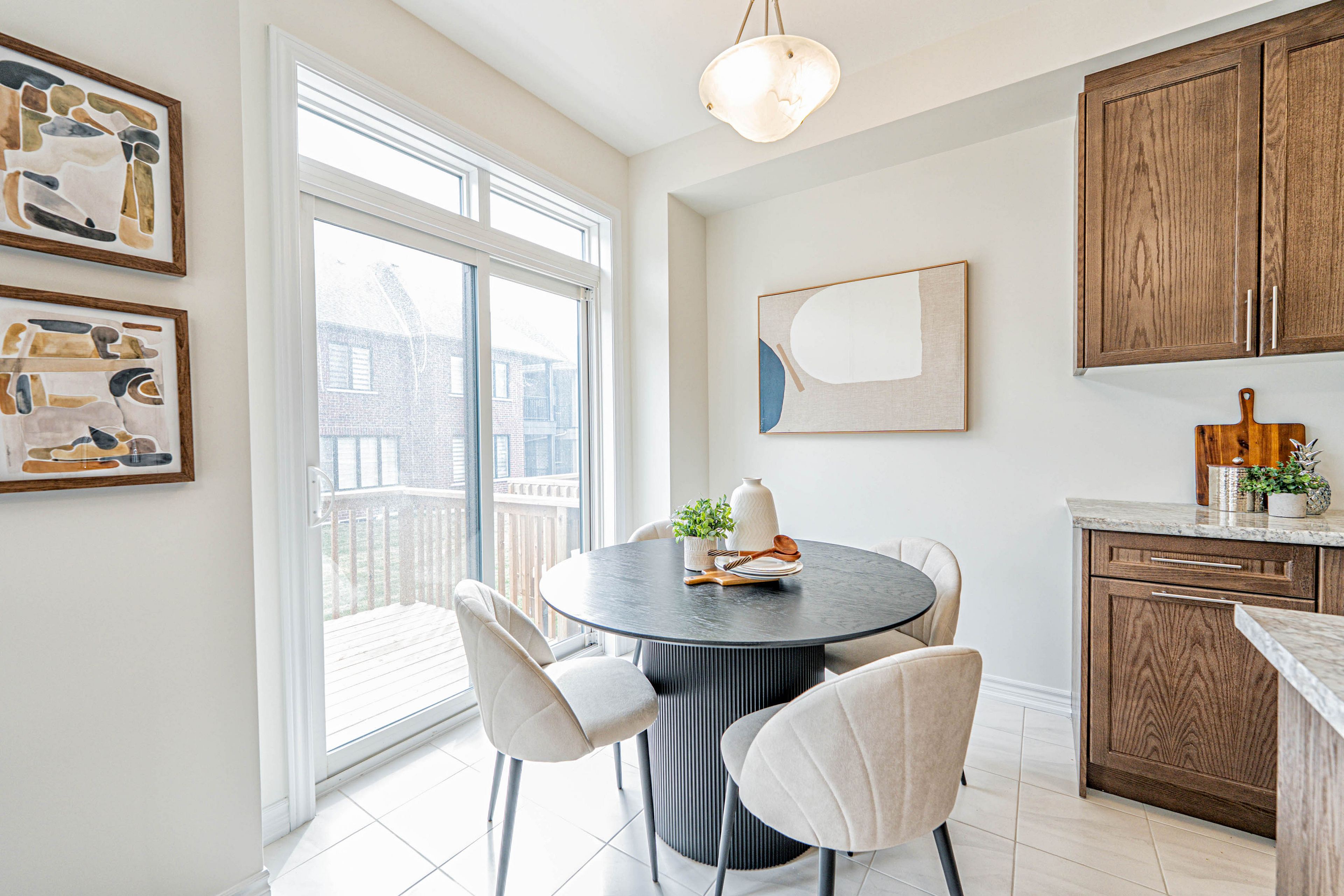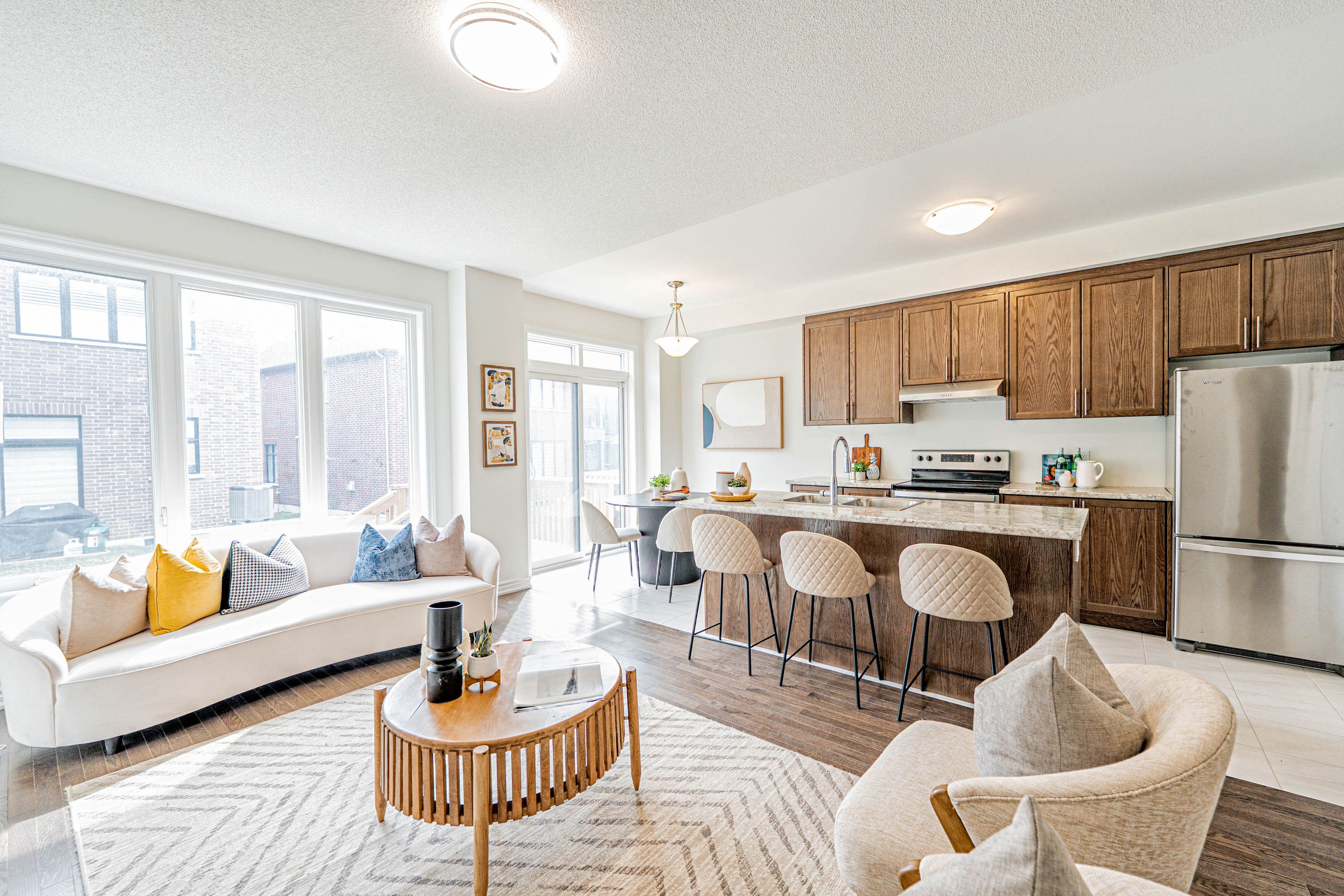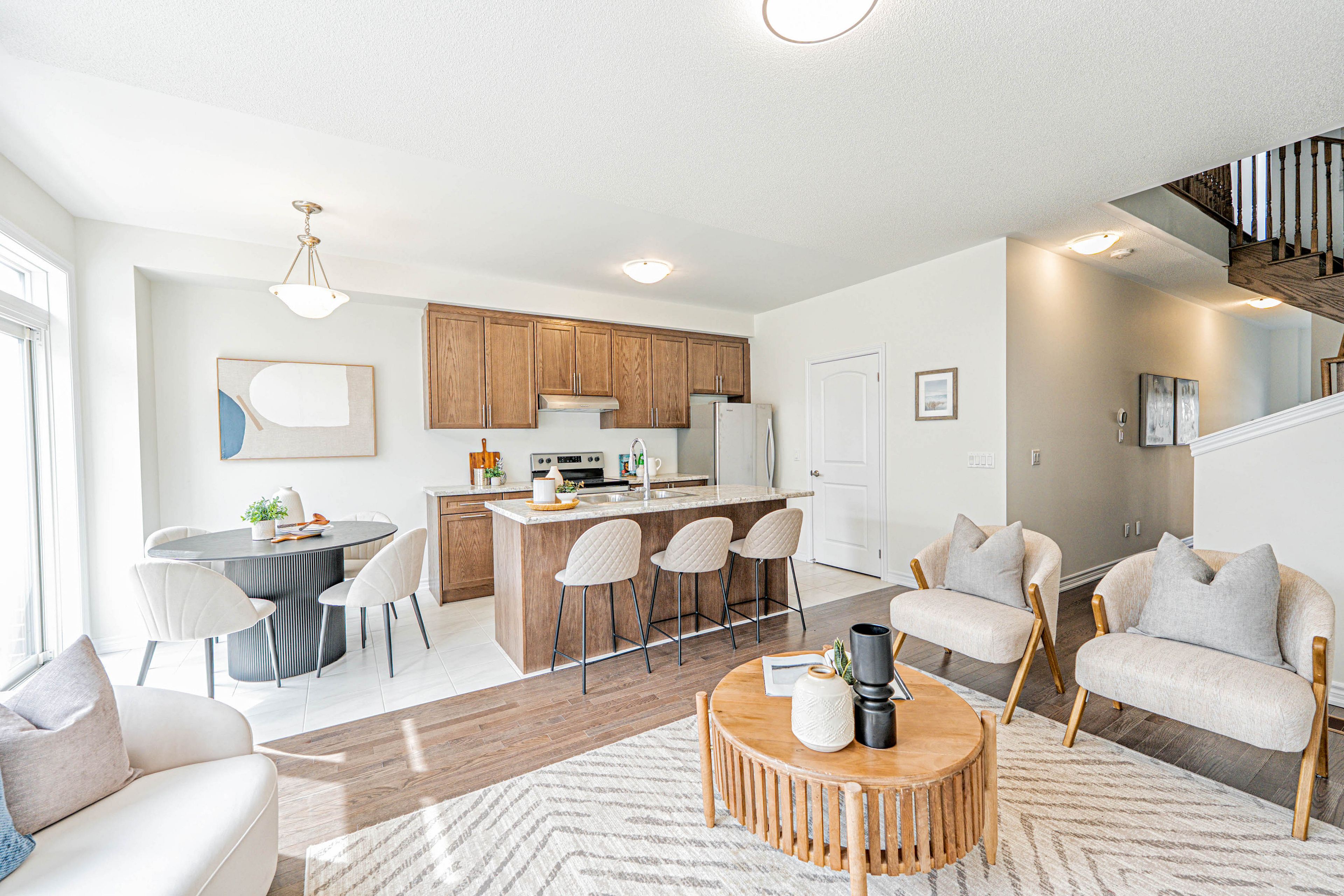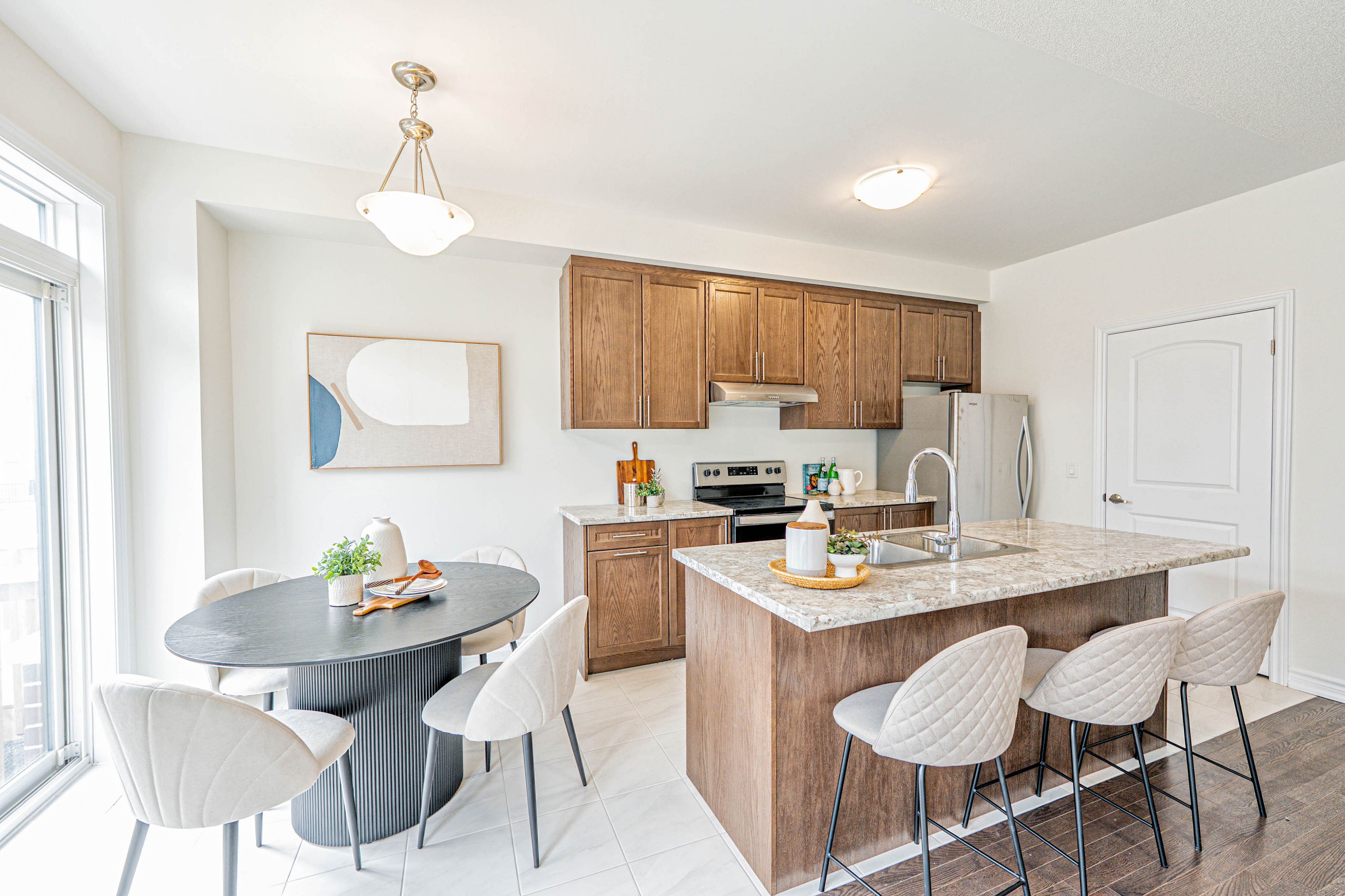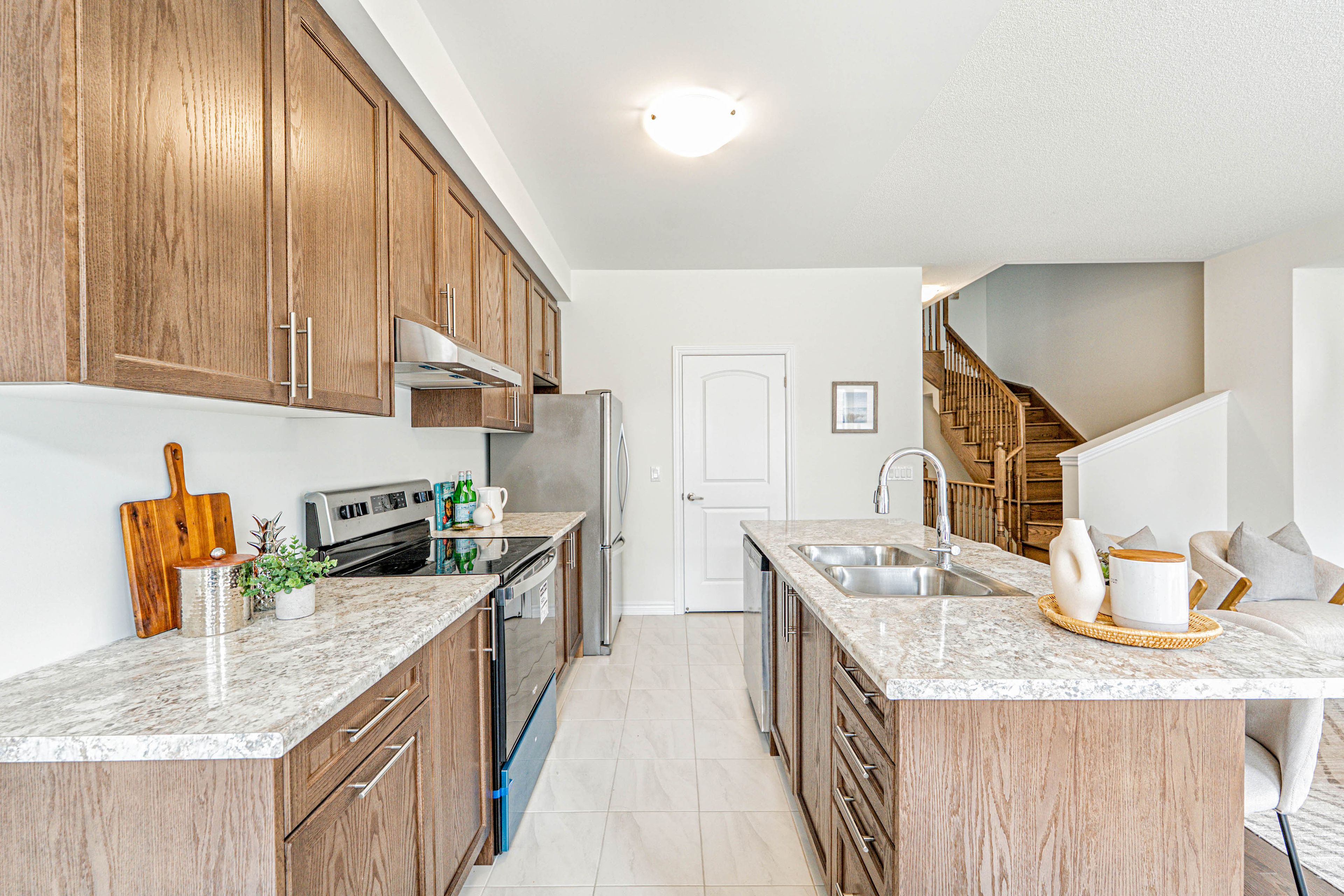 您的梦想家园静候您的到来!这栋精美升级的1992平方英尺永久产权联排别墅,将格调、舒适与便利完美融合,更无需担忧铲雪之扰!从踏入前厅的那一刻起,升级瓷砖地面、醒目的橡木楼梯以及主层典雅的实木地板便奠定了优雅基调。开放式厨房配备实用早餐吧台、不锈钢电器,早餐区直通宽敞露台,晨间咖啡或户外烧烤皆宜。温馨的客厅/餐厅区域配有嵌入式壁炉,为您提供放松与娱乐的惬意空间。