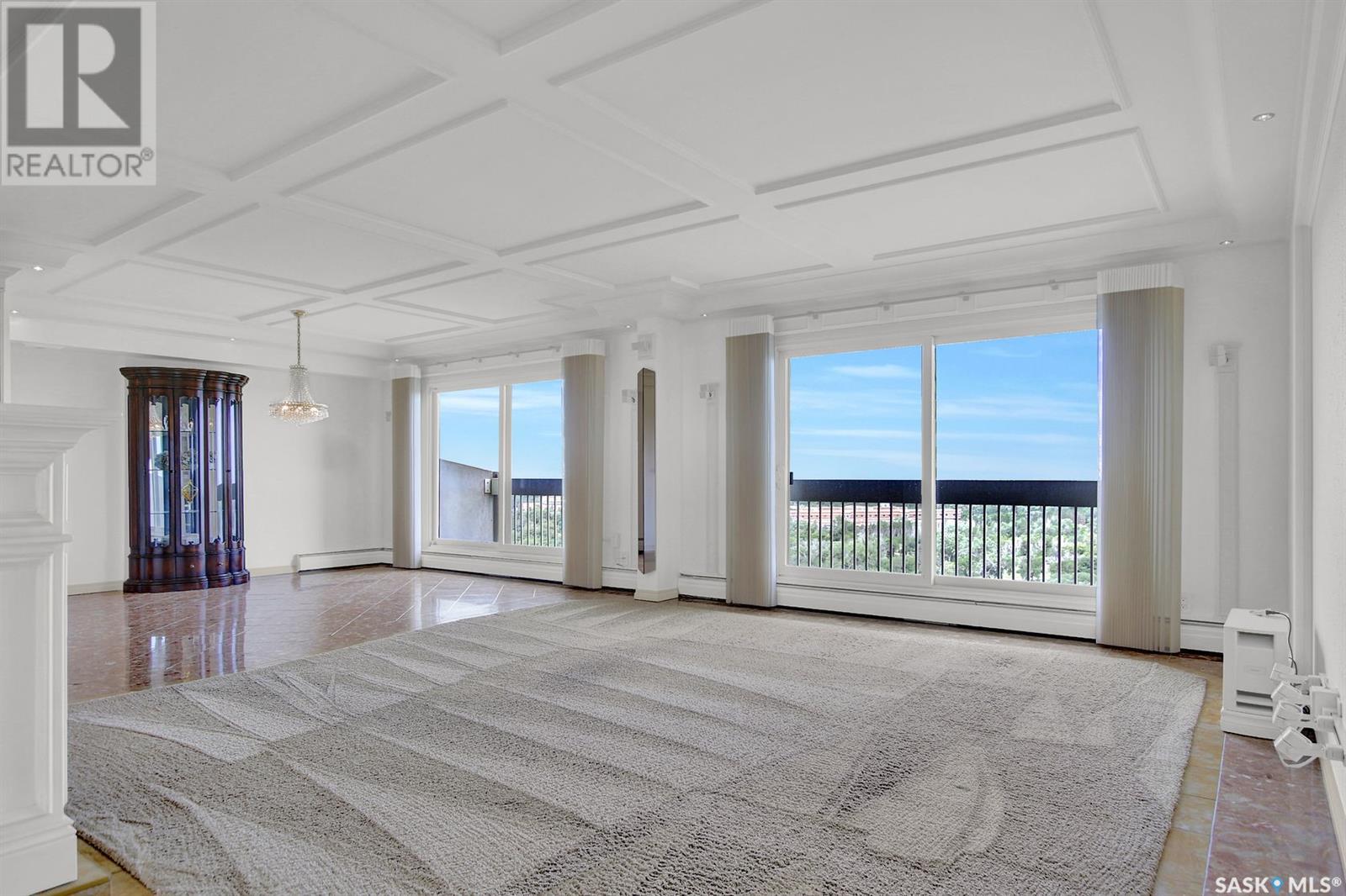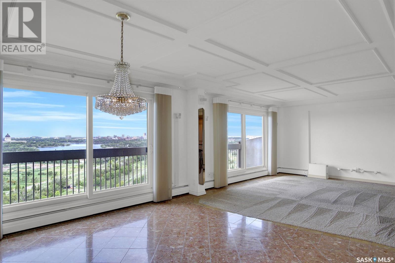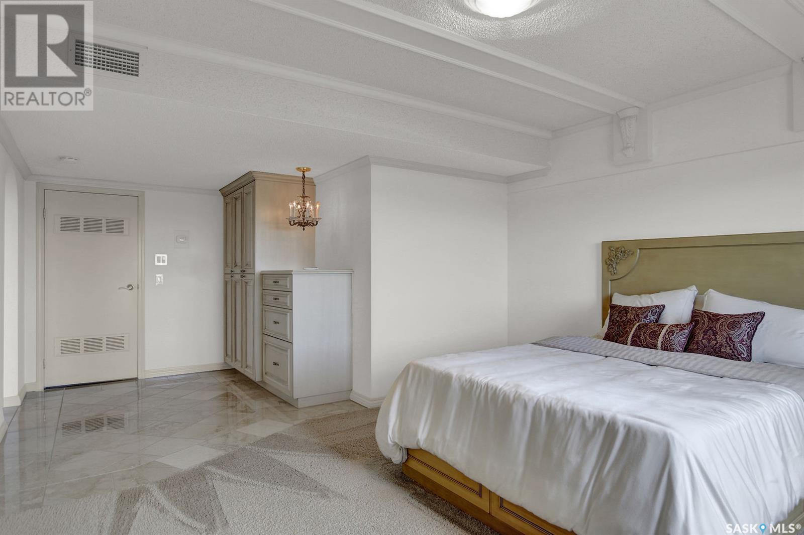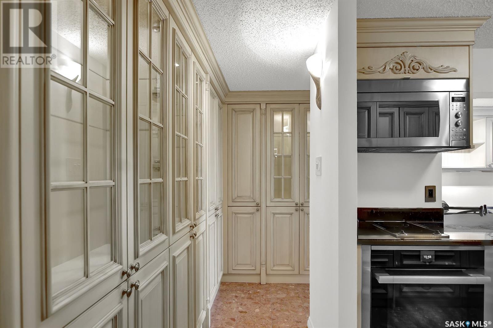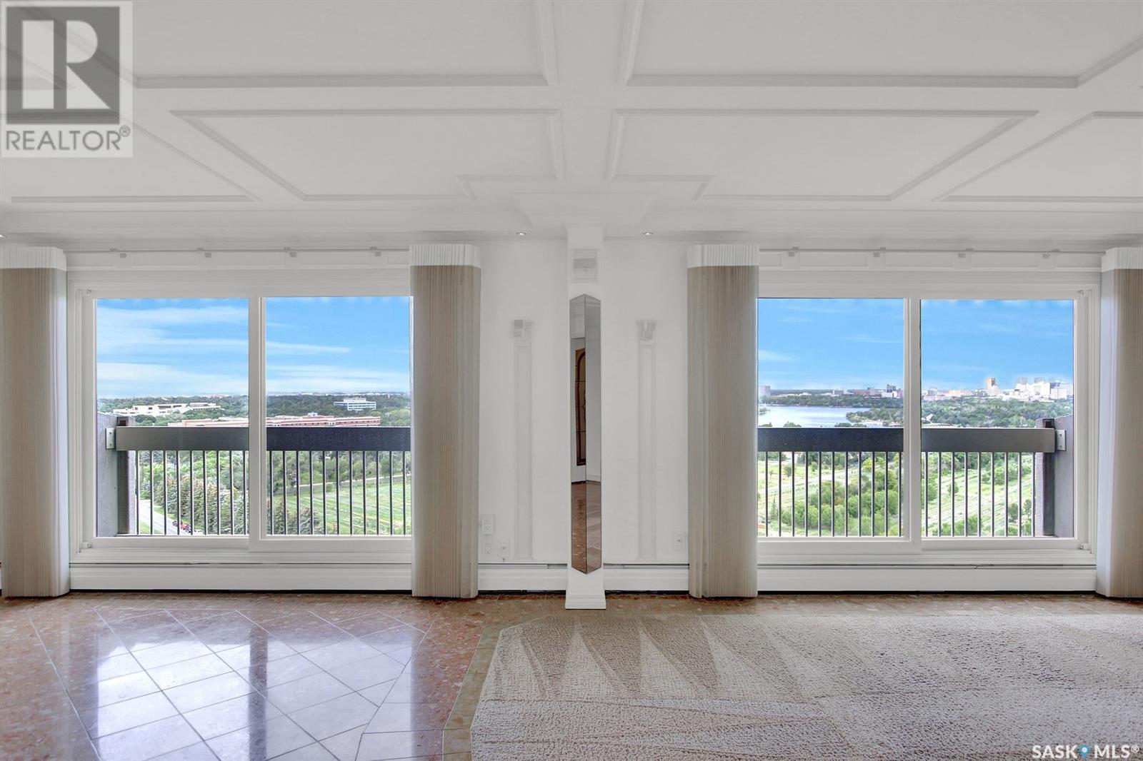 Stunning panoramic view of Wascana Park, Legislative building, City of Regina from most of the rooms & both balconies in this 16th flr condo in Robert’s Plaza. Spacious floor plan offers 2 large bedrooms & 2 bathrooms. Foyer closet has plenty of space for coats, footwear & seasonal storage, check out integrated Subzero freezer drawers & stunning marble floors that continue into the kitchen. Kitchen has Redl cabinets features numerous accessories, such as swing pull out corner pullouts, & integrated panelled Subzero appliances, a Miele stove, granite countertops, plus there are custom Redl built-ins for the pantry, china cabinet, desk in the kitchen. The marble flooring continues into the dining room, with a stunning chandelier, custom coffered ceiling details & patio doors to private balcony. The coffered ceiling detail continues into the living room featuring an electric fireplace and access to your second private balcony. The primary bedrooms custom cabinets include closet armoires, laundry closet, dresser as well as a platform bed additional storage below bed in order to maximize storage within the suite. Primary bedroom has a 4 pc ensuite. Second bedroom is currently used as a library den but easily converts to a guest bedroom with the Murphy bed furniture piece. Den has exceptional book case with a bar, tv storage, & filing storage cabinetry. The 3 pc bathrm is right off the second bedroom. Extras include: integrated Bose sound system, motorized drapery & two storage rooms, 1 heated underground parking space an electrified exterior parking spot. The concrete construction of the prestigious Roberts Plaza highrise provides excellent sound proof living. The building offers an indoor heated swimming pool, hot tub, sauna, exercise room, laundry room, squash court, outdoor patios & guest suite. Rare opportunity to own a luxury unit just steps away from Wascana Park & easy access to the University & Downtown. Call your real estate agent today to book your showing! (id:22211)