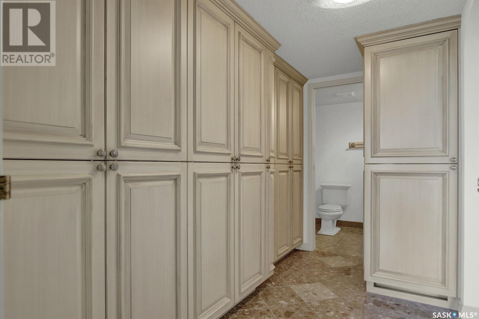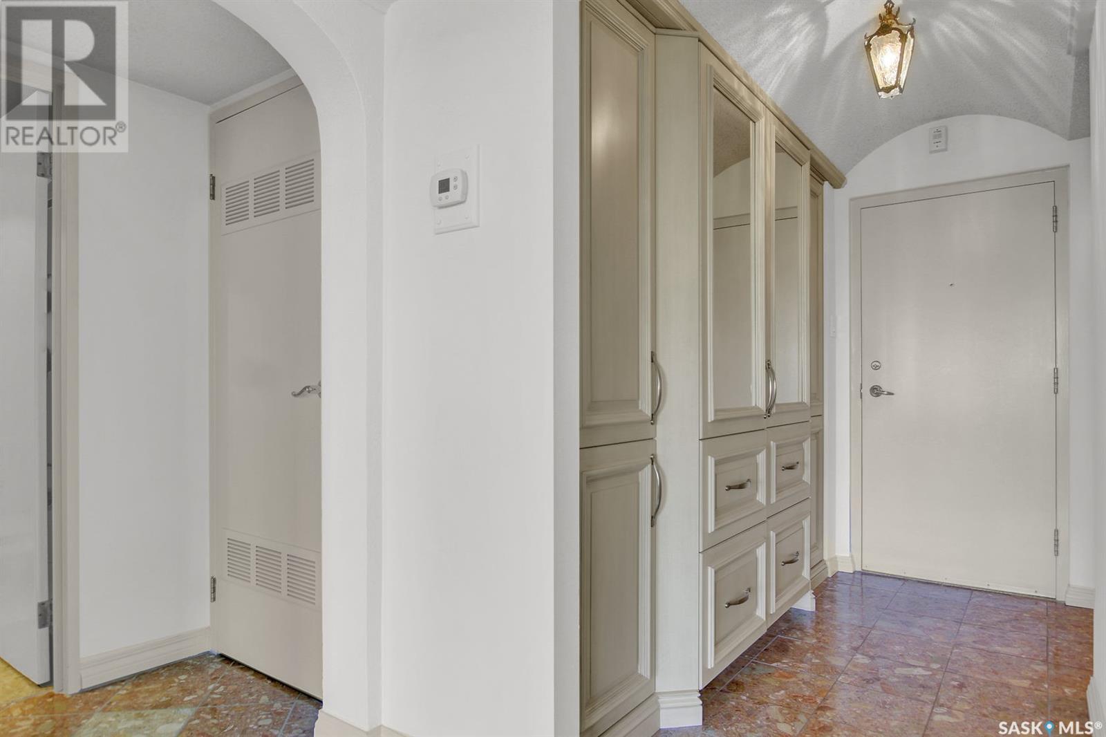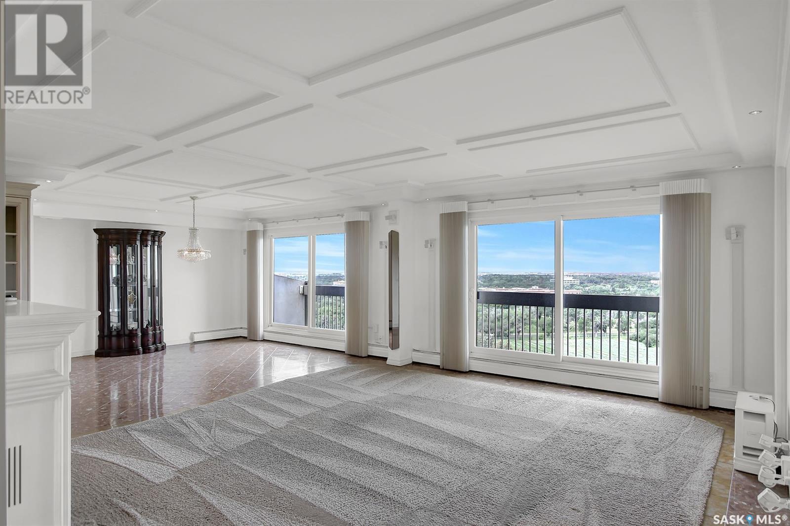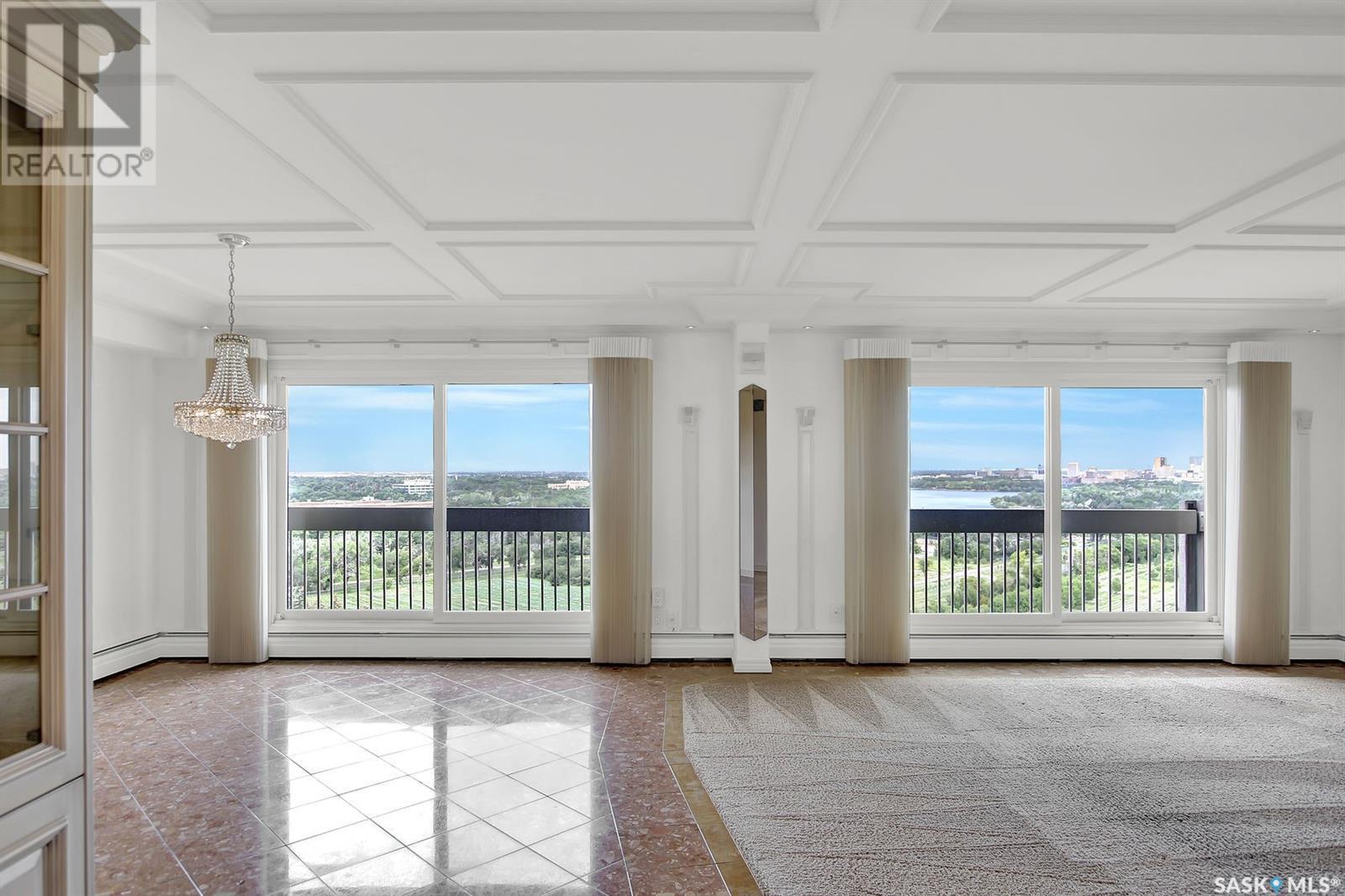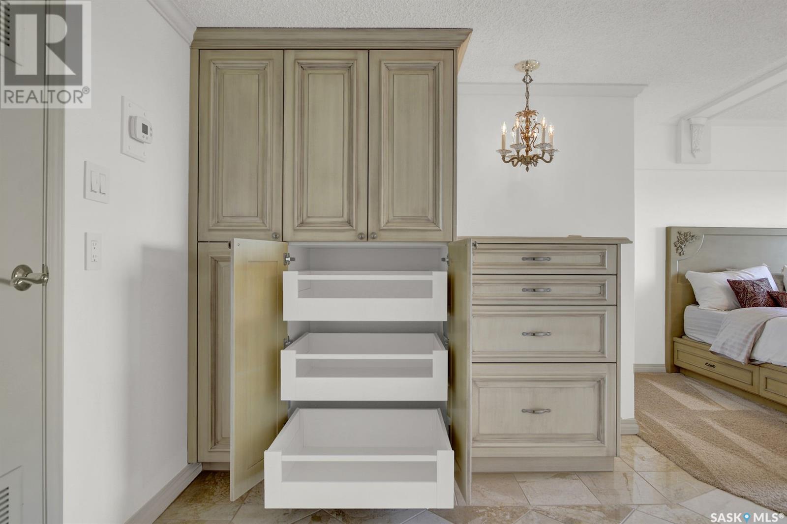 Stunning panoramic view of Wascana Park, Legislative building, City of Regina from most of the rooms & both balconies in this 16th flr condo in Robert’s Plaza. Spacious floor plan offers 2 large bedrooms & 2 bathrooms. Foyer closet has plenty of space for coats, footwear & seasonal storage, check out integrated Subzero freezer drawers & stunning marble floors that continue into the kitchen. Kitchen has Redl cabinets features numerous accessories, such as swing pull out corner pullouts, & integrated panelled Subzero appliances, a Miele stove, granite countertops, plus there are custom Redl built-ins for the pantry, china cabinet, desk in the kitchen. The marble flooring continues into the dining room, with a stunning chandelier, custom coffered ceiling details & patio doors to private balcony. The coffered ceiling detail continues into the living room featuring an electric fireplace and access to your second private balcony. The primary bedrooms custom cabinets include closet armoires, laundry closet, dresser as well as a platform bed additional storage below bed in order to maximize storage within the suite. Primary bedroom has a 4 pc ensuite. Second bedroom is currently used as a library den but easily converts to a guest bedroom with the Murphy bed furniture piece. Den has exceptional book case with a bar, tv storage, & filing storage cabinetry. The 3 pc bathrm is right off the second bedroom. Extras include: integrated Bose sound system, motorized drapery & two storage rooms, 1 heated underground parking space an electrified exterior parking spot. The concrete construction of the prestigious Roberts Plaza highrise provides excellent sound proof living. The building offers an indoor heated swimming pool, hot tub, sauna, exercise room, laundry room, squash court, outdoor patios & guest suite. Rare opportunity to own a luxury unit just steps away from Wascana Park & easy access to the University & Downtown. Call your real estate agent today to book your showing! (id:22211)