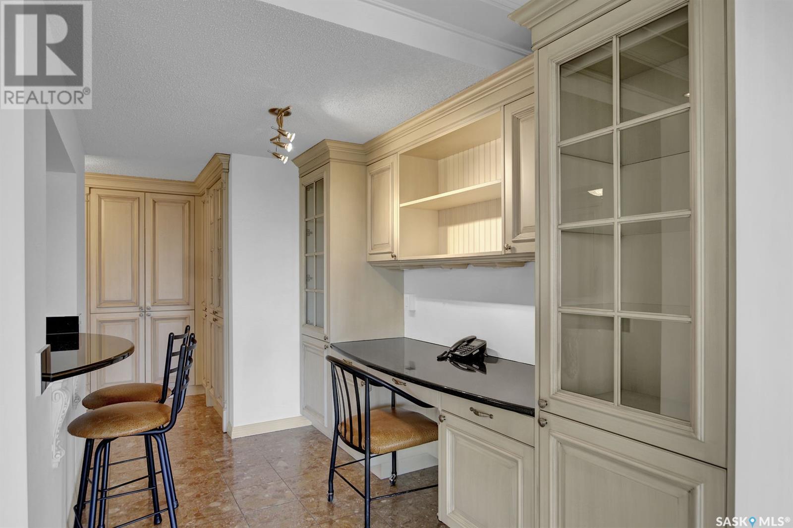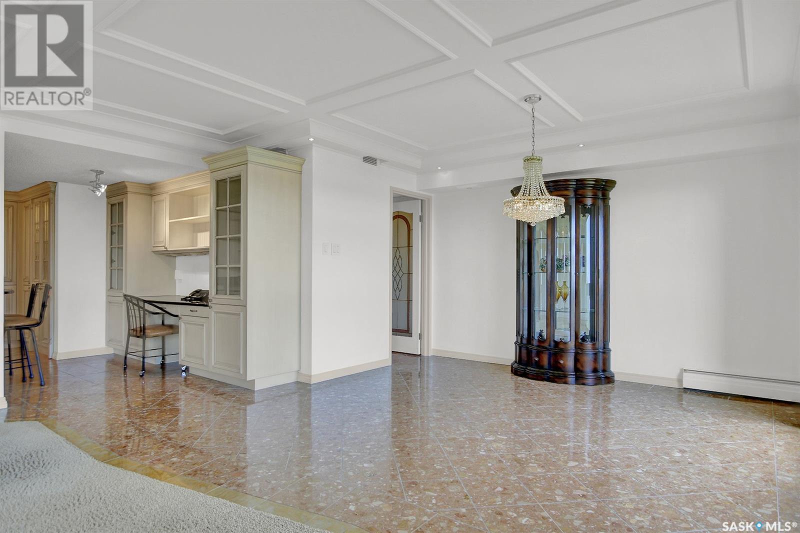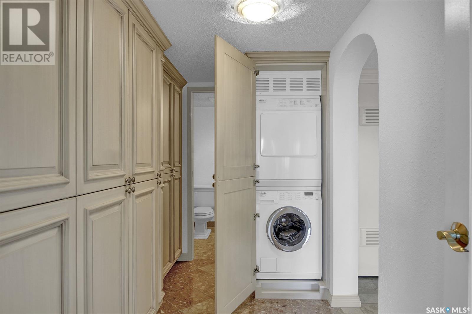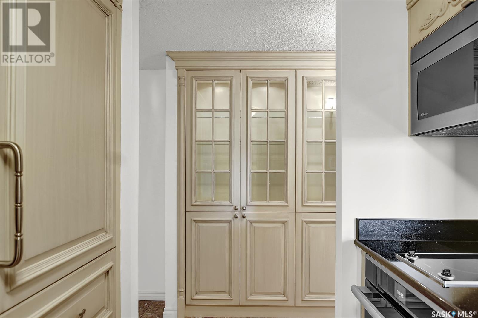 Stunning panoramic view of Wascana Park, Legislative building, City of Regina from most of the rooms & both balconies in this 16th flr condo in Robert’s Plaza. Spacious floor plan offers 2 large bedrooms & 2 bathrooms. Foyer closet has plenty of space for coats, footwear & seasonal storage, check out integrated Subzero freezer drawers & stunning marble floors that continue into the kitchen. Kitchen has Redl cabinets features numerous accessories, such as swing pull out corner pullouts, & integrated panelled Subzero appliances, a Miele stove, granite countertops, plus there are custom Redl built-ins for the pantry, china cabinet, desk in the kitchen. The marble flooring continues into the dining room, with a stunning chandelier, custom coffered ceiling details & patio doors to private balcony. The coffered ceiling detail continues into the living room featuring an electric fireplace and access to your second private balcony. The primary bedrooms custom cabinets include closet armoires, laundry closet, dresser as well as a platform bed additional storage below bed in order to maximize storage within the suite. Primary bedroom has a 4 pc ensuite. Second bedroom is currently used as a library den but easily converts to a guest bedroom with the Murphy bed furniture piece. Den has exceptional book case with a bar, tv storage, & filing storage cabinetry. The 3 pc bathrm is right off the second bedroom. Extras include: integrated Bose sound system, motorized drapery & two storage rooms, 1 heated underground parking space an electrified exterior parking spot. The concrete construction of the prestigious Roberts Plaza highrise provides excellent sound proof living. The building offers an indoor heated swimming pool, hot tub, sauna, exercise room, laundry room, squash court, outdoor patios & guest suite. Rare opportunity to own a luxury unit just steps away from Wascana Park & easy access to the University & Downtown. Call your real estate agent today to book your showing! (id:22211)