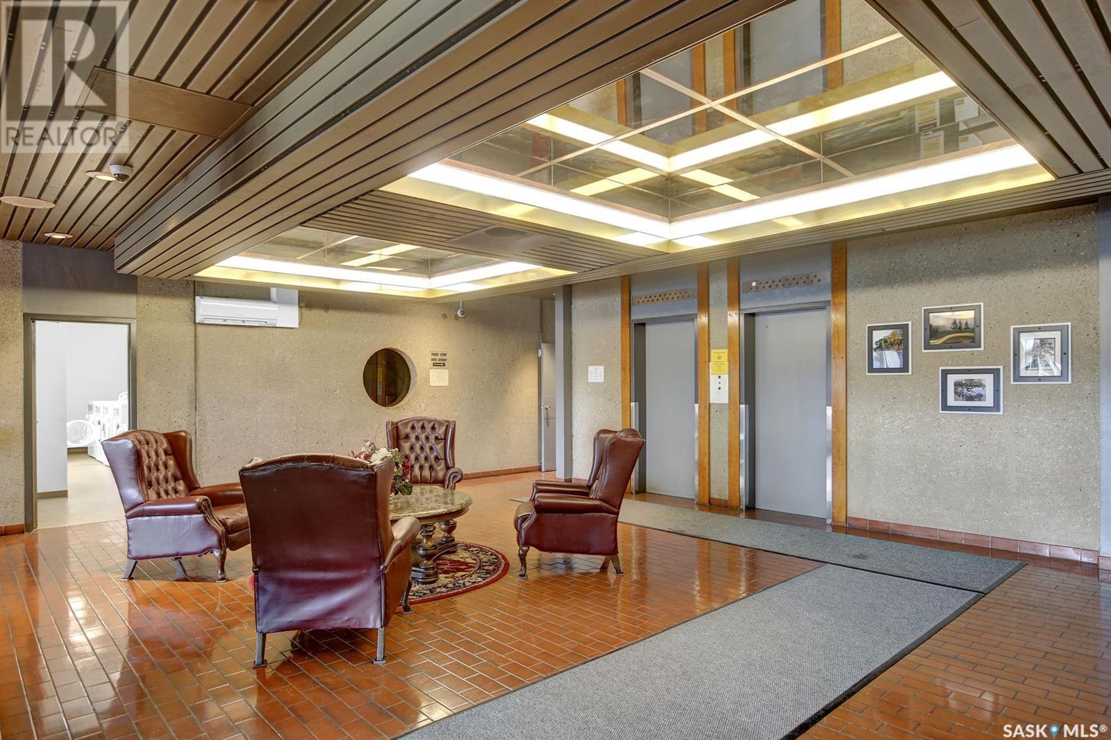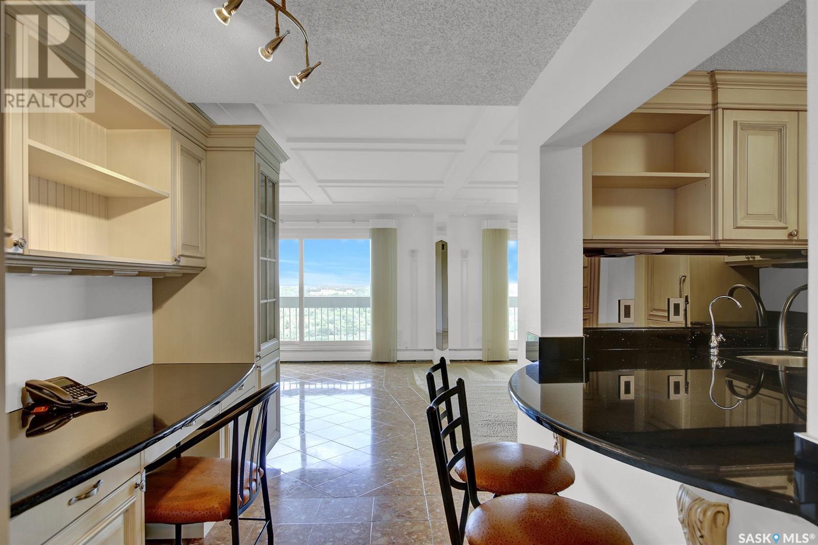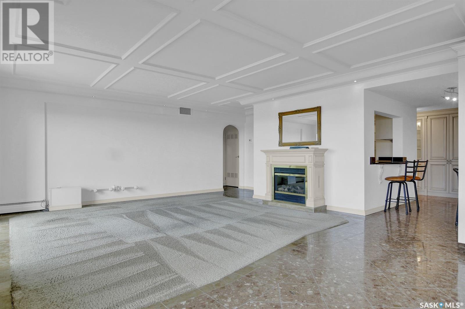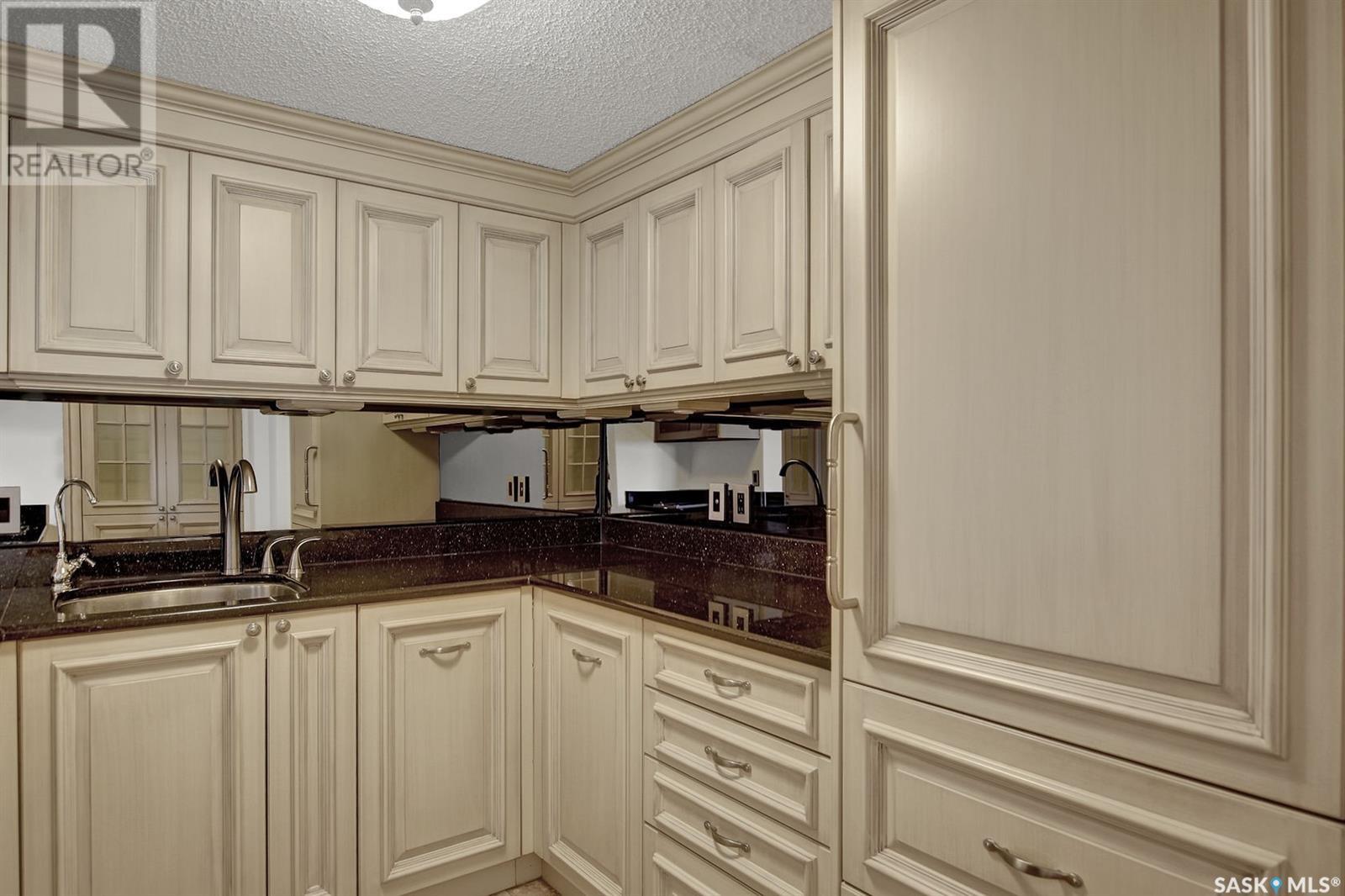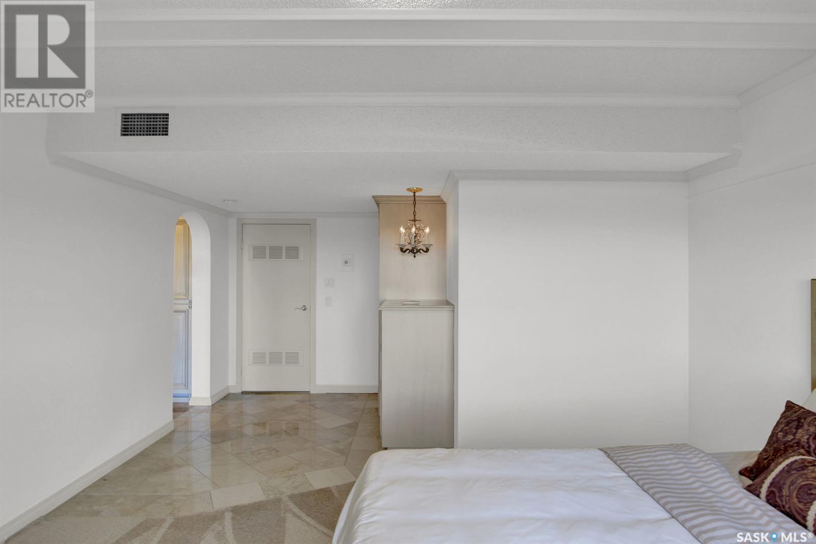 Stunning panoramic view of Wascana Park, Legislative building, City of Regina from most of the rooms & both balconies in this 16th flr condo in Robert’s Plaza. Spacious floor plan offers 2 large bedrooms & 2 bathrooms. Foyer closet has plenty of space for coats, footwear & seasonal storage, check out integrated Subzero freezer drawers & stunning marble floors that continue into the kitchen. Kitchen has Redl cabinets features numerous accessories, such as swing pull out corner pullouts, & integrated panelled Subzero appliances, a Miele stove, granite countertops, plus there are custom Redl built-ins for the pantry, china cabinet, desk in the kitchen. The marble flooring continues into the dining room, with a stunning chandelier, custom coffered ceiling details & patio doors to private balcony. The coffered ceiling detail continues into the living room featuring an electric fireplace and access to your second private balcony. The primary bedrooms custom cabinets include closet armoires, laundry closet, dresser as well as a platform bed additional storage below bed in order to maximize storage within the suite. Primary bedroom has a 4 pc ensuite. Second bedroom is currently used as a library den but easily converts to a guest bedroom with the Murphy bed furniture piece. Den has exceptional book case with a bar, tv storage, & filing storage cabinetry. The 3 pc bathrm is right off the second bedroom. Extras include: integrated Bose sound system, motorized drapery & two storage rooms, 1 heated underground parking space an electrified exterior parking spot. The concrete construction of the prestigious Roberts Plaza highrise provides excellent sound proof living. The building offers an indoor heated swimming pool, hot tub, sauna, exercise room, laundry room, squash court, outdoor patios & guest suite. Rare opportunity to own a luxury unit just steps away from Wascana Park & easy access to the University & Downtown. Call your real estate agent today to book your showing! (id:22211)