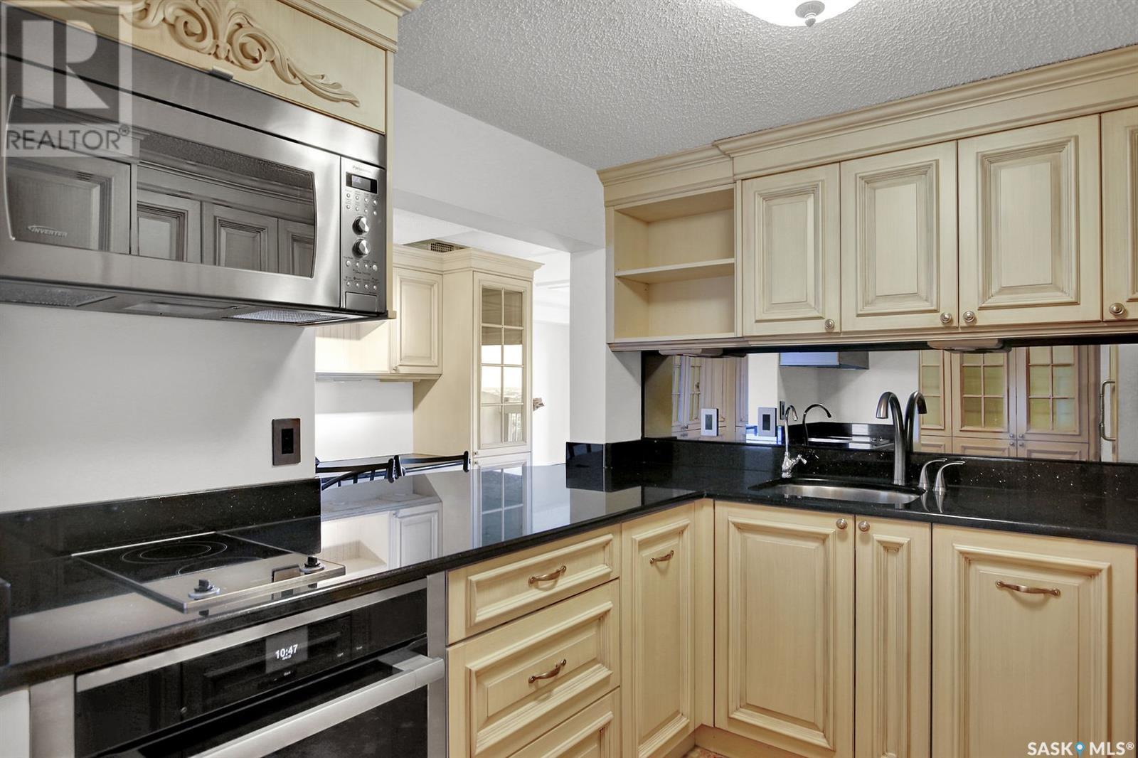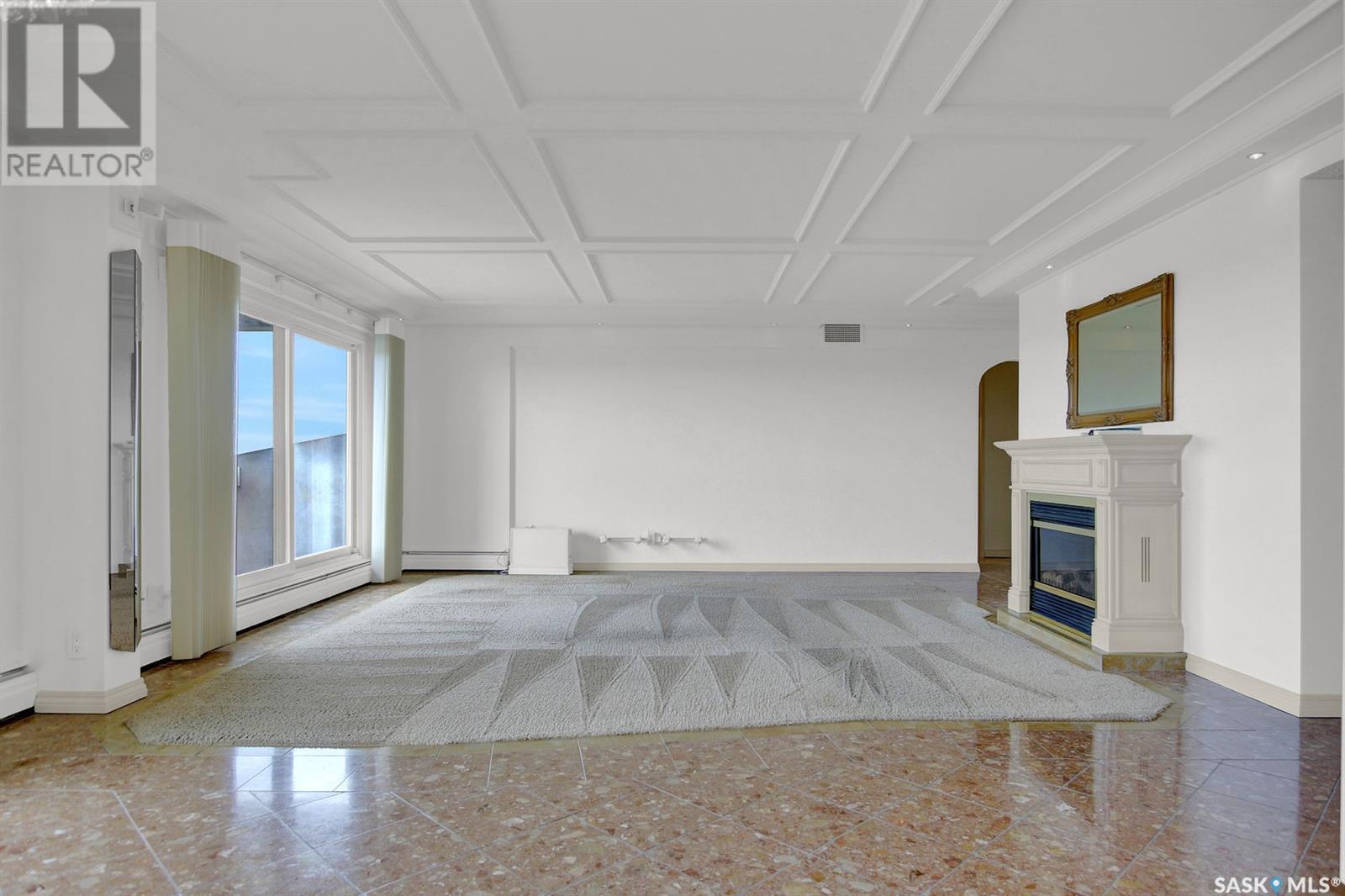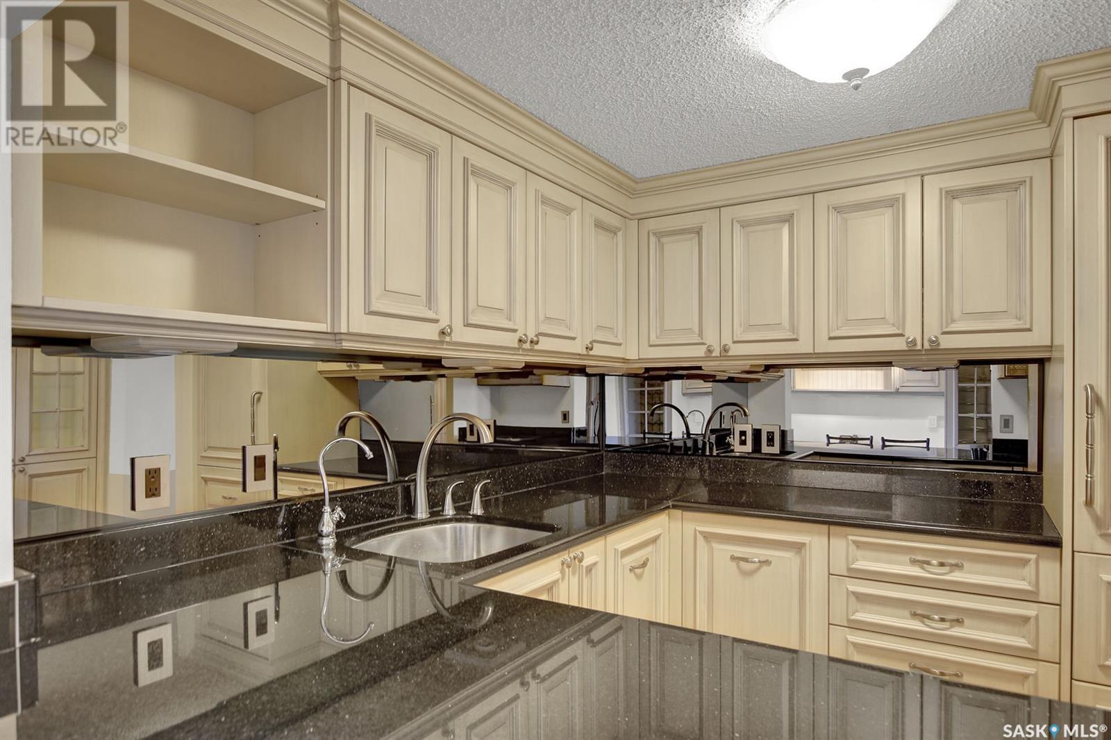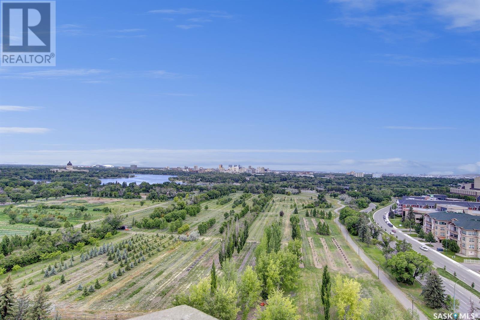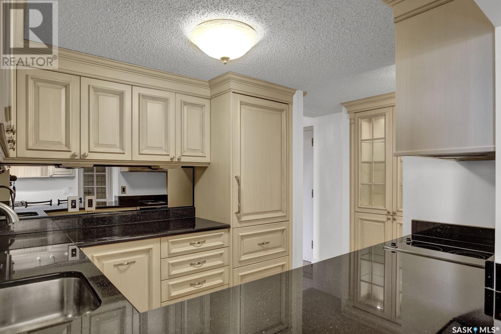Stunning panoramic view of Wascana Park, Legislative building, City of Regina from most of the rooms & both balconies in this 16th flr condo in Robert’s Plaza. Spacious floor plan offers 2 large bedrooms & 2 bathrooms. Foyer closet has plenty of space for coats, footwear & seasonal storage, check out integrated Subzero freezer drawers & stunning marble floors that continue into the kitchen. Kitchen has Redl cabinets features numerous accessories, such as swing pull out corner pullouts, & integrated panelled Subzero appliances, a Miele stove, granite countertops, plus there are custom Redl built-ins for the pantry, china cabinet, desk in the kitchen. The marble flooring continues into the dining room, with a stunning chandelier, custom coffered ceiling details & patio doors to private balcony. The coffered ceiling detail continues into the living room featuring an electric fireplace and access to your second private balcony. The primary bedrooms custom cabinets include closet armoires, laundry closet, dresser as well as a platform bed additional storage below bed in order to maximize storage within the suite. Primary bedroom has a 4 pc ensuite. Second bedroom is currently used as a library den but easily converts to a guest bedroom with the Murphy bed furniture piece. Den has exceptional book case with a bar, tv storage, & filing storage cabinetry. The 3 pc bathrm is right off the second bedroom. Extras include: integrated Bose sound system, motorized drapery & two storage rooms, 1 heated underground parking space an electrified exterior parking spot. The concrete construction of the prestigious Roberts Plaza highrise provides excellent sound proof living. The building offers an indoor heated swimming pool, hot tub, sauna, exercise room, laundry room, squash court, outdoor patios & guest suite. Rare opportunity to own a luxury unit just steps away from Wascana Park & easy access to the University & Downtown. Call your real estate agent today to book your showing! (id:22211)