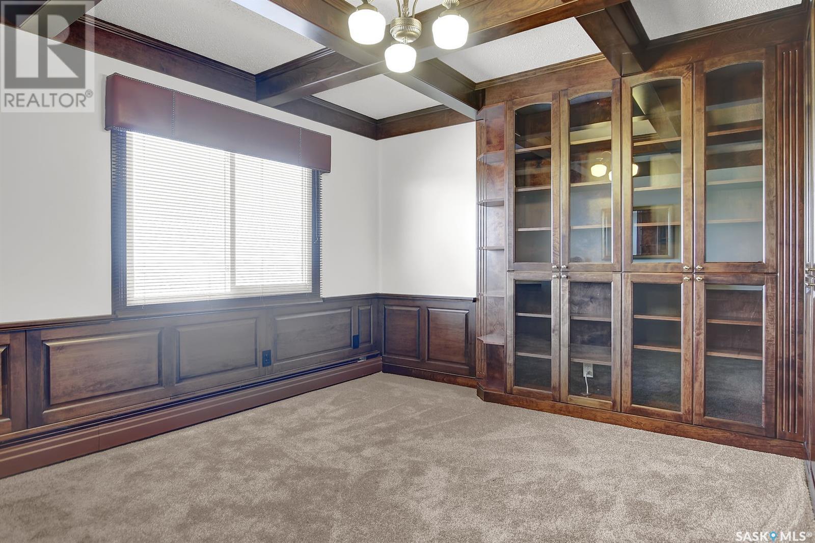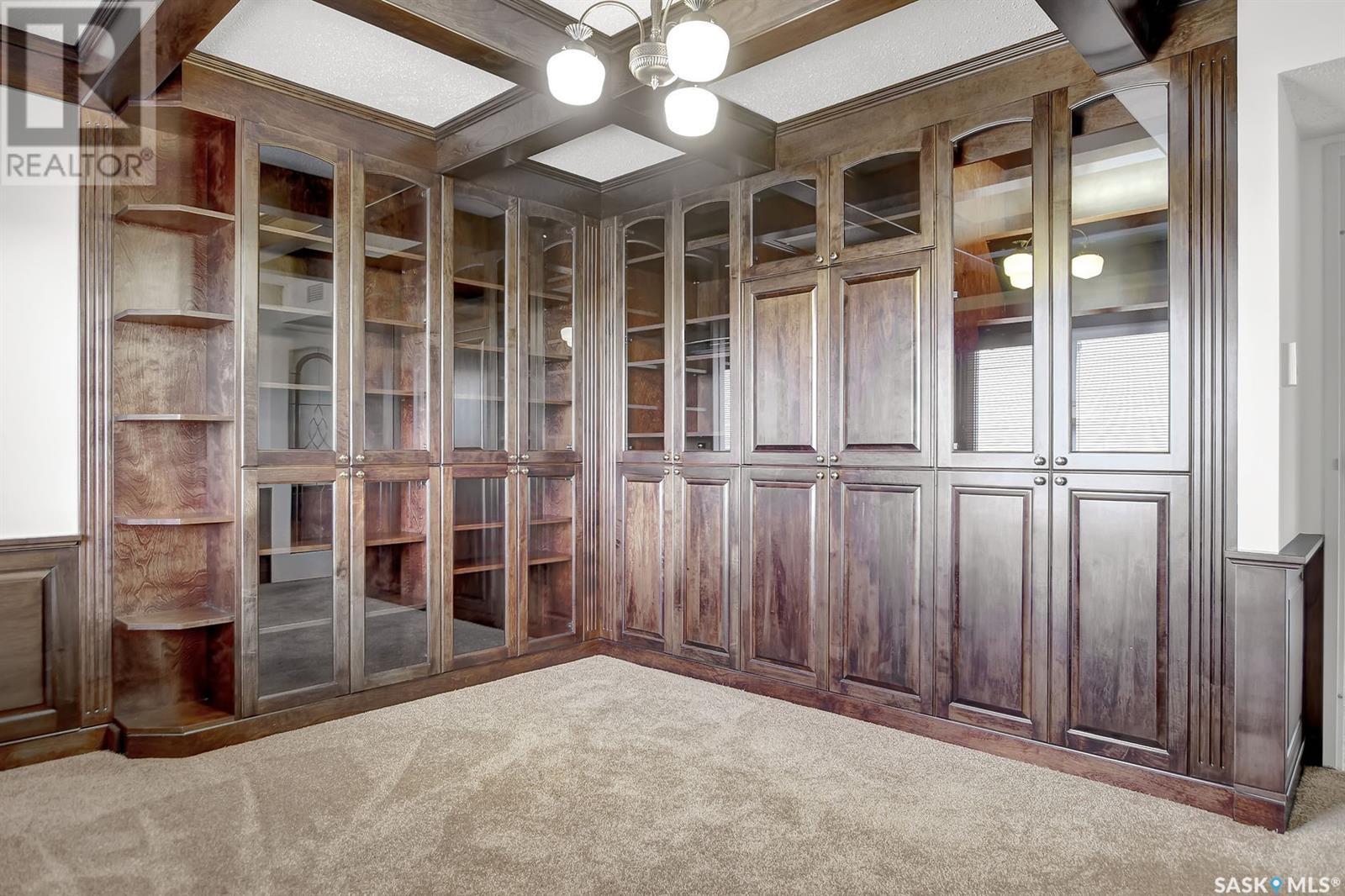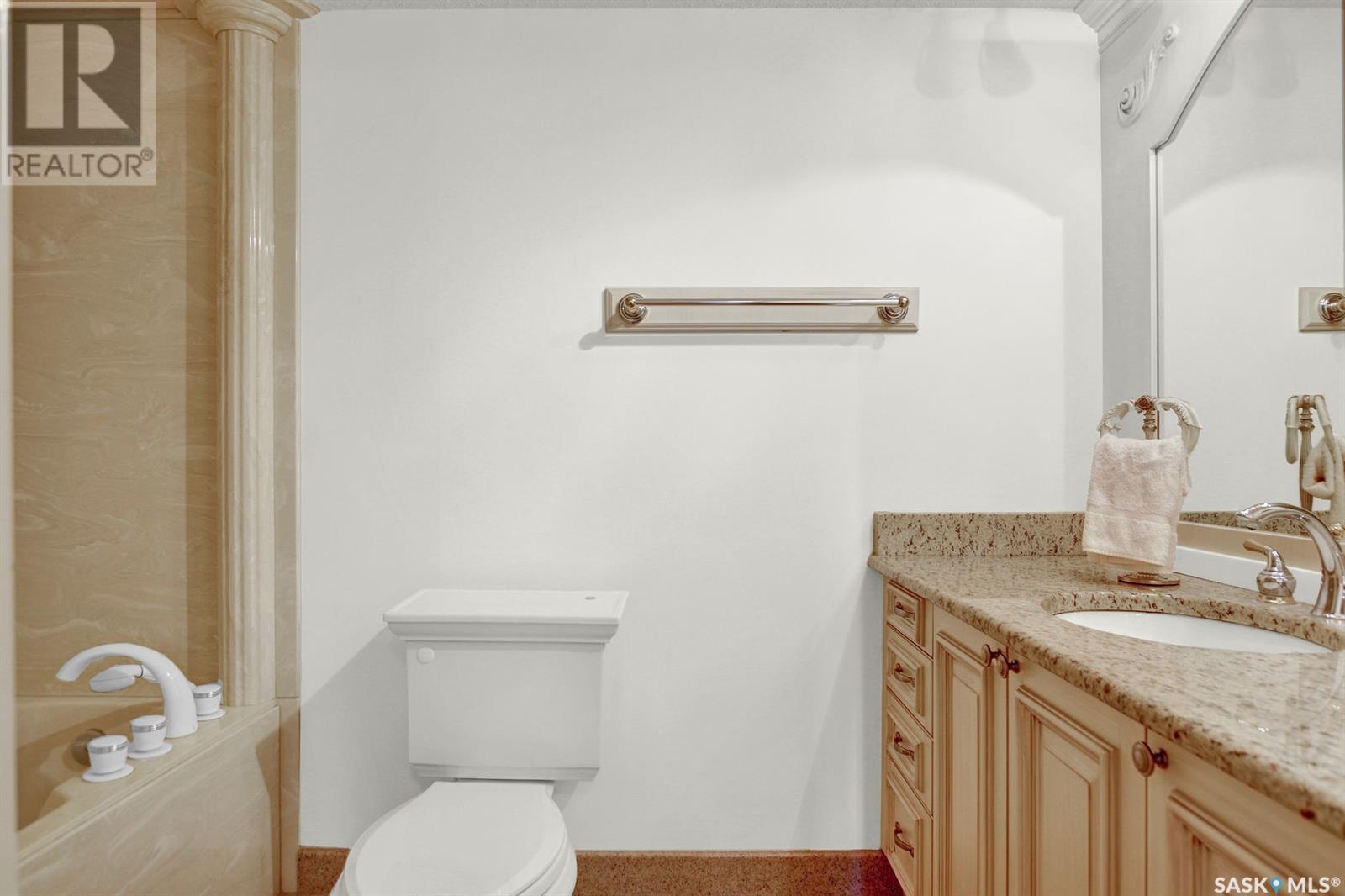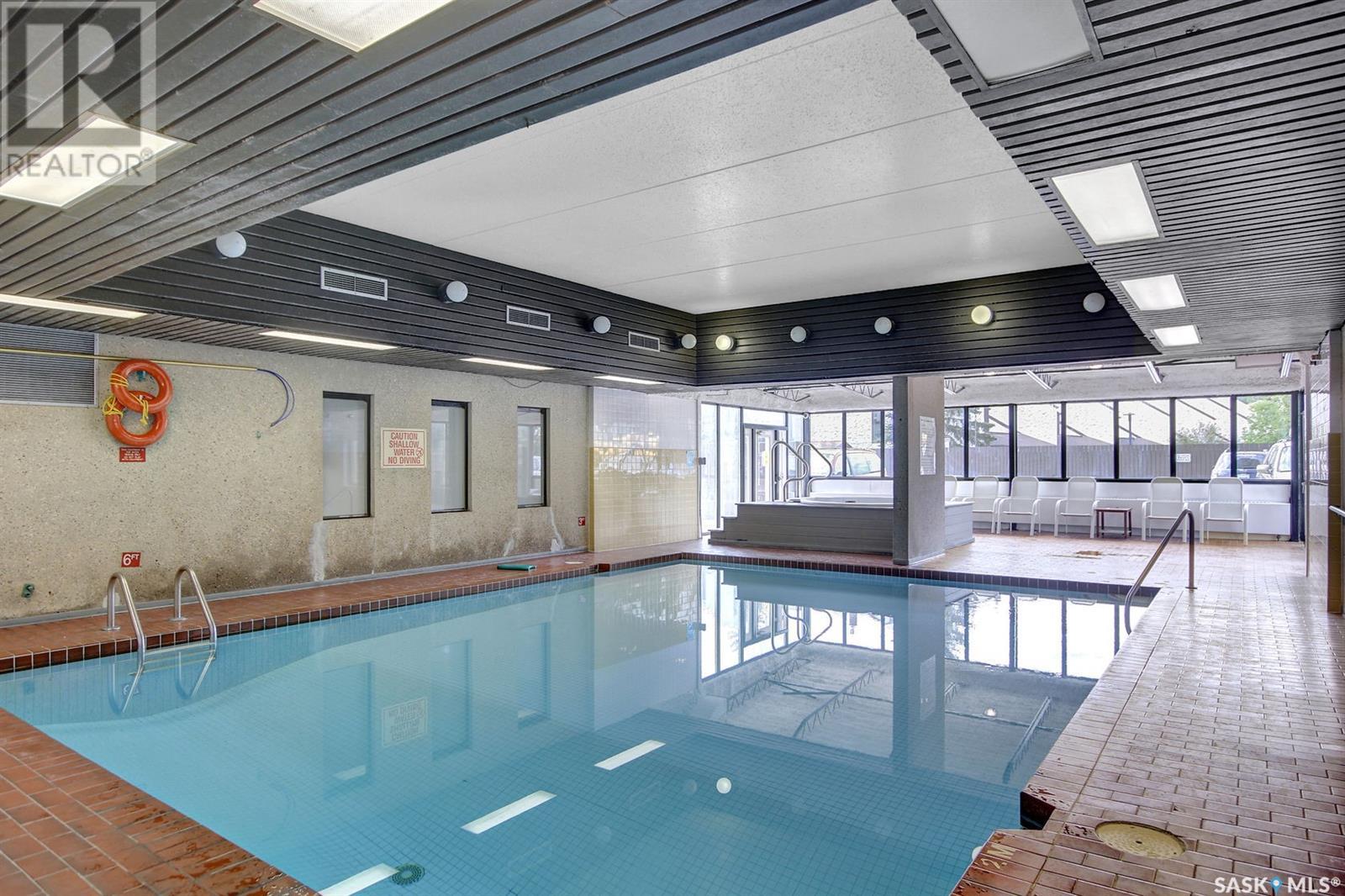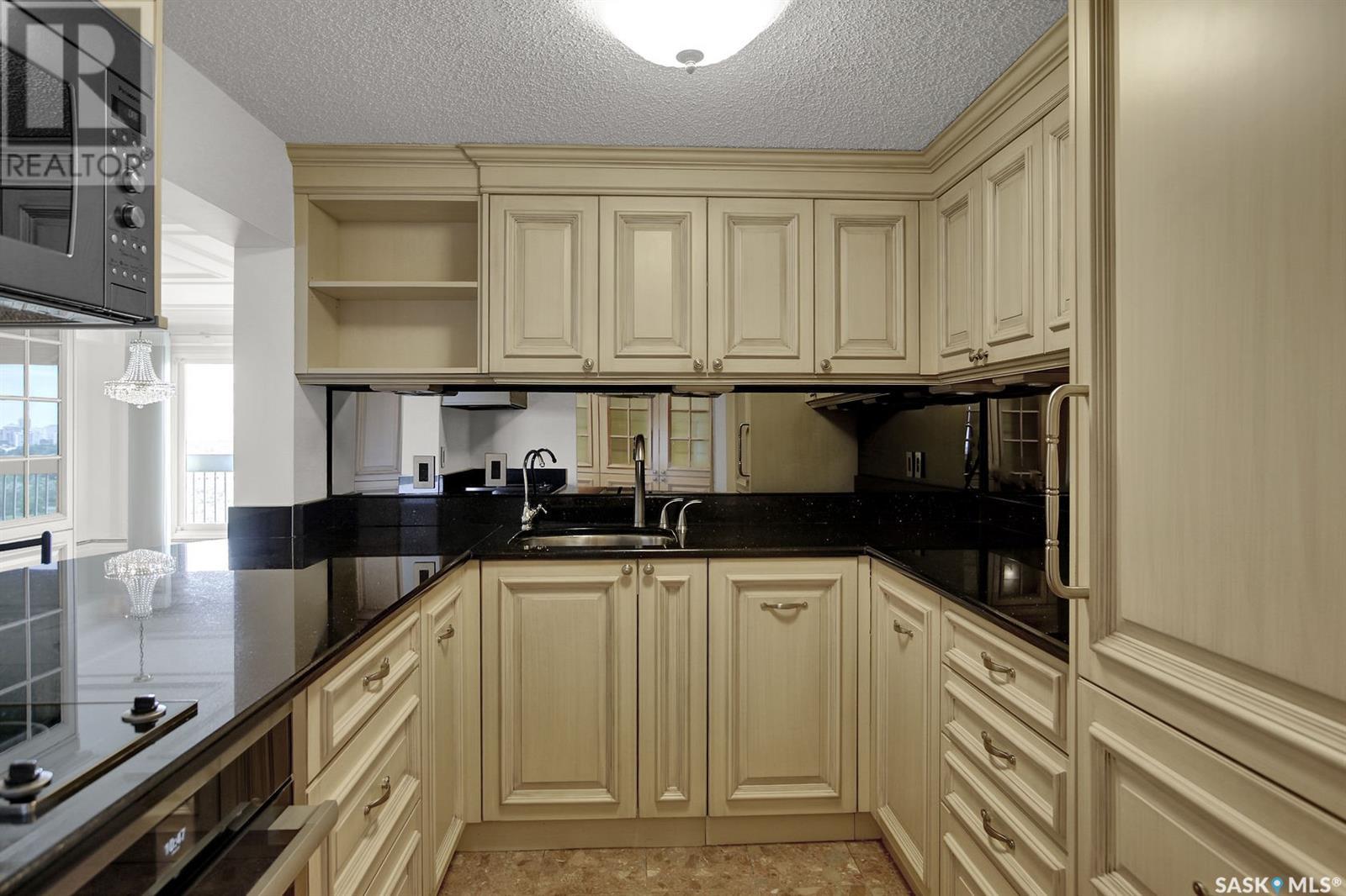 Stunning panoramic view of Wascana Park, Legislative building, City of Regina from most of the rooms & both balconies in this 16th flr condo in Robert’s Plaza. Spacious floor plan offers 2 large bedrooms & 2 bathrooms. Foyer closet has plenty of space for coats, footwear & seasonal storage, check out integrated Subzero freezer drawers & stunning marble floors that continue into the kitchen. Kitchen has Redl cabinets features numerous accessories, such as swing pull out corner pullouts, & integrated panelled Subzero appliances, a Miele stove, granite countertops, plus there are custom Redl built-ins for the pantry, china cabinet, desk in the kitchen. The marble flooring continues into the dining room, with a stunning chandelier, custom coffered ceiling details & patio doors to private balcony. The coffered ceiling detail continues into the living room featuring an electric fireplace and access to your second private balcony. The primary bedrooms custom cabinets include closet armoires, laundry closet, dresser as well as a platform bed additional storage below bed in order to maximize storage within the suite. Primary bedroom has a 4 pc ensuite. Second bedroom is currently used as a library den but easily converts to a guest bedroom with the Murphy bed furniture piece. Den has exceptional book case with a bar, tv storage, & filing storage cabinetry. The 3 pc bathrm is right off the second bedroom. Extras include: integrated Bose sound system, motorized drapery & two storage rooms, 1 heated underground parking space an electrified exterior parking spot. The concrete construction of the prestigious Roberts Plaza highrise provides excellent sound proof living. The building offers an indoor heated swimming pool, hot tub, sauna, exercise room, laundry room, squash court, outdoor patios & guest suite. Rare opportunity to own a luxury unit just steps away from Wascana Park & easy access to the University & Downtown. Call your real estate agent today to book your showing! (id:22211)