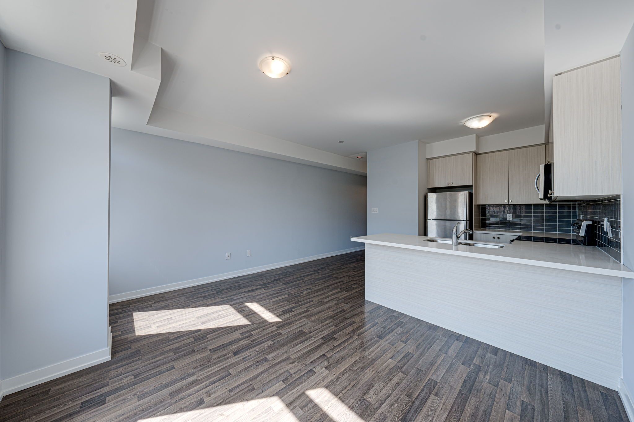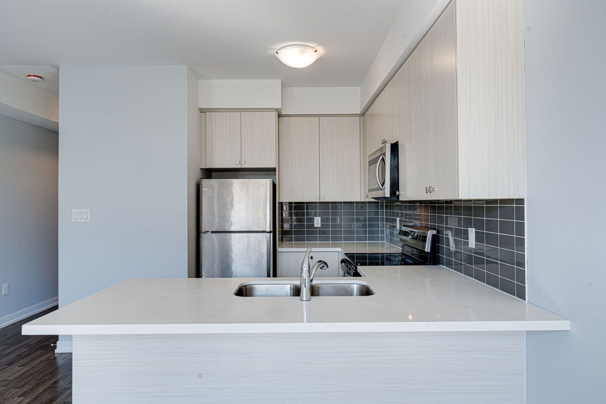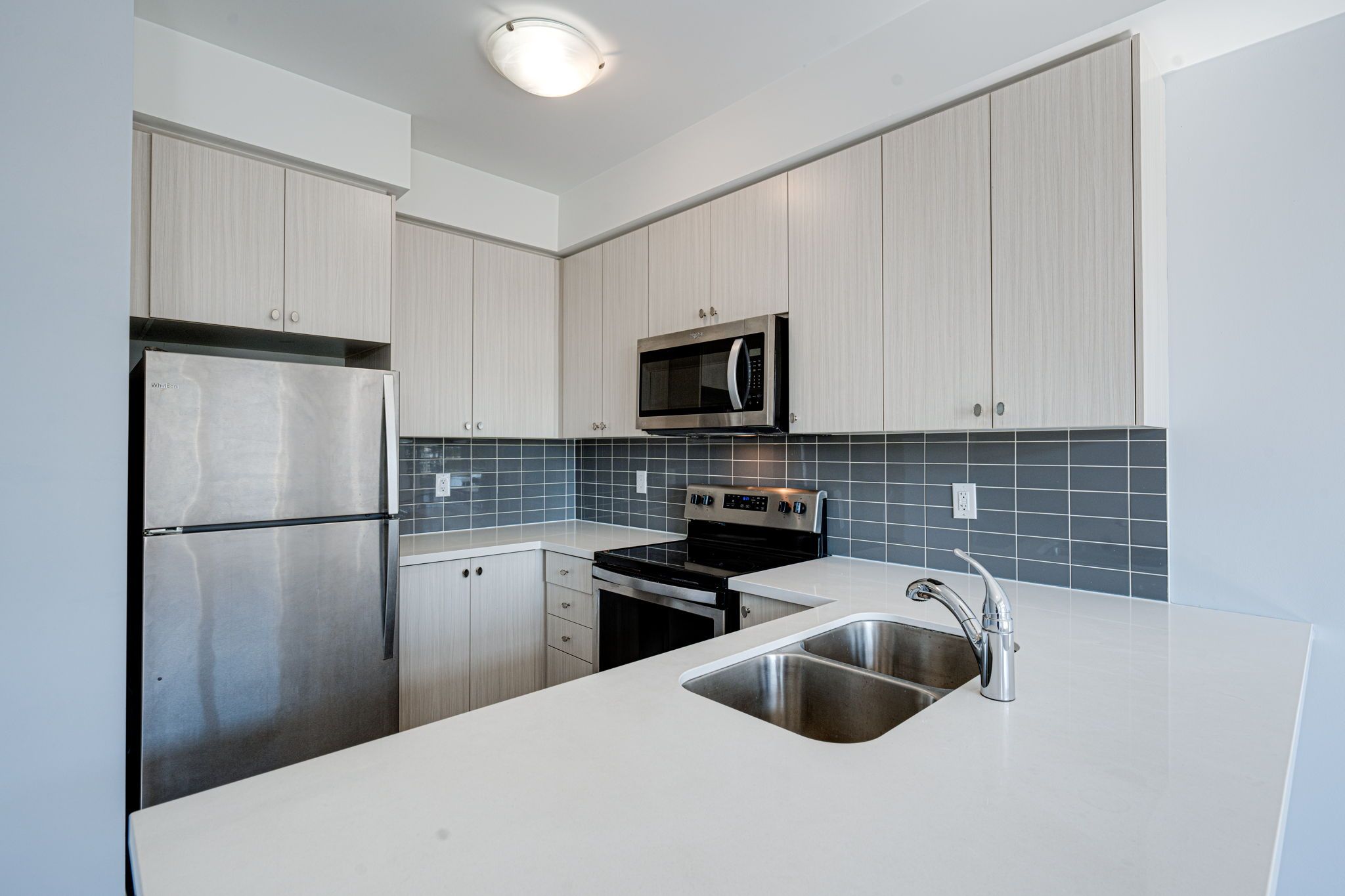 S/S Steel Appl, Upgraded Tall Kitchen Cabinets and a Breakfast Bar with Quartz Counter;9 Ft ceilings