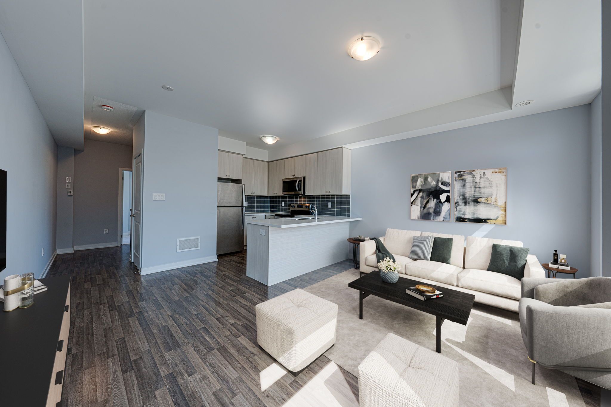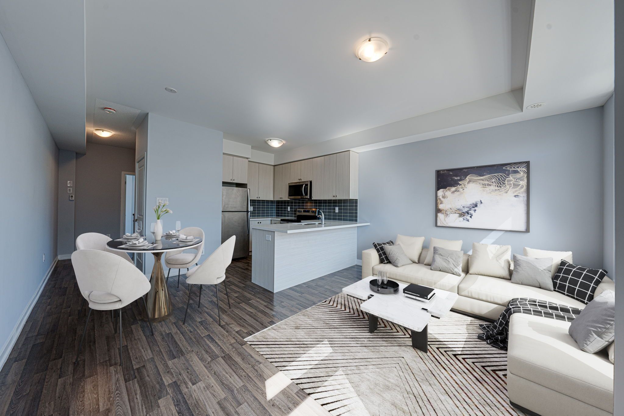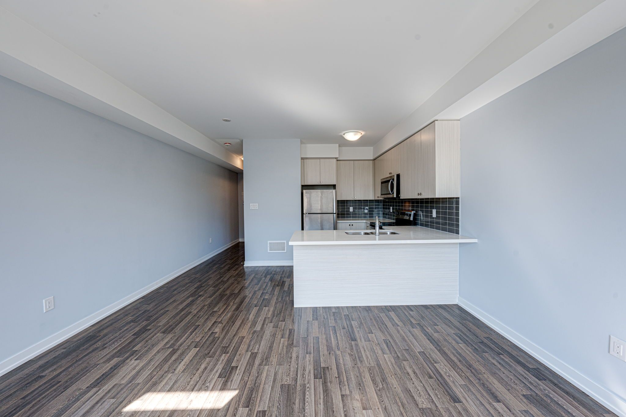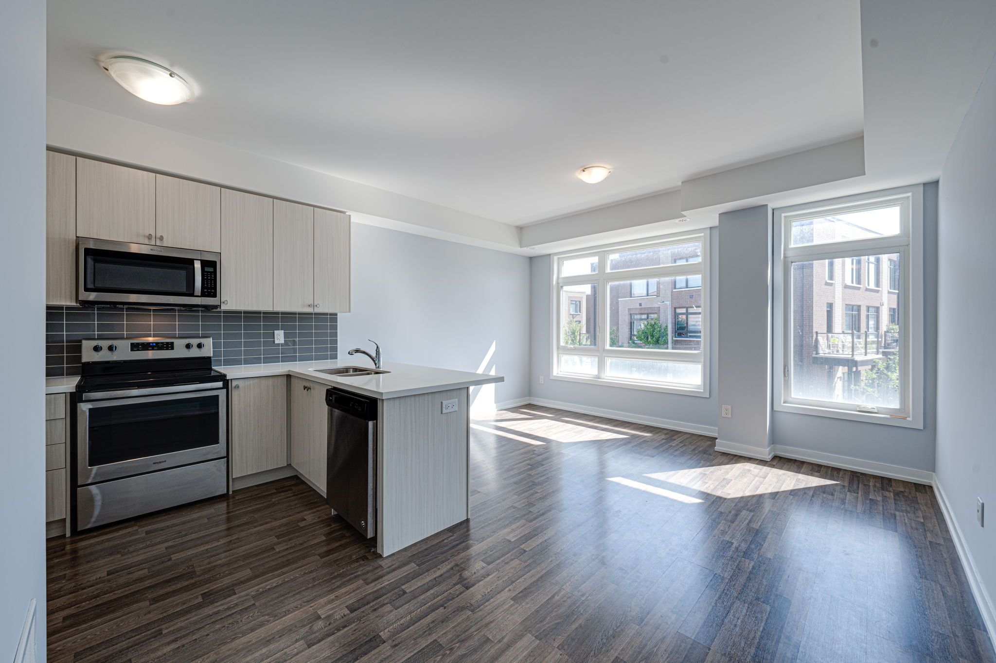 S/S Steel Appl, Upgraded Tall Kitchen Cabinets and a Breakfast Bar with Quartz Counter;9 Ft ceilings