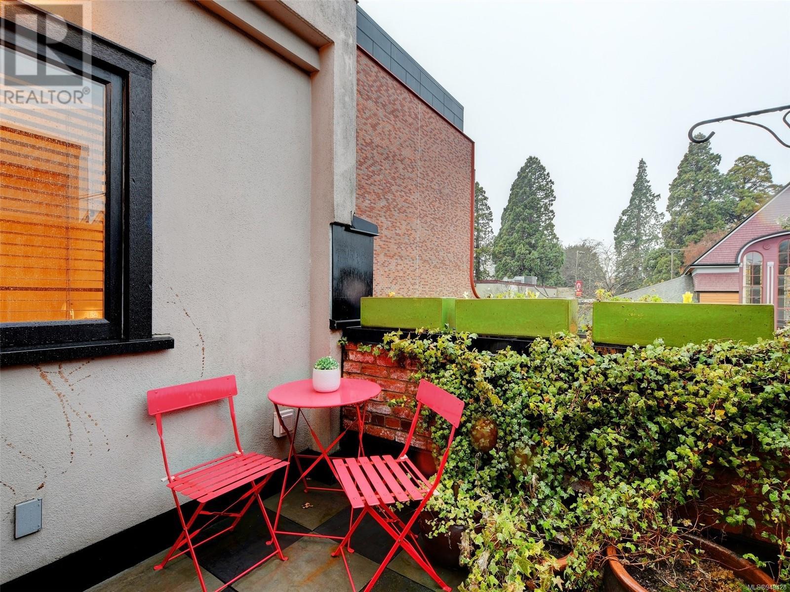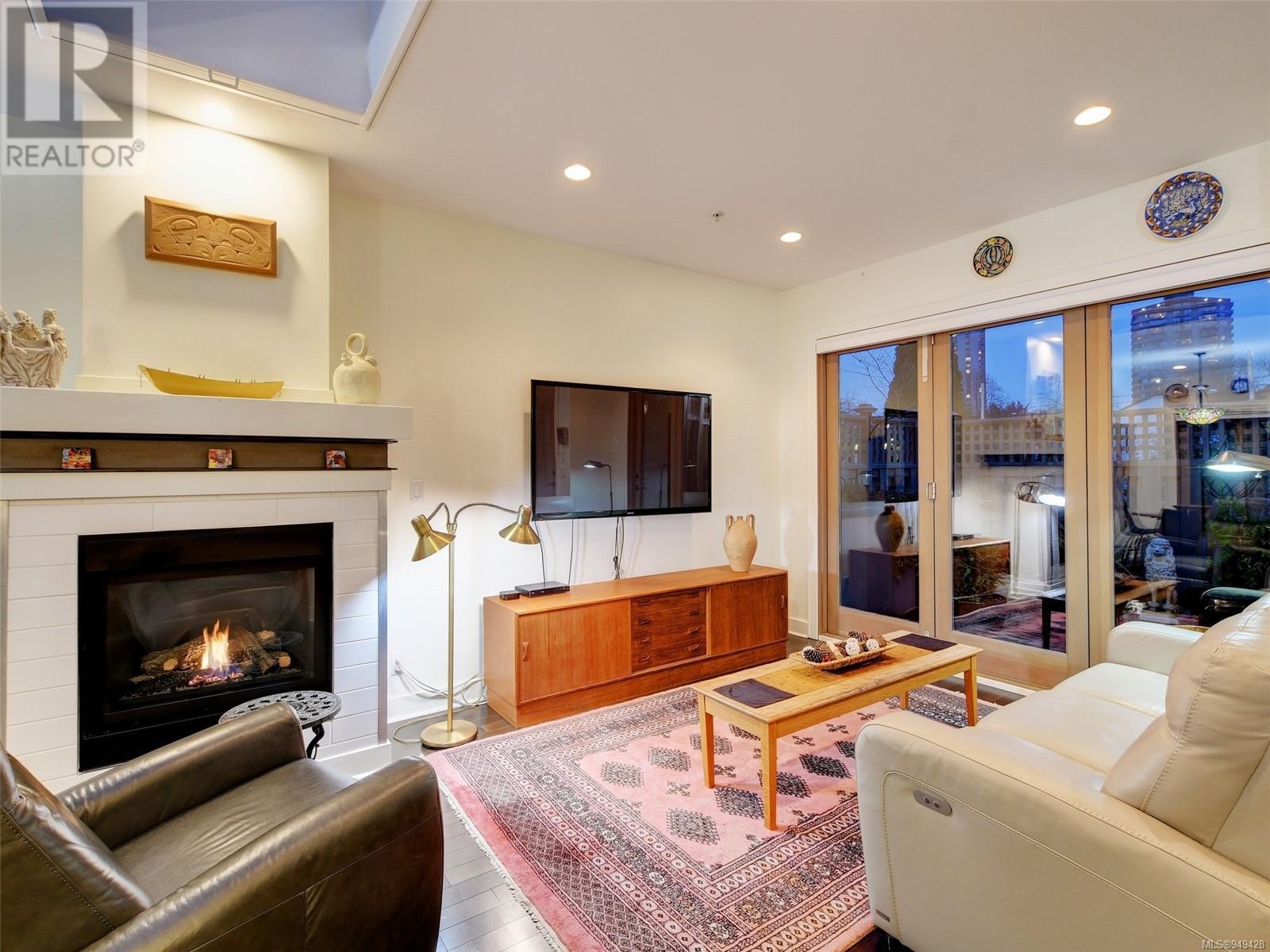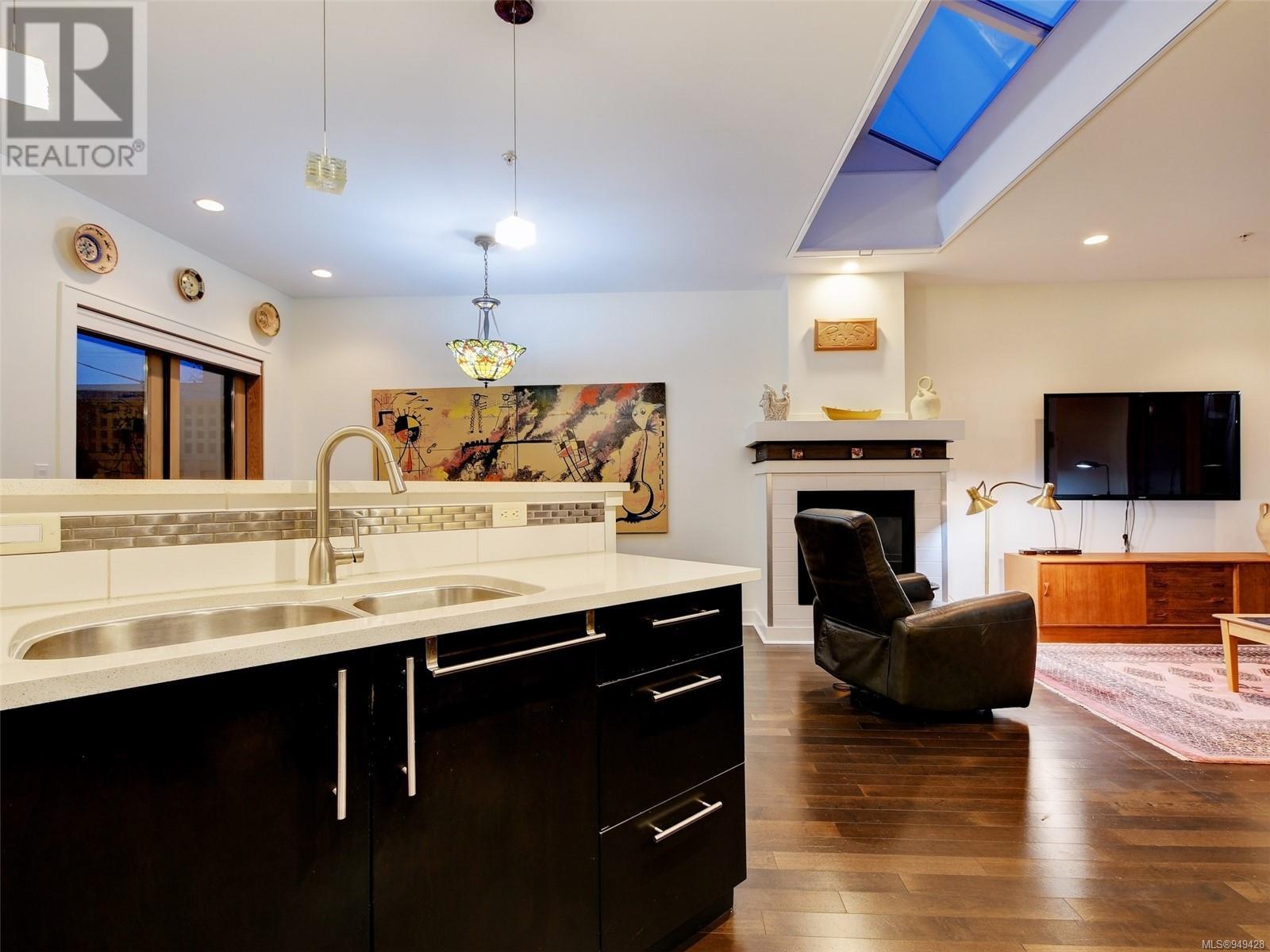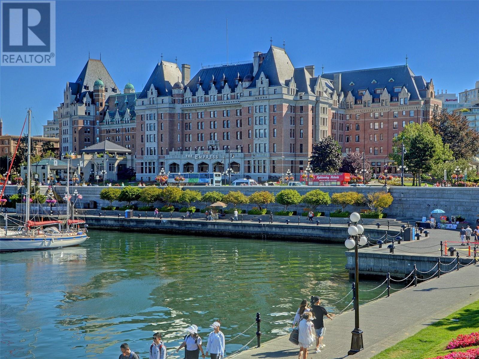 OPEN HOUSE: SATURDAY DEC. 9, 1-3pm and SUNDAY DEC 10th 1-3pm! Imagine living in a penthouse style condo in the heart of James Bay! This private, spacious top-floor corner suite, in the award winning 'Redstone', a restored historical bldg., offers a fabulous & smart floor plan that includes: open dining & living rooms with a vaulted glass skylight; angled Gourmet kitchen with eating bar, quartz countertops, newer SS appliances, double door fridge, pot filler above gas range stove & under mount double sink; separation between bedrooms, living room with gas fireplace & large bi-fold French doors leading to SE facing entertainment size private deck. The retractable French doors open for a seamless flow of indoor/outdoor living space; French doors off dining room leading to a bonus NW facing Bistro balcony with nice outlook; primary bedroom with walk-in closet & 4-piece ensuite w/ soaker tub, walk-in shower & skylight; heated floors & vessel sinks in both bathrooms, & wood floors throughout. This suite comes w/ large LCP parking spot & extra storage. The three flat screen TV''S, the red bistro table set and all flower pots and water features on both deck and balcony are included in the sale. Located on a quiet street by James Bay Village core, minutes to the ocean, Beacon Hill Park & Inner Harbour. (id:22211)