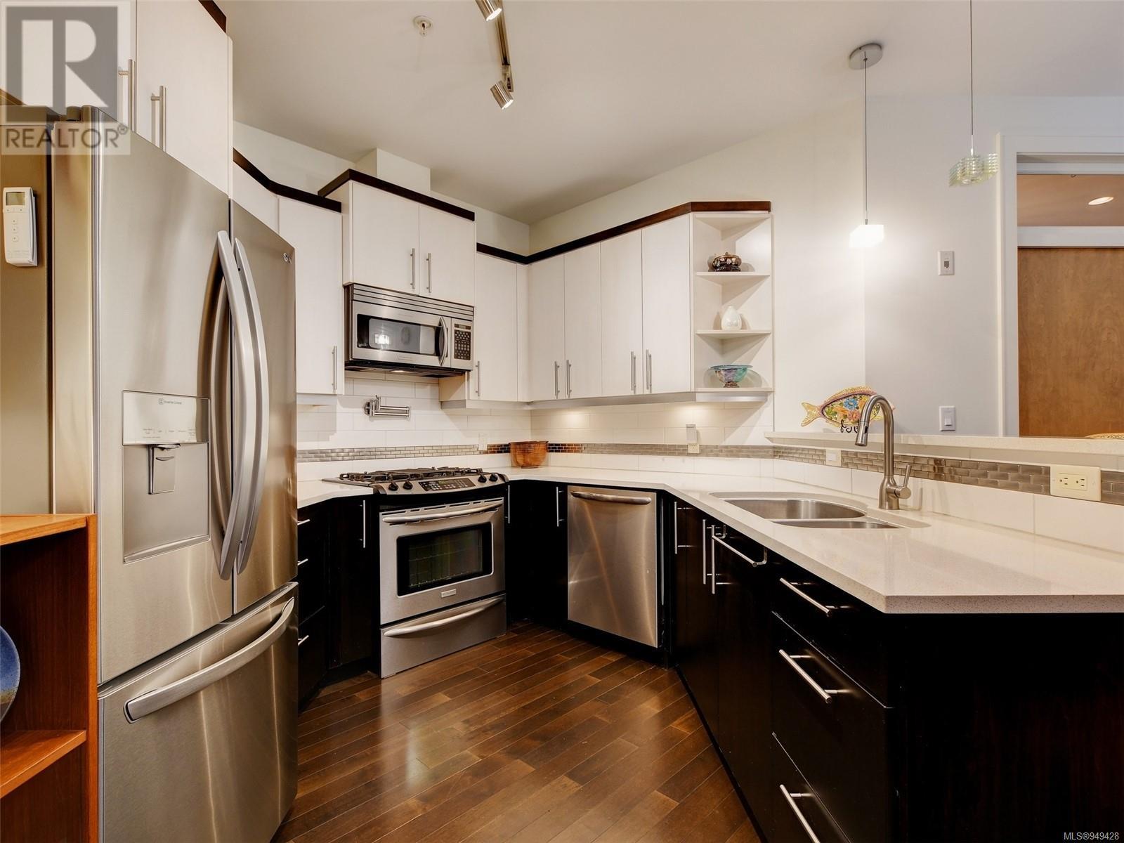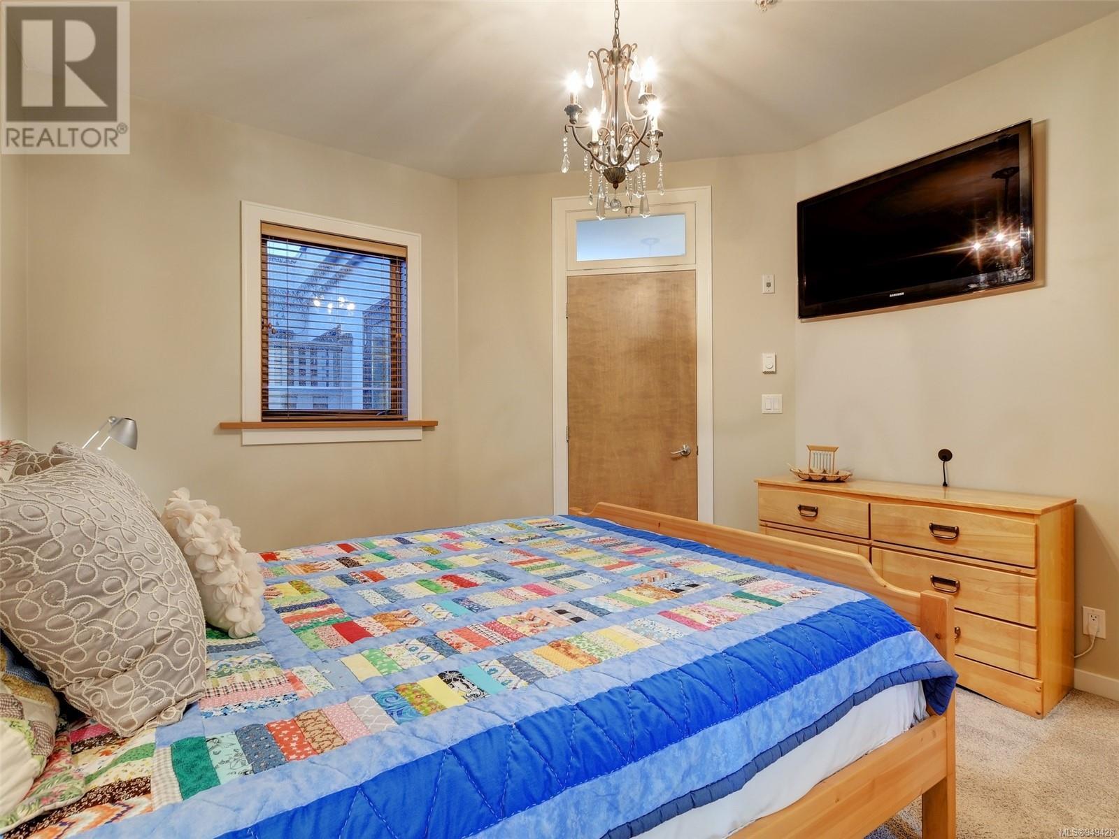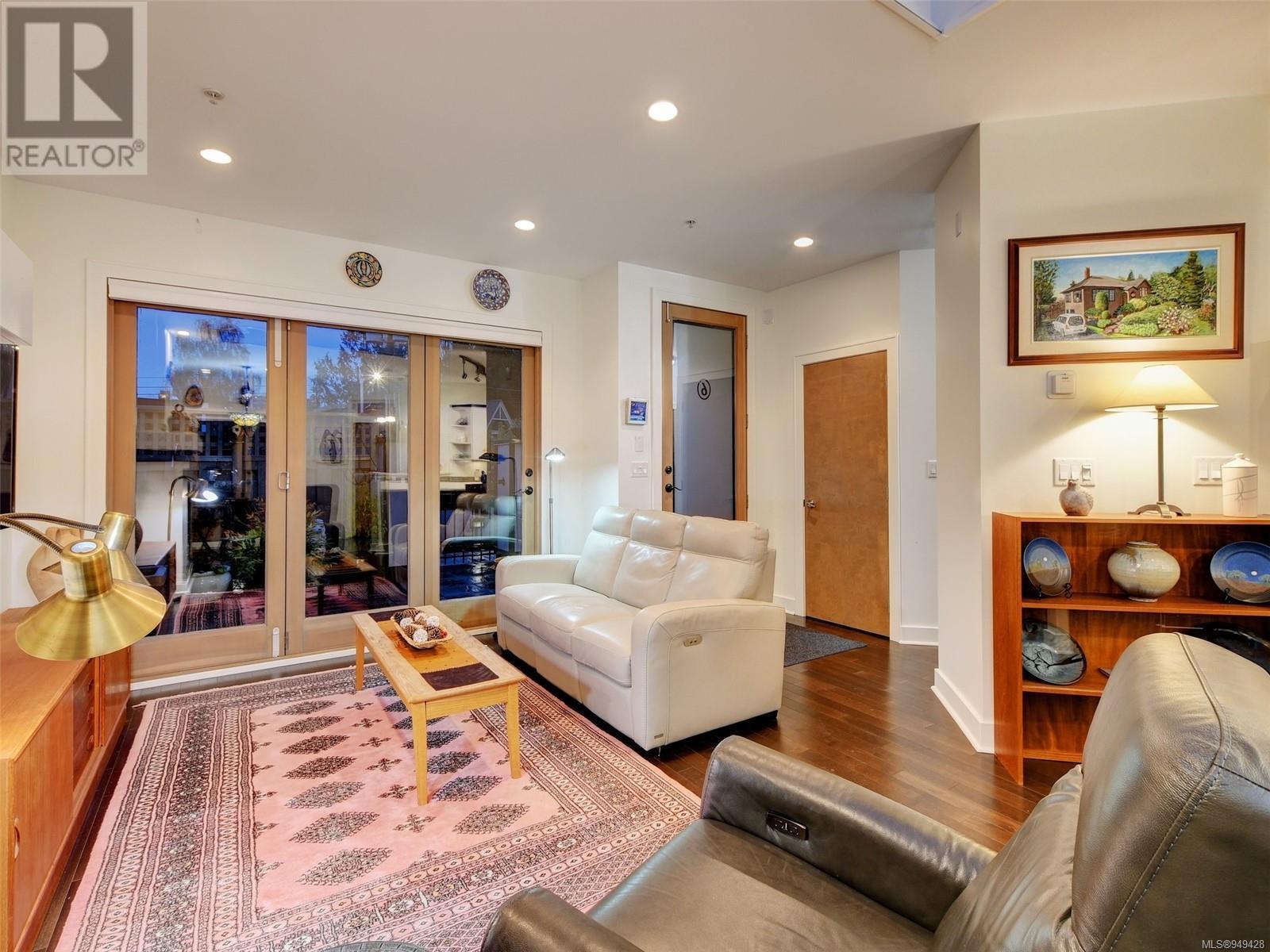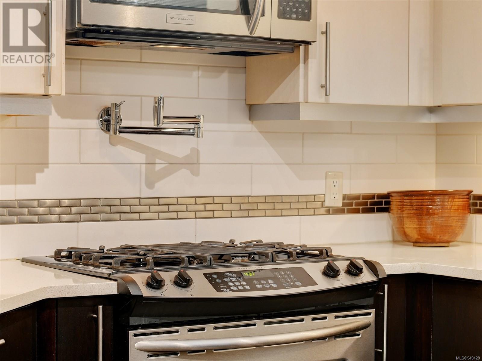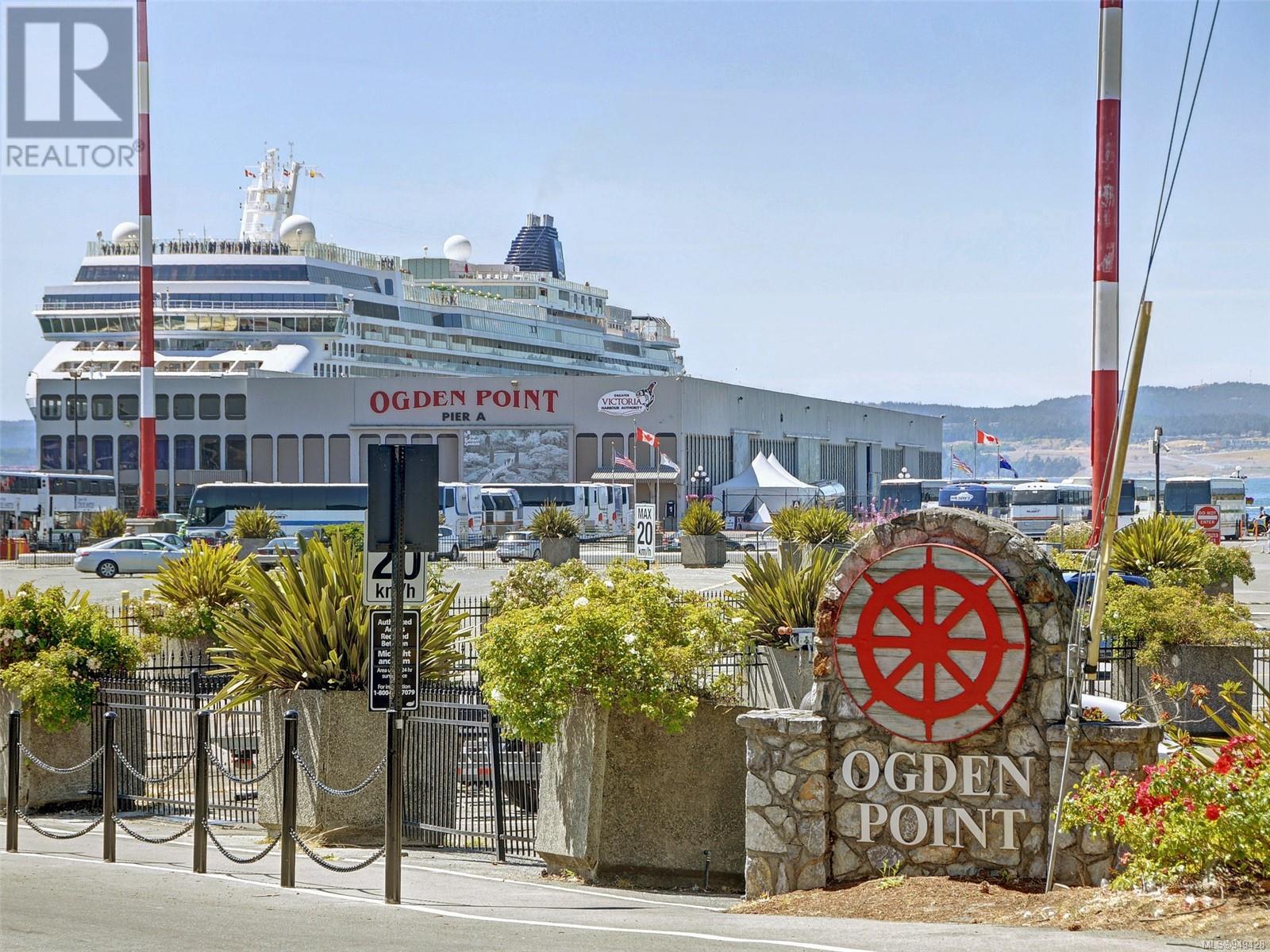 OPEN HOUSE: SATURDAY DEC. 9, 1-3pm and SUNDAY DEC 10th 1-3pm! Imagine living in a penthouse style condo in the heart of James Bay! This private, spacious top-floor corner suite, in the award winning 'Redstone', a restored historical bldg., offers a fabulous & smart floor plan that includes: open dining & living rooms with a vaulted glass skylight; angled Gourmet kitchen with eating bar, quartz countertops, newer SS appliances, double door fridge, pot filler above gas range stove & under mount double sink; separation between bedrooms, living room with gas fireplace & large bi-fold French doors leading to SE facing entertainment size private deck. The retractable French doors open for a seamless flow of indoor/outdoor living space; French doors off dining room leading to a bonus NW facing Bistro balcony with nice outlook; primary bedroom with walk-in closet & 4-piece ensuite w/ soaker tub, walk-in shower & skylight; heated floors & vessel sinks in both bathrooms, & wood floors throughout. This suite comes w/ large LCP parking spot & extra storage. The three flat screen TV''S, the red bistro table set and all flower pots and water features on both deck and balcony are included in the sale. Located on a quiet street by James Bay Village core, minutes to the ocean, Beacon Hill Park & Inner Harbour. (id:22211)