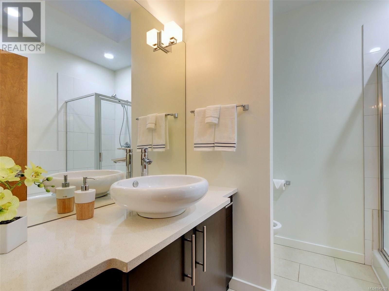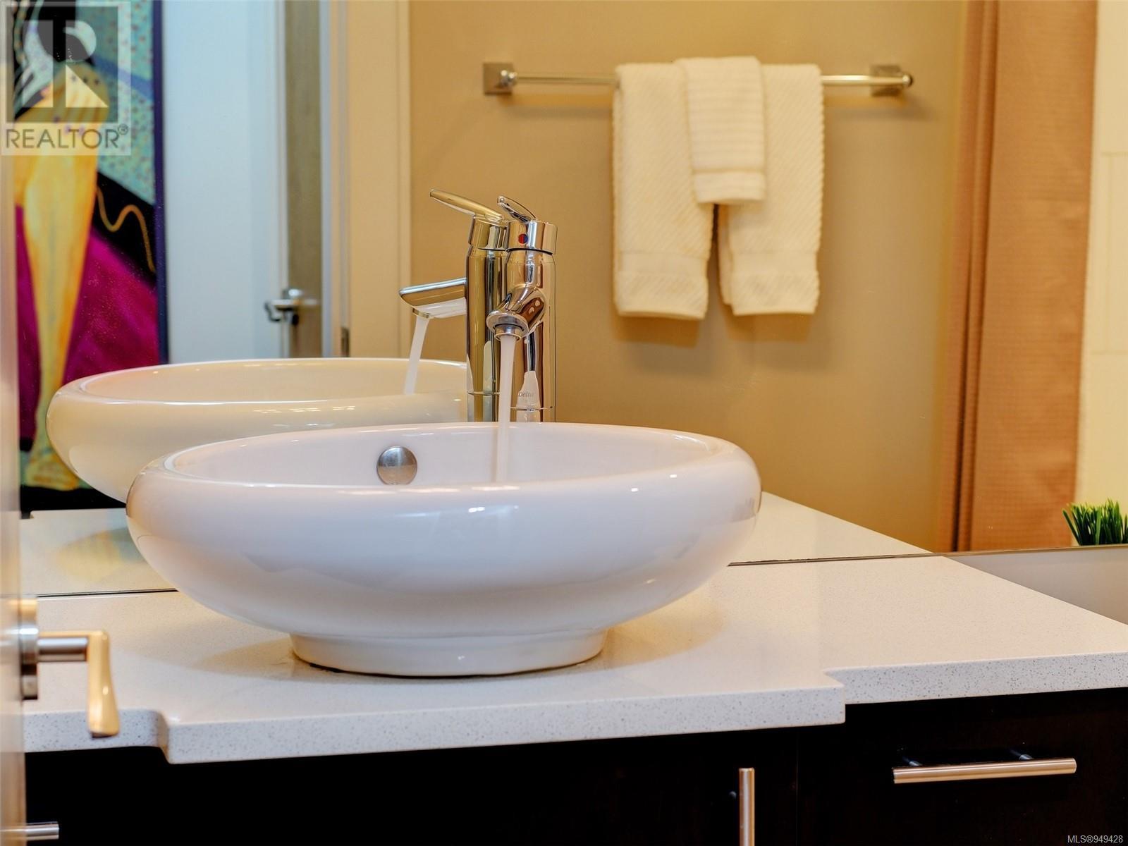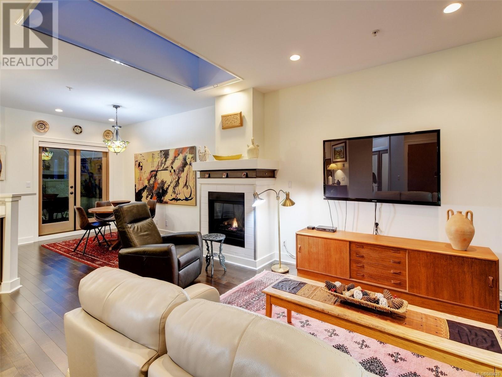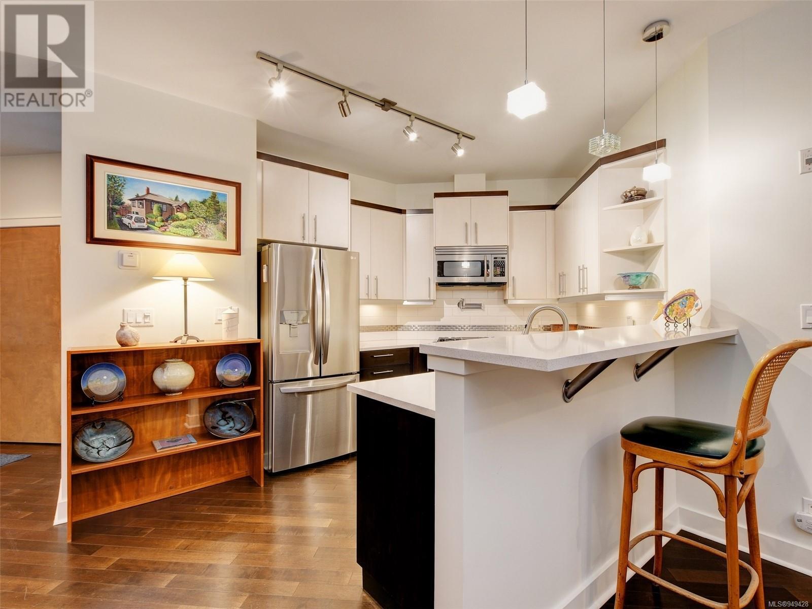 OPEN HOUSE: SATURDAY DEC. 9, 1-3pm and SUNDAY DEC 10th 1-3pm! Imagine living in a penthouse style condo in the heart of James Bay! This private, spacious top-floor corner suite, in the award winning 'Redstone', a restored historical bldg., offers a fabulous & smart floor plan that includes: open dining & living rooms with a vaulted glass skylight; angled Gourmet kitchen with eating bar, quartz countertops, newer SS appliances, double door fridge, pot filler above gas range stove & under mount double sink; separation between bedrooms, living room with gas fireplace & large bi-fold French doors leading to SE facing entertainment size private deck. The retractable French doors open for a seamless flow of indoor/outdoor living space; French doors off dining room leading to a bonus NW facing Bistro balcony with nice outlook; primary bedroom with walk-in closet & 4-piece ensuite w/ soaker tub, walk-in shower & skylight; heated floors & vessel sinks in both bathrooms, & wood floors throughout. This suite comes w/ large LCP parking spot & extra storage. The three flat screen TV''S, the red bistro table set and all flower pots and water features on both deck and balcony are included in the sale. Located on a quiet street by James Bay Village core, minutes to the ocean, Beacon Hill Park & Inner Harbour. (id:22211)