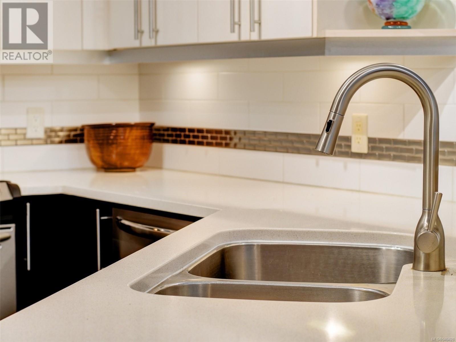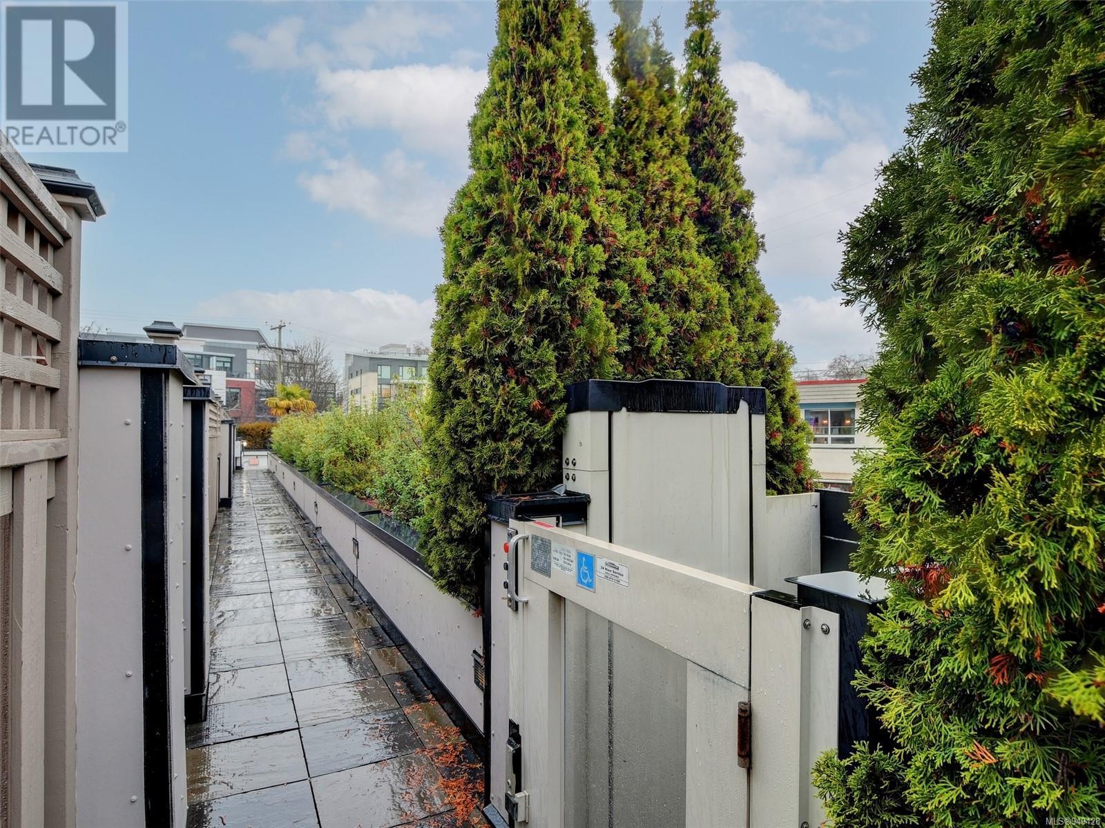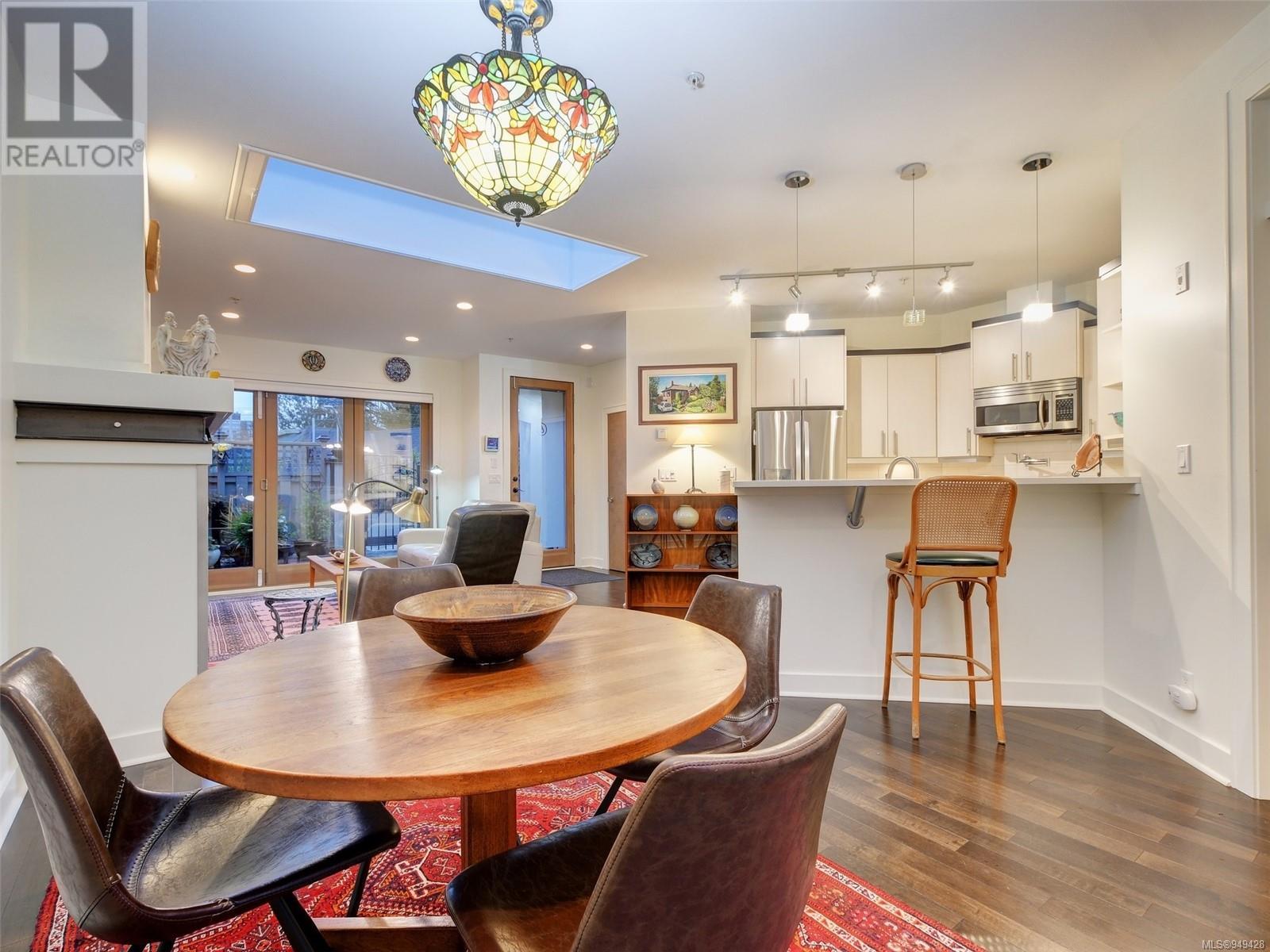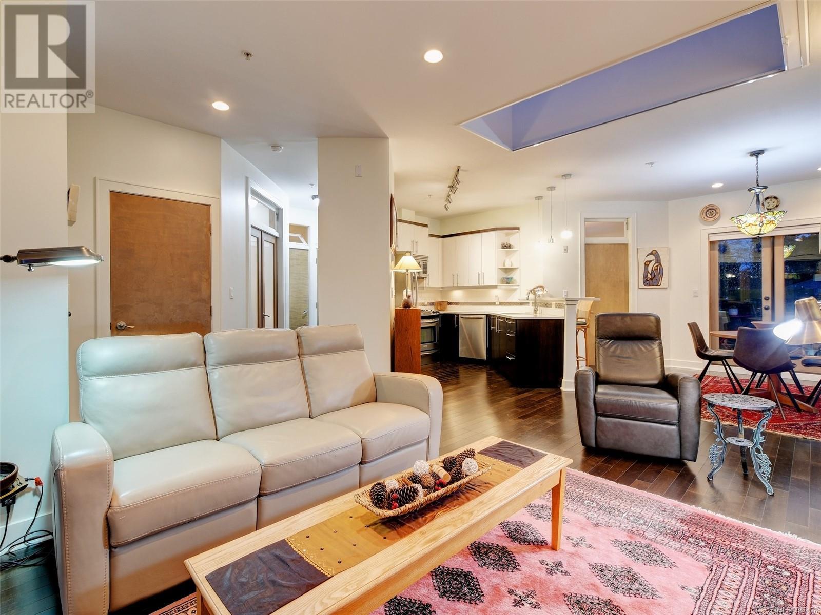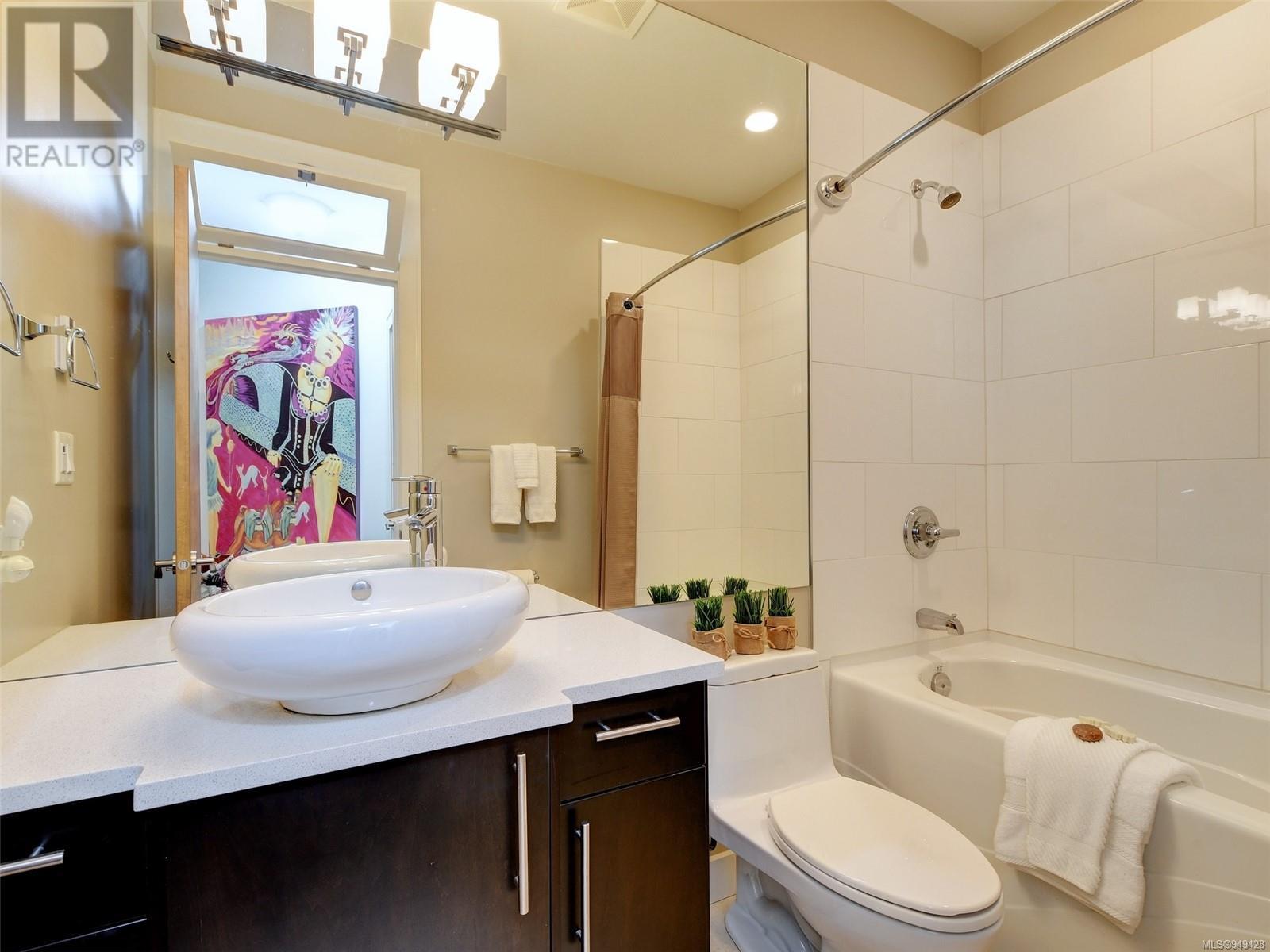 OPEN HOUSE: SATURDAY DEC. 9, 1-3pm and SUNDAY DEC 10th 1-3pm! Imagine living in a penthouse style condo in the heart of James Bay! This private, spacious top-floor corner suite, in the award winning 'Redstone', a restored historical bldg., offers a fabulous & smart floor plan that includes: open dining & living rooms with a vaulted glass skylight; angled Gourmet kitchen with eating bar, quartz countertops, newer SS appliances, double door fridge, pot filler above gas range stove & under mount double sink; separation between bedrooms, living room with gas fireplace & large bi-fold French doors leading to SE facing entertainment size private deck. The retractable French doors open for a seamless flow of indoor/outdoor living space; French doors off dining room leading to a bonus NW facing Bistro balcony with nice outlook; primary bedroom with walk-in closet & 4-piece ensuite w/ soaker tub, walk-in shower & skylight; heated floors & vessel sinks in both bathrooms, & wood floors throughout. This suite comes w/ large LCP parking spot & extra storage. The three flat screen TV''S, the red bistro table set and all flower pots and water features on both deck and balcony are included in the sale. Located on a quiet street by James Bay Village core, minutes to the ocean, Beacon Hill Park & Inner Harbour. (id:22211)