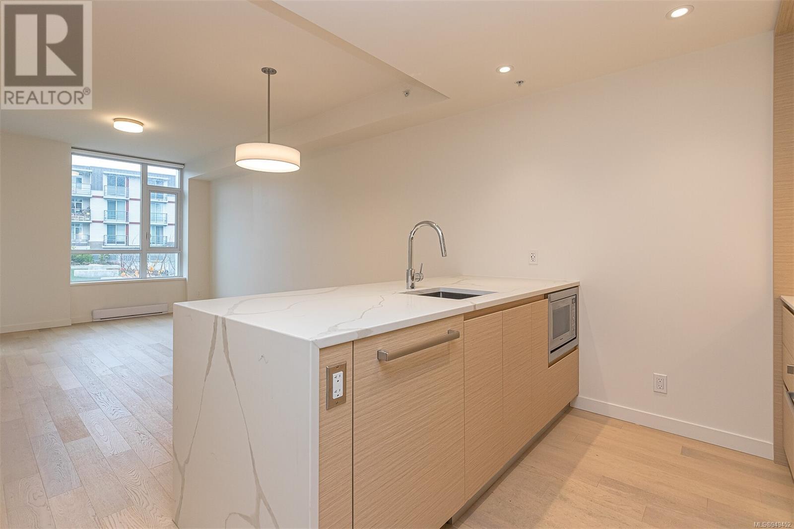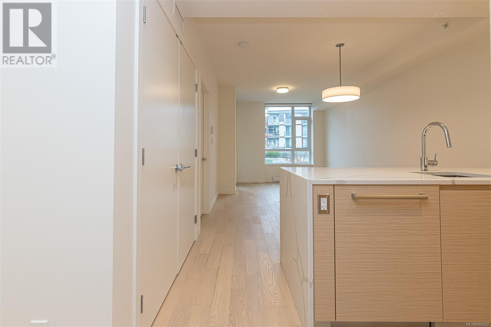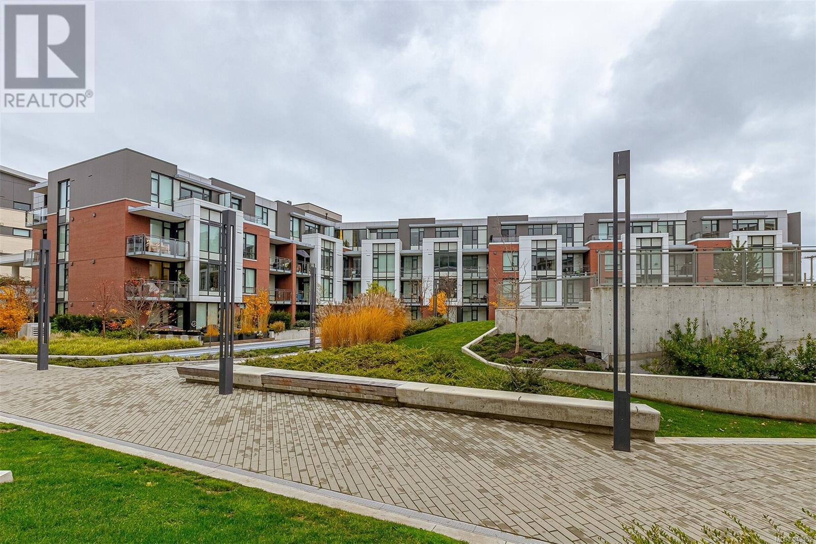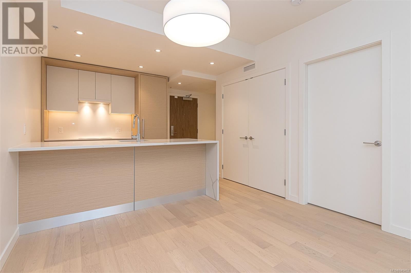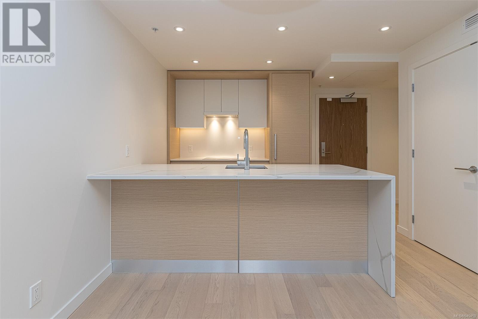 On one of Victoria's prettiest treeline streets and in a quiet location this 2021 condo is in immaculate condition. The one bedroom home features engineered wide-plank oak flooring throughout. Contemporary kitchen includes flatpanel cabinetry, quartz slab countertops & backsplash, marble-patterned quartz waterfall peninsula & integrated Bosch appliances. Spa-like bathroom with luxurious soaker tub, large-format porcelain tiles & in-floor heating. In suite Blomberg laundry. Relax on the spacious balcony overlooking an expansive landscaped courtyard with tranquil water feature. Capital Park is a steel and concrete master planned community that blends seamlessly with the charming James Bay neighbourhood. Security controlled covered entrance, well appointed lobby, resident caretaker, underground parking, storage, fitness room & serenity lounge. Steps from the inner harbour, parliament buildings, shopping and all amenities. (id:22211)