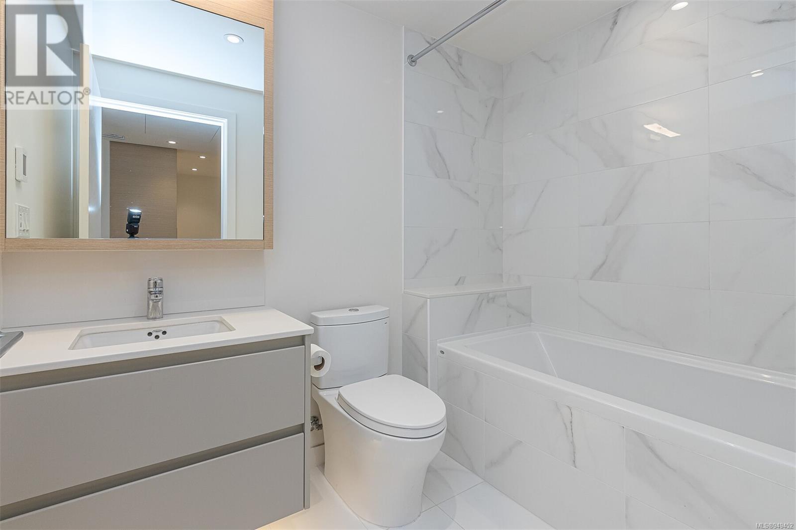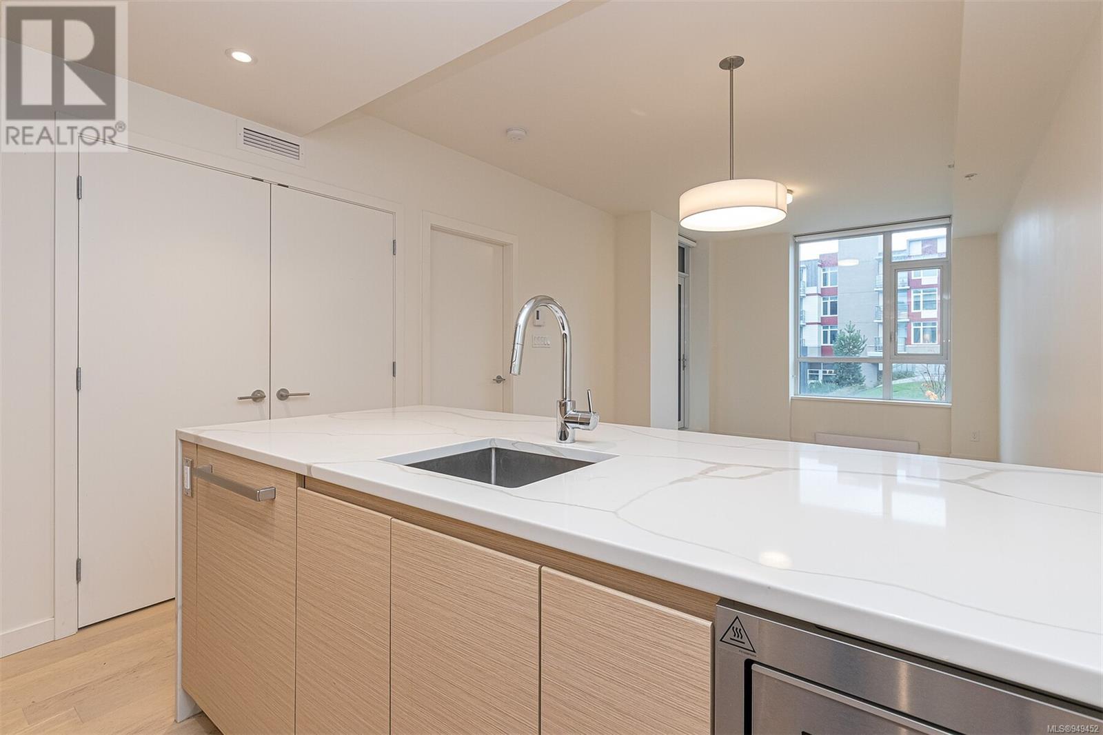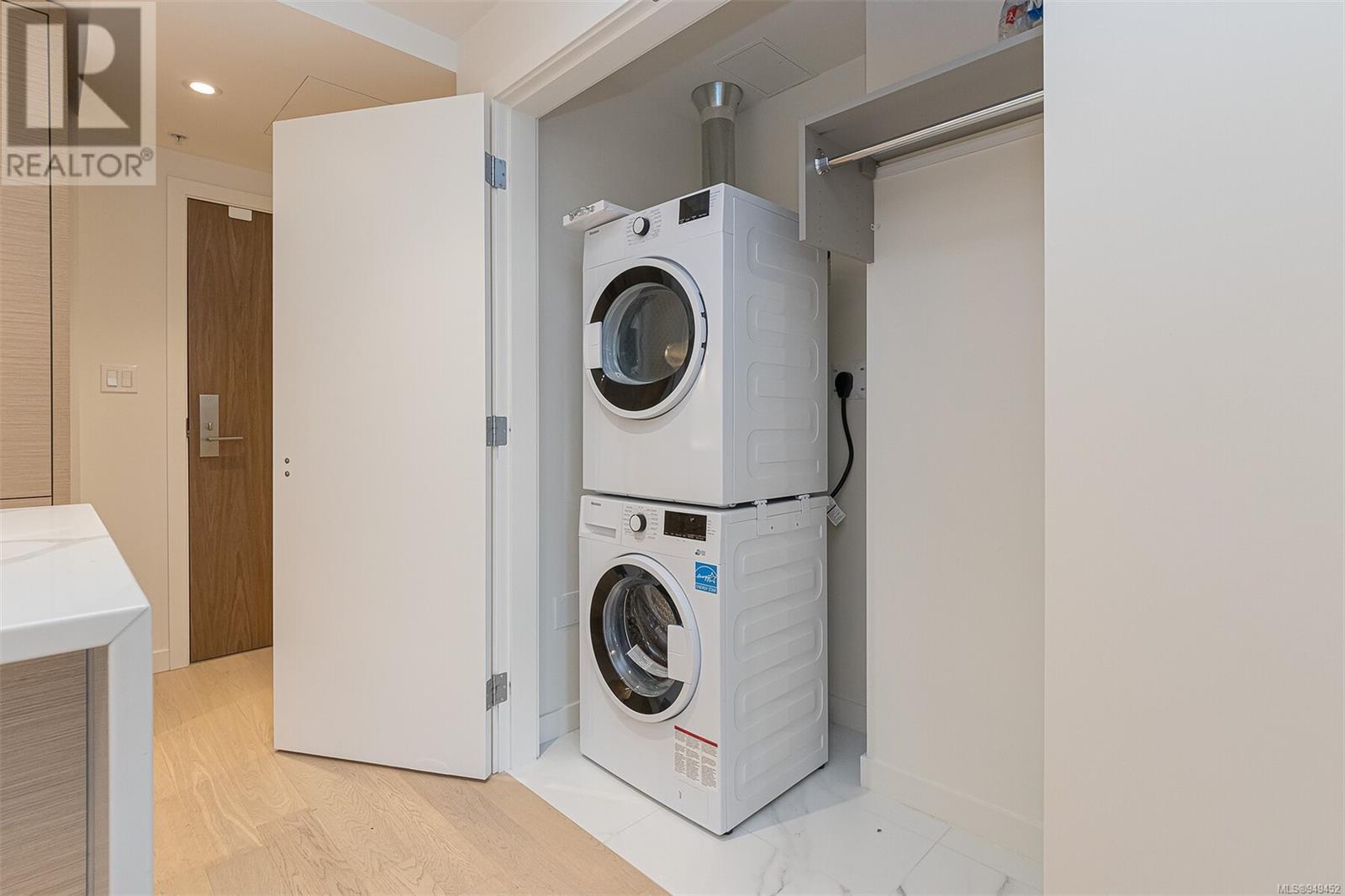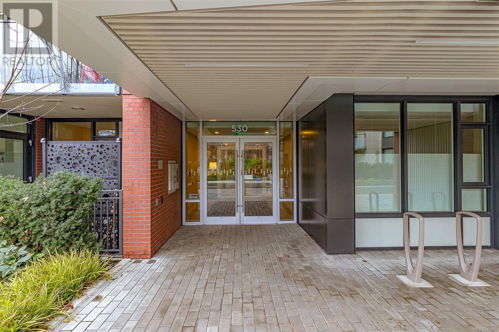 On one of Victoria's prettiest treeline streets and in a quiet location this 2021 condo is in immaculate condition. The one bedroom home features engineered wide-plank oak flooring throughout. Contemporary kitchen includes flatpanel cabinetry, quartz slab countertops & backsplash, marble-patterned quartz waterfall peninsula & integrated Bosch appliances. Spa-like bathroom with luxurious soaker tub, large-format porcelain tiles & in-floor heating. In suite Blomberg laundry. Relax on the spacious balcony overlooking an expansive landscaped courtyard with tranquil water feature. Capital Park is a steel and concrete master planned community that blends seamlessly with the charming James Bay neighbourhood. Security controlled covered entrance, well appointed lobby, resident caretaker, underground parking, storage, fitness room & serenity lounge. Steps from the inner harbour, parliament buildings, shopping and all amenities. (id:22211)