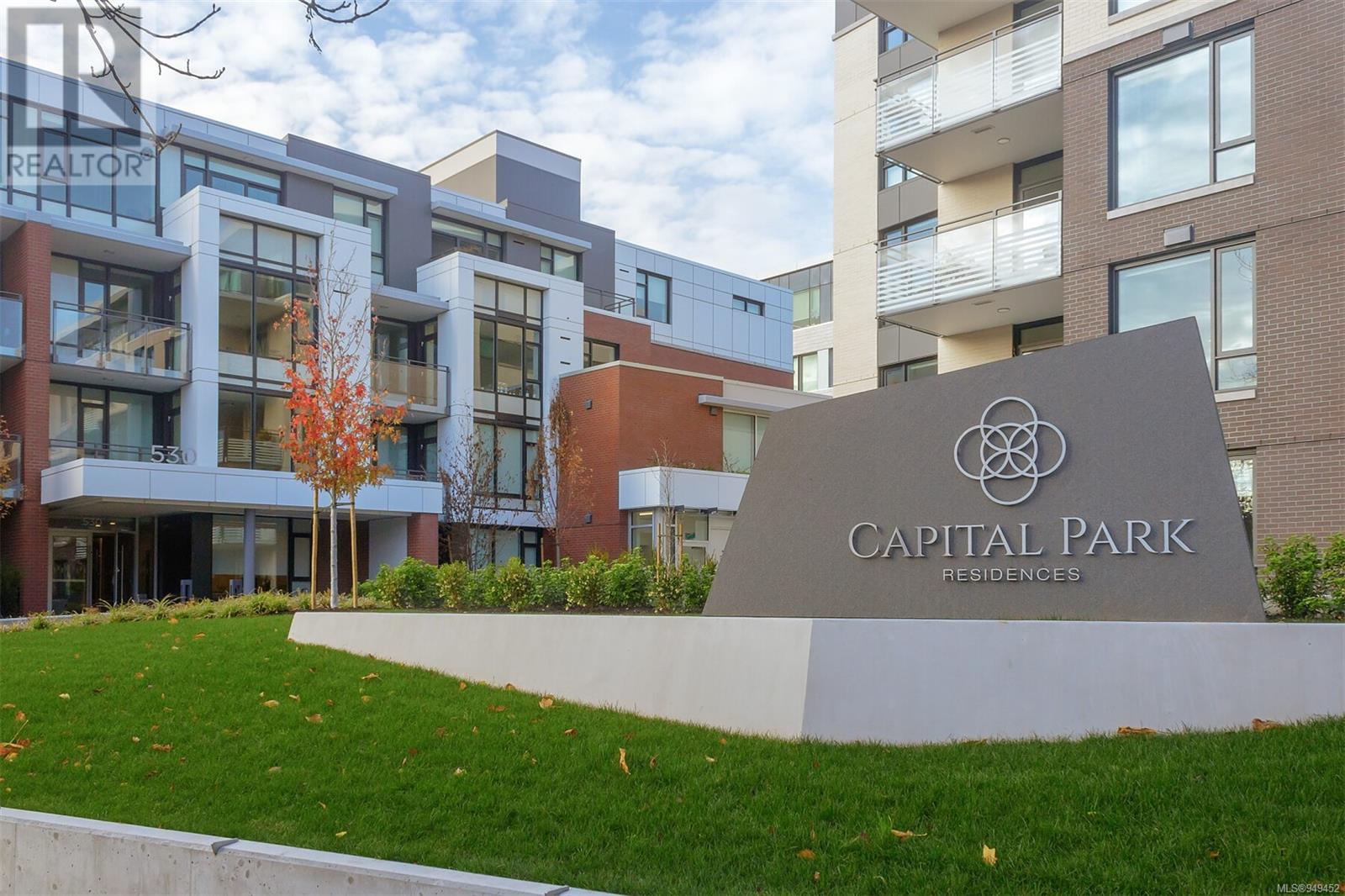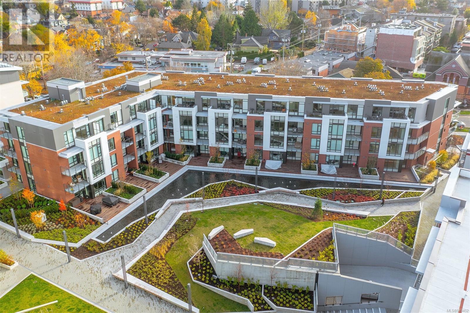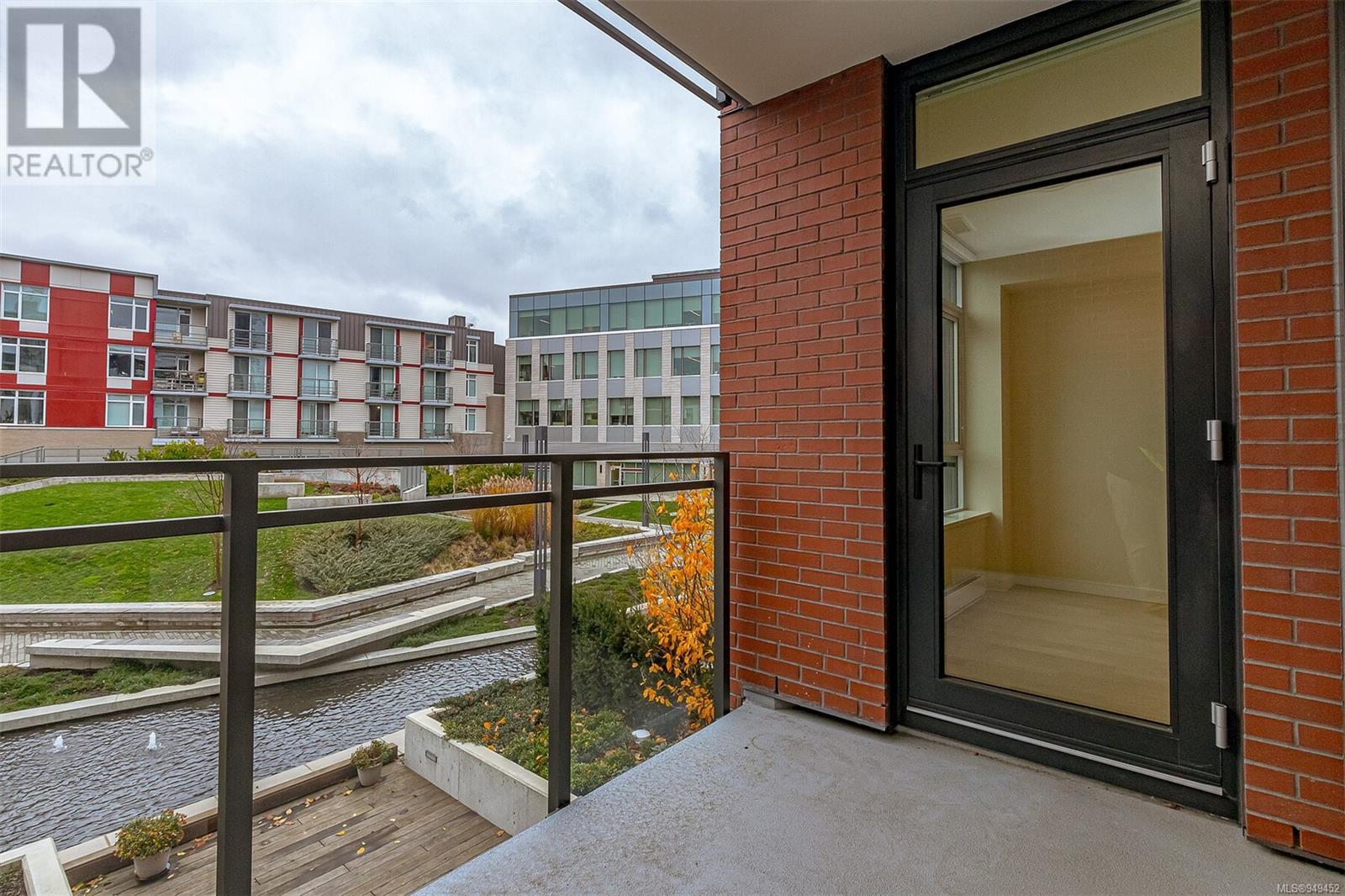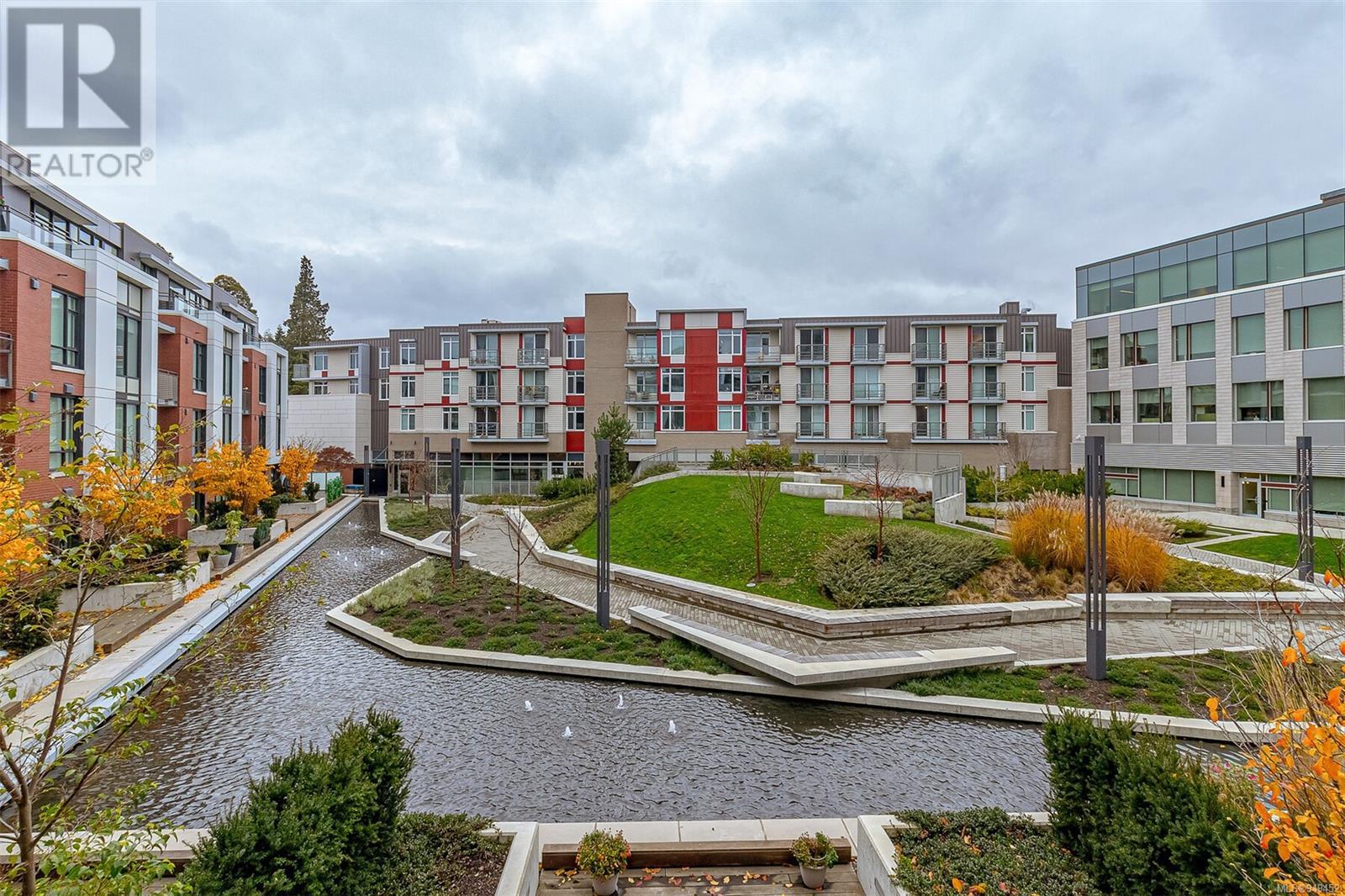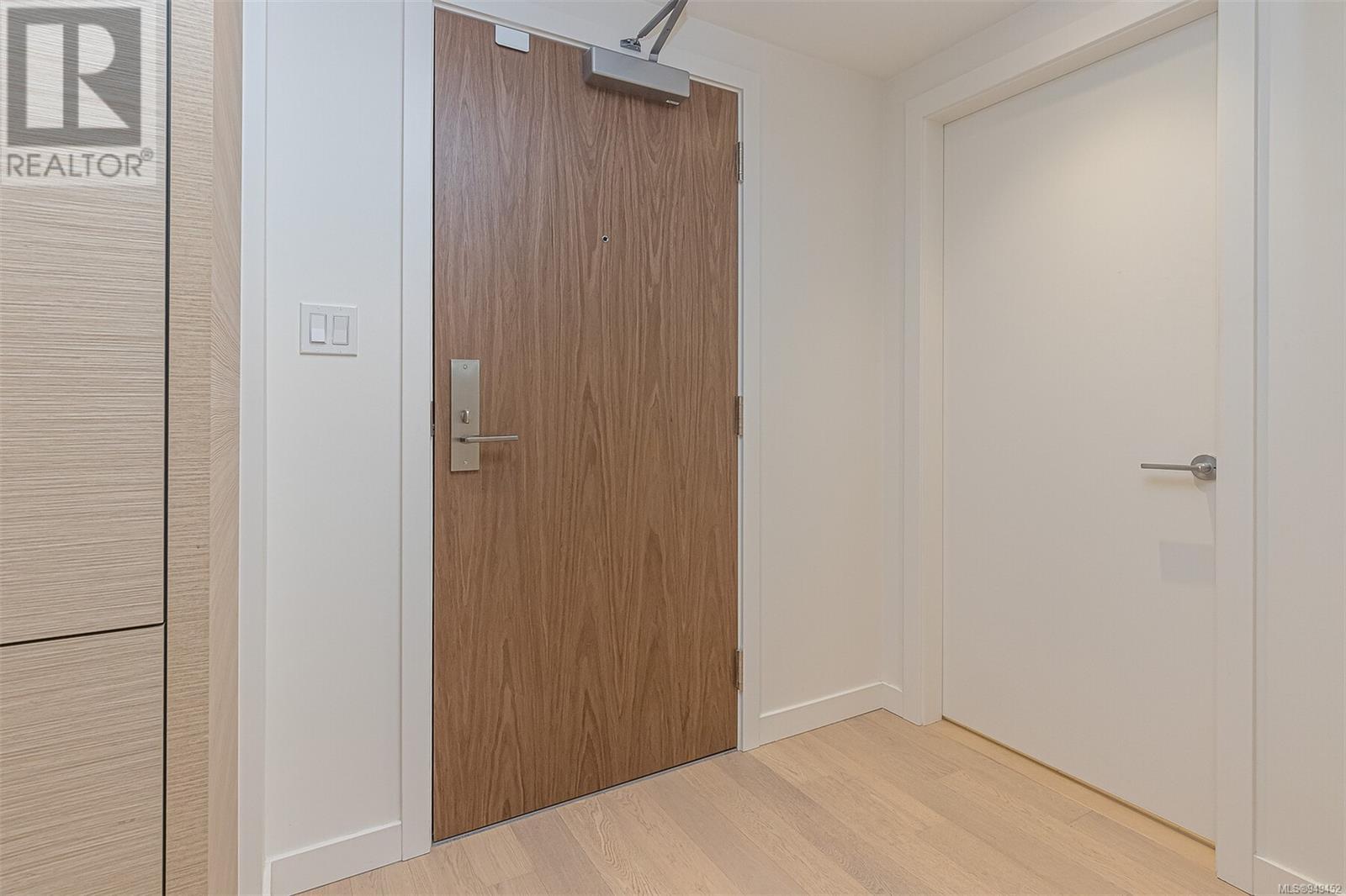 On one of Victoria's prettiest treeline streets and in a quiet location this 2021 condo is in immaculate condition. The one bedroom home features engineered wide-plank oak flooring throughout. Contemporary kitchen includes flatpanel cabinetry, quartz slab countertops & backsplash, marble-patterned quartz waterfall peninsula & integrated Bosch appliances. Spa-like bathroom with luxurious soaker tub, large-format porcelain tiles & in-floor heating. In suite Blomberg laundry. Relax on the spacious balcony overlooking an expansive landscaped courtyard with tranquil water feature. Capital Park is a steel and concrete master planned community that blends seamlessly with the charming James Bay neighbourhood. Security controlled covered entrance, well appointed lobby, resident caretaker, underground parking, storage, fitness room & serenity lounge. Steps from the inner harbour, parliament buildings, shopping and all amenities. (id:22211)