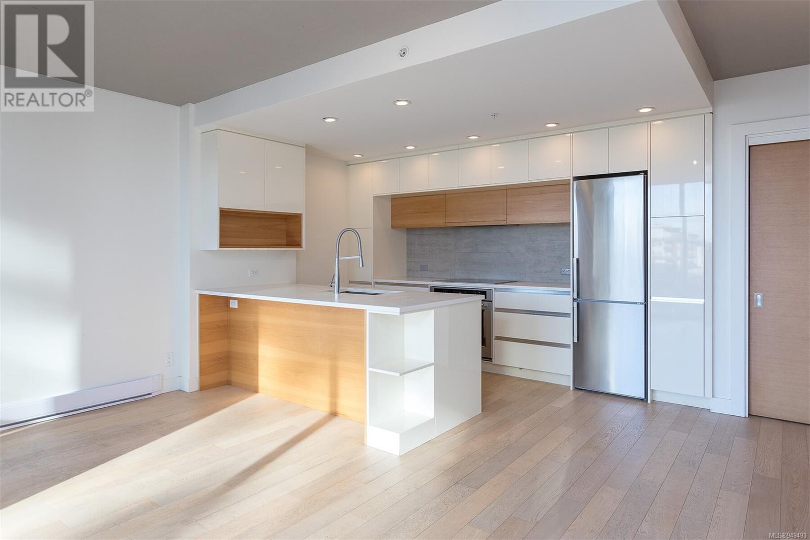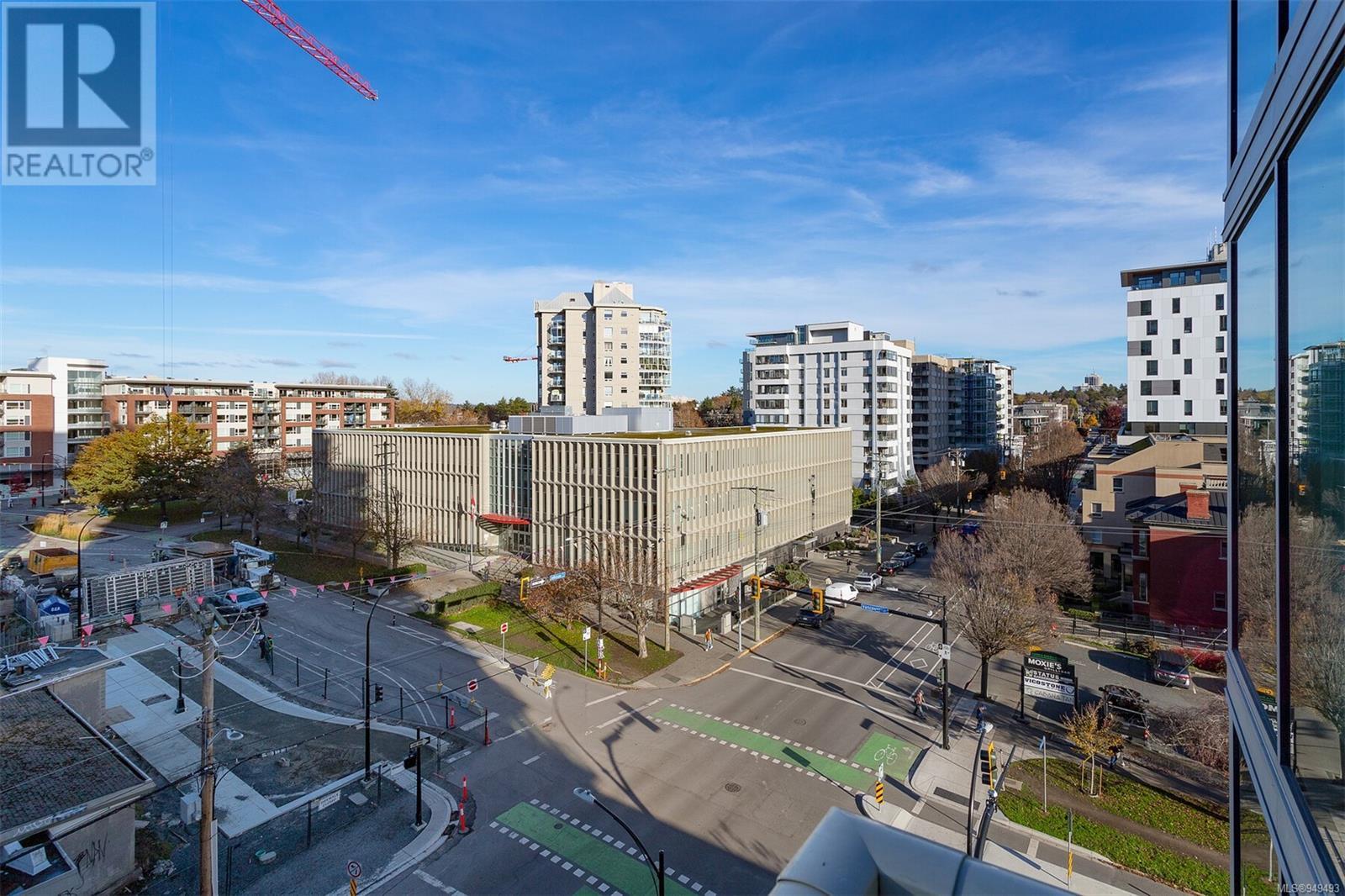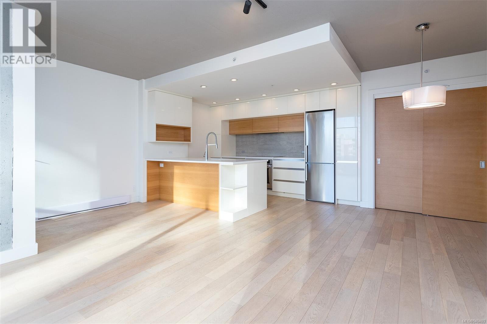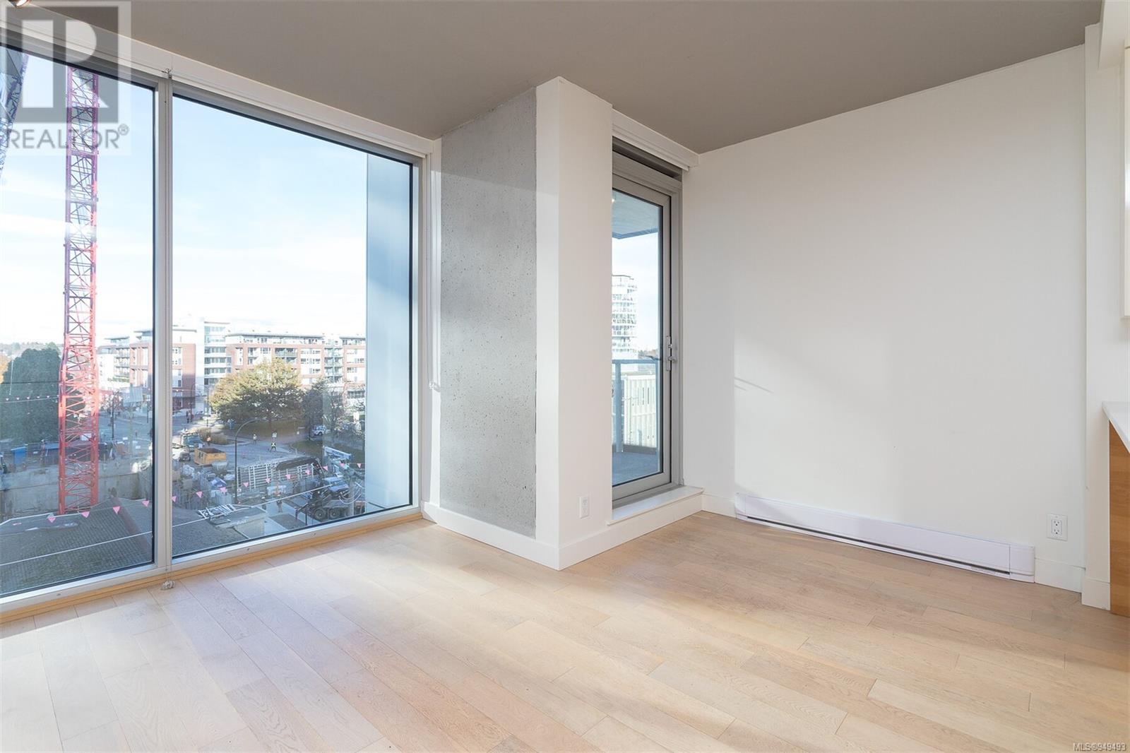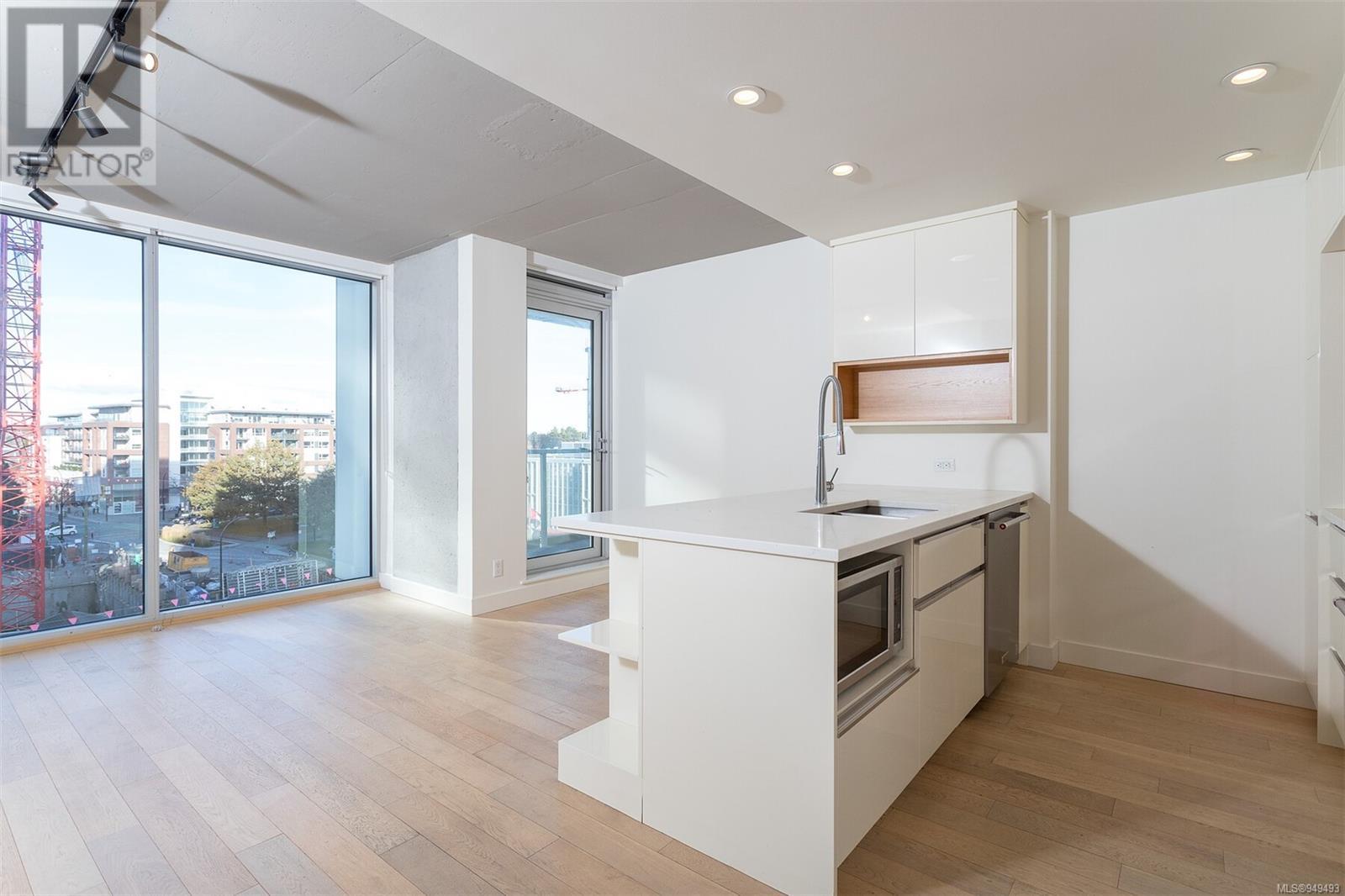 TOP FLOOR unit in the central podium of 989 Johnson! Experience urban living in this vibrant 2019 steel & concrete building steps from downtown Victoria. This property is great for first time buyers or downsizers looking for a turn-key and modern space with plentiful amenities out the front door. The open concept floor plan allows for entertaining, dining & relaxing. Some stand out features include floor to ceiling windows in the living room, oak engineered hardwood floors, white quartz countertops, stainless steel appliances & a covered balcony. In the bathroom, you will find a floating vanity w/ underlight & rain shower. The bright bedroom includes a high quality wood closet dresser/organizer. The walk-in laundry room is a big bonus with extra space for shelving & storage. A secure underground parking spot & oversized storage locker is included too. Then just an elevator ride down to Forge Gym as residents are offered a special rate gym membership. Rentals, pets & all ages welcome! (id:22211)