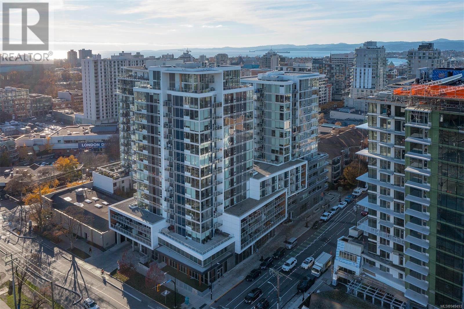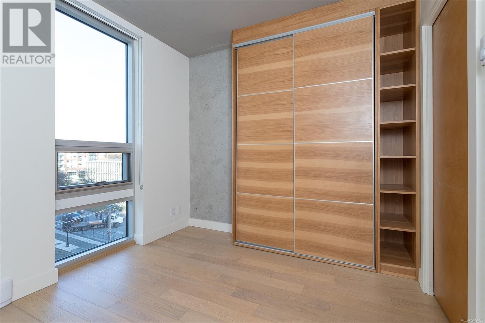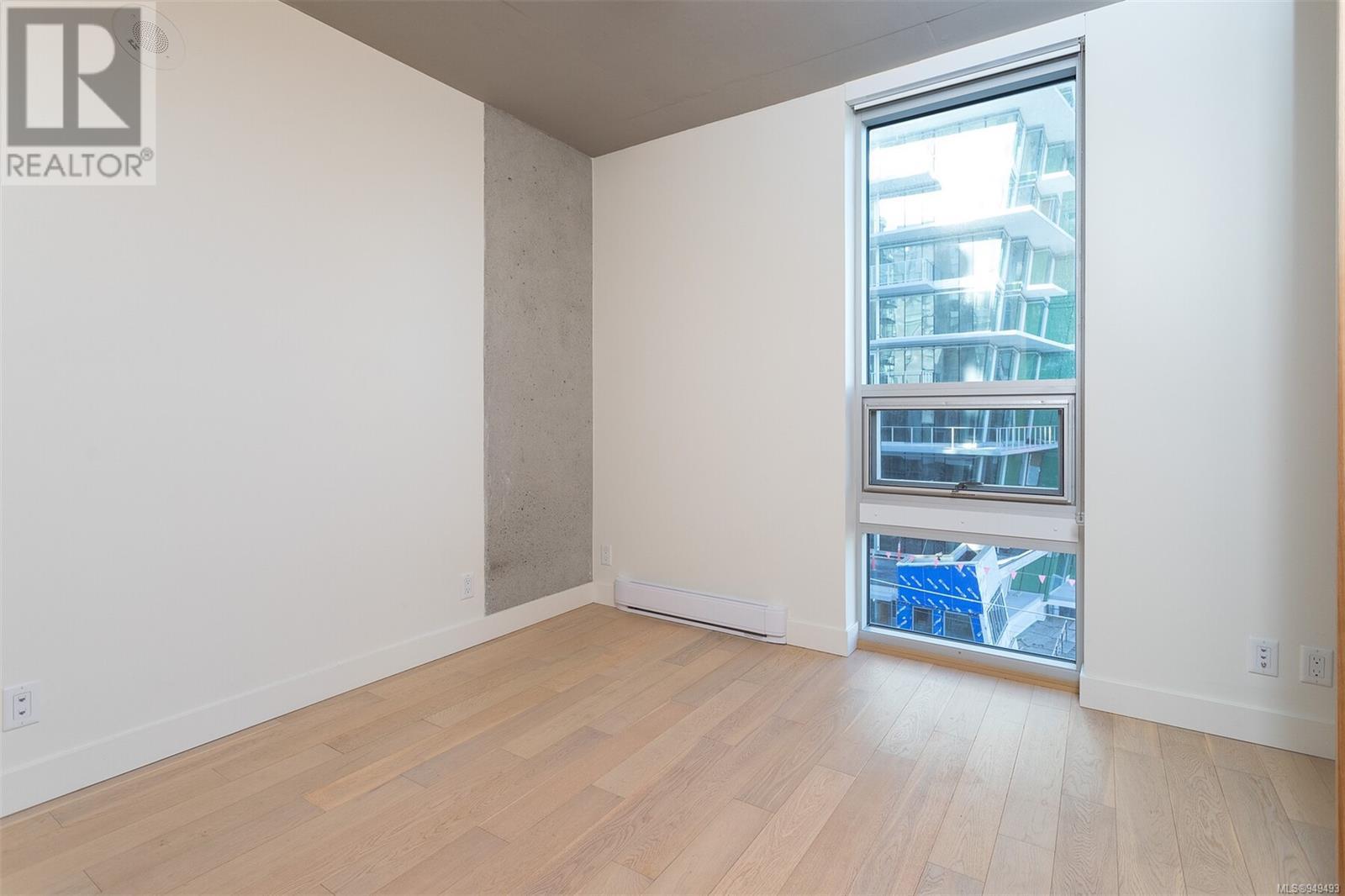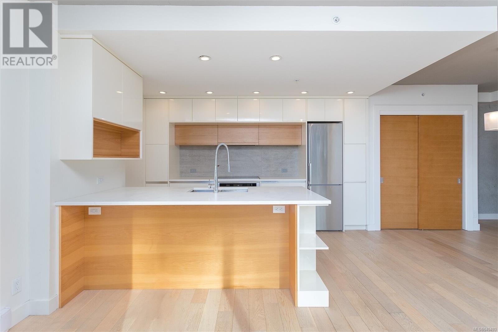 TOP FLOOR unit in the central podium of 989 Johnson! Experience urban living in this vibrant 2019 steel & concrete building steps from downtown Victoria. This property is great for first time buyers or downsizers looking for a turn-key and modern space with plentiful amenities out the front door. The open concept floor plan allows for entertaining, dining & relaxing. Some stand out features include floor to ceiling windows in the living room, oak engineered hardwood floors, white quartz countertops, stainless steel appliances & a covered balcony. In the bathroom, you will find a floating vanity w/ underlight & rain shower. The bright bedroom includes a high quality wood closet dresser/organizer. The walk-in laundry room is a big bonus with extra space for shelving & storage. A secure underground parking spot & oversized storage locker is included too. Then just an elevator ride down to Forge Gym as residents are offered a special rate gym membership. Rentals, pets & all ages welcome! (id:22211)