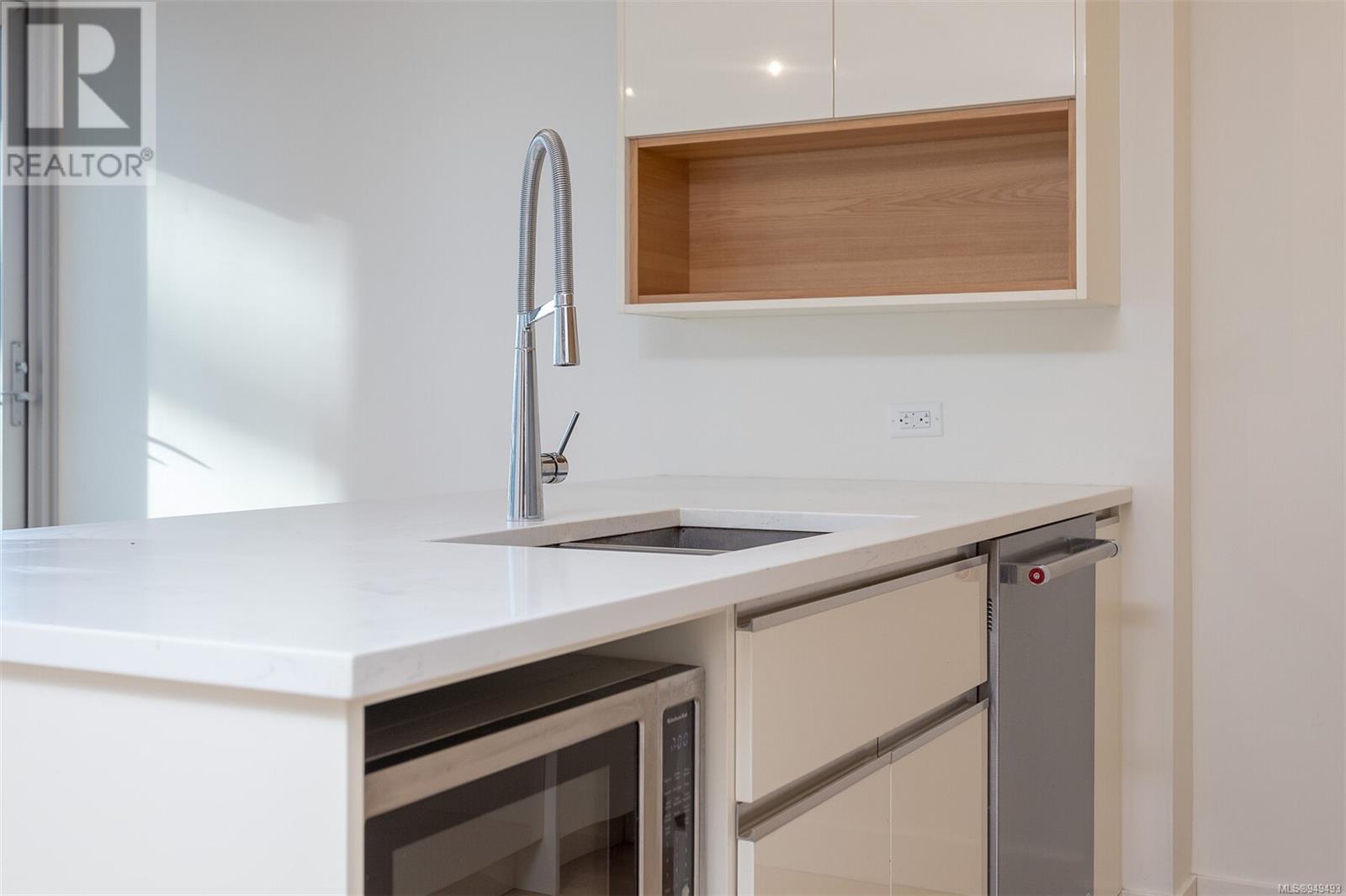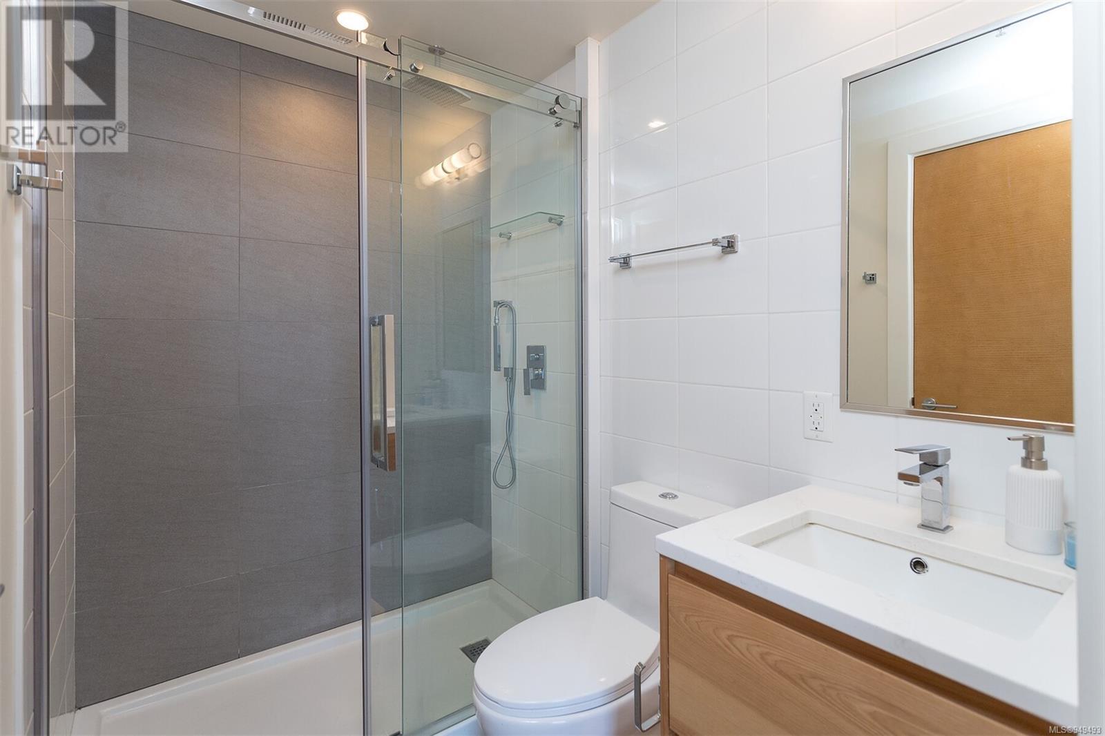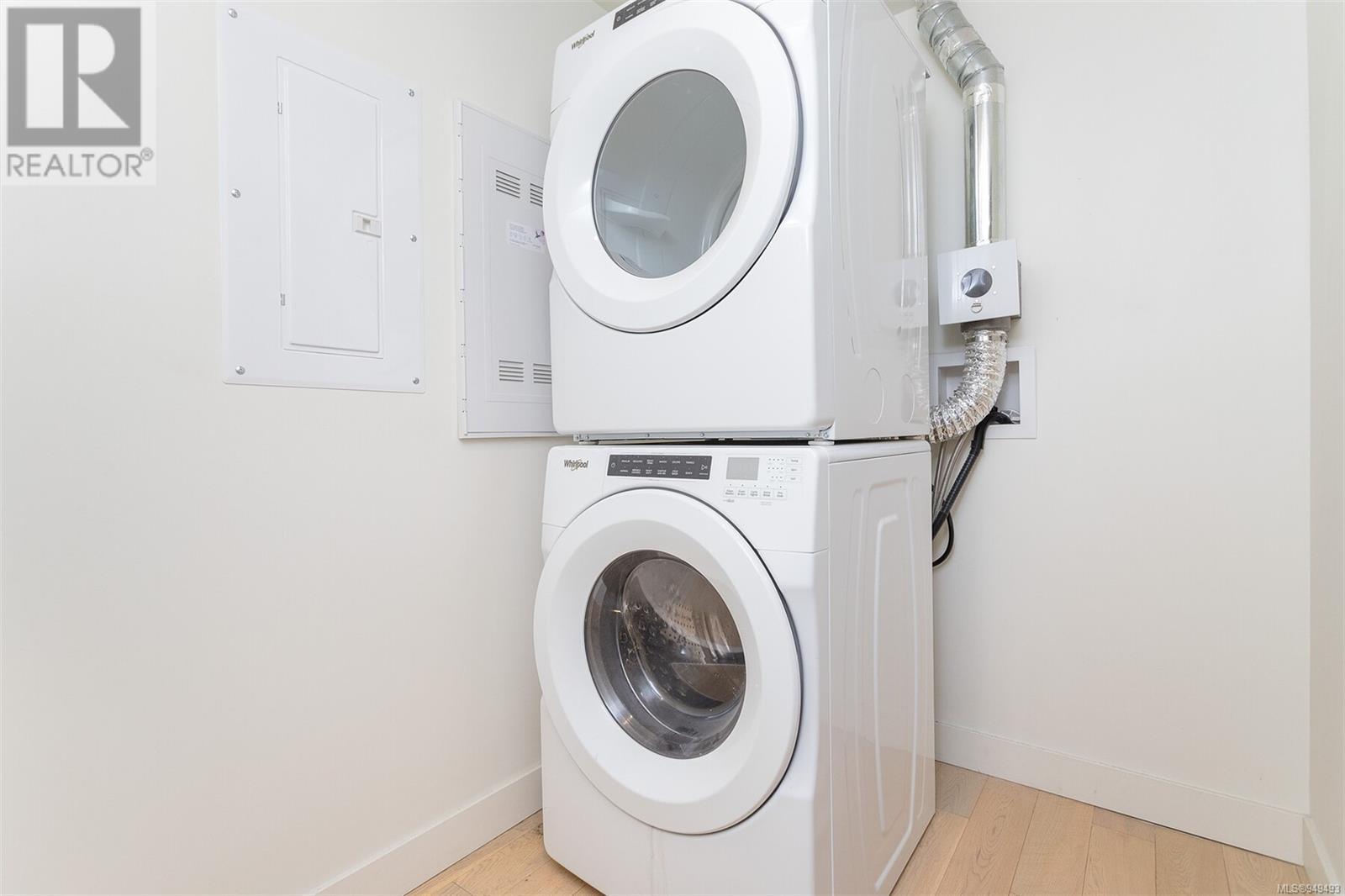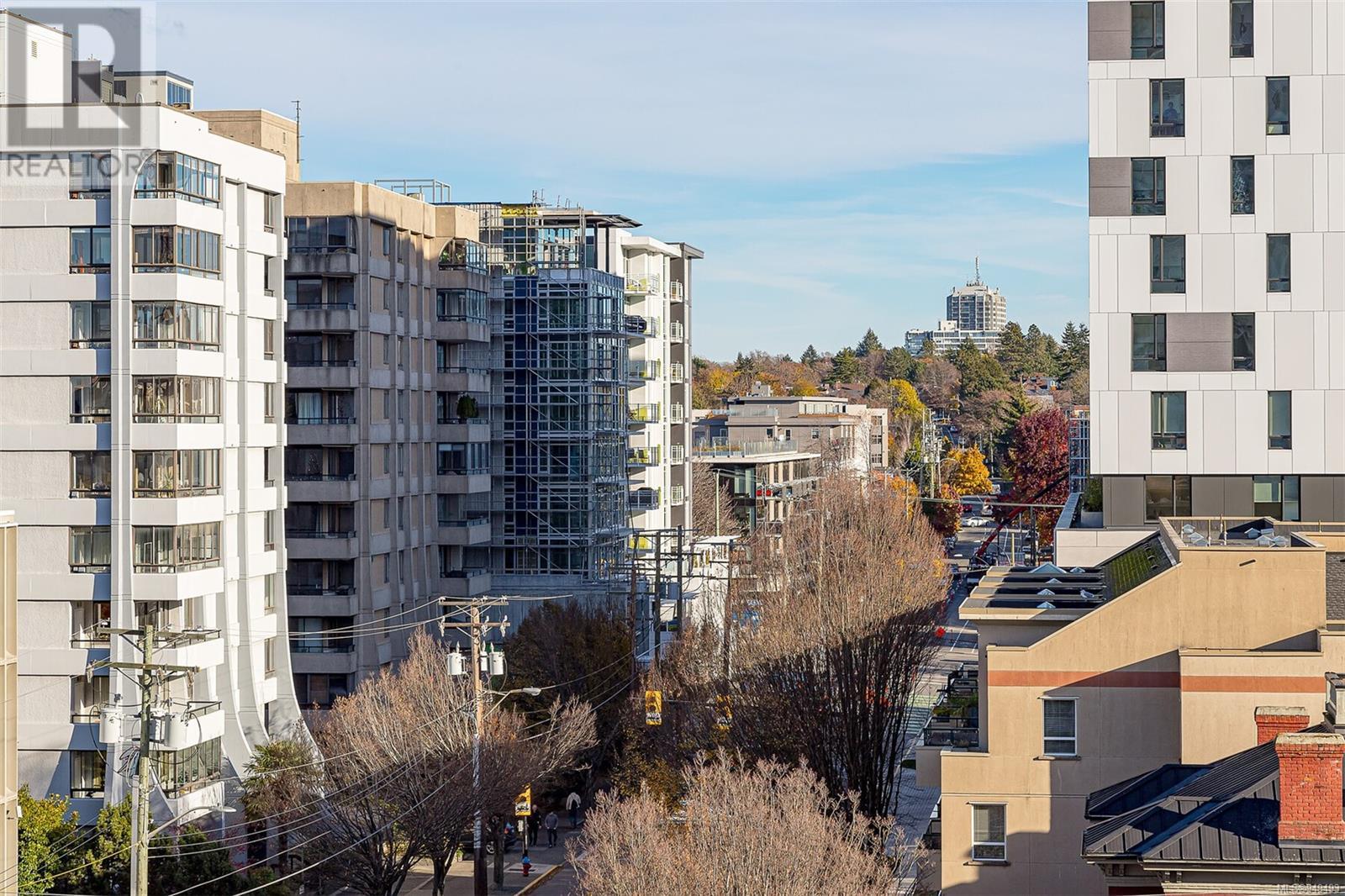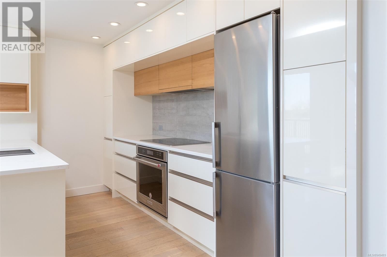 TOP FLOOR unit in the central podium of 989 Johnson! Experience urban living in this vibrant 2019 steel & concrete building steps from downtown Victoria. This property is great for first time buyers or downsizers looking for a turn-key and modern space with plentiful amenities out the front door. The open concept floor plan allows for entertaining, dining & relaxing. Some stand out features include floor to ceiling windows in the living room, oak engineered hardwood floors, white quartz countertops, stainless steel appliances & a covered balcony. In the bathroom, you will find a floating vanity w/ underlight & rain shower. The bright bedroom includes a high quality wood closet dresser/organizer. The walk-in laundry room is a big bonus with extra space for shelving & storage. A secure underground parking spot & oversized storage locker is included too. Then just an elevator ride down to Forge Gym as residents are offered a special rate gym membership. Rentals, pets & all ages welcome! (id:22211)