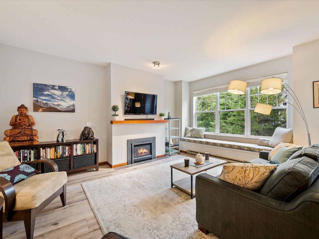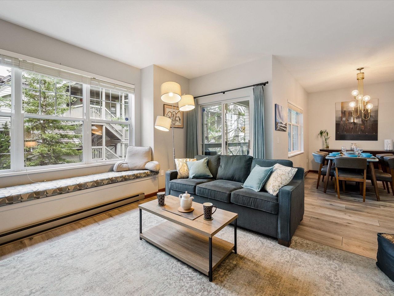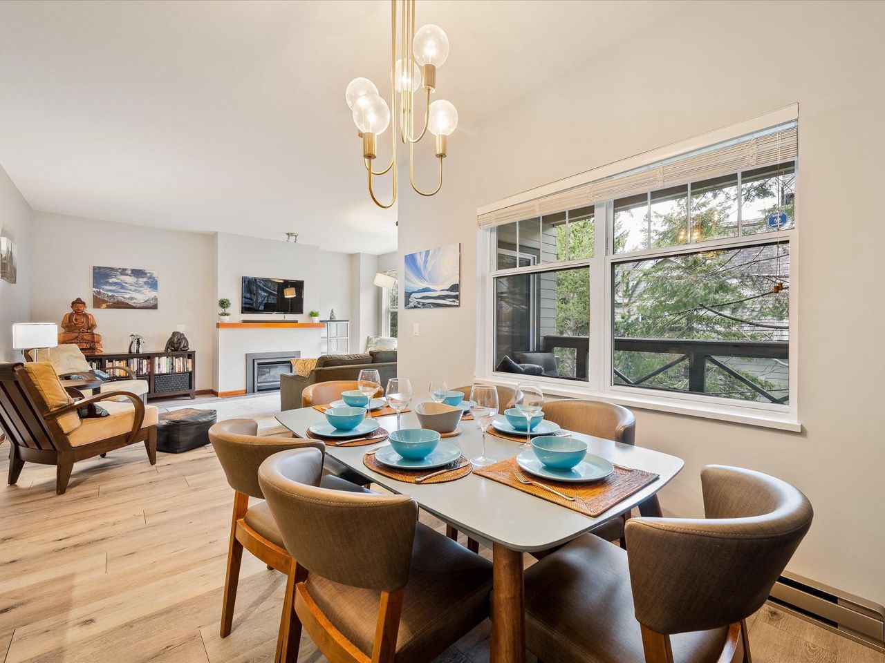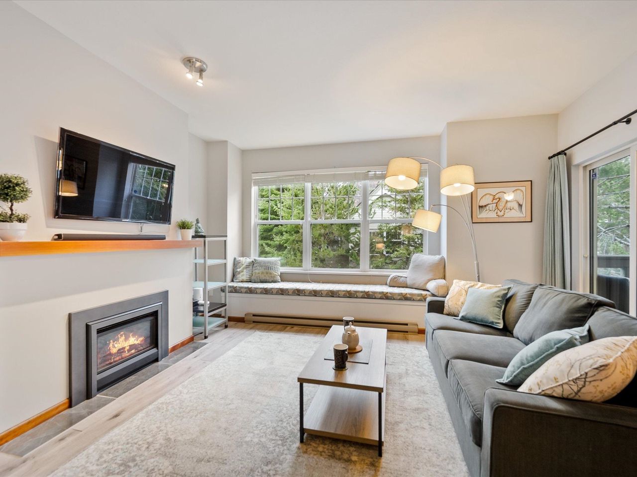 This spacious retreat perfectly blends comfort and convenience. The bright open-concept living room offers a cozy gas fireplace for chilly mountain evenings. The updated interior boasts a desirable floor plan on one level for easy access and flow throughout the home. Step outside onto your private covered balcony and take in the serene surroundings. Perfect for entertaining, the spacious layout lends itself well to gatherings with friends and family. With a large, secure storage area, you'll have plenty of room for all your gear. And with nightly rentals permitted, this property offers excellent revenue potential. Whistler Golf Course, the Valley Trail, Lakeside Park, and Whistler Village are within walking distance for easy access to shopping, dining, and outdoor recreation.
