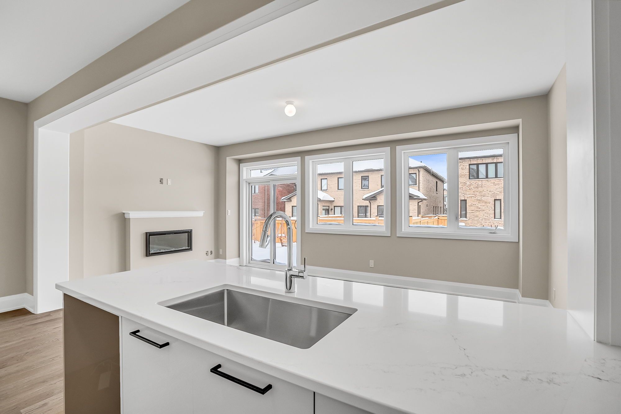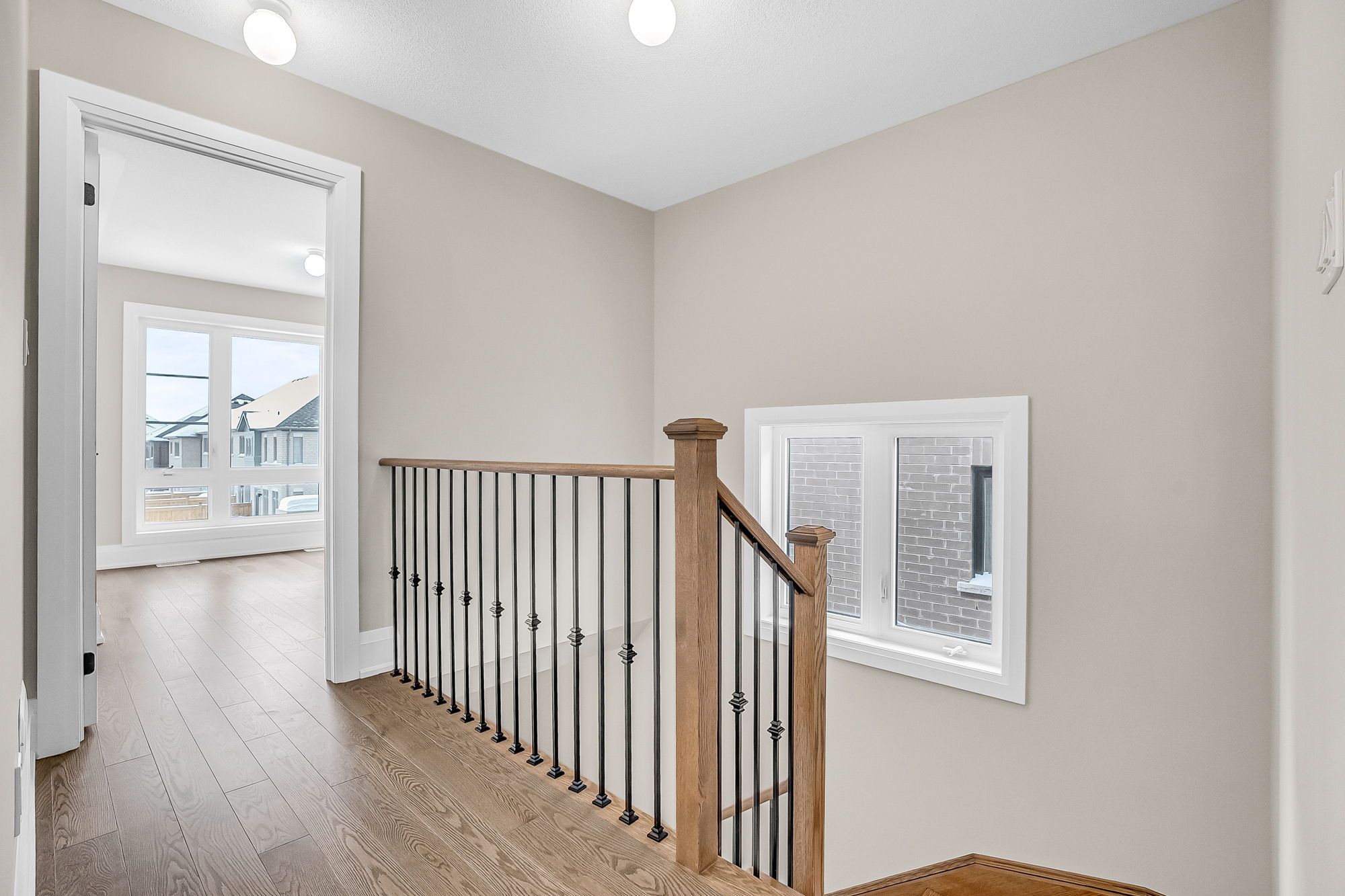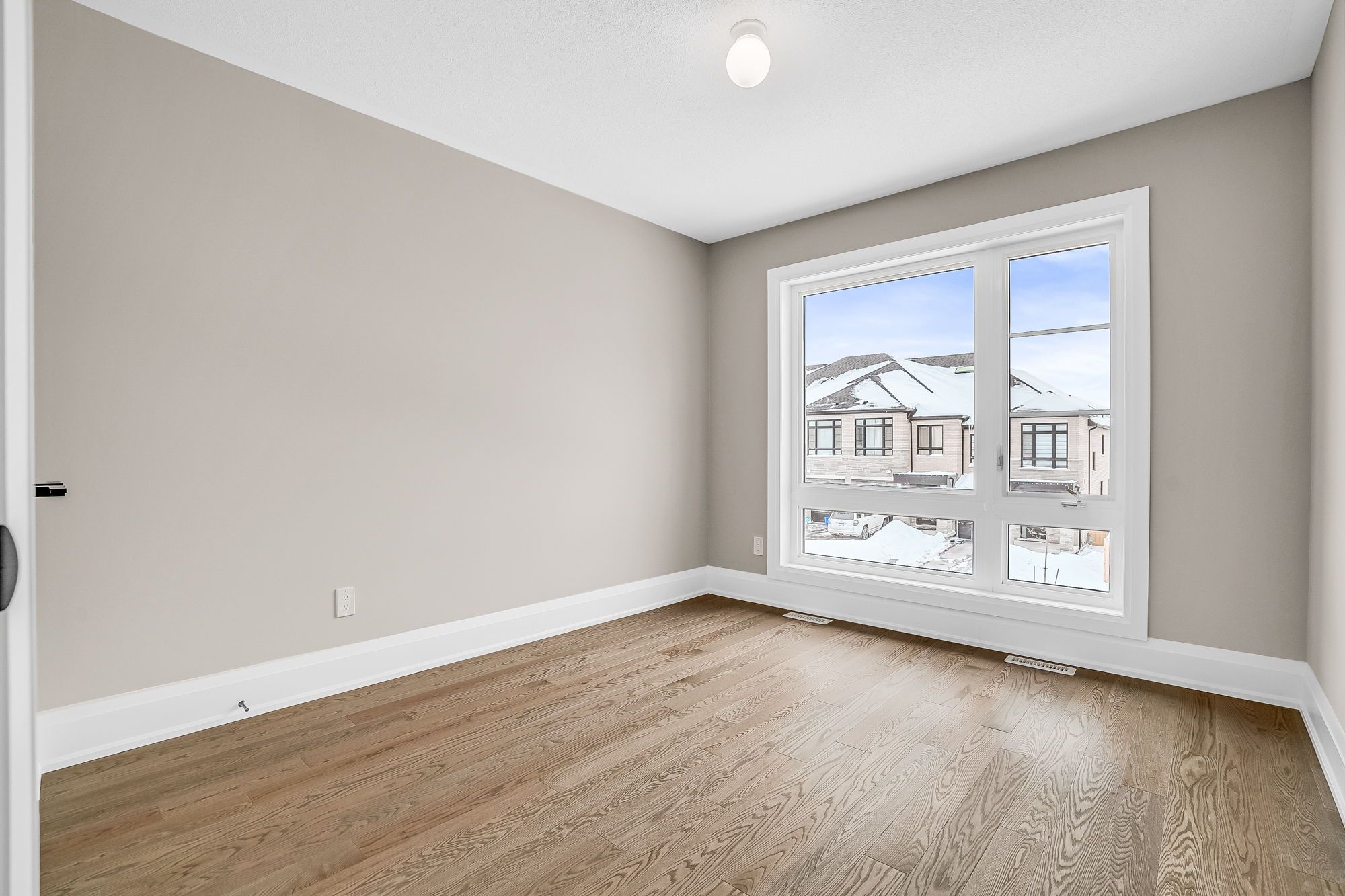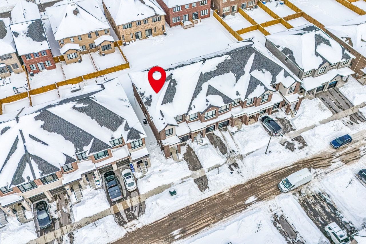 Never lived in Builder's inventory home for sale. This newly completed traditional 2 Storey end unit freehold townhouse (No maintenance fees or condo fees) is on a full depth 110ft deep private lot in the popular Queen's Common community by Vogue Homes. Living in an end unit brings forth the convenience of not having to go through the home to get to the backyard. Features include a modern exterior design with contemporary stone & brick elevation and oversized front windows, 9ft smooth ceilings on main floor, upgraded finishes such as 7 1/2" baseboards, upgraded interior doors and door hardware, and modern hardwood and tile flooring throughout all finished areas. The main floor has a spacious foyer where guests can hang their coat and also use the powder room. The kitchen comes equipped with a pantry, upgraded cabinets, tile backsplash, stone countertop with large undermount sink and an extended breakfast bar. The breakfast area is perfect for the sit down meals with the family. The large combined living and dining rooms are ready for more seating requirements when entertaining guests or for when you just want to relax on the sofa. The impressive 17ft long family room has a cozy fireplace and patio doors that lead to the back yard. The oak staircase with iron pickets take you to the second floor where you will find 4 bedrooms + the laundry room. The primary bedroom has a walk-in closet and a 4pc ensuite with glass shower, upgraded vanity with stone countertop and free standing tub. The other three bedrooms come with spacious double closets, and the main bathroom is a 4pc with an upgraded vanity finished with a stone countertop. The unfinished basement is equipped with a rough-in for a 3pc bathroom, tankless hot water tank (rental), and HVAC system. This is where you want to live.Two storey towns have less steps & a more practical floor plan layout over 3 storey towns and a deeper 110ft lot creates more distance from the homes behind for more privacy than an 89ft lot.