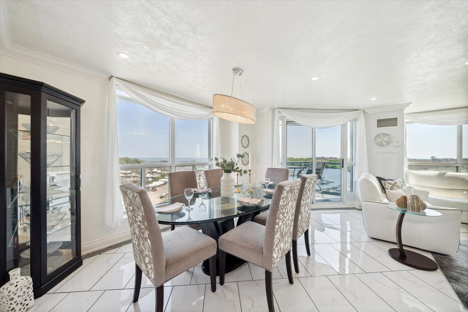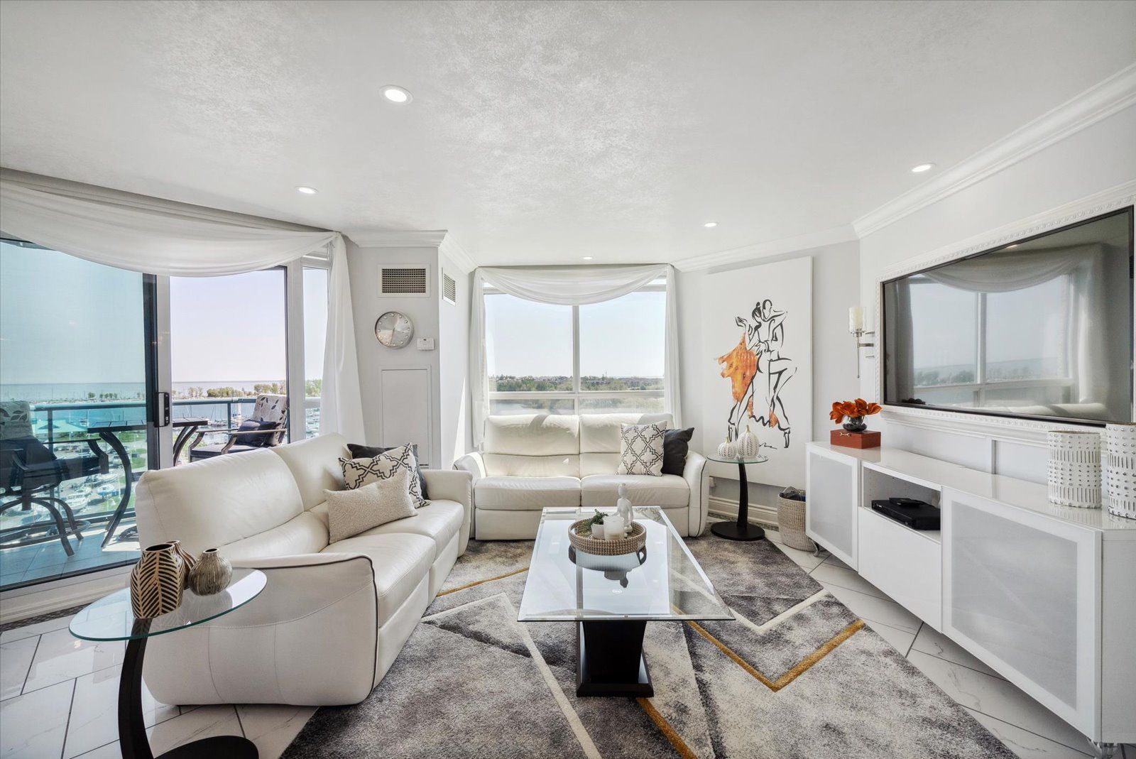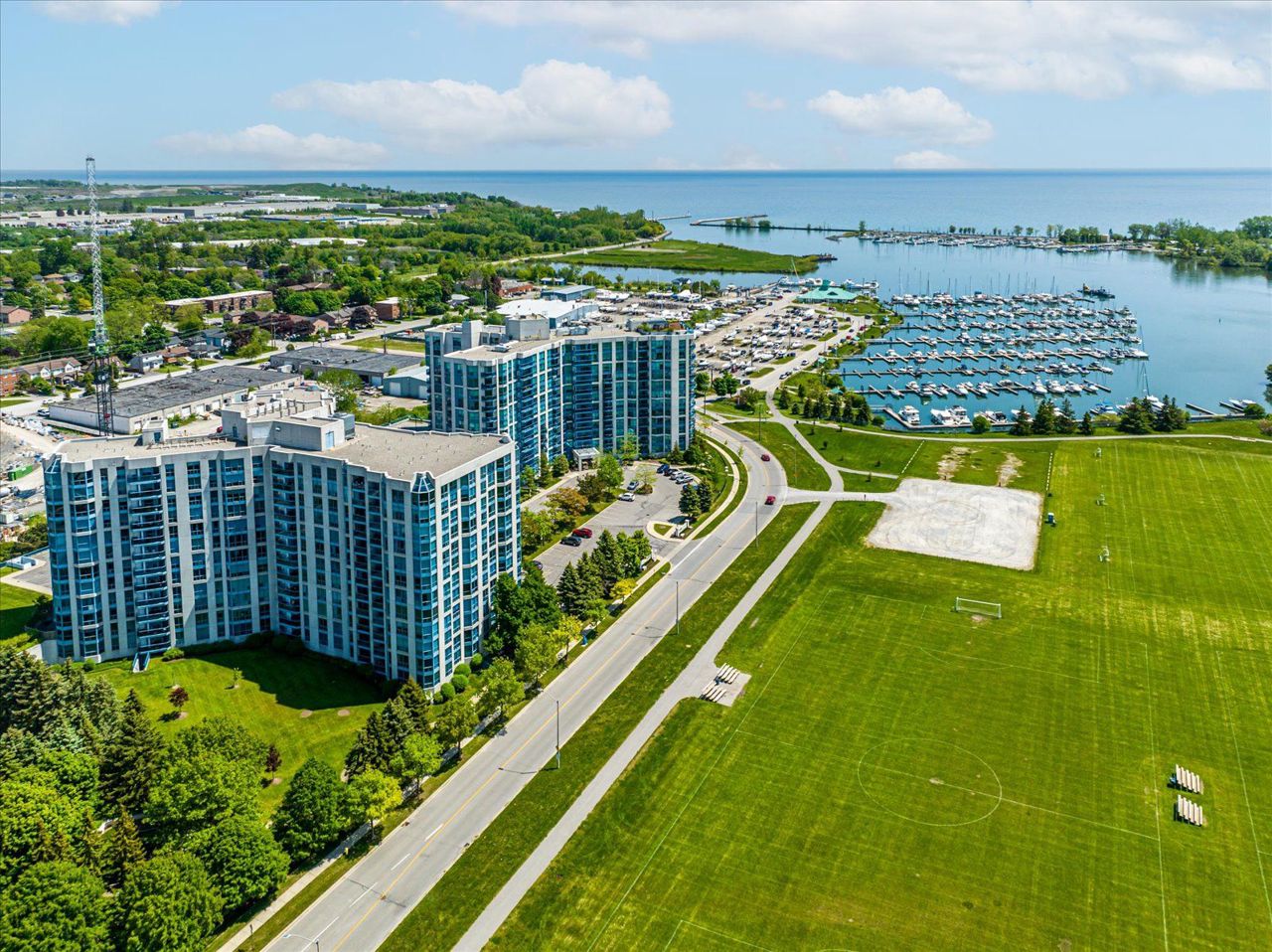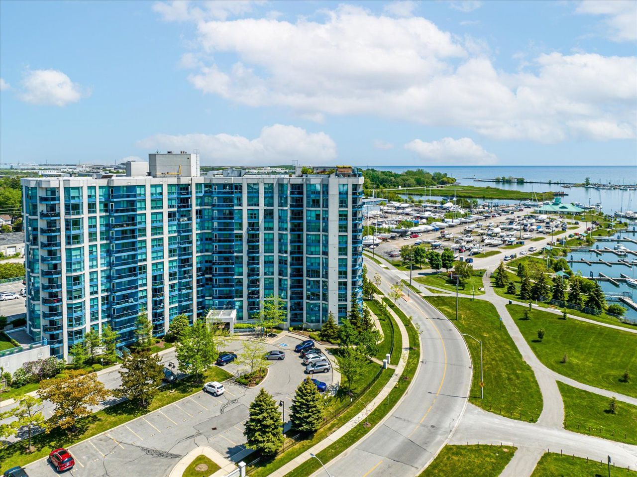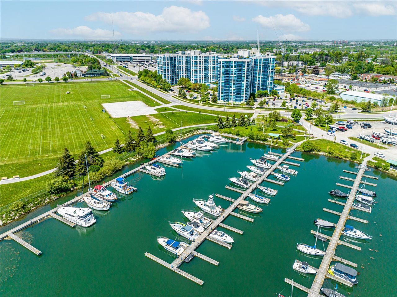 Step into luxury living at the "Yacht Club". This rarely-offered Resolute model is a 1630-square-foot suite situated in a building that has undergone significant updates, reflecting modern design aesthetics and a commitment to quality. Prepare to be mesmerized by the breathtaking panoramic south-facing water views of the Whitby Marina, providing a picturesque backdrop overlooking Lake Ontario. Offering an exceptional layout, this residence boasts 2 enormous bedrooms that were cleverly converted from 3 but can easily be transformed back, granting you the flexibility to adapt the space to your preference. Every inch of this condo has been tastefully renovated with stunning updates and meticulous attention to detail, showcasing exquisite taste and style. The open-concept design seamlessly blends the kitchen, dining, and living areas. Adorned with large windows, natural light floods the space, accentuating the awe-inspiring views and infusing a sense of serenty throughout.The Condo Fees Include Utilities, Providing A Worry-Free Lifestyle Where Water, Electricity, Heating, Internet Are Conveniently Covered. Amenities Include A Fitness Center, Pool, Hot Tub, Roof-Top Patio, 2 Parking Spaces, And A Locker.
