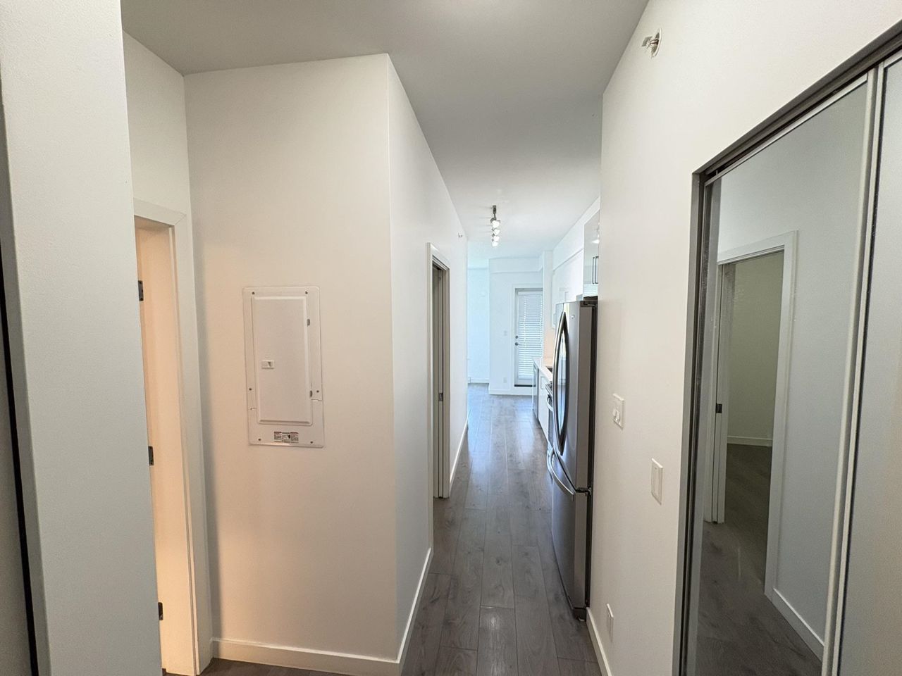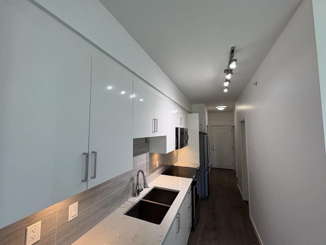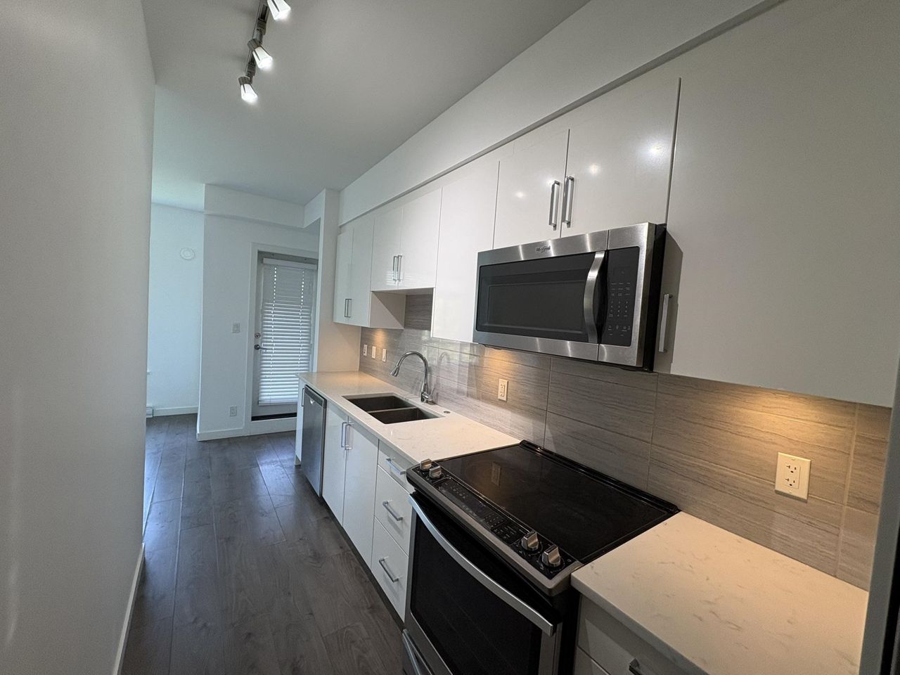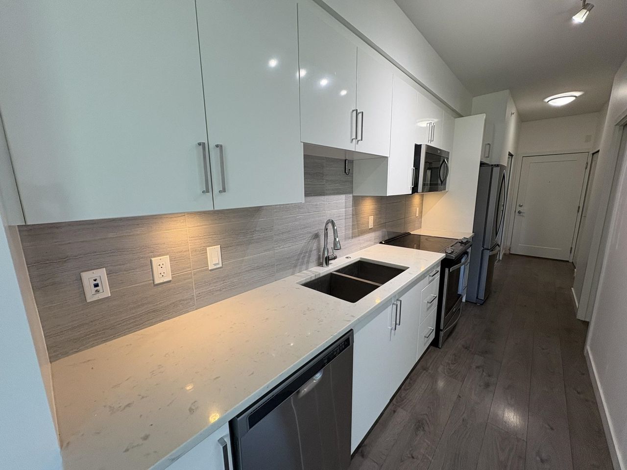 Located on the top floor, this bright 1 bed, 1 bath condo offers modern living with an open-concept layout, sleek finishes, and oversized windows that let in plenty of natural light. The gourmet kitchen boasts quartz countertops, stainless steel appliances, and storage, perfect for cooking and entertaining! Located just steps from shopping, transit, parks, and schools, this building offers both comfort and convenience. 1 parking stall (#357) and 1 storage locker.
