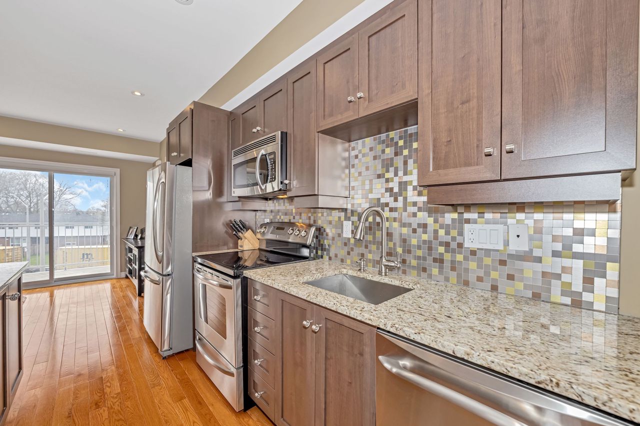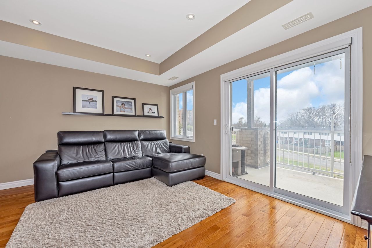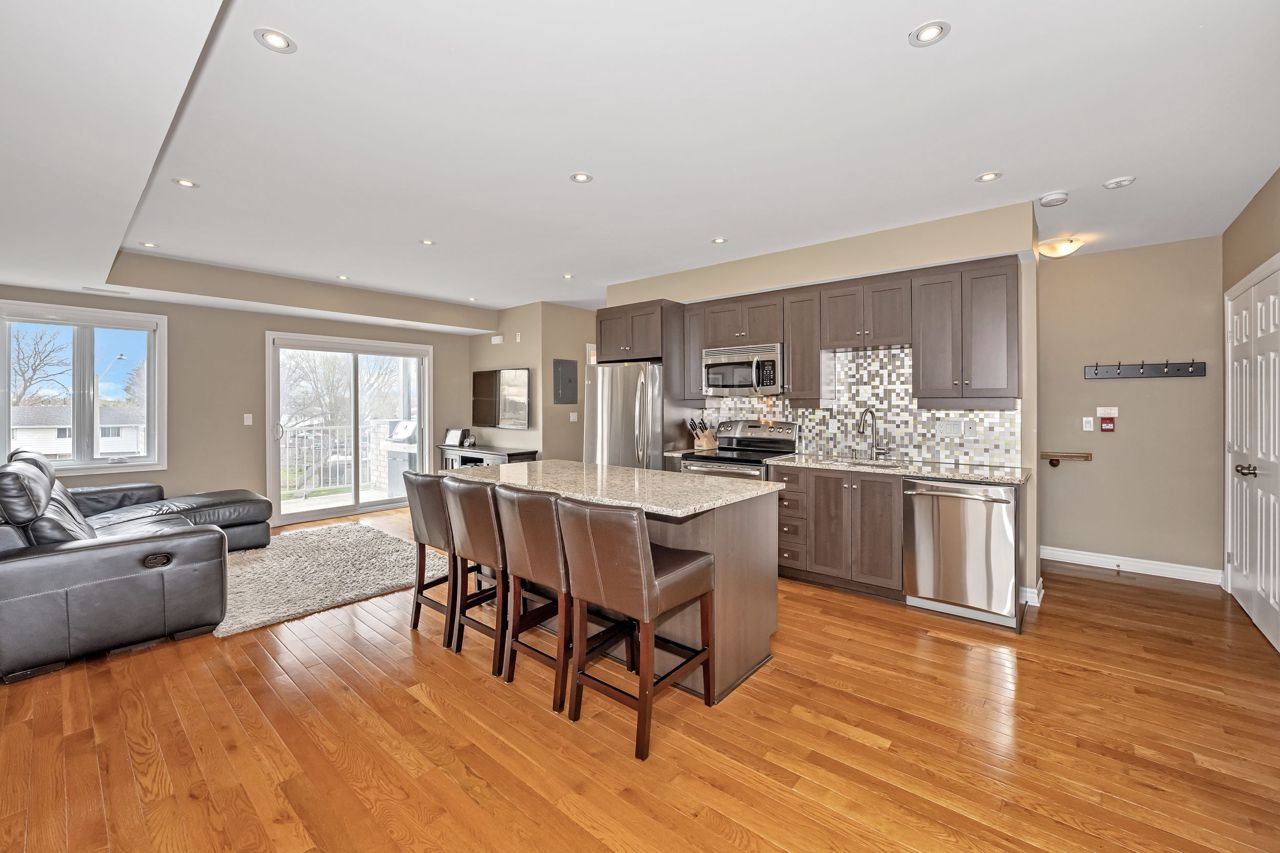 ATTENTION FIRST-TIME HOMEBUYERS, INVESTORS and DOWNSIZERS. Discover this stunning 3 bedroom, 3 bathroom executive upper-level townhouse offering modern luxury and comfort in a desirable location. Perfect for entertaining the open concept main floor with stunning hardwood floors is flooded with natural light and includes a chef inspired kitchen with granite counters, stainless steel appliances, ample storage, a center island with seating for 4 as well as an additional eating area for a formal dining table. There is also a spacious living room with a walk-out balcony, powder room and in-unit laundry completing the main floor. Upstairs you'll find the primary bedroom with a 4-piece en-suite bathroom and another walk-out balcony along with two more good-sized bedrooms and a second 4-piece bathroom. Just minutes away from the Queensway and less than 500m from a future light rail station makes this the perfect location for moving about the city. It's also close to parks, schools, shopping and more. Don't miss this opportunity, book your showing today.