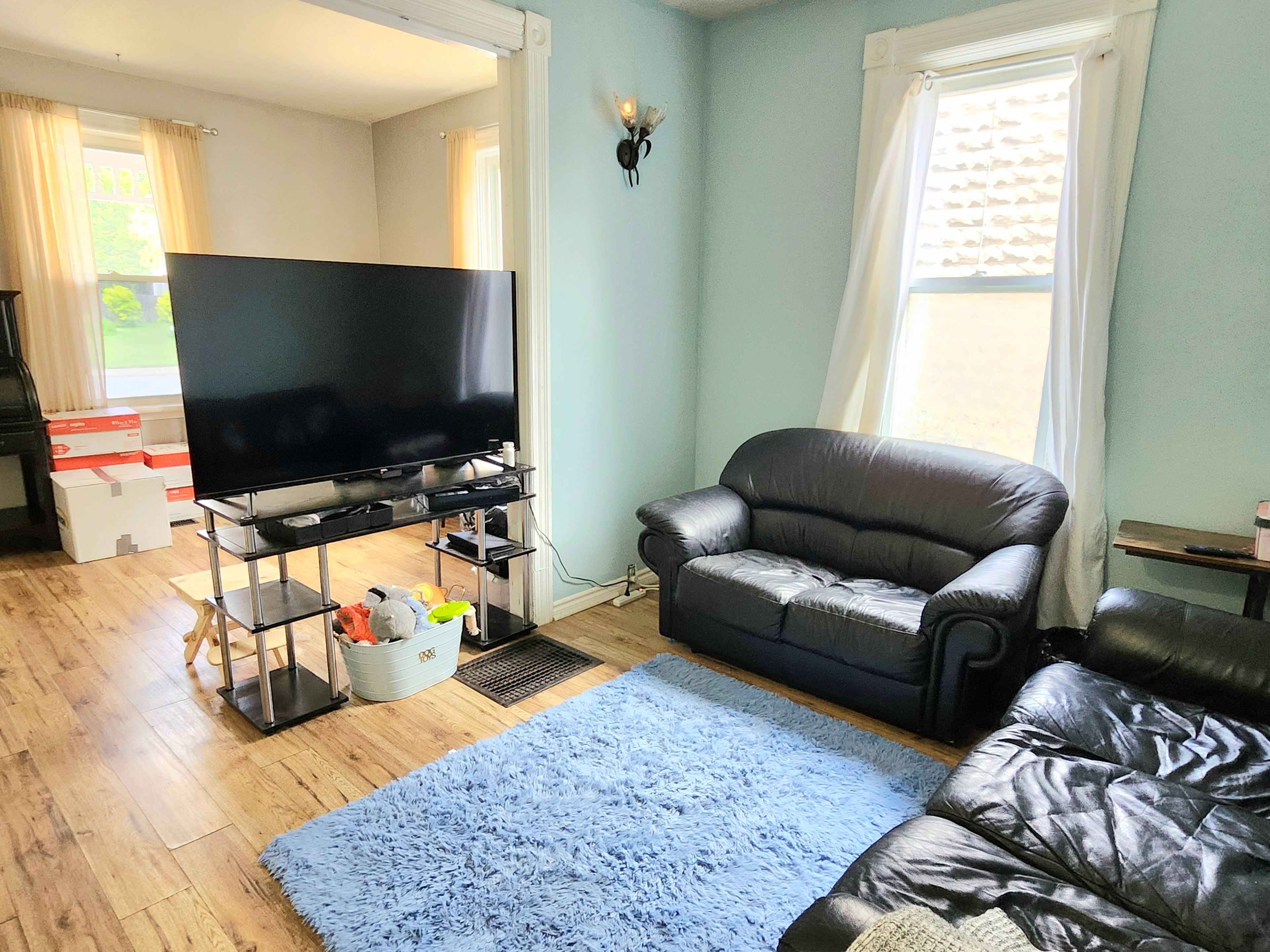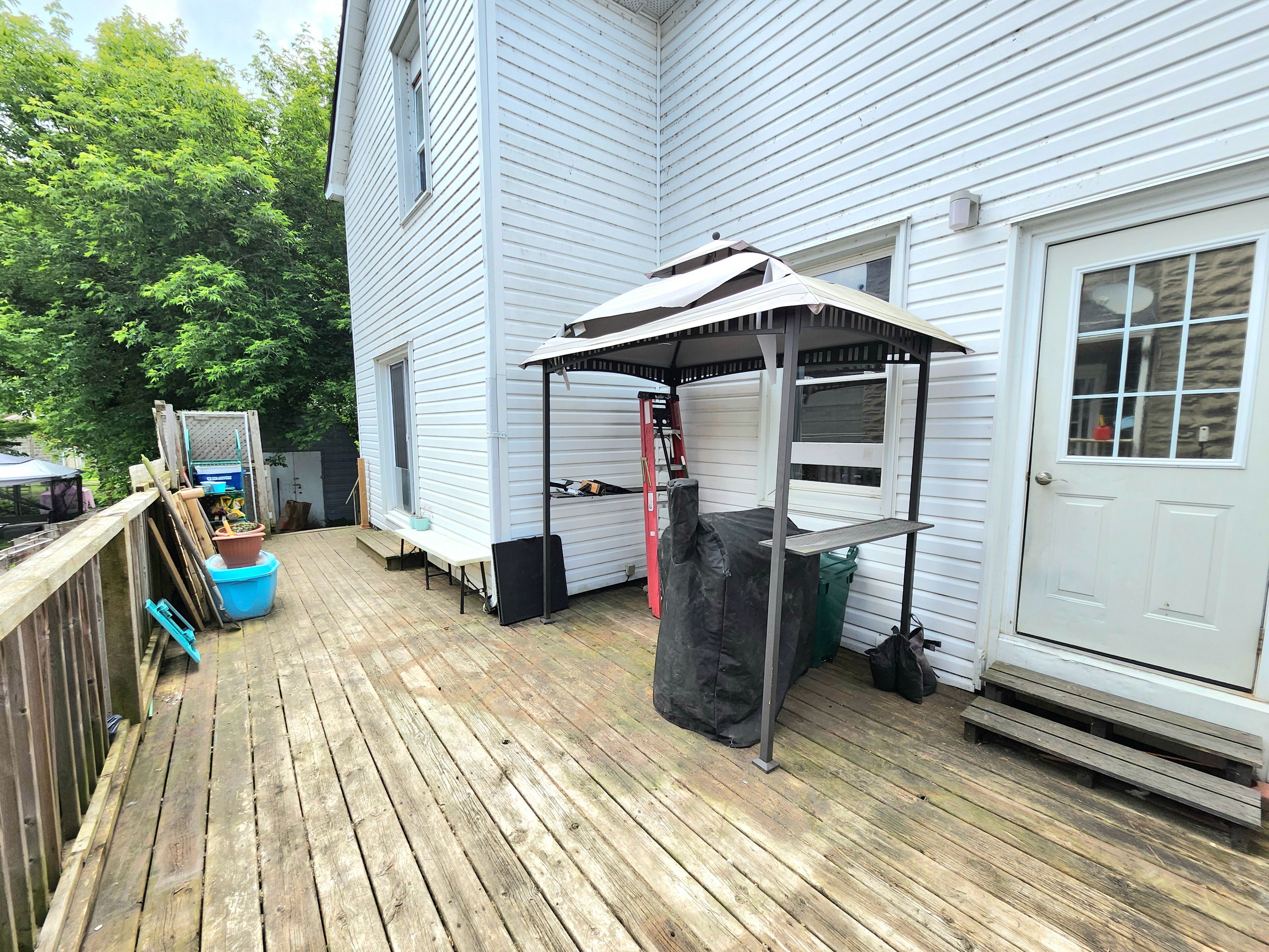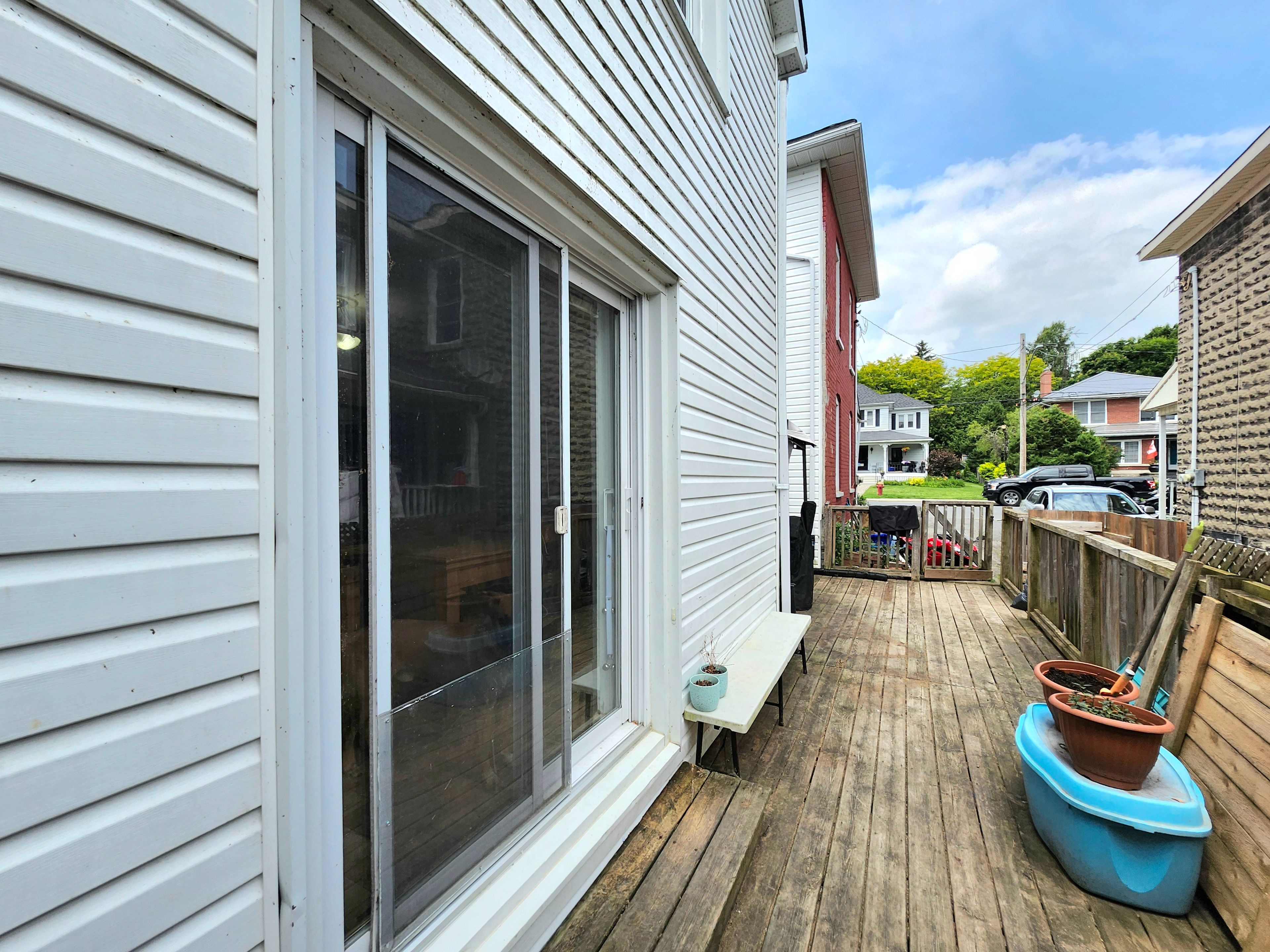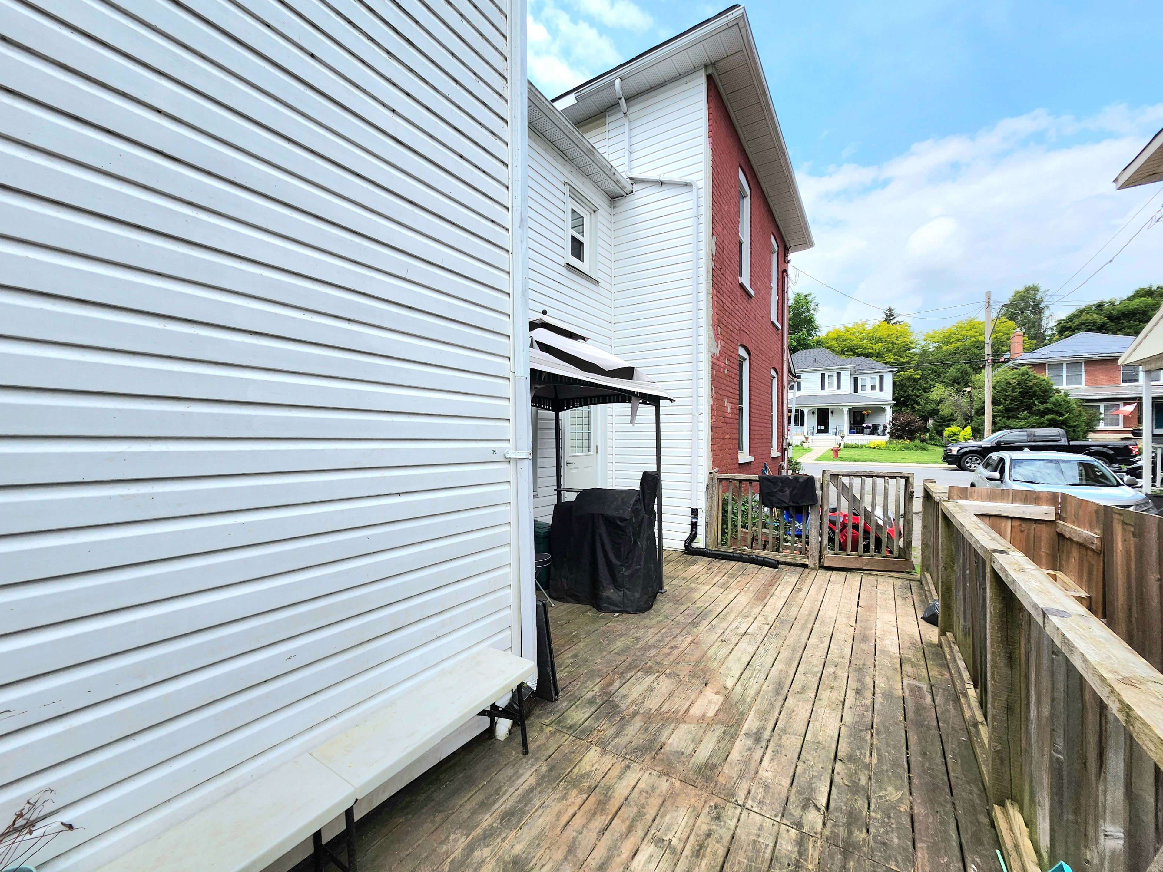 Spacious 3+1 bedroom semi-detached home in the heart of downtown Prescott. This solid brick home features double living areas on the main floor, a separate dining room, and an eat-in kitchen with patio doors leading to a side deck, perfect for outdoor dining. The kitchen also includes a rough-in for a future bathroom or main floor laundry. Upstairs, there are two bedrooms and a full bath in addition to the large primary bedroom, which offers a 4-piece. ensuite bath and a bonus room ideal for a den, office, or nursery. Two full bathrooms, an updated electrical panel, and forced air heating provide comfort and efficiency. The fenced rear yard features a spacious storage shed and ample space to enjoy the outdoors. Conveniently located close to schools, shops, and the St. Lawrence River. Windows updated (2015), back roof (2016), hot water tank owned (2016)