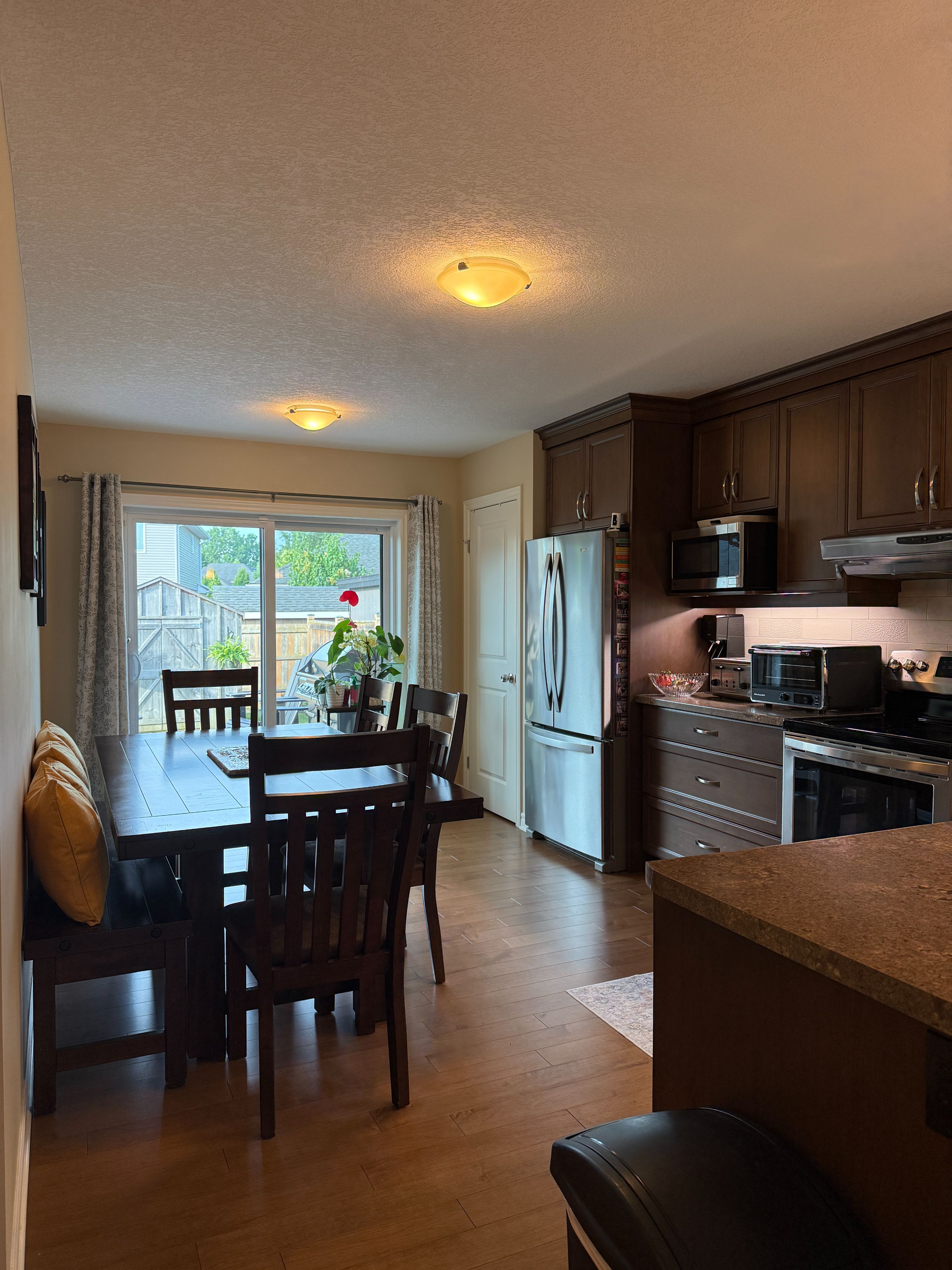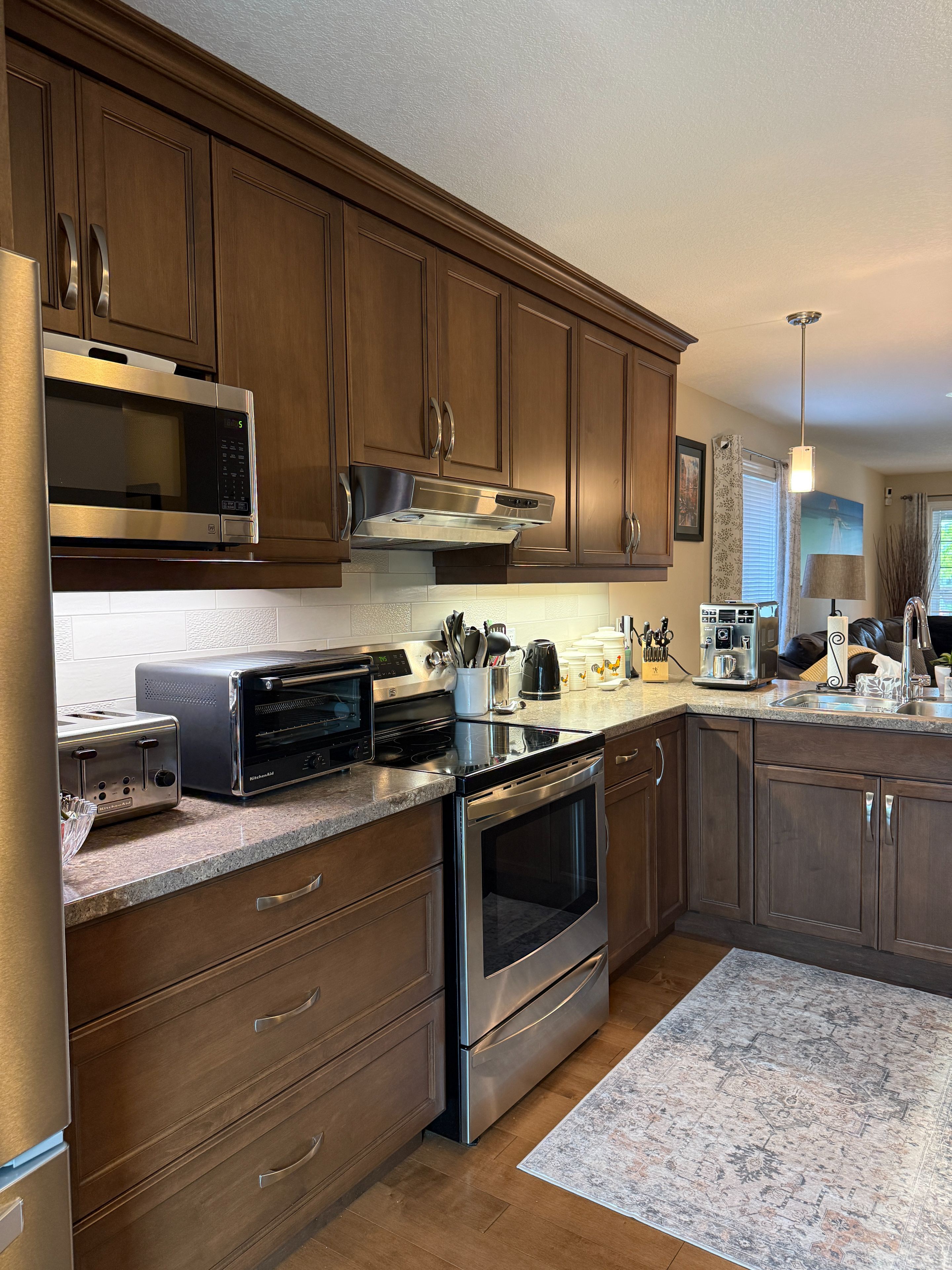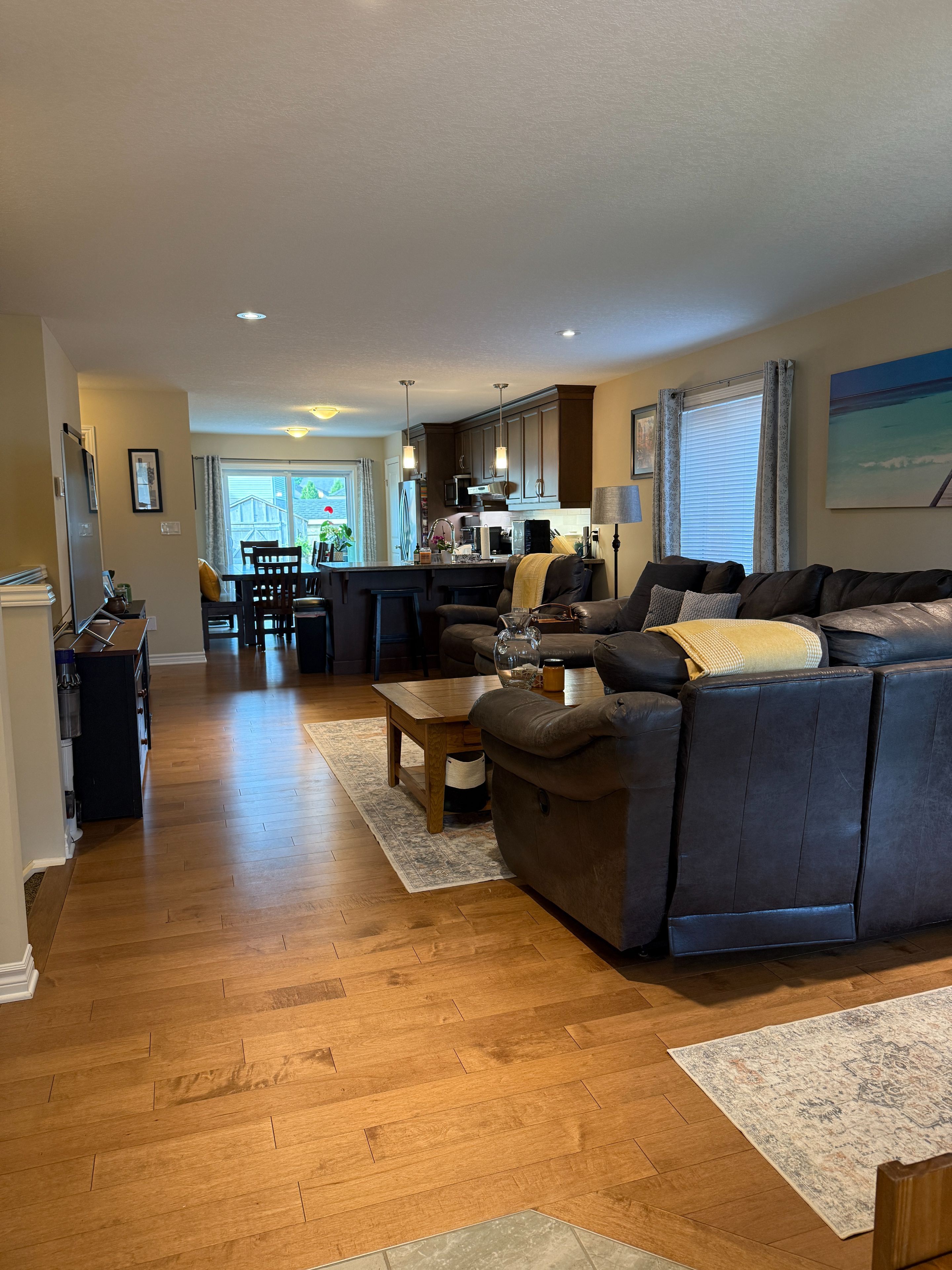 Beautiful 4-Bedroom Bungalow in Desirable School District. Impeccably maintained Doug Tarry-built home offering 4 bedrooms and 3 full bathrooms, located in the sought-after Mitchell Hepburn, St. Anne's and St. Joseph's School District. Perfect for families and those seeking a quiet, family-friendly neighborhood. Curb appeal starts with an oversized double-wide concrete driveway (2020) and low-maintenance river rock landscaping. A concrete pathway leads to a fully fenced backyard ideal for those looking for minimal outdoor upkeep. Inside, the bright foyer opens into a spacious open-concept living and dining area. The kitchen features a double sink with new faucet (2025), modern countertops, tile backsplash, and updated appliances: Frigidaire Professional Series dishwasher (2024) and Whirlpool fridge with ice maker and water dispenser (2025).Enjoy entertaining on your brand-new PVC deck (Spring 2025) overlooking the private backyard. The main floor includes two bedrooms and two full bathrooms, including a large primary suite with walk-in closet and ensuite. Laundry is conveniently located in the hallway between the bedrooms. The finished lower level offers a generous family room, two more bedrooms with closets, and a third full bathroom. One lower bedroom includes an oversized window for extra natural light. A 1.5-car garage easily fits a full-size SUV with space for storage or workbenches on either side. Move-in ready and ideally located near schools, parks, and all amenities. Don't miss this fantastic opportunity!