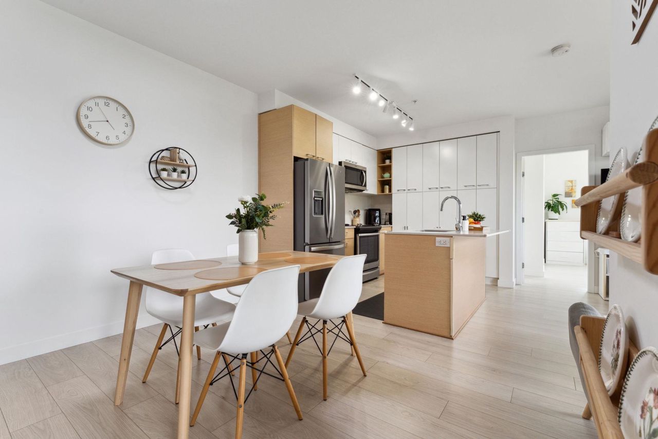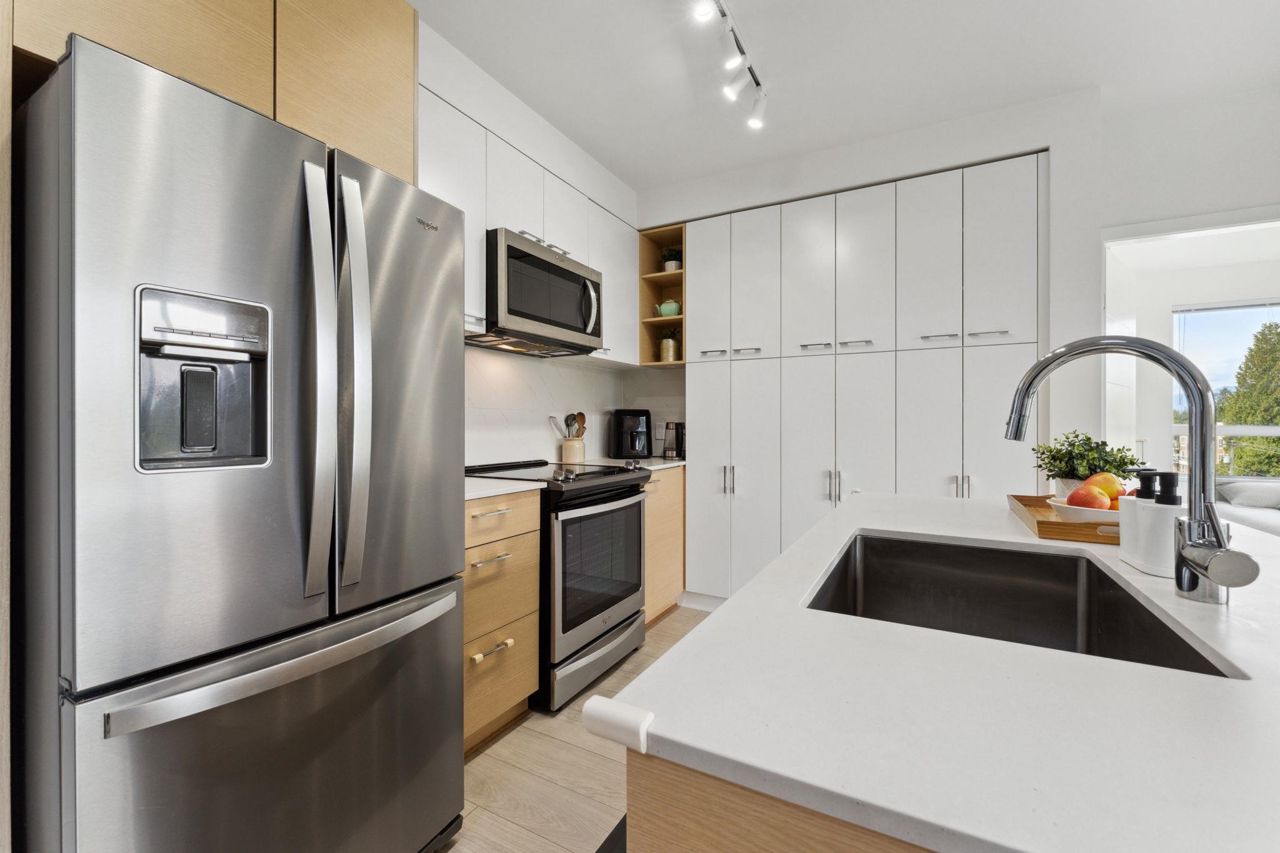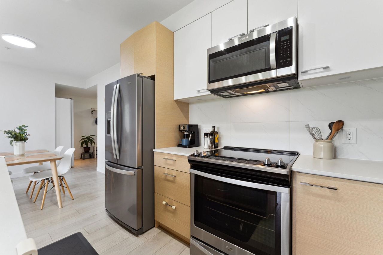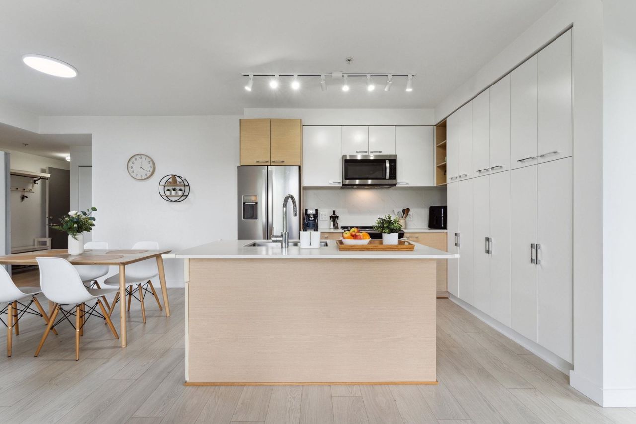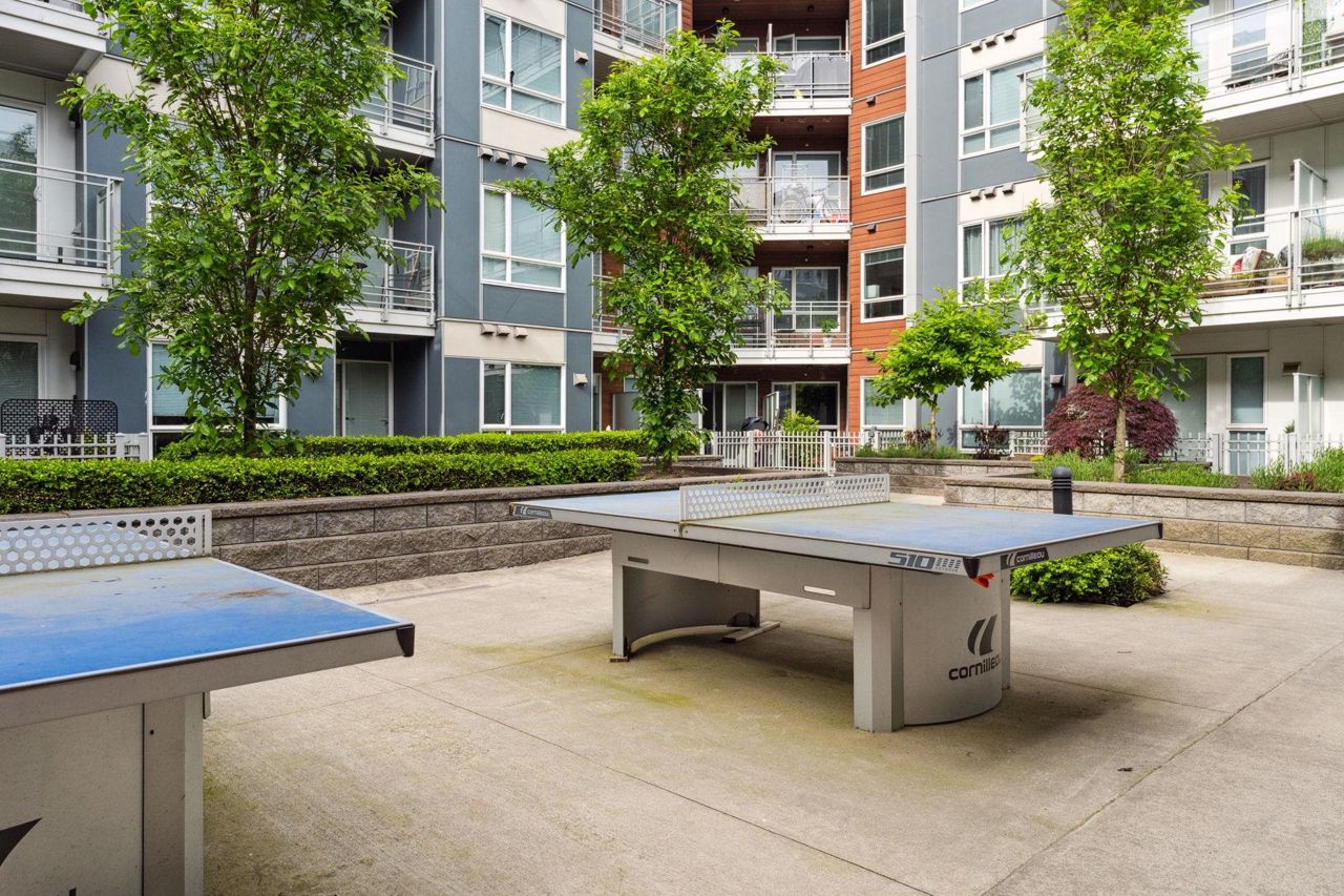 Welcome to Domain at HQ, a modern residence built by Porte in 2019. This stylish two-bedroom home features stainless steel appliances, wide plank flooring, and sleek quartz countertops. With a generous 887 SF open-concept layout, the kitchen, breakfast bar, dining, and living areas flow seamlessly together, all oriented to the Northeast, keeping the home naturally cool during the summer months. Laminate flooring provides easy access to the rooftop amenities. Conveniently, both the storage locker and parking stall are located on the same level (P1). Enjoy the outdoors with two beautiful parks just steps away. The building is known for its high-quality construction, excellent amenities, and prime location - close to SFU, Surrey Central, SkyTrain, shopping, Highway 1, and more. 2 parkings.