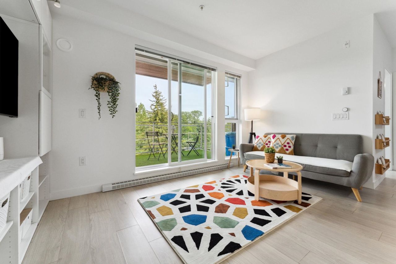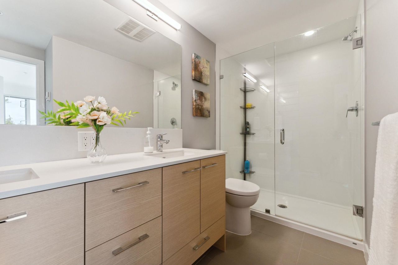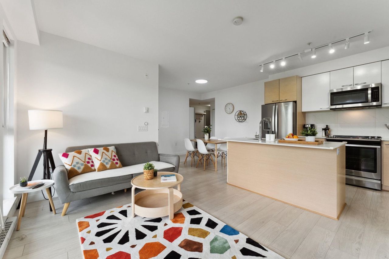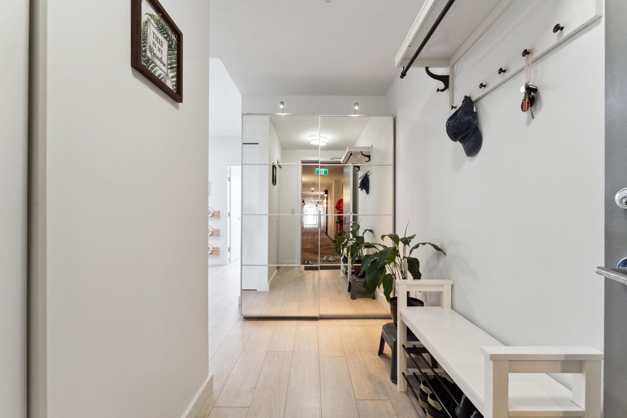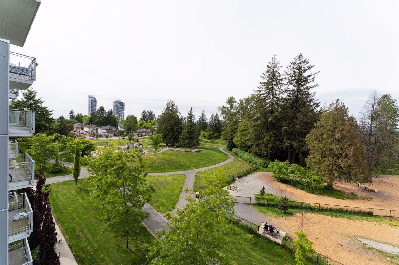 Welcome to Domain at HQ, a modern residence built by Porte in 2019. This stylish two-bedroom home features stainless steel appliances, wide plank flooring, and sleek quartz countertops. With a generous 887 SF open-concept layout, the kitchen, breakfast bar, dining, and living areas flow seamlessly together, all oriented to the Northeast, keeping the home naturally cool during the summer months. Laminate flooring provides easy access to the rooftop amenities. Conveniently, both the storage locker and parking stall are located on the same level (P1). Enjoy the outdoors with two beautiful parks just steps away. The building is known for its high-quality construction, excellent amenities, and prime location - close to SFU, Surrey Central, SkyTrain, shopping, Highway 1, and more. 2 parkings.