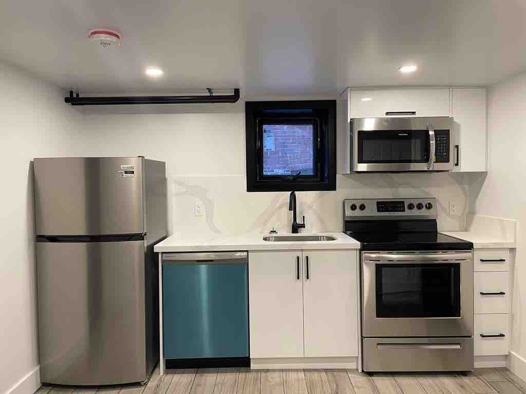 Beautifully renovated 1 bedroom basement apartment across from high park.This brand new 1 bedroom 1 bathroom has a modern kitchen, living room and exposed brick walls.Modern Kitchen equipped with Stainless steel appliances (dishwasher, built-in microwave, etc), backsplash. Shared Laundry in the building and Backyard.12 minutes walk to Keele Subway Station 8 minutes walk from Roncesvalles Avenue with street cars, many trendy cafes and restaurants, High Park across the street.