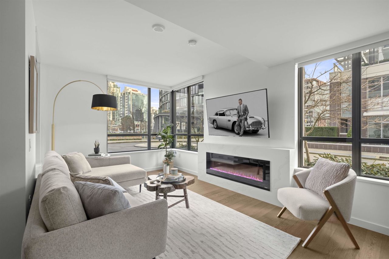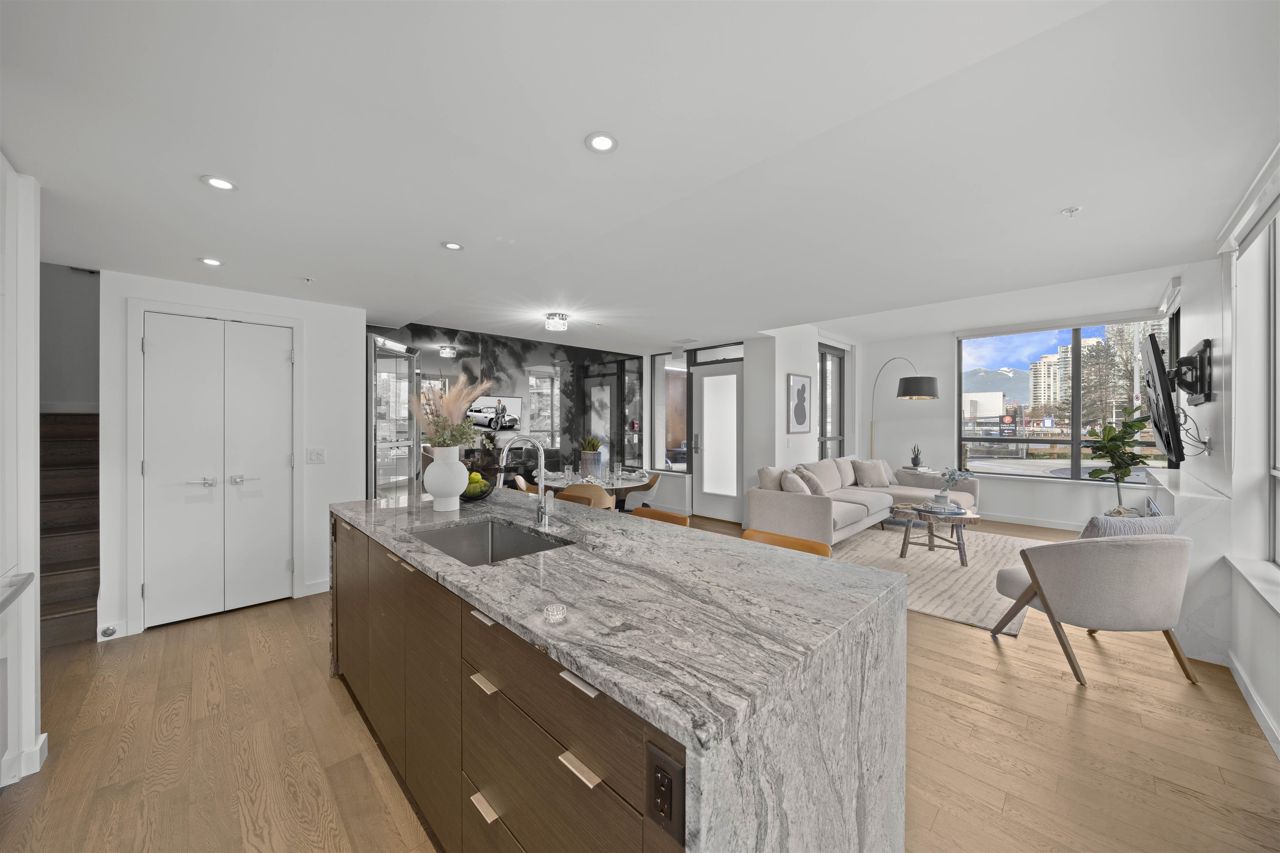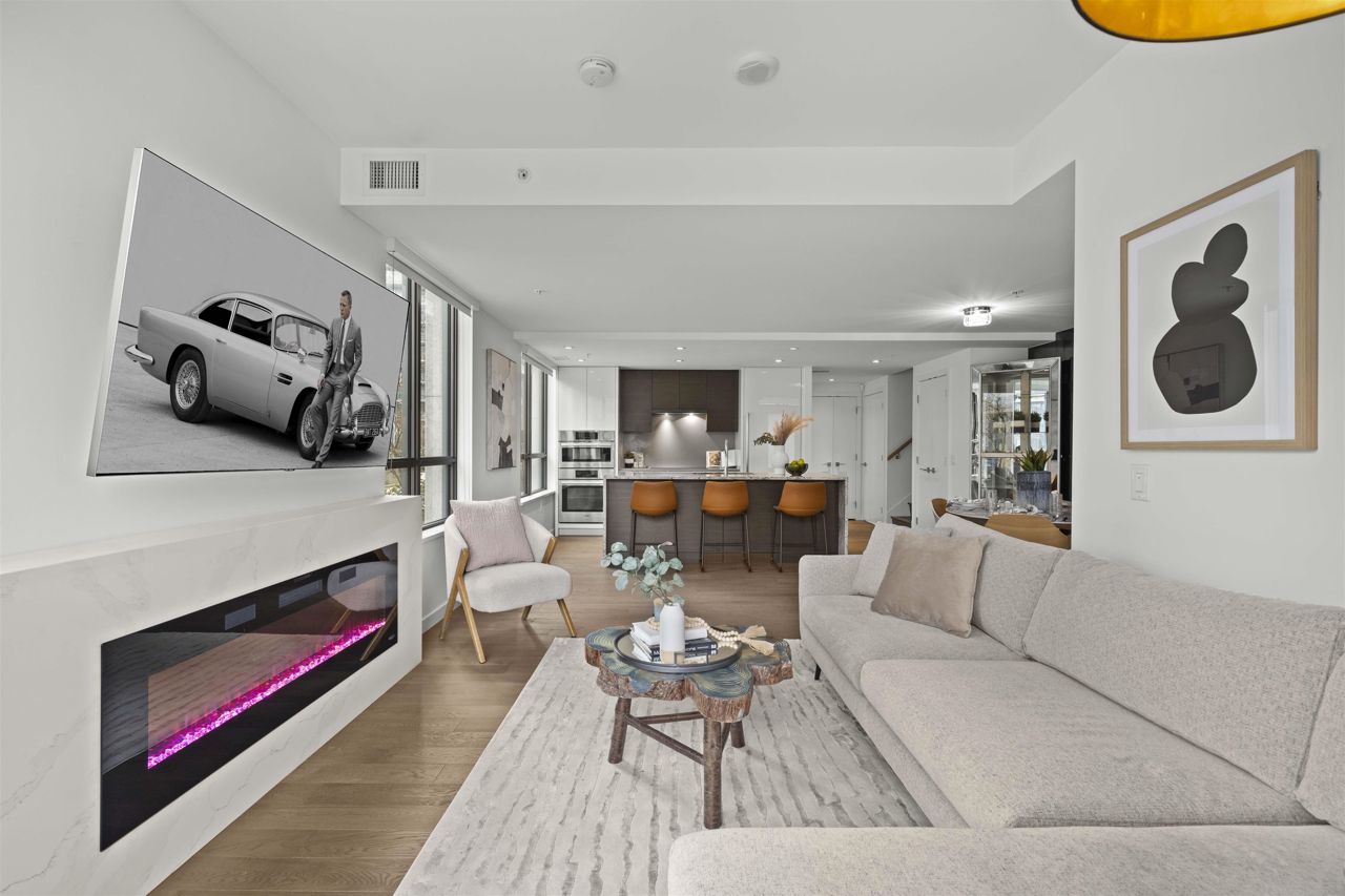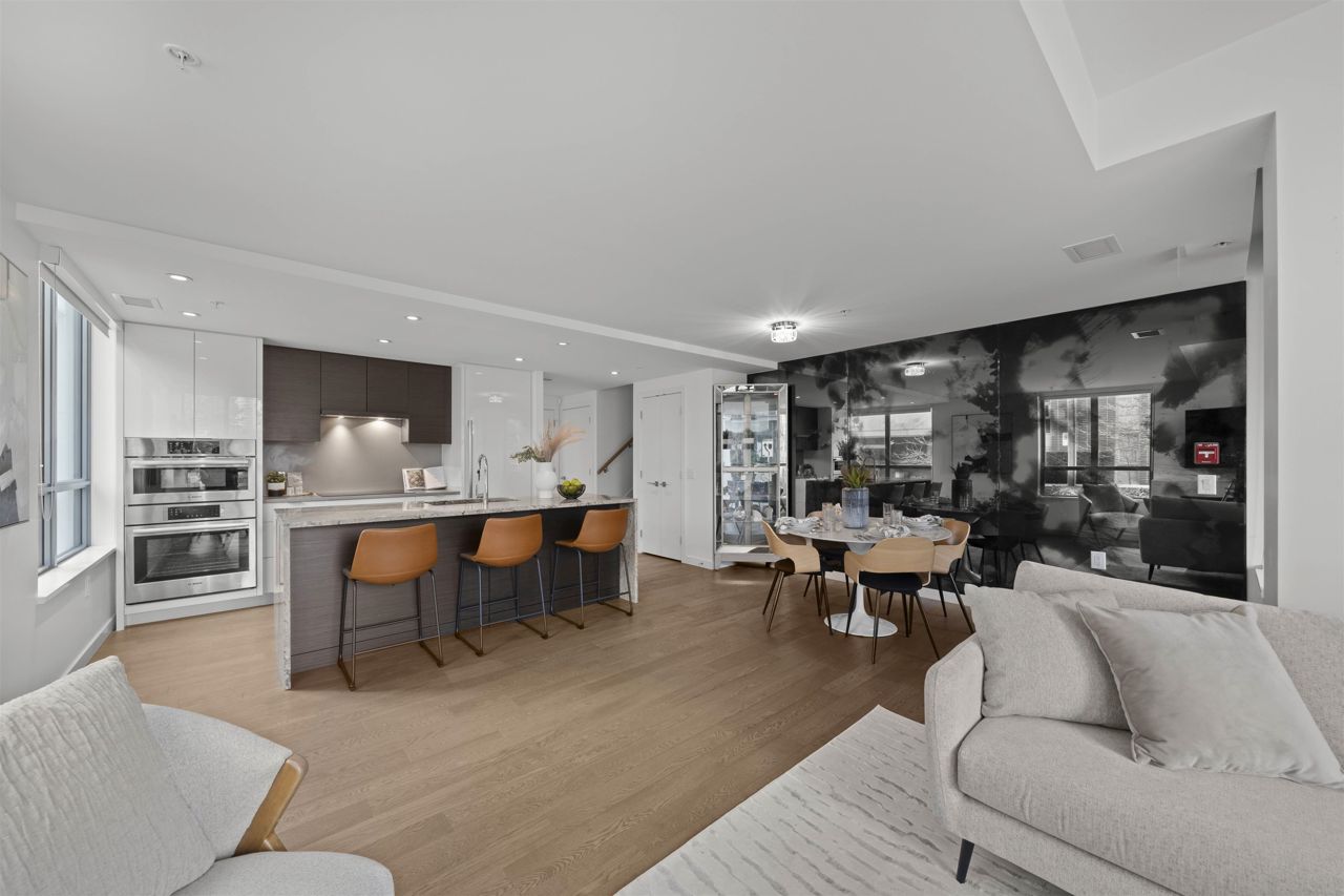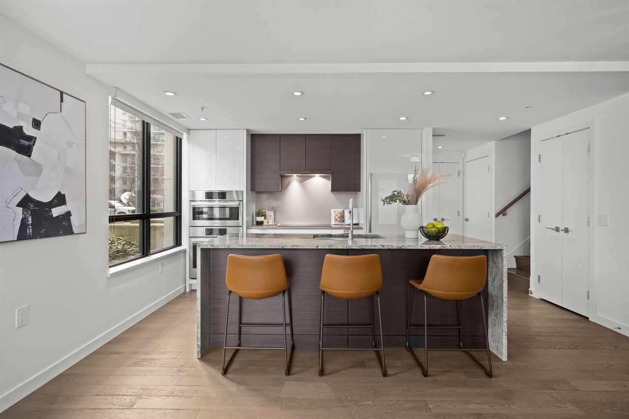 Discover LUXURY WATERFRONT LIVING at Navio North by Award-Winning CONCERT Properties! This rarely available 3 bed, 3 bath + flex CORNER townhome features a spacious open concept layout, overheight ceilings, hardwood flooring, AC, electric fireplace. Entertain your friends and family in the gourmet chef's kitchen w/premium integrated BOSCH appliances, double wall oven, beautiful granite slab countertops. Retreat to the king-size primary thoughtfully designed w/his & her closets and luxurious 5 piece ensuite, w/smart hygiene toilet and NUHEAT floor heating. Amenities include a fitness facility, social lounge w/outdoor terrace. Nestled along the seawall, just steps to Olympic Village and adjacent to the upcoming 6-acre waterfront park! 2 side-by-side parking stalls and 1 storage locker.