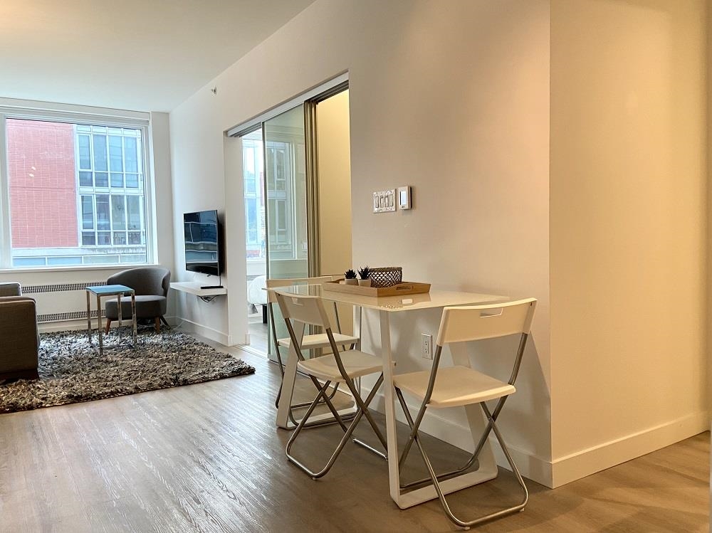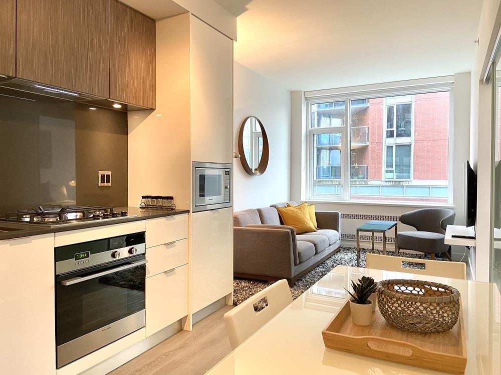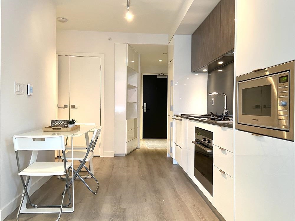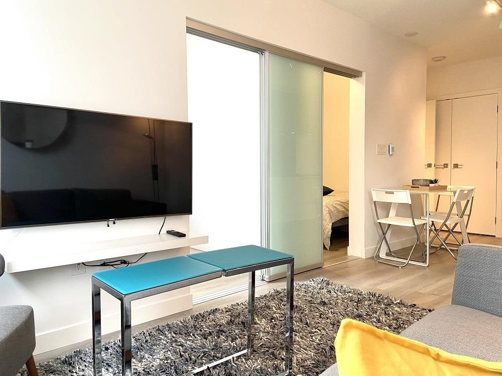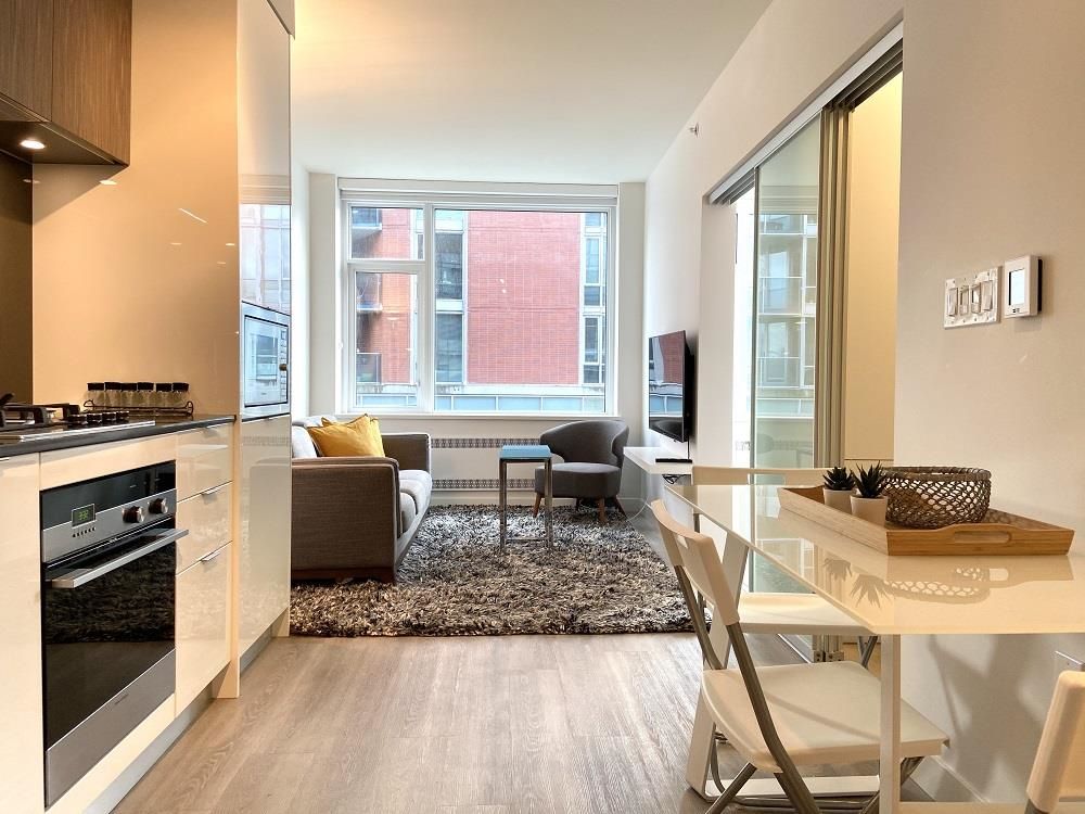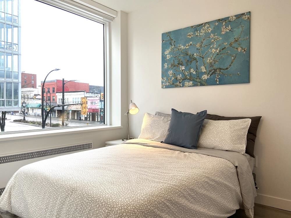 Experience modern urban living in this 670 Sqft furnished 2-bedroom, 1-bathroom condo for rent in East Vancouver's vibrant Mount Pleasant, located within the Ellsworth condo building. The condo boasts a contemporary floorplan designed for optimal functionality. Step into luxury with heated bathroom floors and elegant hardwood flooring throughout. A flex room area provides versatility to suit your needs. Entertainment is at your fingertips with a flat-screen TV, and you'll appreciate the lovely views from the windows. The sleek kitchen is a chef's dream, featuring stylish cabinetry, integrated stainless steel appliances, a glass range, and granite countertops. Both bedrooms offer total privacy, nestled behind frosted sliding doors, and furnished with plush beds, generous closet space.