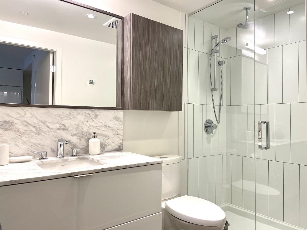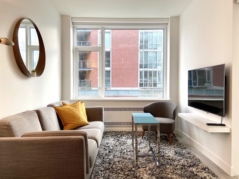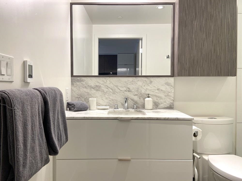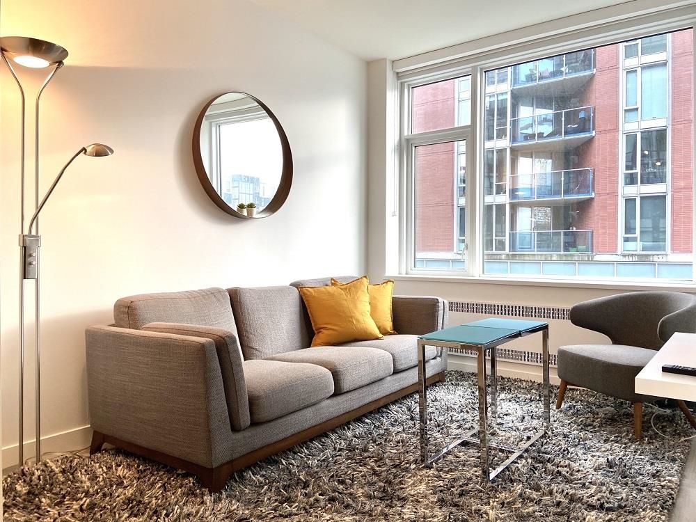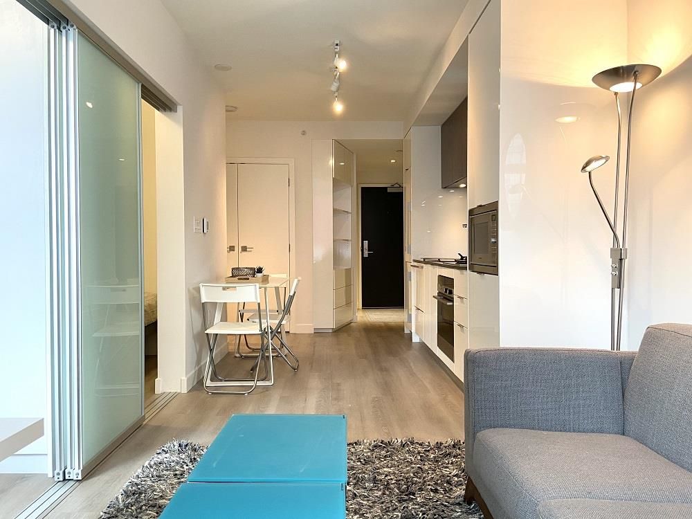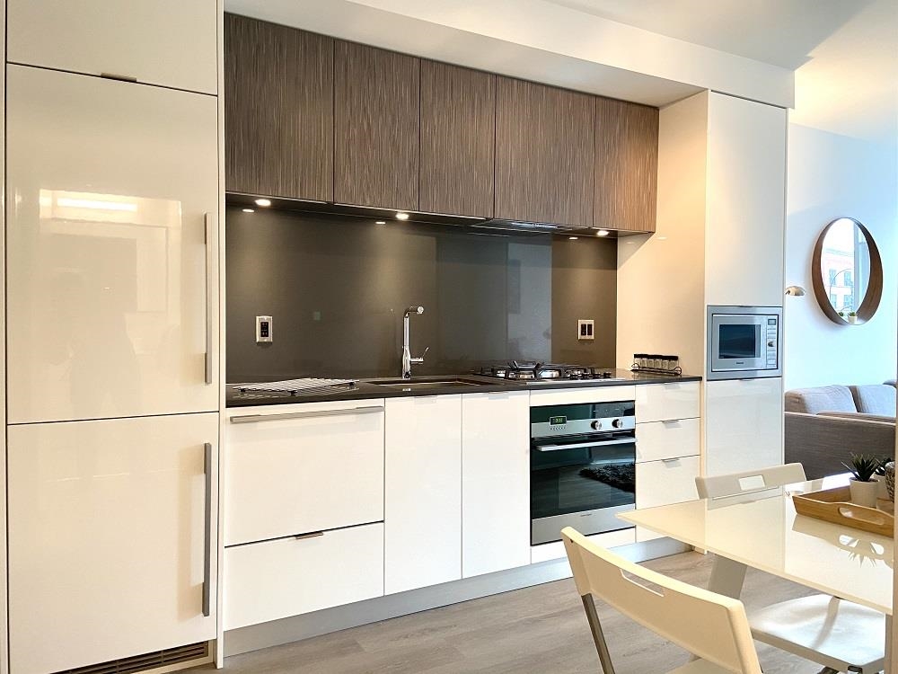 Experience modern urban living in this 670 Sqft furnished 2-bedroom, 1-bathroom condo for rent in East Vancouver's vibrant Mount Pleasant, located within the Ellsworth condo building. The condo boasts a contemporary floorplan designed for optimal functionality. Step into luxury with heated bathroom floors and elegant hardwood flooring throughout. A flex room area provides versatility to suit your needs. Entertainment is at your fingertips with a flat-screen TV, and you'll appreciate the lovely views from the windows. The sleek kitchen is a chef's dream, featuring stylish cabinetry, integrated stainless steel appliances, a glass range, and granite countertops. Both bedrooms offer total privacy, nestled behind frosted sliding doors, and furnished with plush beds, generous closet space.