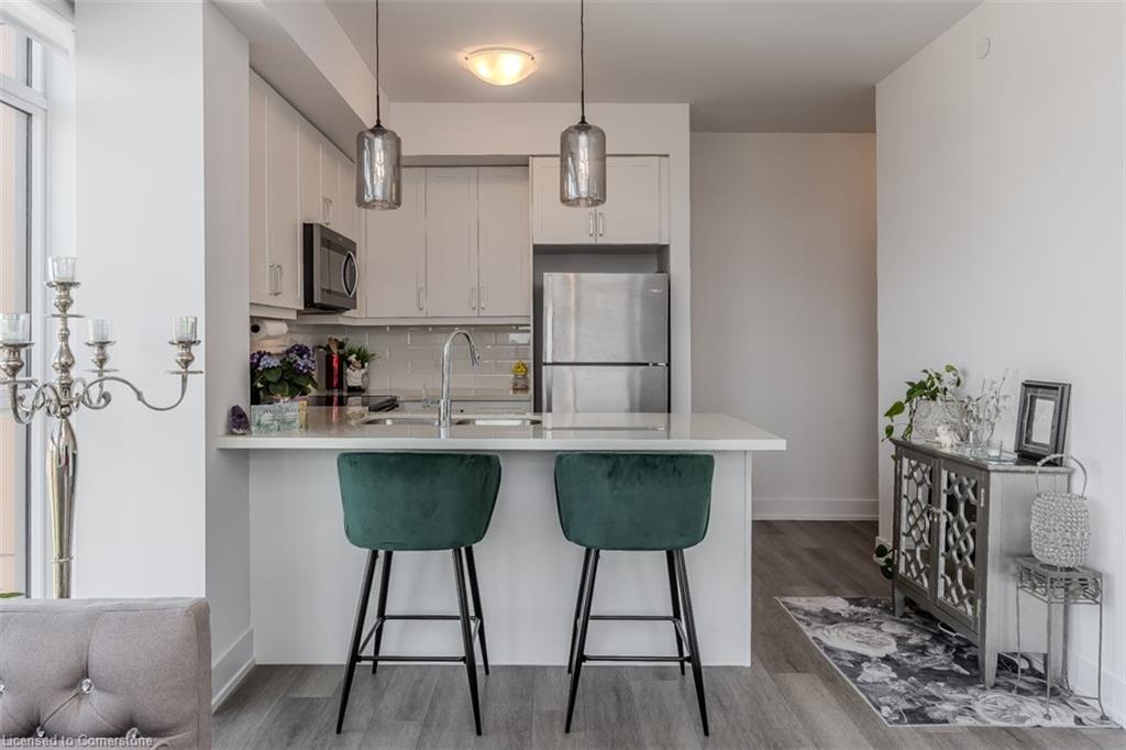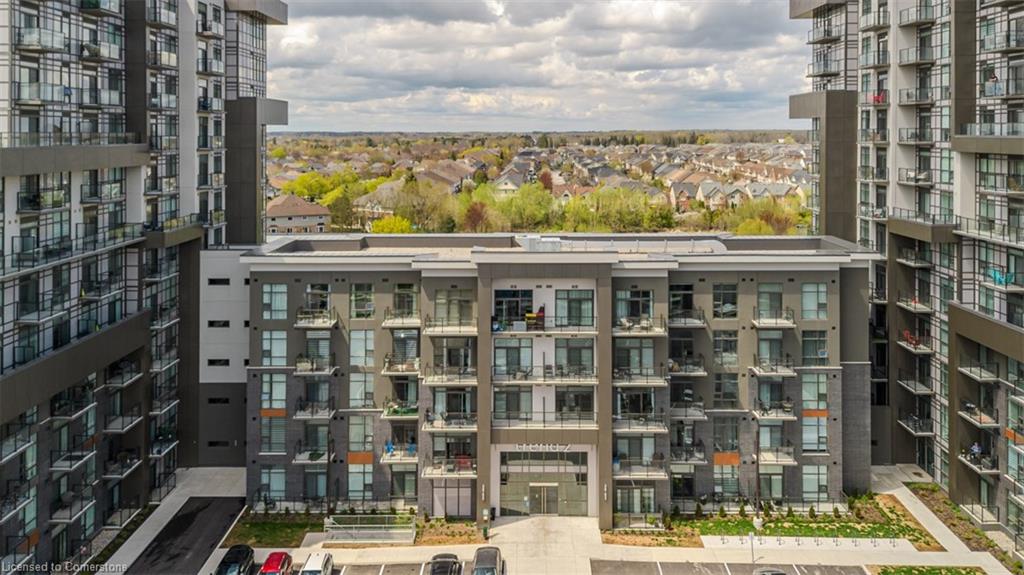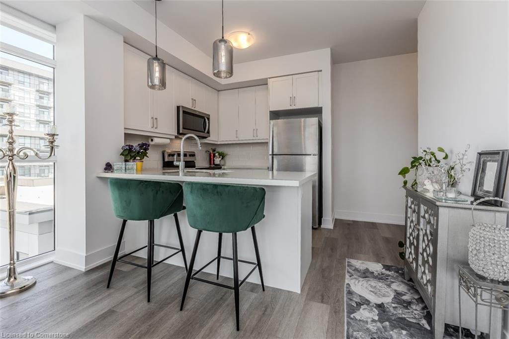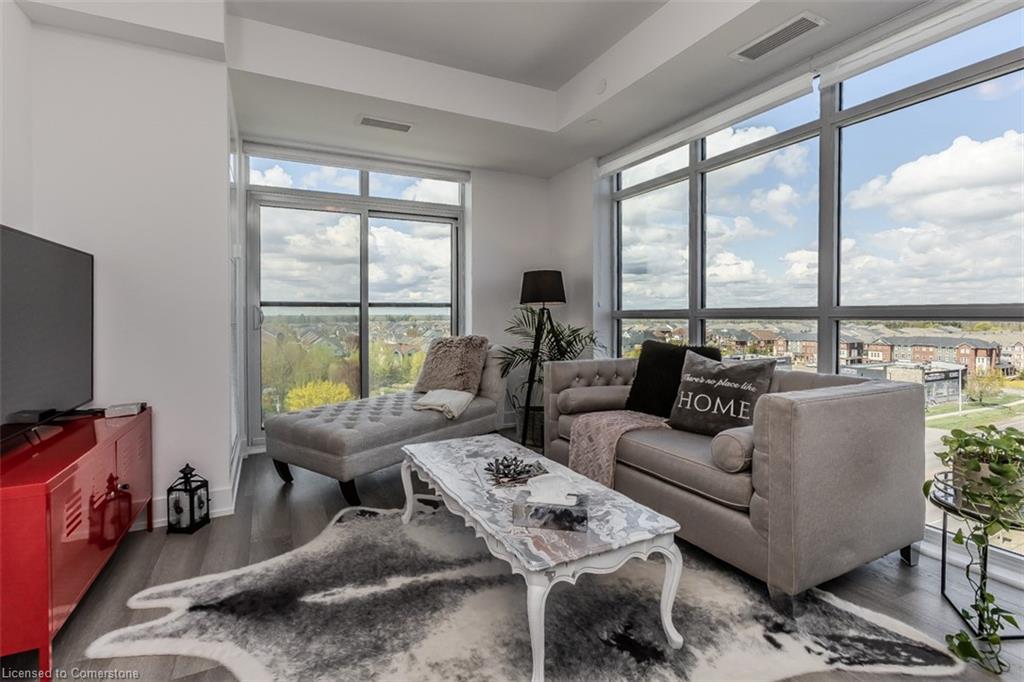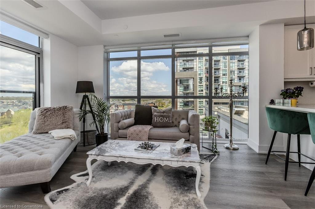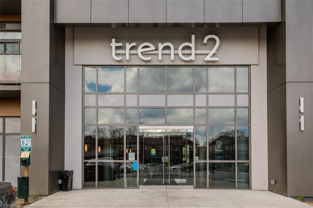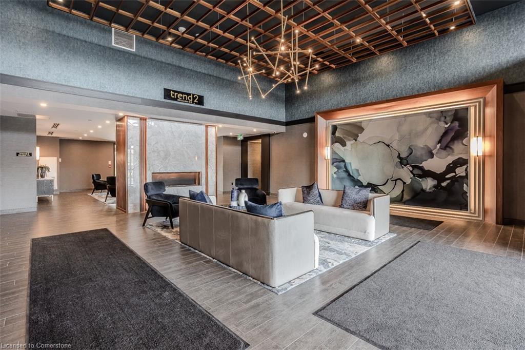 Experience luxury living in this exquisite 2-bed, 2-bath corner suite located in the highly sought-after TREND 2, a premier condominium development by the award-winning New Horizon Group in Waterdown. Spanning 880SF, this bright and spacious unit offers an open-concept layout, enhanced by floor-to-ceiling windows that fill the space with natural light, creating a warm and inviting atmosphere. Enjoy stunning, unobstructed views from your French balcony, the perfect spot to unwind. Step into a kitchen that will impress, boasting sleek white cabinetry, quartz countertops & SS appliances. The large breakfast counter, illuminated by custom pendant lighting, offers an ideal space for casual dining or entertaining guests. Every inch thoughtfully upgraded to ensure maximum comfort & style. The primary bedroom is a tranquil retreat, featuring an ensuite bath w luxurious glass shower and a spacious walk-in closet. Throughout the unit, modern zebra blinds add an elegant touch, while the state-of-the-art geothermal heating & cooling system ensures energy-efficient, year-round comfort. This suite also comes with 2 parking spots & same-floor locker. TREND 2 offers residents a host of fantastic amenities, incl fully-equipped gym, rooftop terrace & chic party room for social gatherings. Conveniently located just mins from highways, the GO Station, schools, parks, and shopping, this home truly offers it all. Seize the opportunity to live in one of Waterdown’s most coveted communities!