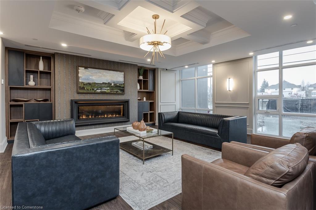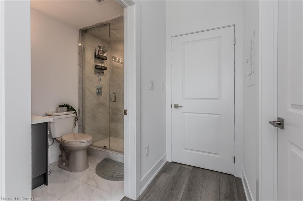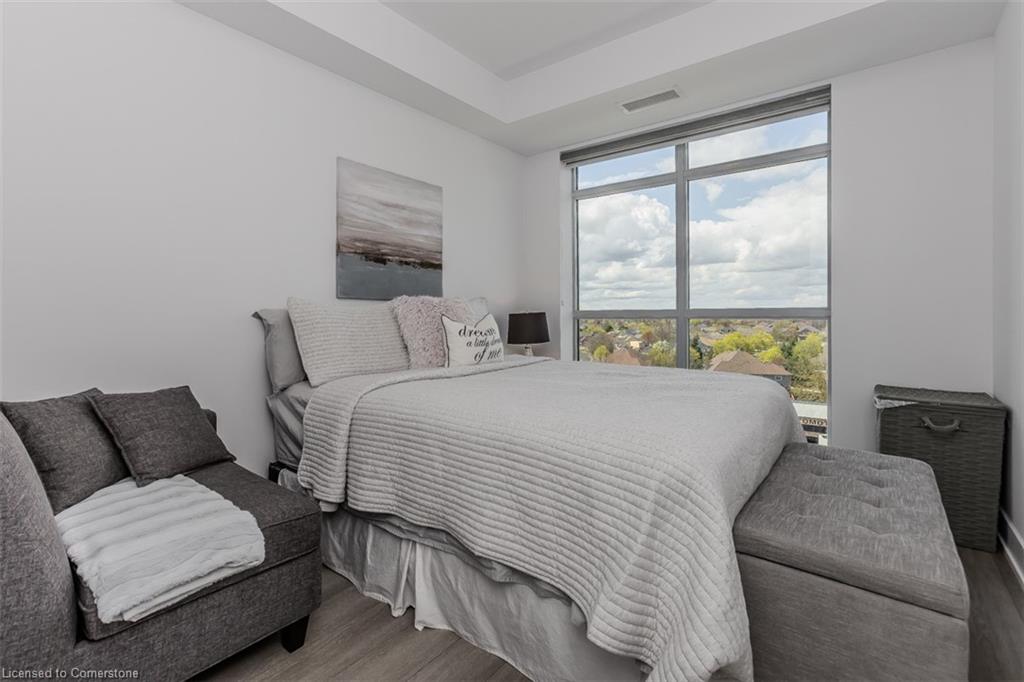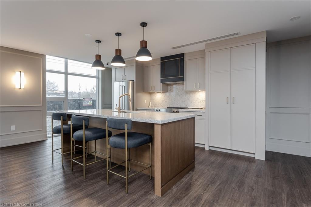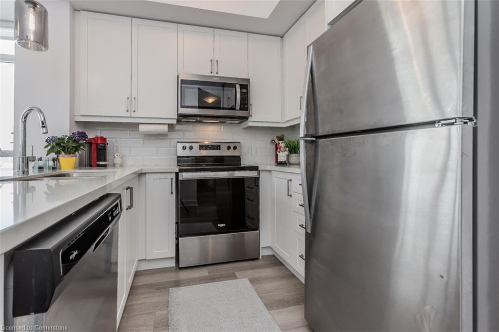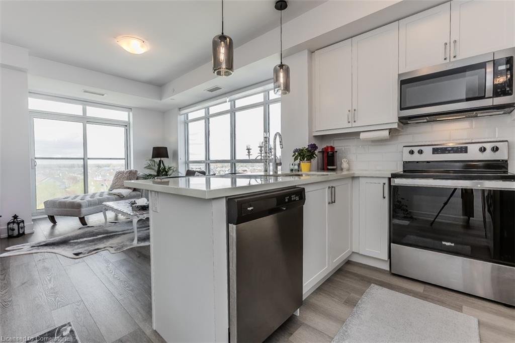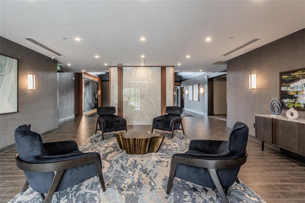 Experience luxury living in this exquisite 2-bed, 2-bath corner suite located in the highly sought-after TREND 2, a premier condominium development by the award-winning New Horizon Group in Waterdown. Spanning 880SF, this bright and spacious unit offers an open-concept layout, enhanced by floor-to-ceiling windows that fill the space with natural light, creating a warm and inviting atmosphere. Enjoy stunning, unobstructed views from your French balcony, the perfect spot to unwind. Step into a kitchen that will impress, boasting sleek white cabinetry, quartz countertops & SS appliances. The large breakfast counter, illuminated by custom pendant lighting, offers an ideal space for casual dining or entertaining guests. Every inch thoughtfully upgraded to ensure maximum comfort & style. The primary bedroom is a tranquil retreat, featuring an ensuite bath w luxurious glass shower and a spacious walk-in closet. Throughout the unit, modern zebra blinds add an elegant touch, while the state-of-the-art geothermal heating & cooling system ensures energy-efficient, year-round comfort. This suite also comes with 2 parking spots & same-floor locker. TREND 2 offers residents a host of fantastic amenities, incl fully-equipped gym, rooftop terrace & chic party room for social gatherings. Conveniently located just mins from highways, the GO Station, schools, parks, and shopping, this home truly offers it all. Seize the opportunity to live in one of Waterdown’s most coveted communities!