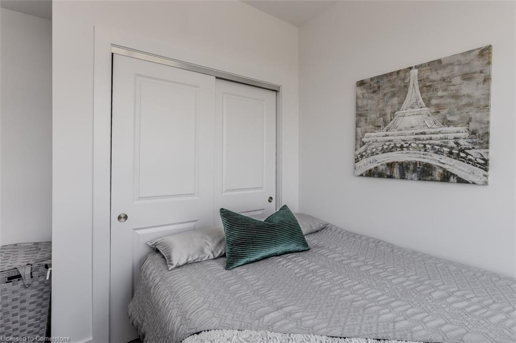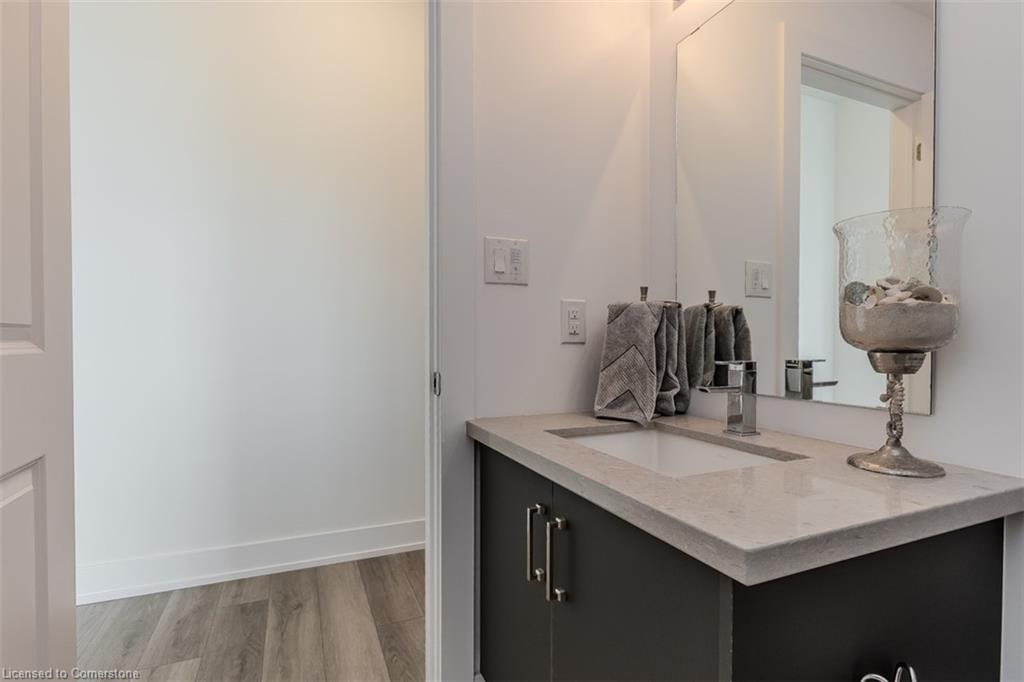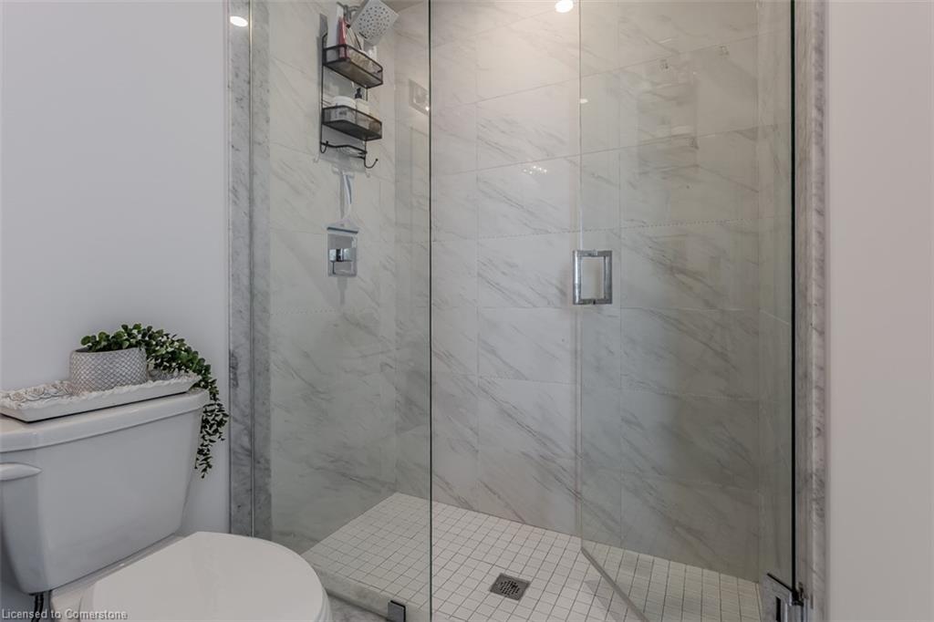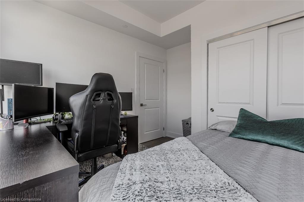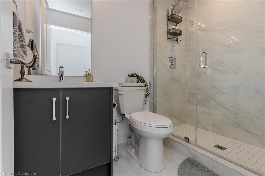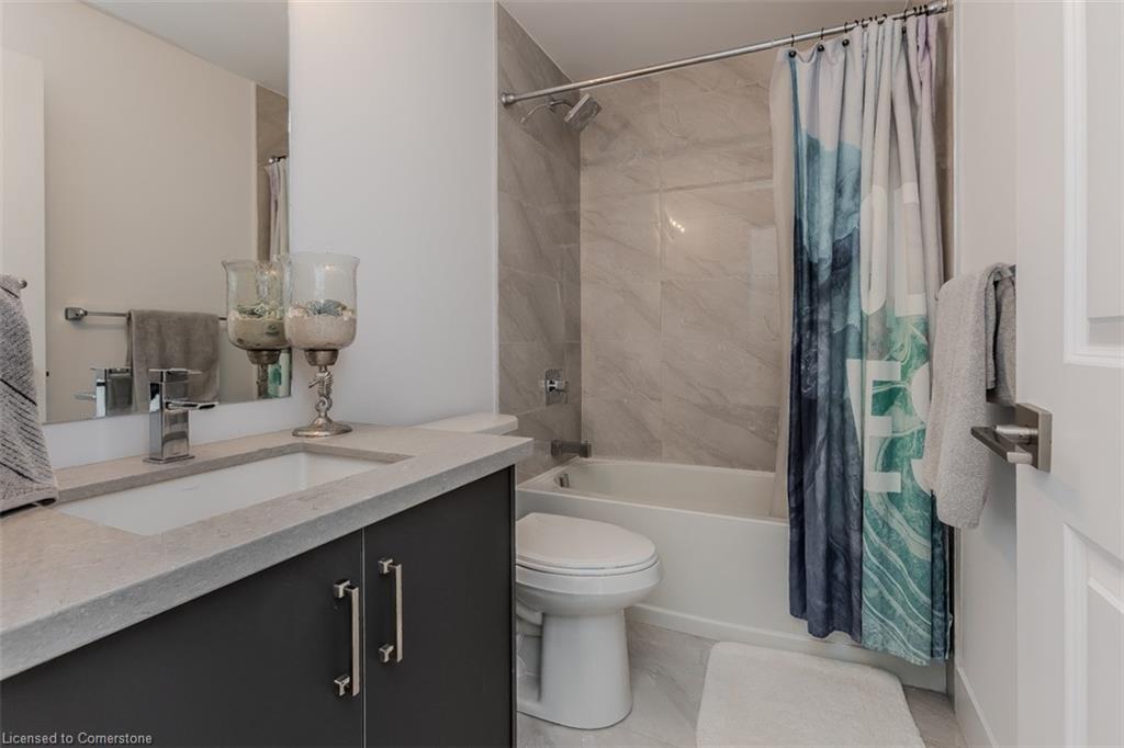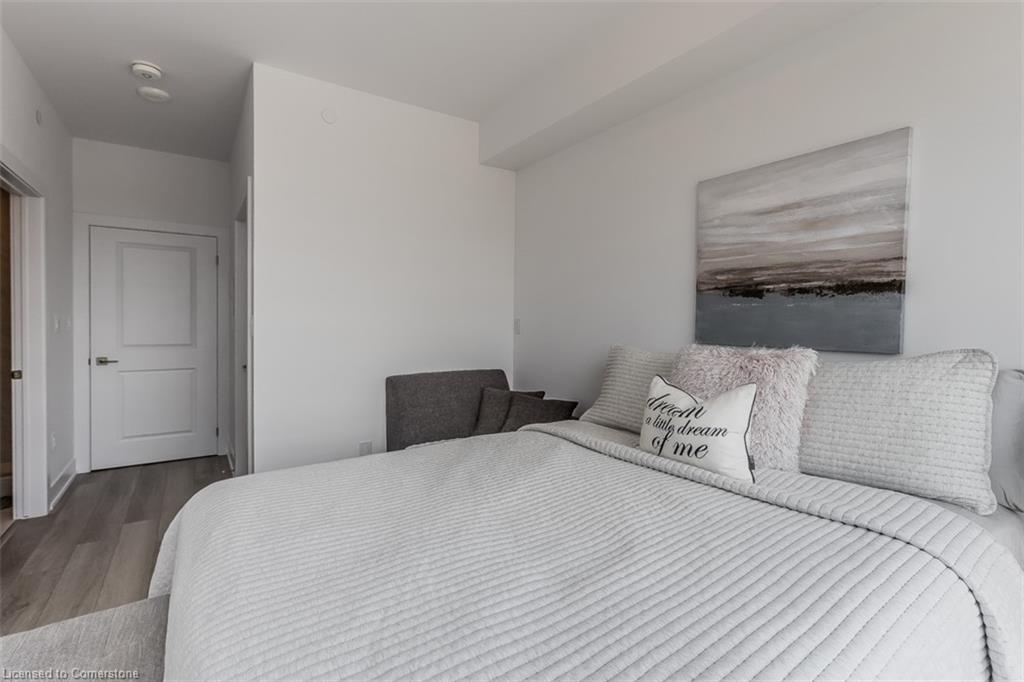 Experience luxury living in this exquisite 2-bed, 2-bath corner suite located in the highly sought-after TREND 2, a premier condominium development by the award-winning New Horizon Group in Waterdown. Spanning 880SF, this bright and spacious unit offers an open-concept layout, enhanced by floor-to-ceiling windows that fill the space with natural light, creating a warm and inviting atmosphere. Enjoy stunning, unobstructed views from your French balcony, the perfect spot to unwind. Step into a kitchen that will impress, boasting sleek white cabinetry, quartz countertops & SS appliances. The large breakfast counter, illuminated by custom pendant lighting, offers an ideal space for casual dining or entertaining guests. Every inch thoughtfully upgraded to ensure maximum comfort & style. The primary bedroom is a tranquil retreat, featuring an ensuite bath w luxurious glass shower and a spacious walk-in closet. Throughout the unit, modern zebra blinds add an elegant touch, while the state-of-the-art geothermal heating & cooling system ensures energy-efficient, year-round comfort. This suite also comes with 2 parking spots & same-floor locker. TREND 2 offers residents a host of fantastic amenities, incl fully-equipped gym, rooftop terrace & chic party room for social gatherings. Conveniently located just mins from highways, the GO Station, schools, parks, and shopping, this home truly offers it all. Seize the opportunity to live in one of Waterdown’s most coveted communities!