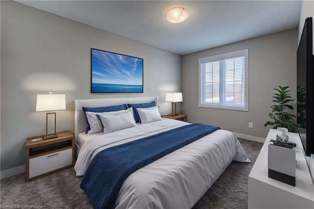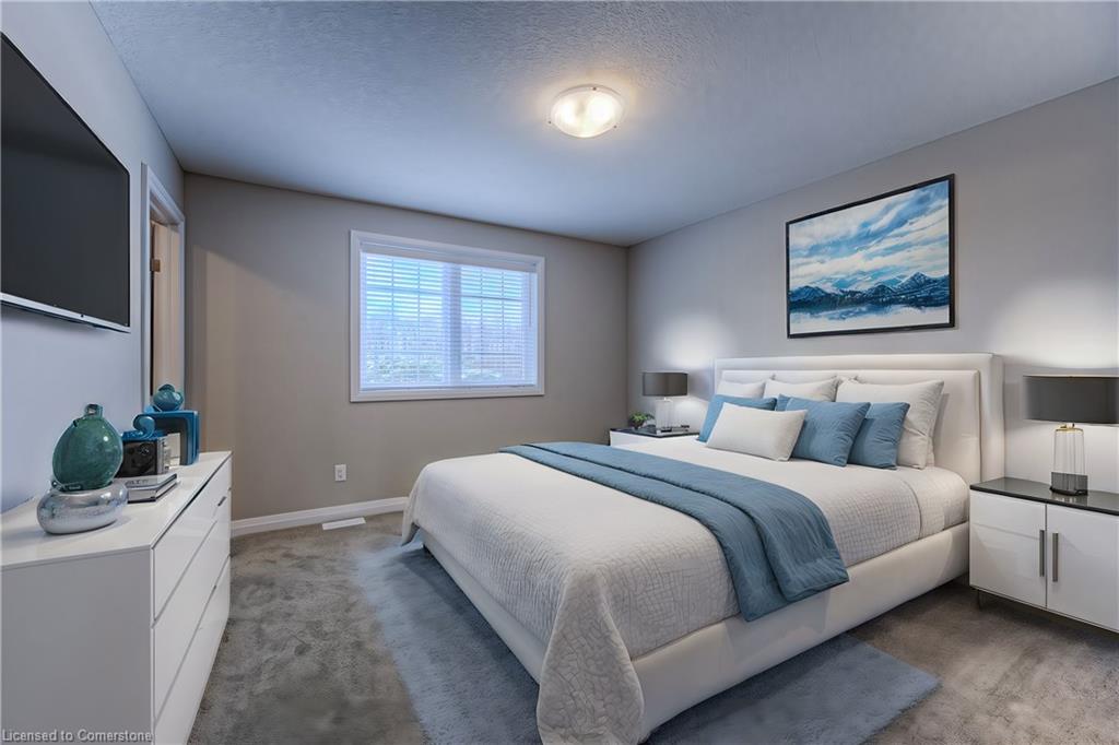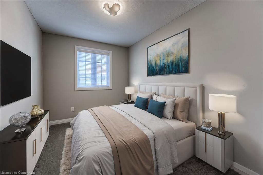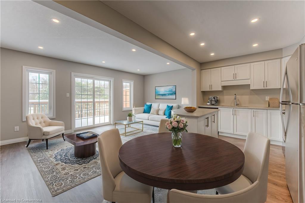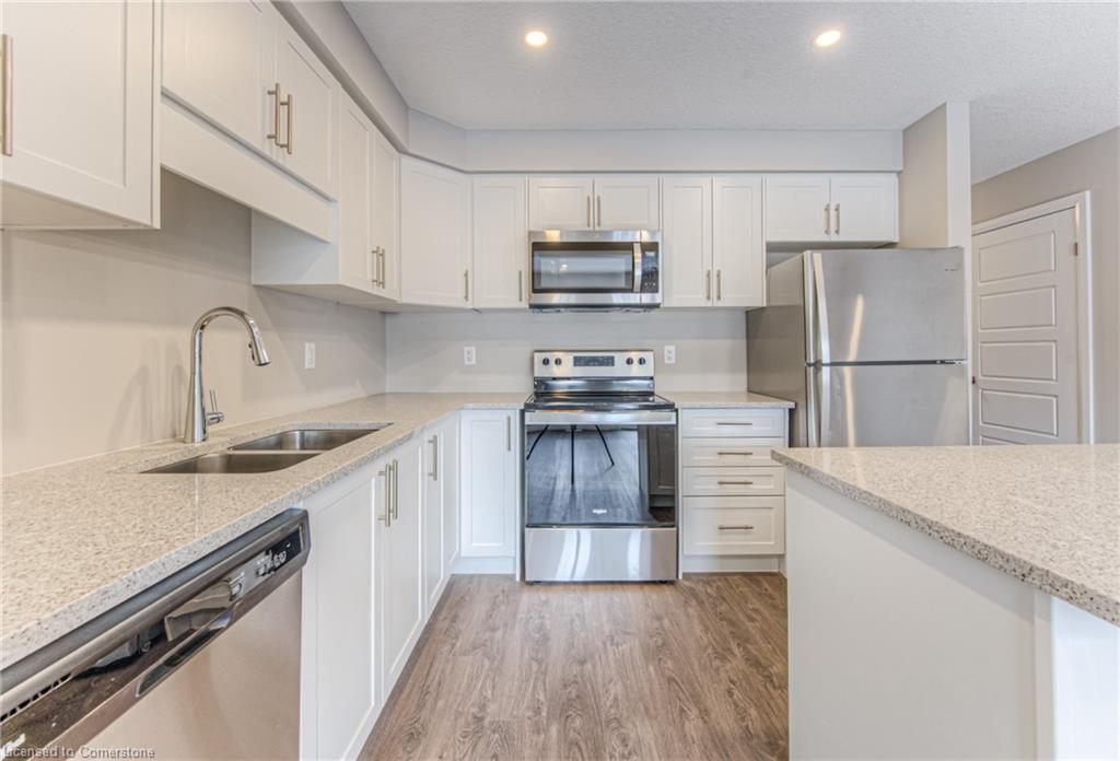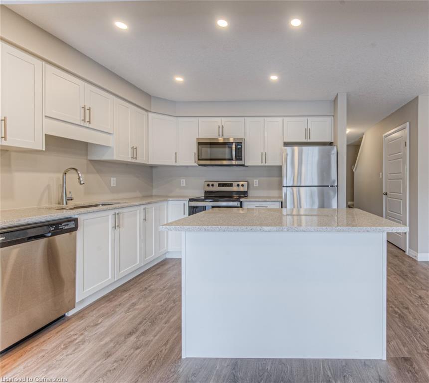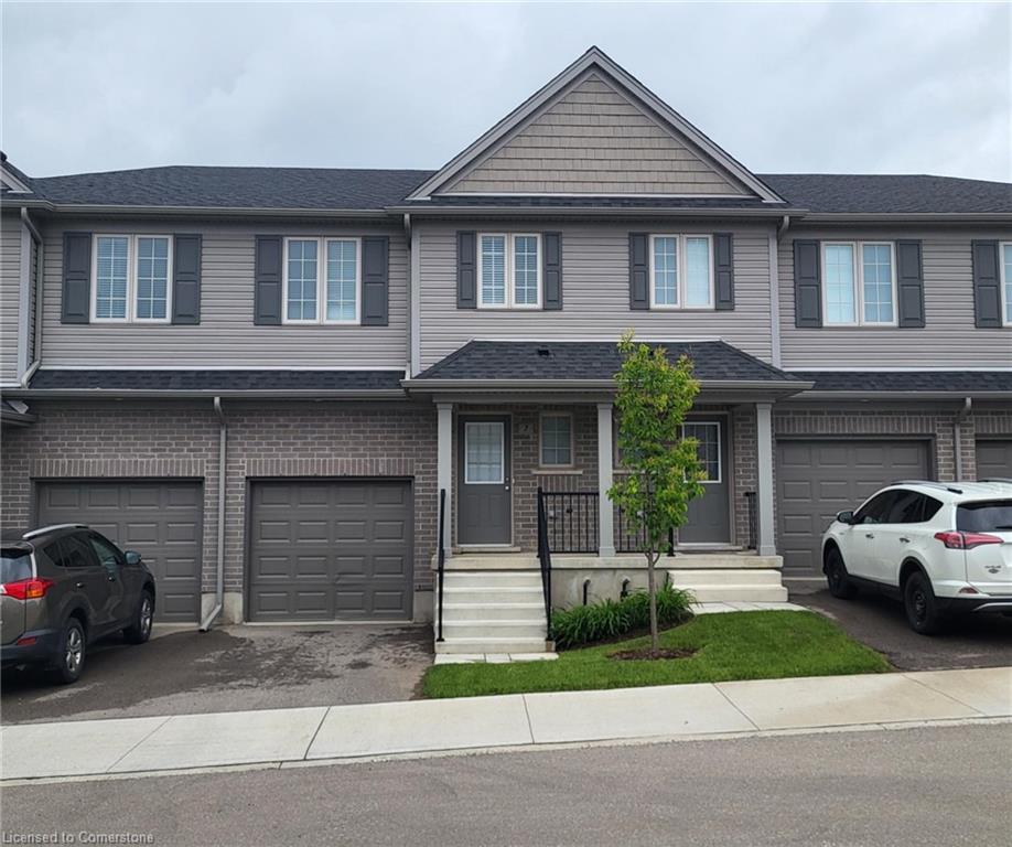 EXECUTIVE TOWNHOME FOR LEASE! This bright end-unit offers over 1400sqft, located in this family-friendly neighbourhood, minutes to The Boardwalk shopping and entertainment centre, great schools, and easy access to HWY 7/8. The bright open main floor layout features a spacious kitchen with quartz counters and an island with seating, open to the living room with great natural light and a walkout. Sliders lead you to the rear oversized upper deck – ideal for entertaining. The second floor offers 3 bedrooms and 2 full bathrooms in total – including the primary suite with a large walk-in closet and 3pc ensuite w/a sliding glass shower door. Convenient full-sized upper laundry. The unfinished basement offers a 2nd walkout leading you to a patio covered by the deck. Single garage and driveway – allowing parking for 2. Notable features: air exchanger, a/c, Wi-Fi garage door opener, sump pump, and more! Heat, hydro, gas, and water are to be paid for by the tenant(s). Good credit is required, and a full application must be submitted.**photos are a likeness** Available August 1st.