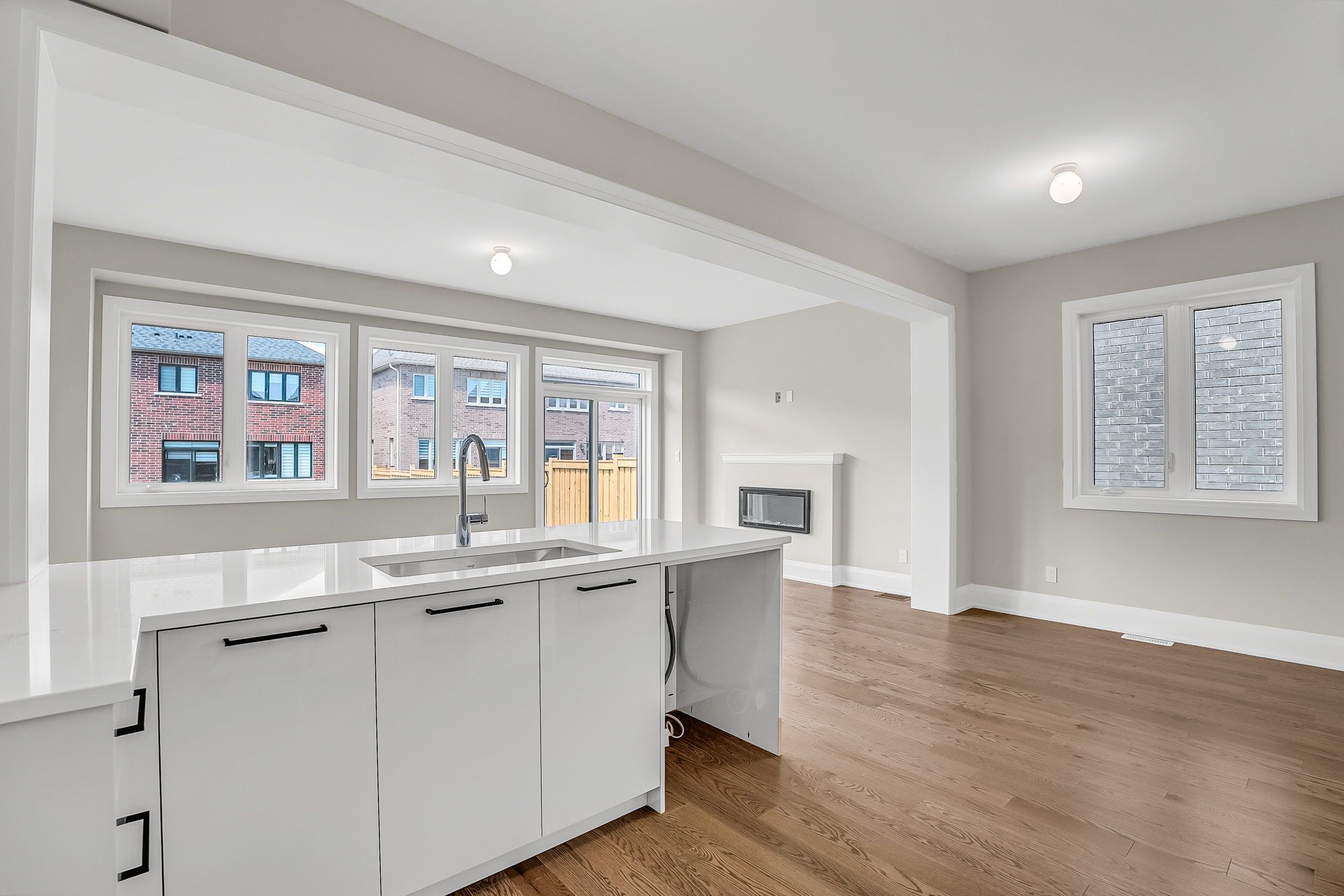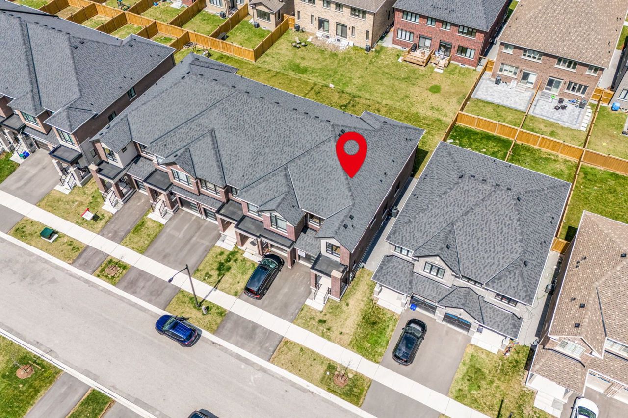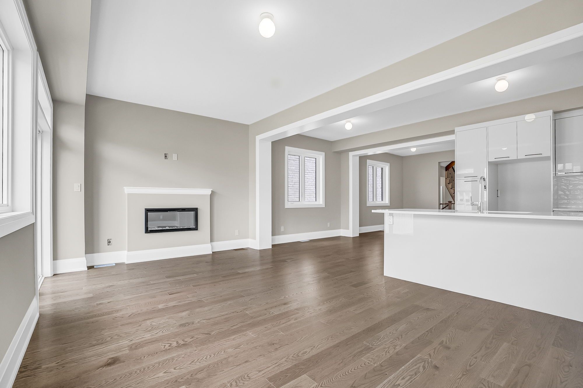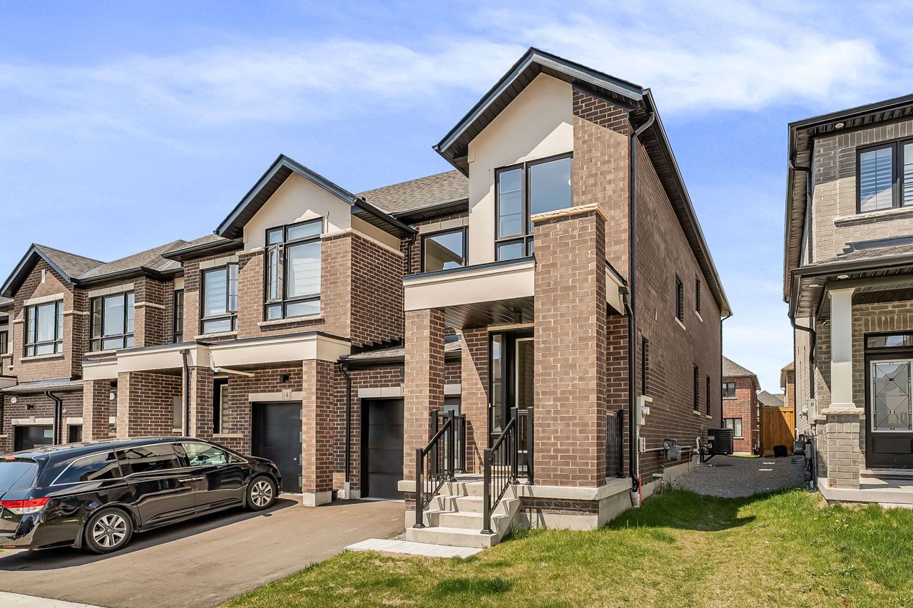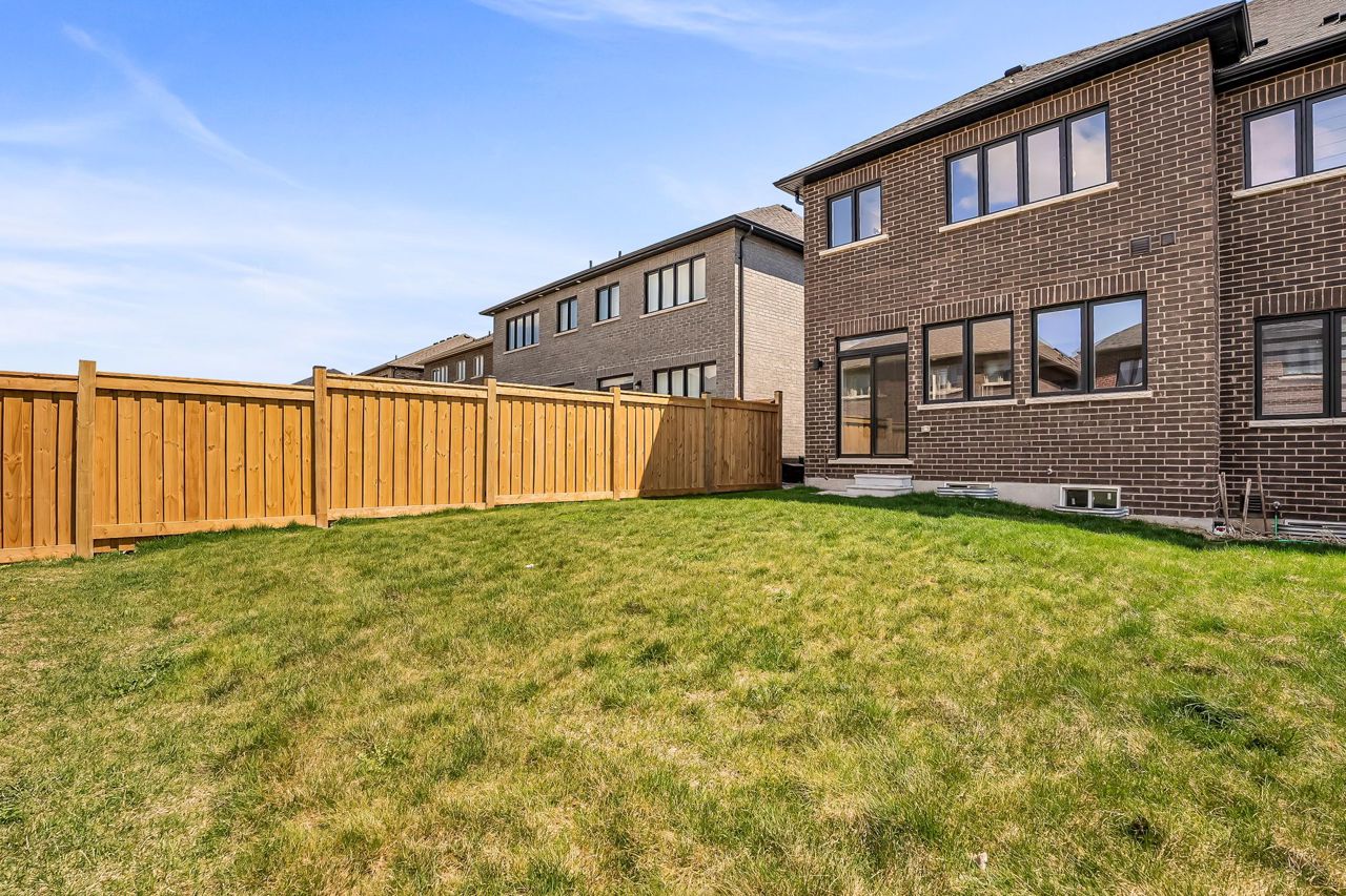 Never lived in Builder's inventory home for sale. This newly completed traditional 2 Storey end unit freehold townhouse (No maintenance fees or condo fees) is on a full depth 110ft deep private lot in the popular Queen's Common community by Vogue Homes. Features include a contemporary exterior design with brick elevation & oversized front windows, upgraded 4 1/2" modern hardwood & 12" x 24" porcelain tile throughout finished areas, 7 1/2" baseboards, upgraded interior doors & door hardware. The main floor comes with 9ft smooth ceilings, family size kitchen with stone counters & undermount sink, upgraded cabinetry with soft closing doors & drawers, pantry, backsplash, and a builder's voucher for 3 brand new appliances, large combined living & dining rooms, large family room with electric fireplace & walkout to rear yard. The oak staircase with iron pickets takes you to the 2nd floor where you will find 4 bedrooms + laundry room with upgraded upper cabinets and comes with a voucher for washer and dryer. The Primary Bedroom has a walk-in closet and a 4pc ensuite complete with glass shower, freestanding tub, upgraded vanity with stone countertop, and porcelain tile. The remaining 3 bedrooms are equipped with double closets, and the 4pc main bathroom has an upgraded vanity with stone countertop and porcelain floors. The unfinished basement comes equipped with a rough-in for a future 3pc bathroom, tankless hot water tank (rental), and HVAC system.