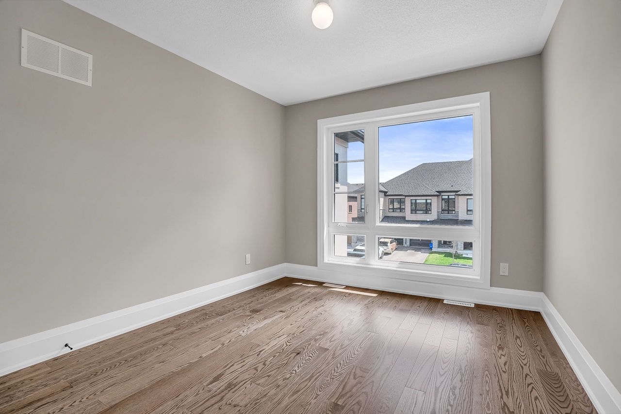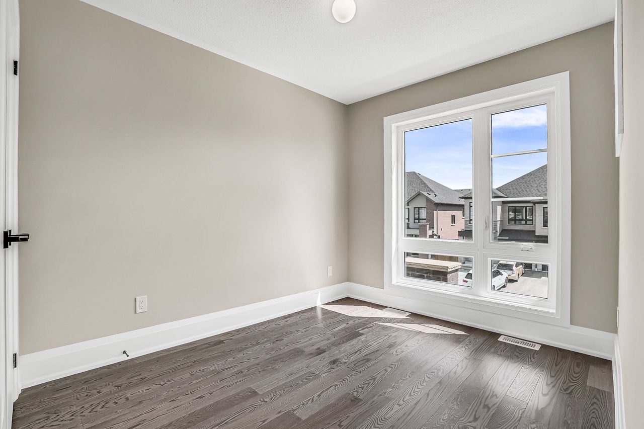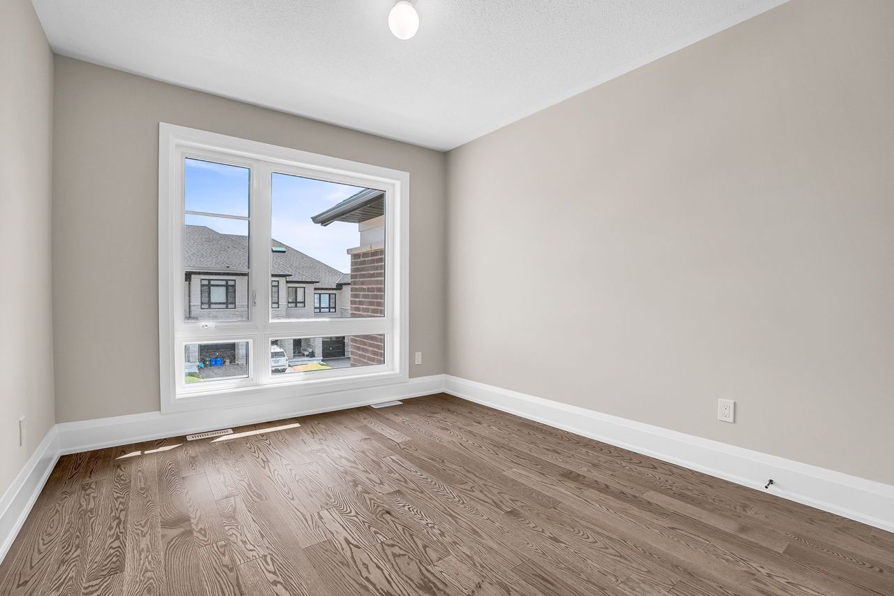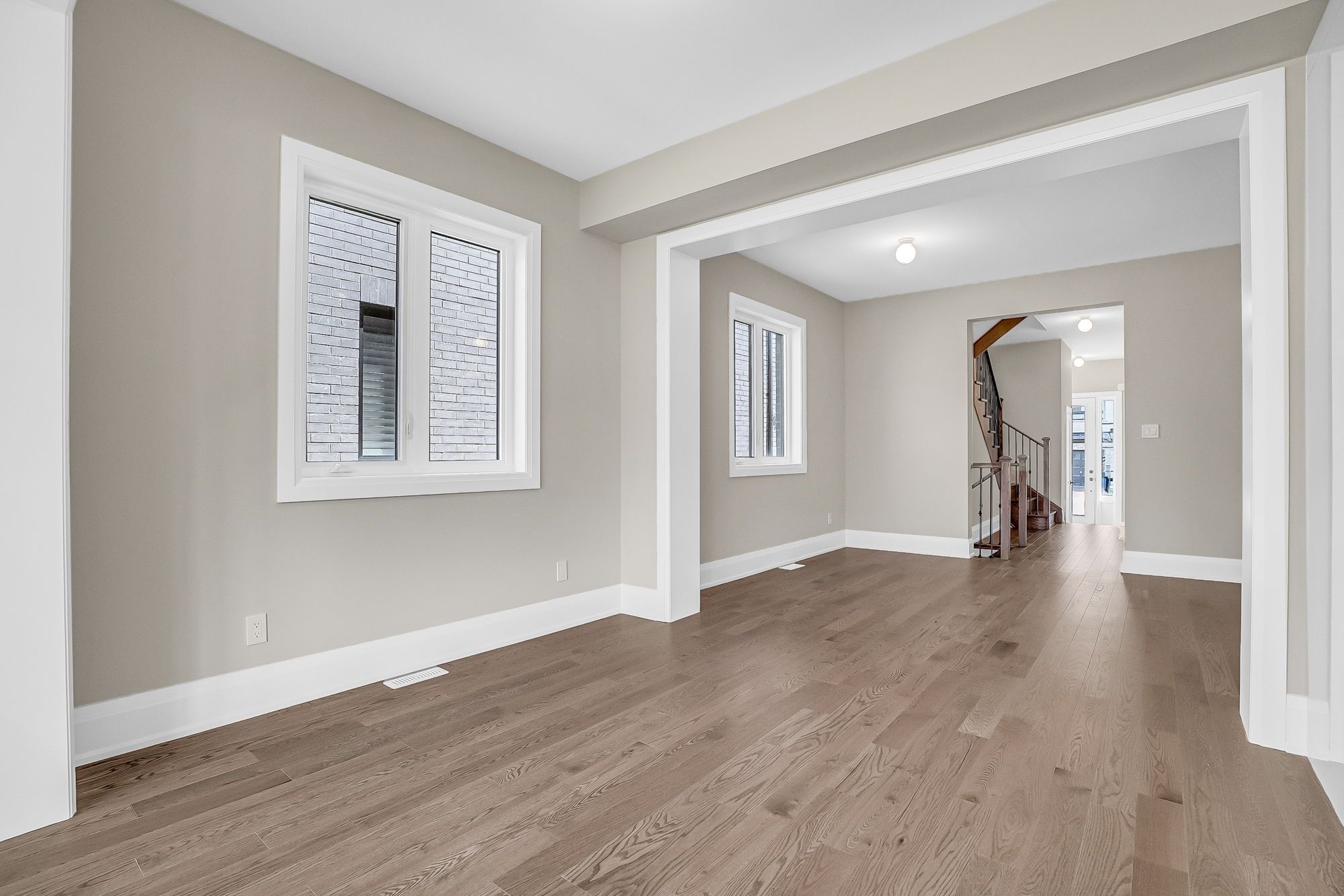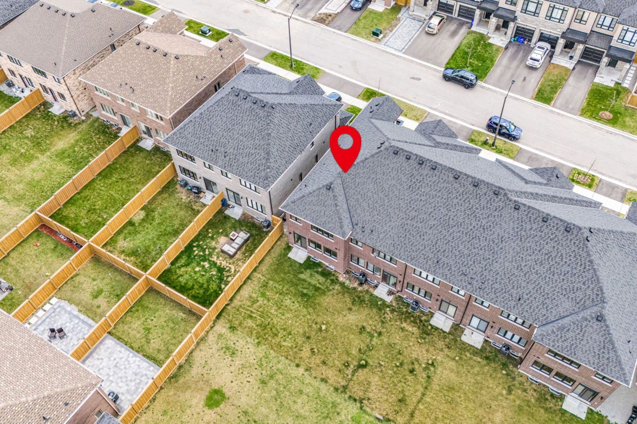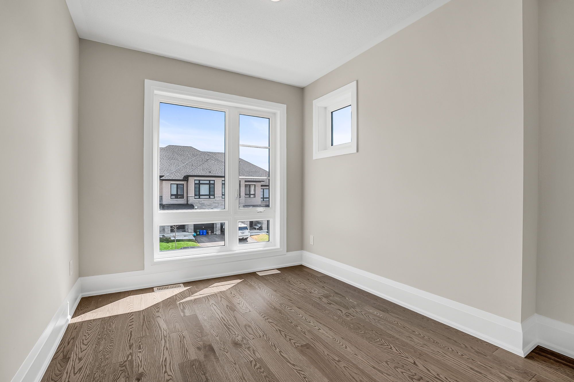 Never lived in Builder's inventory home for sale. This newly completed traditional 2 Storey end unit freehold townhouse (No maintenance fees or condo fees) is on a full depth 110ft deep private lot in the popular Queen's Common community by Vogue Homes. Features include a contemporary exterior design with brick elevation & oversized front windows, upgraded 4 1/2" modern hardwood & 12" x 24" porcelain tile throughout finished areas, 7 1/2" baseboards, upgraded interior doors & door hardware. The main floor comes with 9ft smooth ceilings, family size kitchen with stone counters & undermount sink, upgraded cabinetry with soft closing doors & drawers, pantry, backsplash, and a builder's voucher for 3 brand new appliances, large combined living & dining rooms, large family room with electric fireplace & walkout to rear yard. The oak staircase with iron pickets takes you to the 2nd floor where you will find 4 bedrooms + laundry room with upgraded upper cabinets and comes with a voucher for washer and dryer. The Primary Bedroom has a walk-in closet and a 4pc ensuite complete with glass shower, freestanding tub, upgraded vanity with stone countertop, and porcelain tile. The remaining 3 bedrooms are equipped with double closets, and the 4pc main bathroom has an upgraded vanity with stone countertop and porcelain floors. The unfinished basement comes equipped with a rough-in for a future 3pc bathroom, tankless hot water tank (rental), and HVAC system.