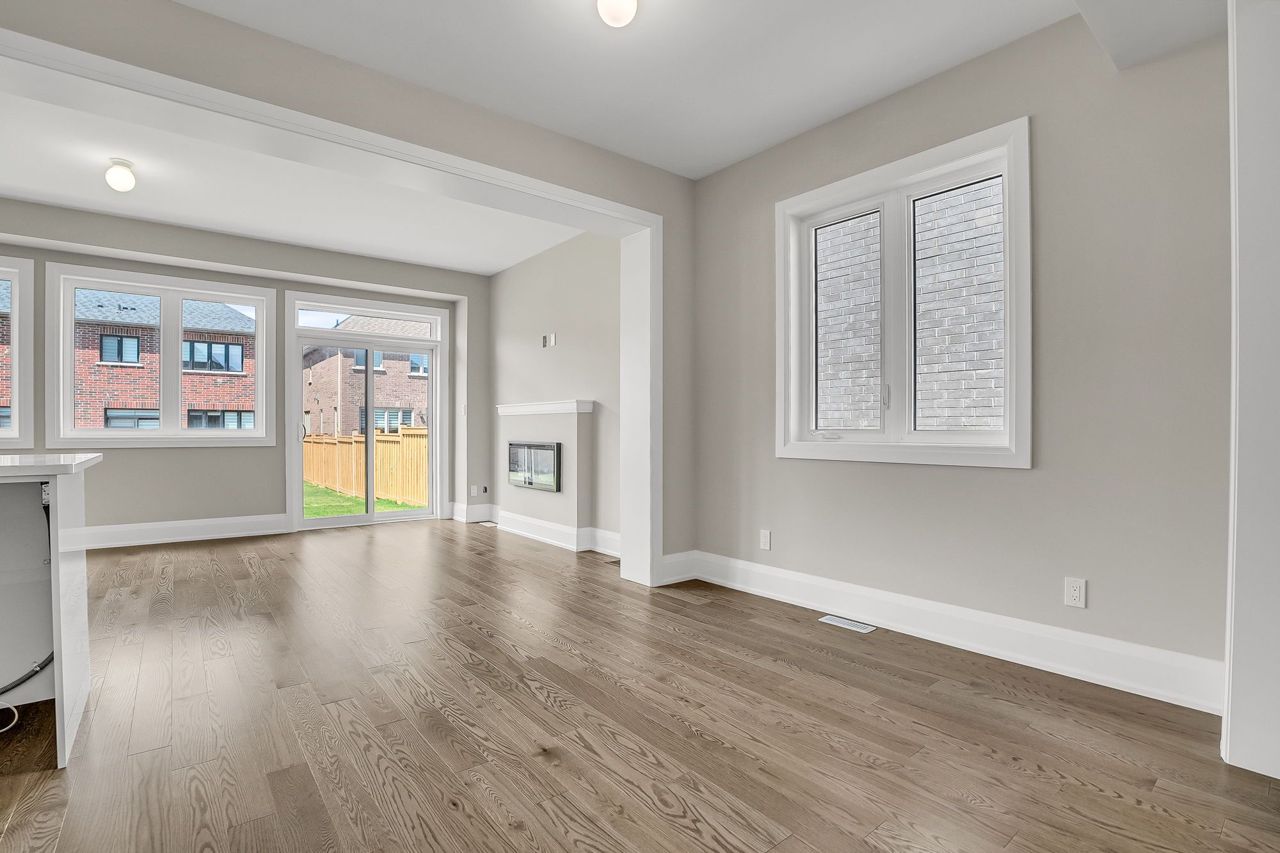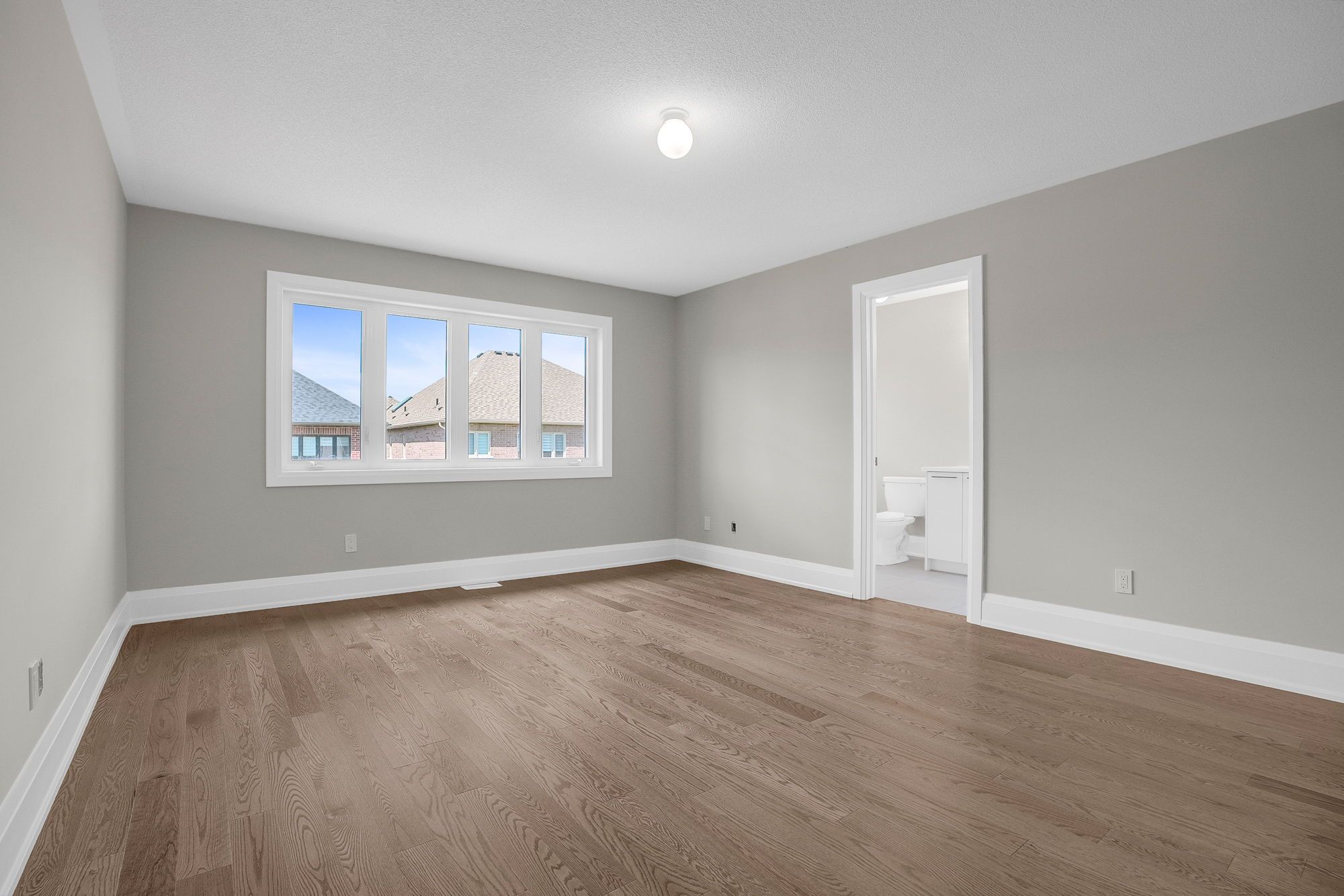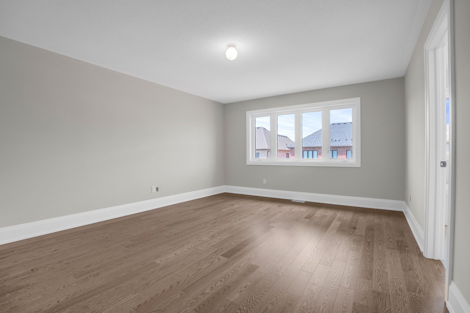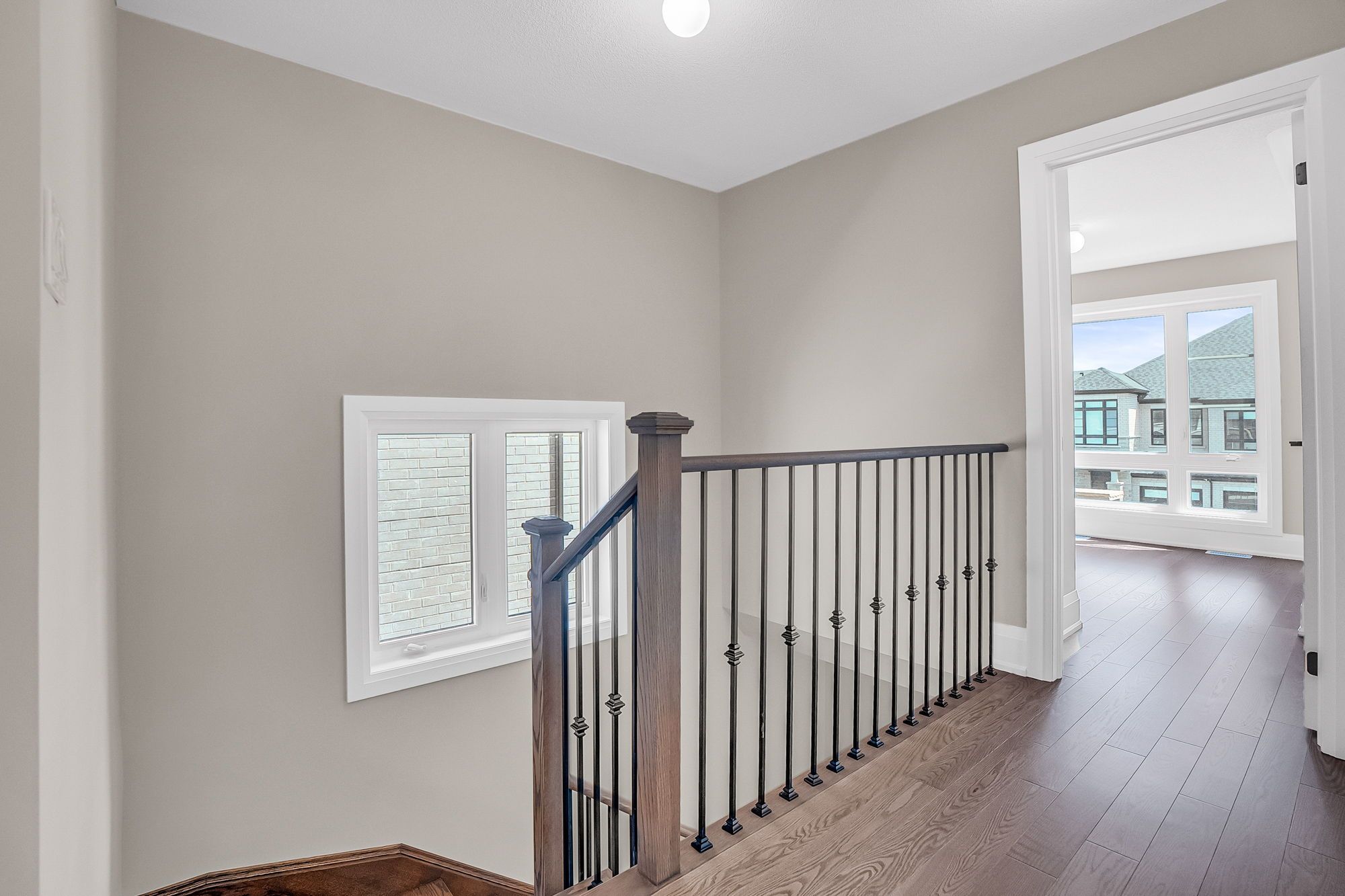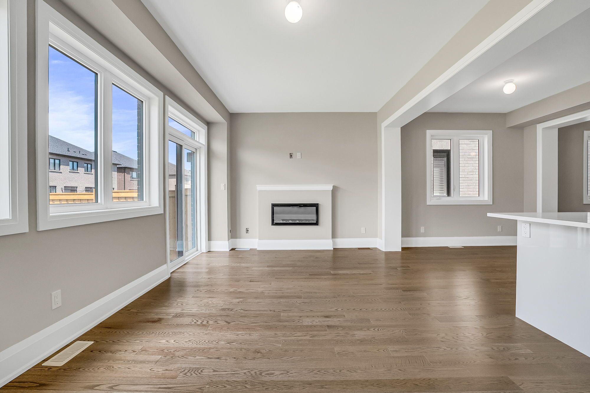Never lived in Builder's inventory home for sale. This newly completed traditional 2 Storey end unit freehold townhouse (No maintenance fees or condo fees) is on a full depth 110ft deep private lot in the popular Queen's Common community by Vogue Homes. Features include a contemporary exterior design with brick elevation & oversized front windows, upgraded 4 1/2" modern hardwood & 12" x 24" porcelain tile throughout finished areas, 7 1/2" baseboards, upgraded interior doors & door hardware. The main floor comes with 9ft smooth ceilings, family size kitchen with stone counters & undermount sink, upgraded cabinetry with soft closing doors & drawers, pantry, backsplash, and a builder's voucher for 3 brand new appliances, large combined living & dining rooms, large family room with electric fireplace & walkout to rear yard. The oak staircase with iron pickets takes you to the 2nd floor where you will find 4 bedrooms + laundry room with upgraded upper cabinets and comes with a voucher for washer and dryer. The Primary Bedroom has a walk-in closet and a 4pc ensuite complete with glass shower, freestanding tub, upgraded vanity with stone countertop, and porcelain tile. The remaining 3 bedrooms are equipped with double closets, and the 4pc main bathroom has an upgraded vanity with stone countertop and porcelain floors. The unfinished basement comes equipped with a rough-in for a future 3pc bathroom, tankless hot water tank (rental), and HVAC system.