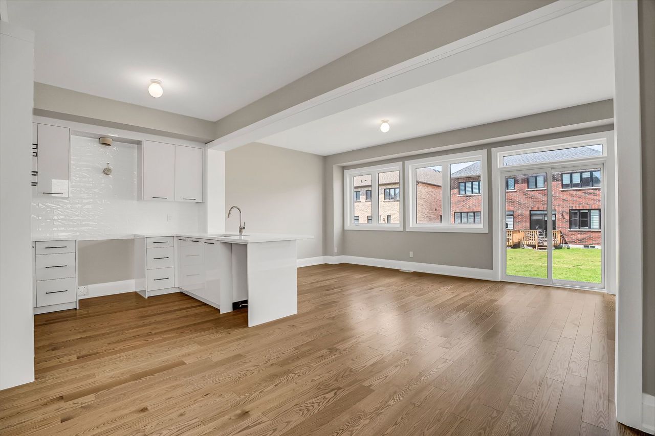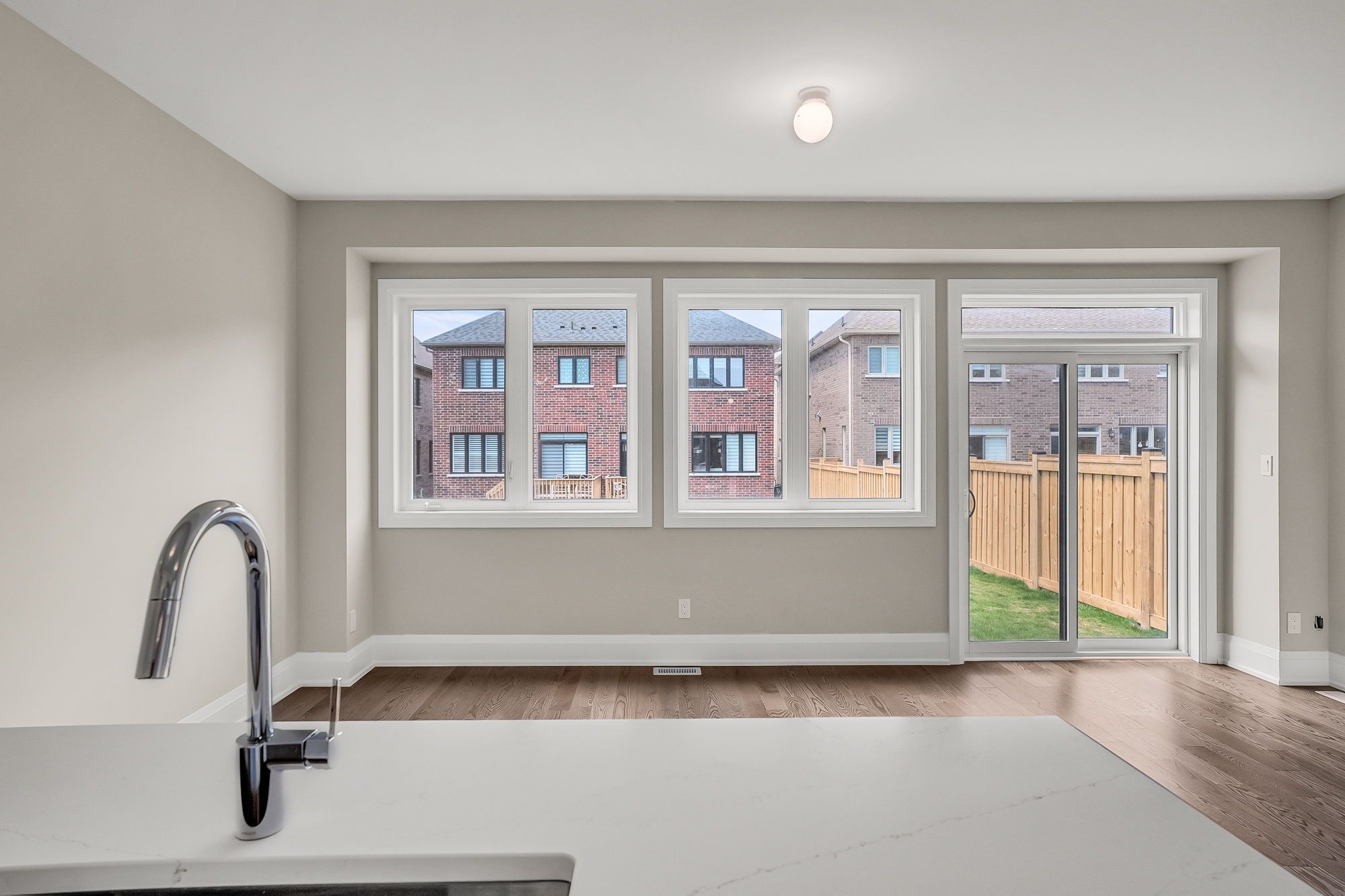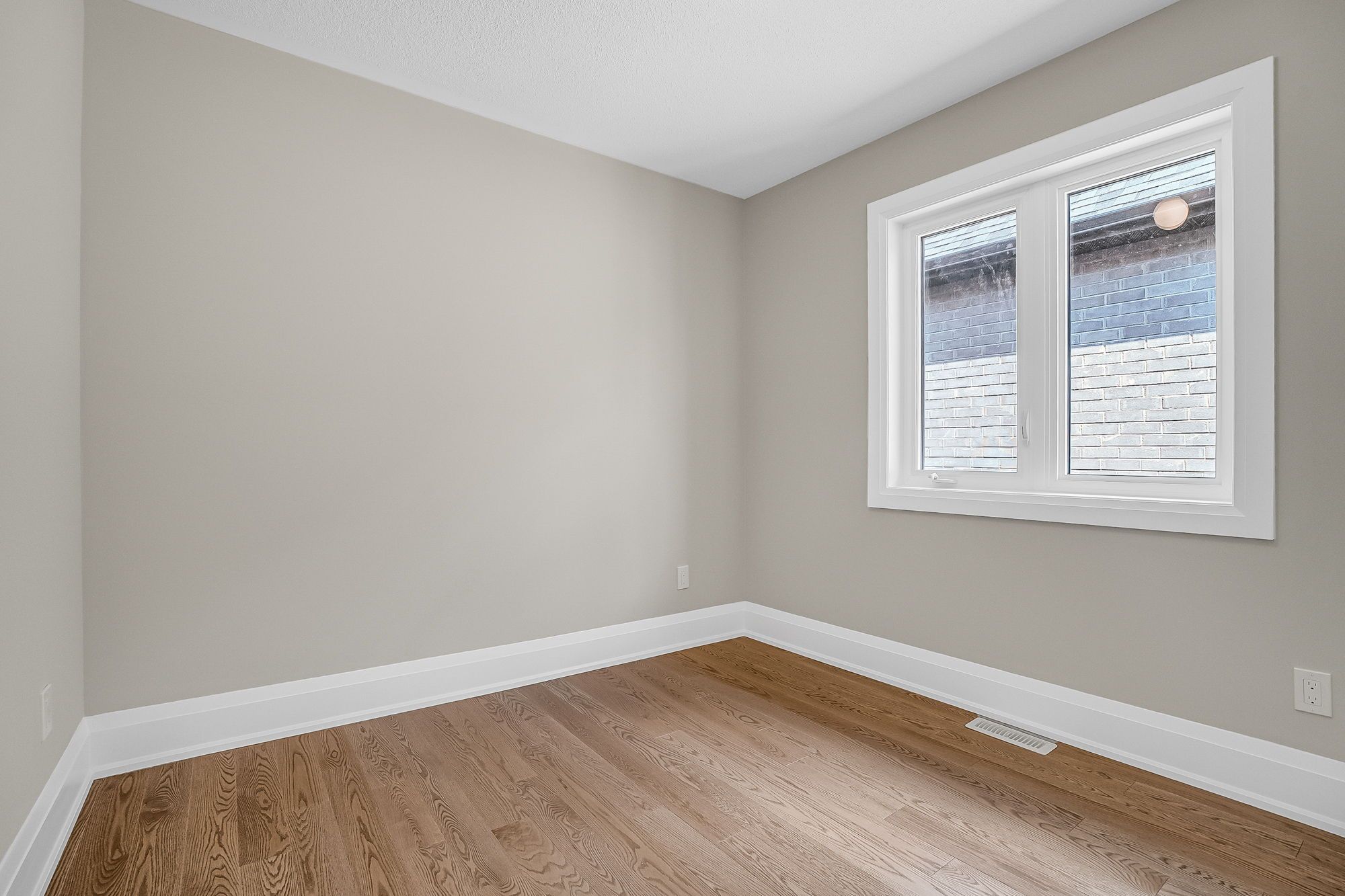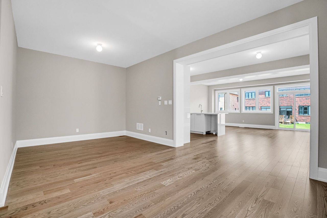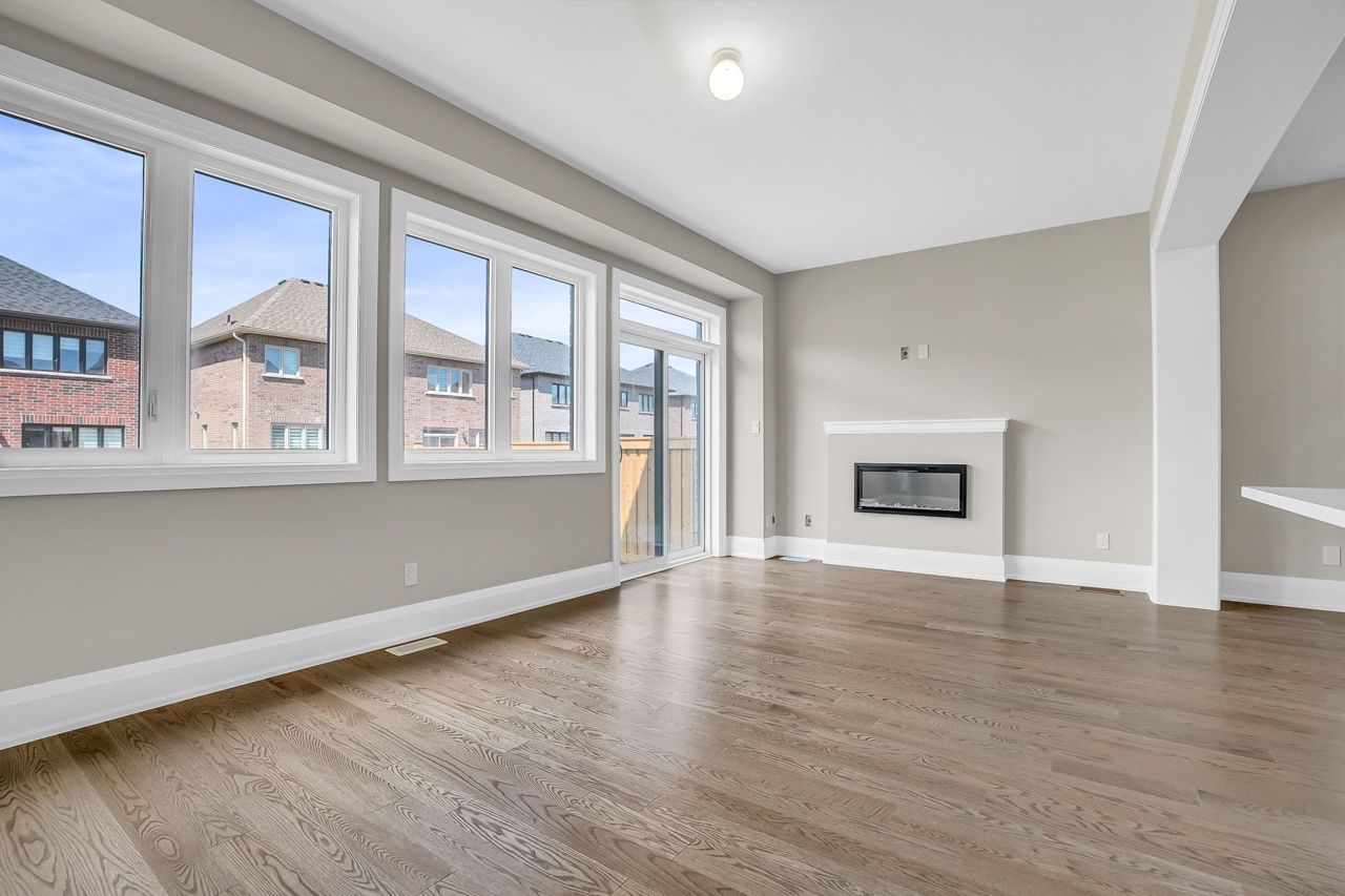 Never lived in Builder's inventory home for sale. This newly completed traditional 2 Storey end unit freehold townhouse (No maintenance fees or condo fees) is on a full depth 110ft deep private lot in the popular Queen's Common community by Vogue Homes. Features include a contemporary exterior design with brick elevation & oversized front windows, upgraded 4 1/2" modern hardwood & 12" x 24" porcelain tile throughout finished areas, 7 1/2" baseboards, upgraded interior doors & door hardware. The main floor comes with 9ft smooth ceilings, family size kitchen with stone counters & undermount sink, upgraded cabinetry with soft closing doors & drawers, pantry, backsplash, and a builder's voucher for 3 brand new appliances, large combined living & dining rooms, large family room with electric fireplace & walkout to rear yard. The oak staircase with iron pickets takes you to the 2nd floor where you will find 4 bedrooms + laundry room with upgraded upper cabinets and comes with a voucher for washer and dryer. The Primary Bedroom has a walk-in closet and a 4pc ensuite complete with glass shower, freestanding tub, upgraded vanity with stone countertop, and porcelain tile. The remaining 3 bedrooms are equipped with double closets, and the 4pc main bathroom has an upgraded vanity with stone countertop and porcelain floors. The unfinished basement comes equipped with a rough-in for a future 3pc bathroom, tankless hot water tank (rental), and HVAC system.