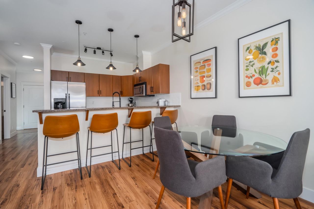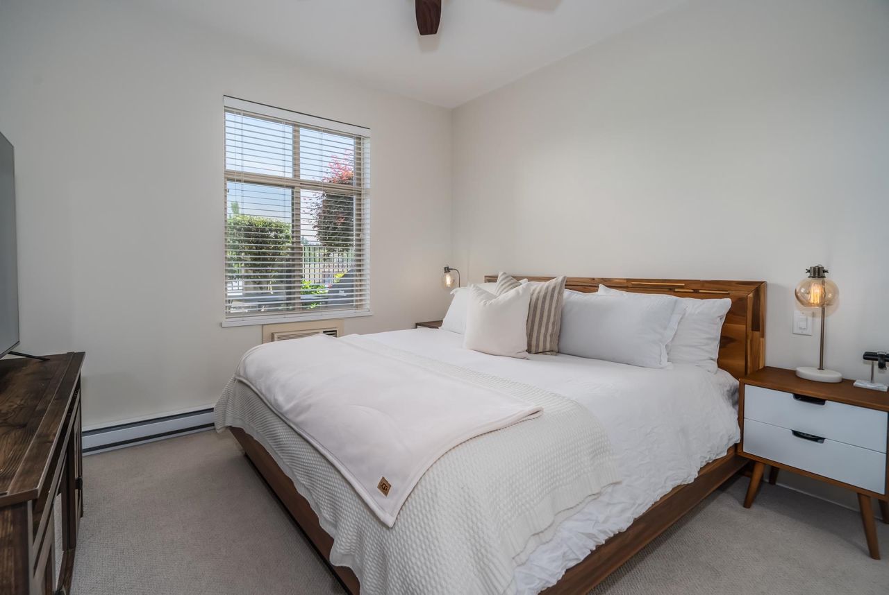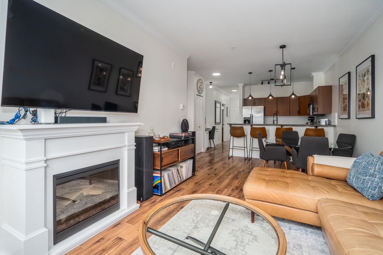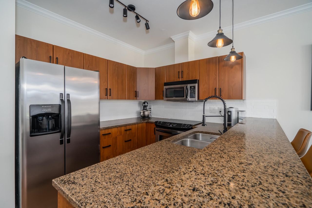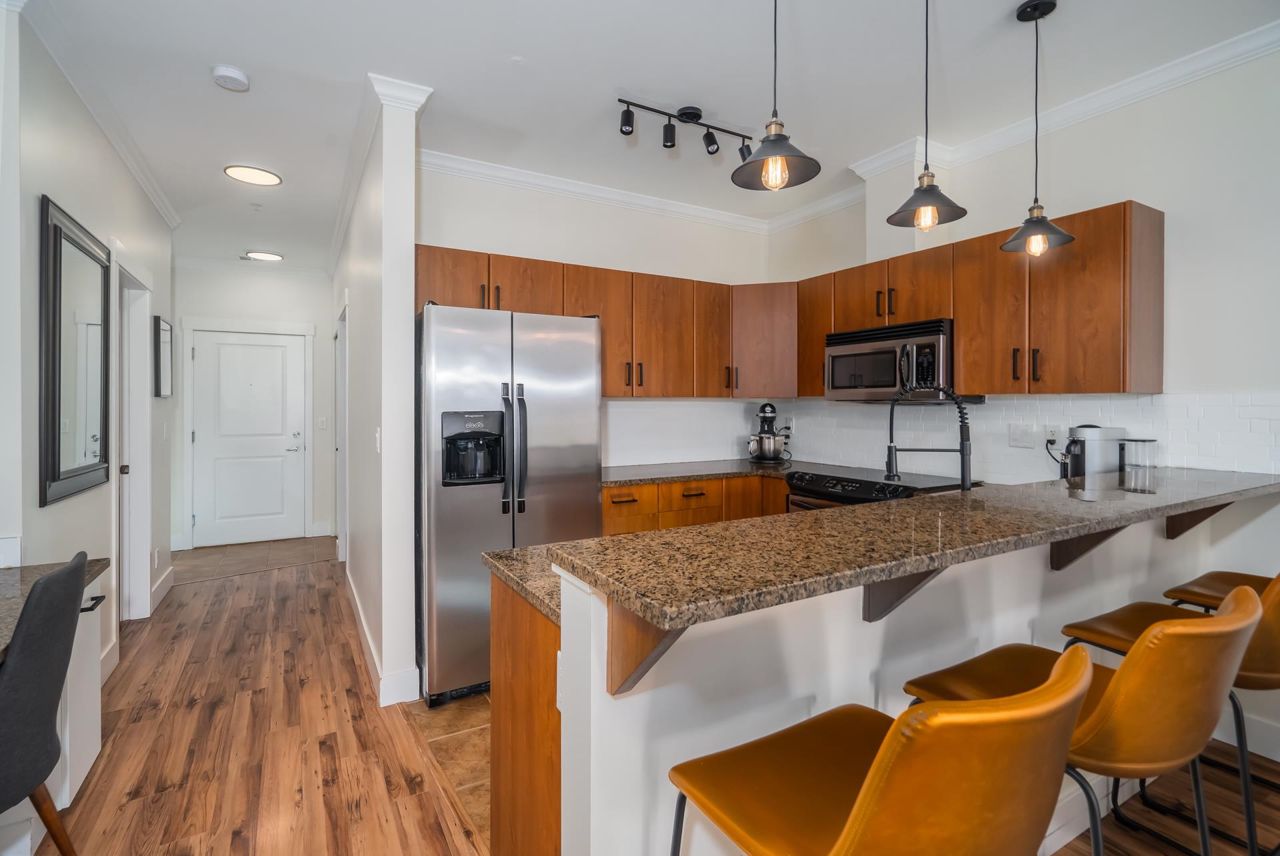 Enjoy Historic Downtown Abbotsford living at Yale Crossing just steps from several cafes, restaurants and shopping. You will appreciate the level of detail found in this clean and updated two bedroom and two bathroom condo. Open kitchen, dining and living room areas. Primary bedroom has built-in A/C. Beautiful 5-piece ensuite plus full family bathroom. Large laundry with ample space for storage. Other features: granite, newer flooring and light fixtures, fresh paint and electric fireplace. Reasonable fee of $311/month and welcoming all ages, rentals and 2 dogs or cats. One secure underground parking stall, additional storage locker, ample visitor parking as well as street parking. Yale Crossing has onsite caretaker and two garage doors accessing underground parking. Open house June 17 2-4.